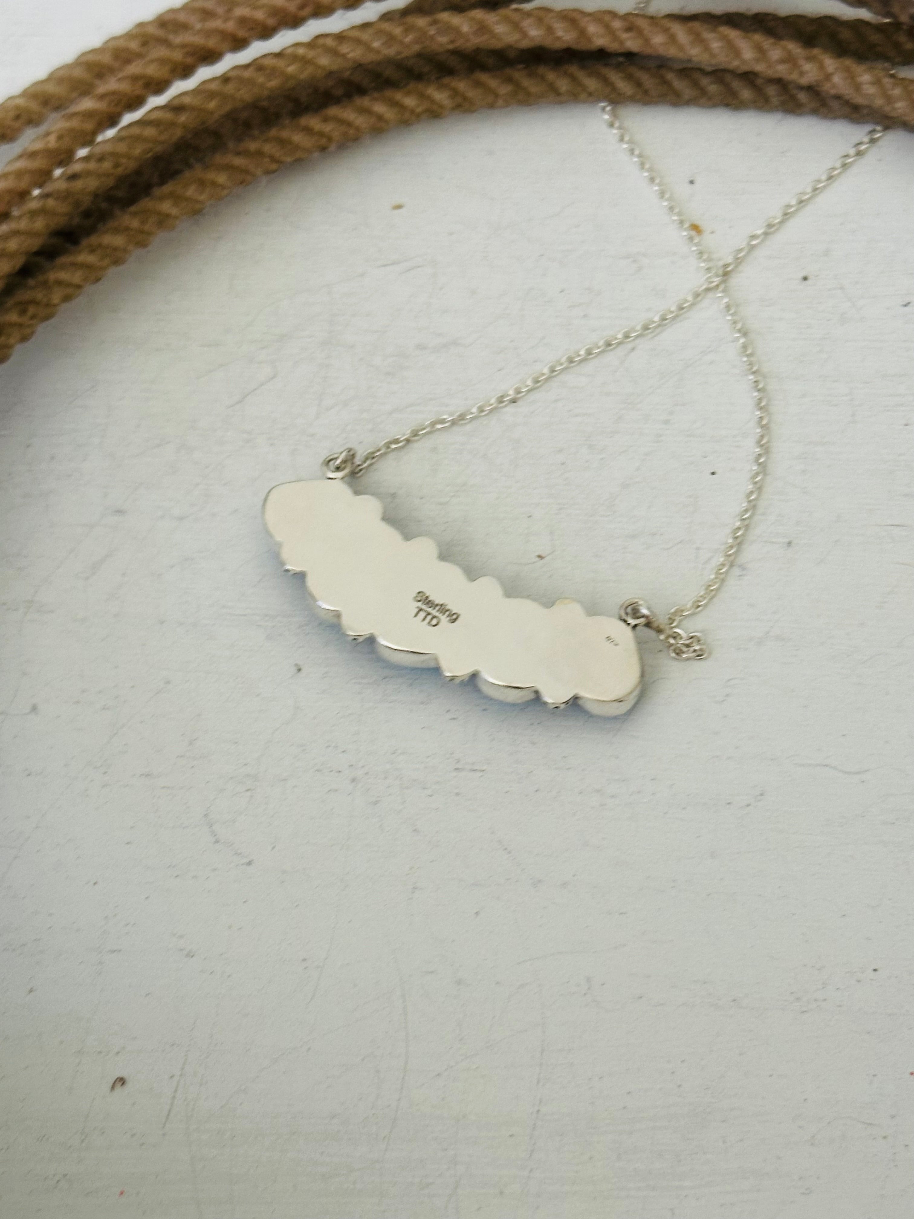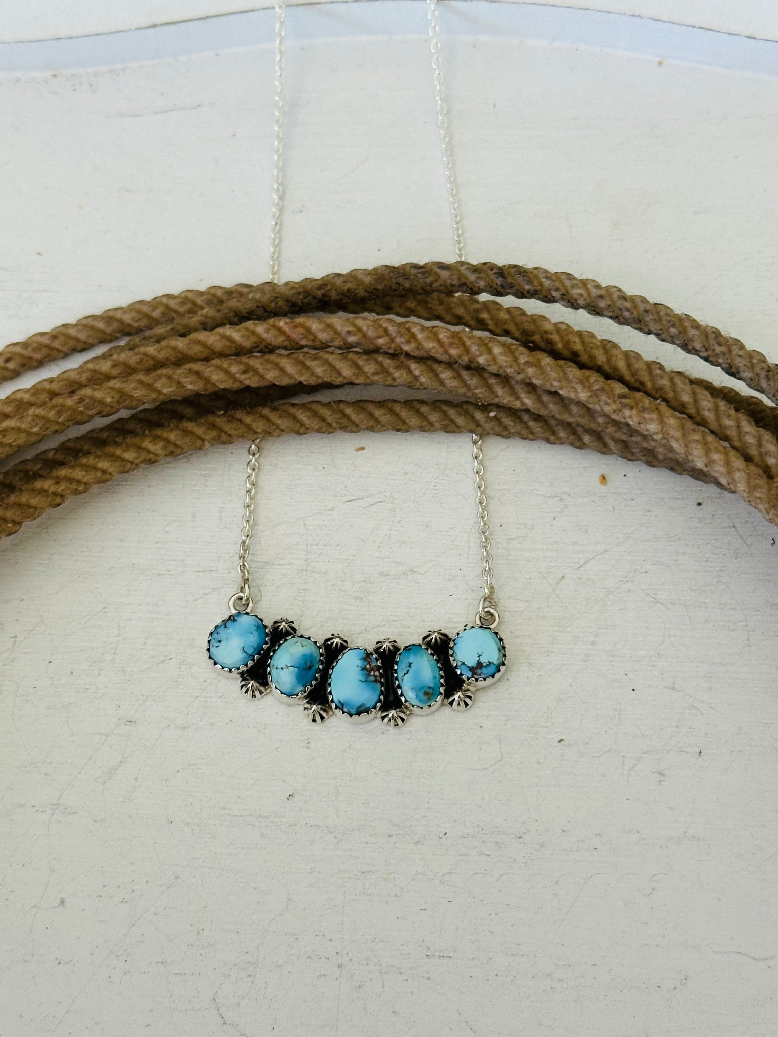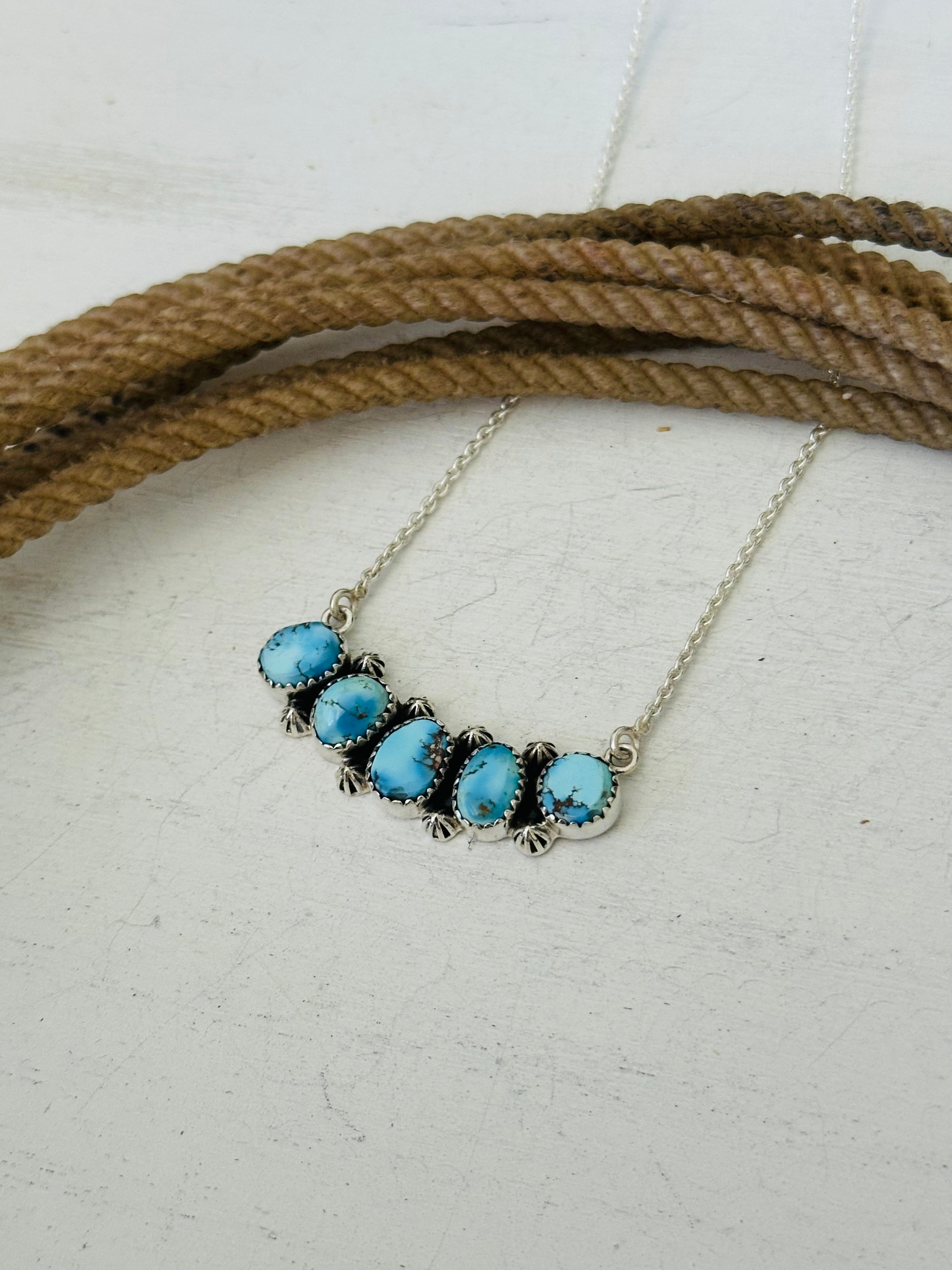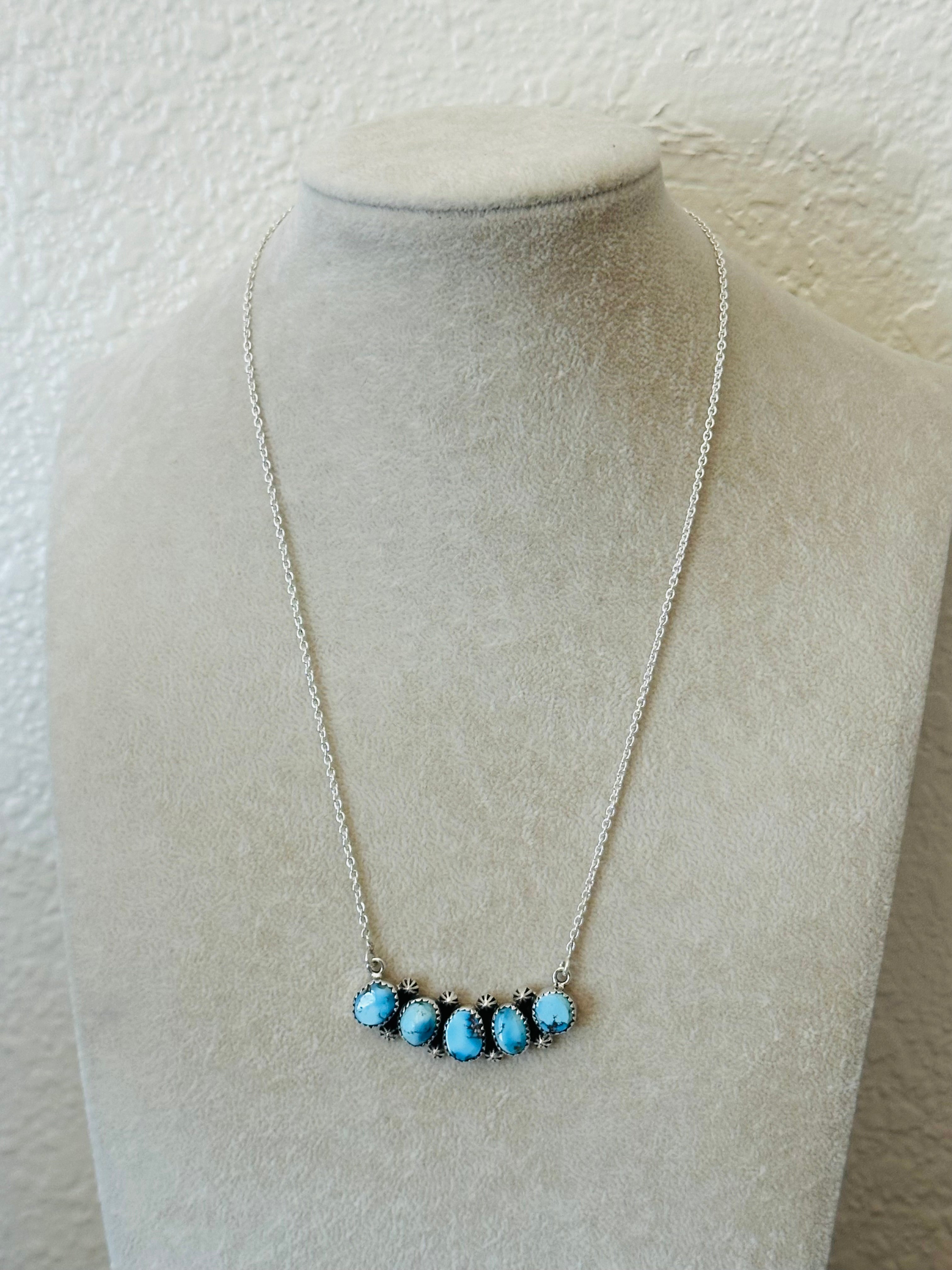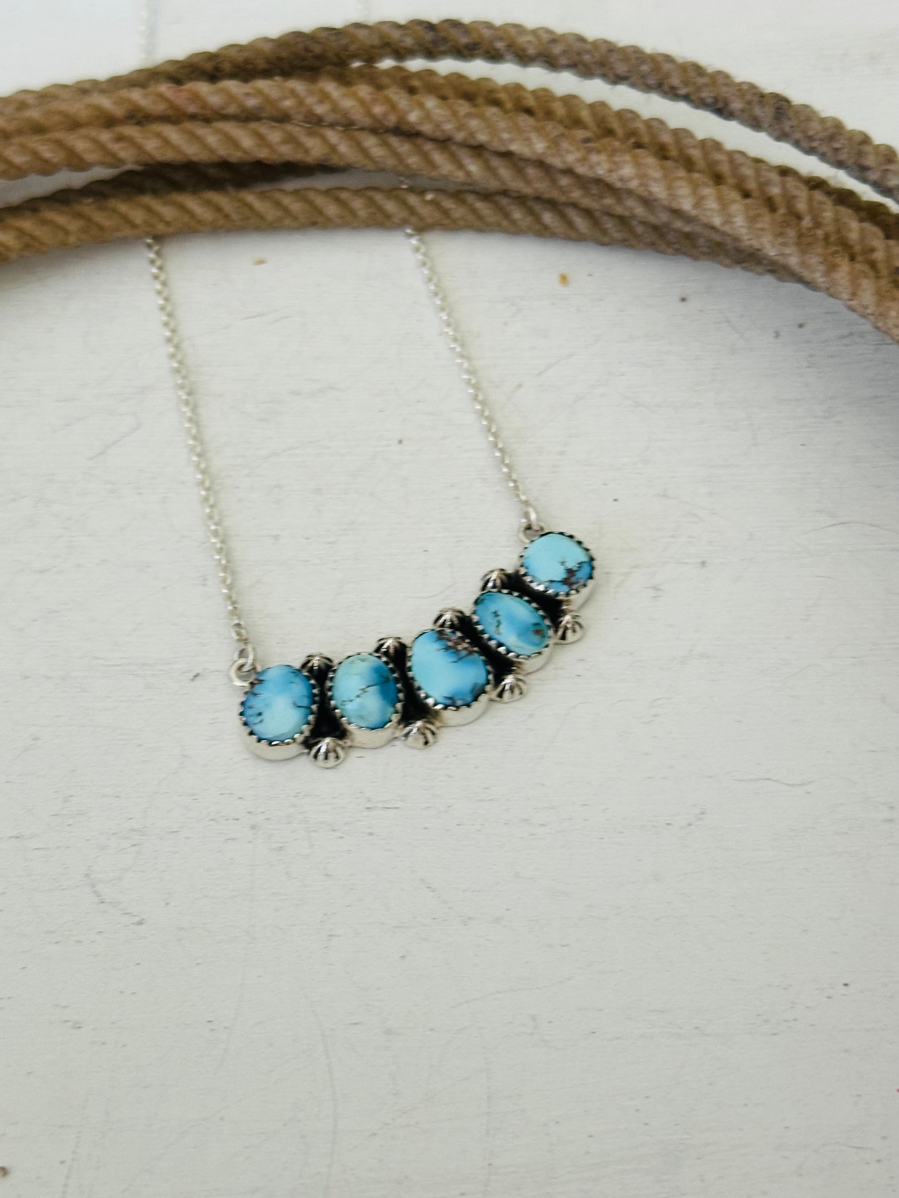 Beautiful necklace. Southwest Handmade Golden Hills Turquoise & Sterling Silver Necklace. It measures 20 1/2 inches long with hang while the chain by itself measures 19 inches long but can be adjusted down to 16 1/2 inches long. Signed by the artist and stamped sterling silver.