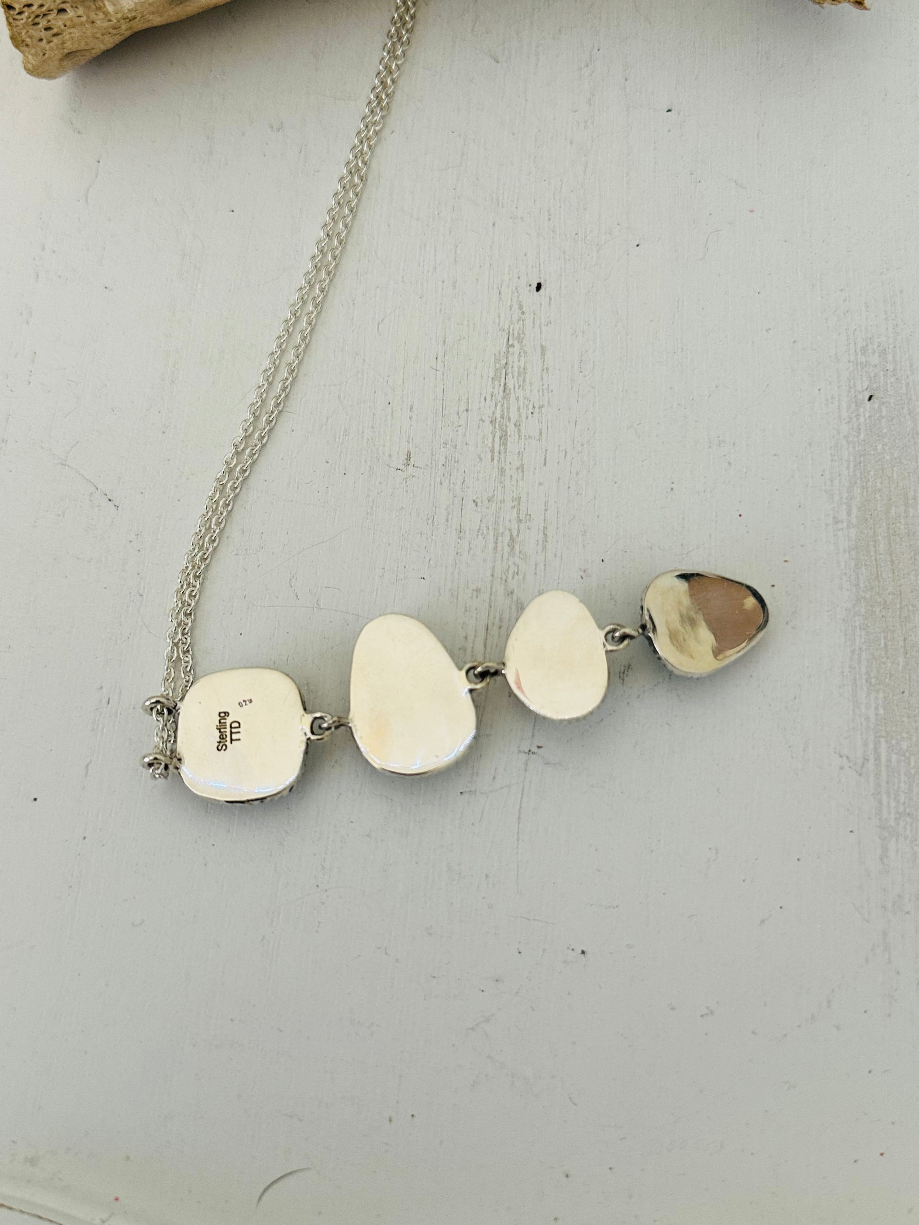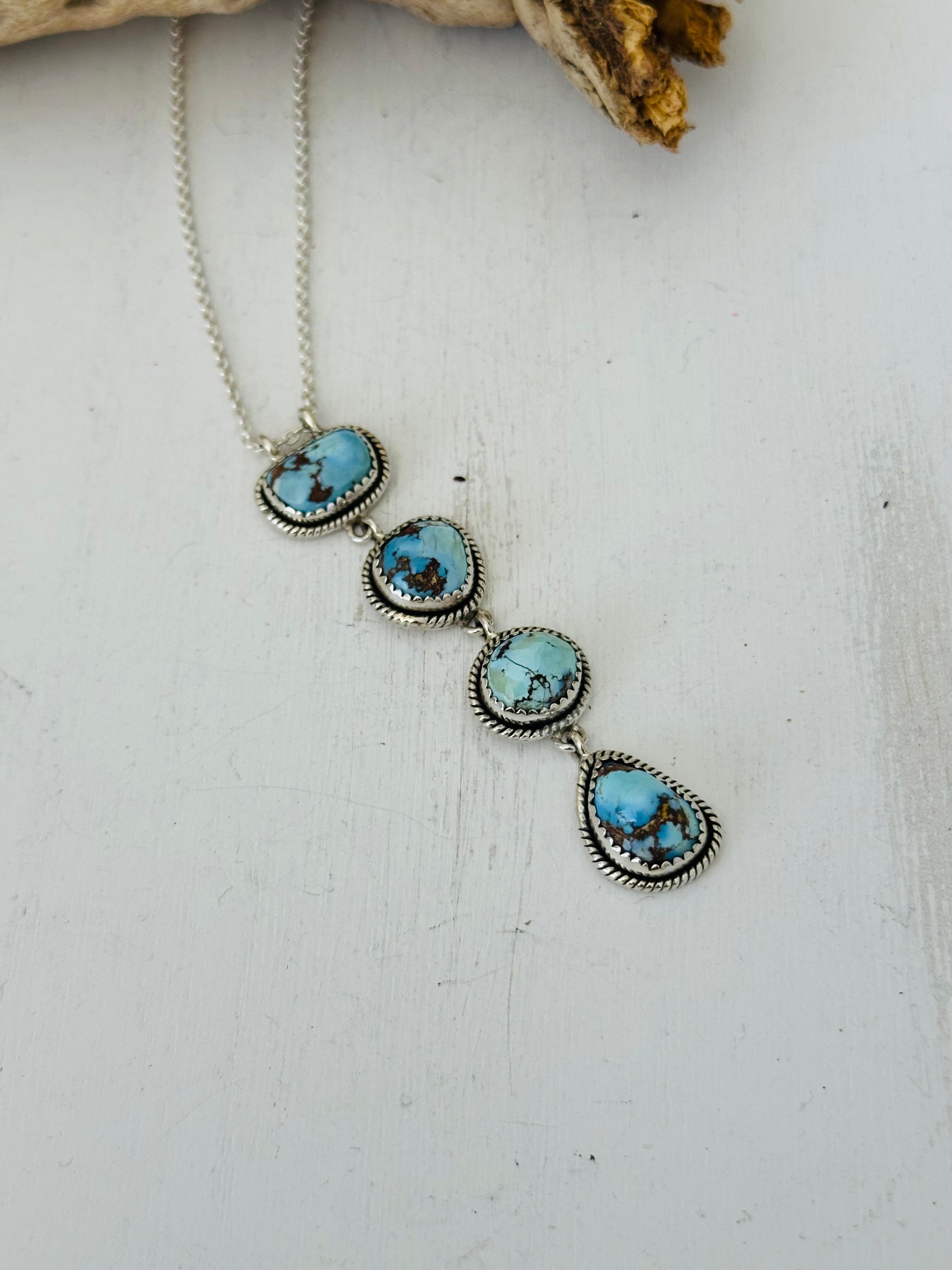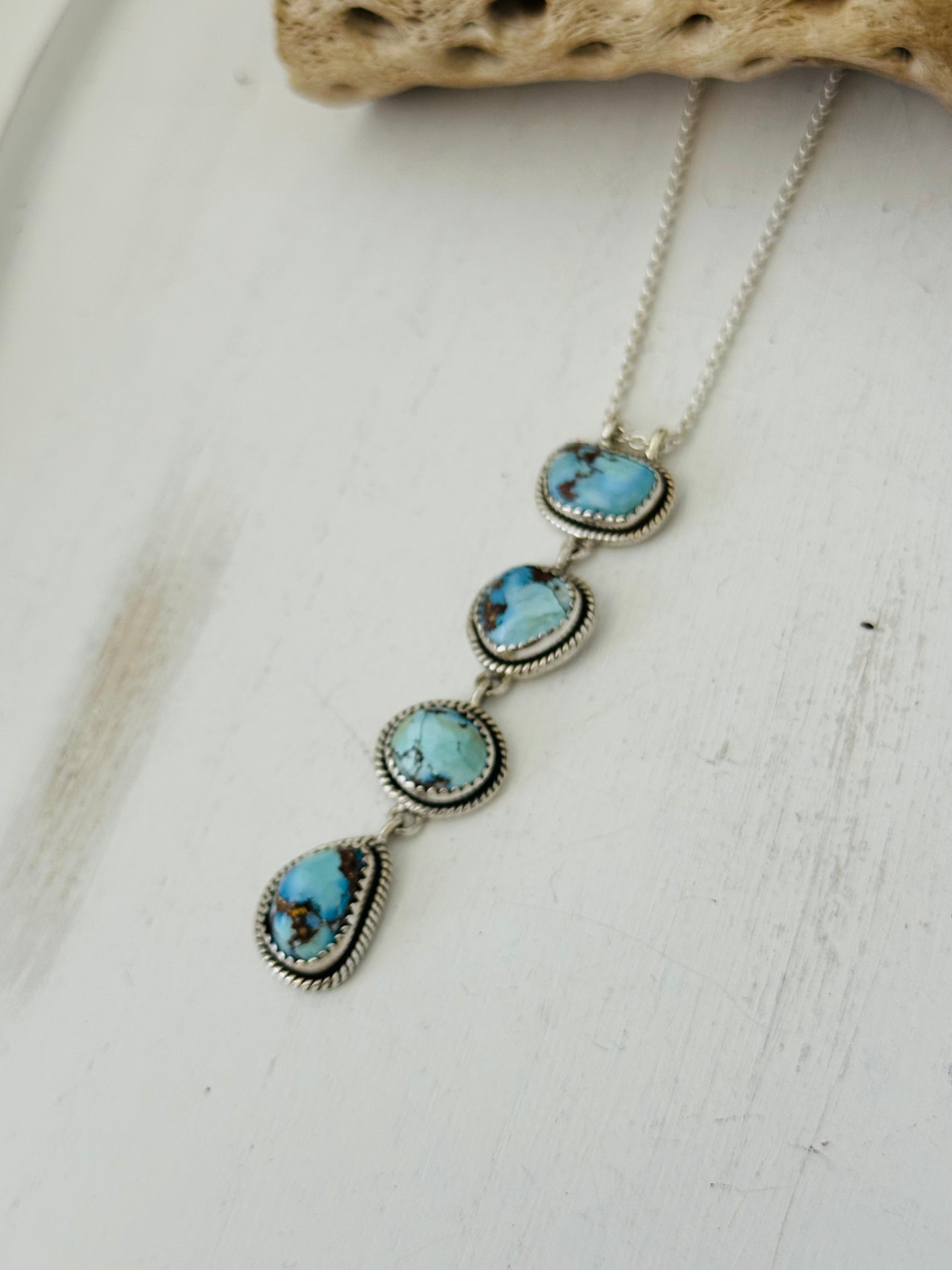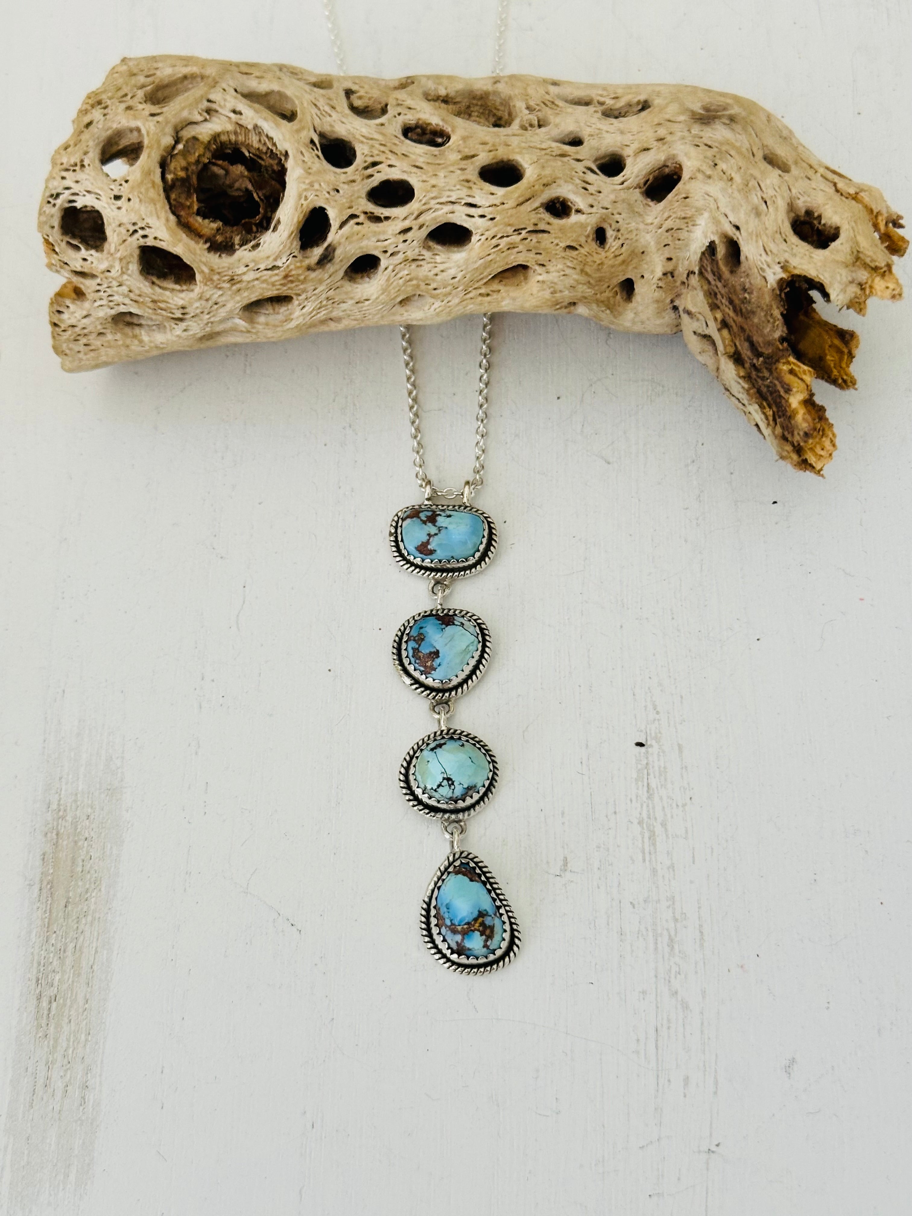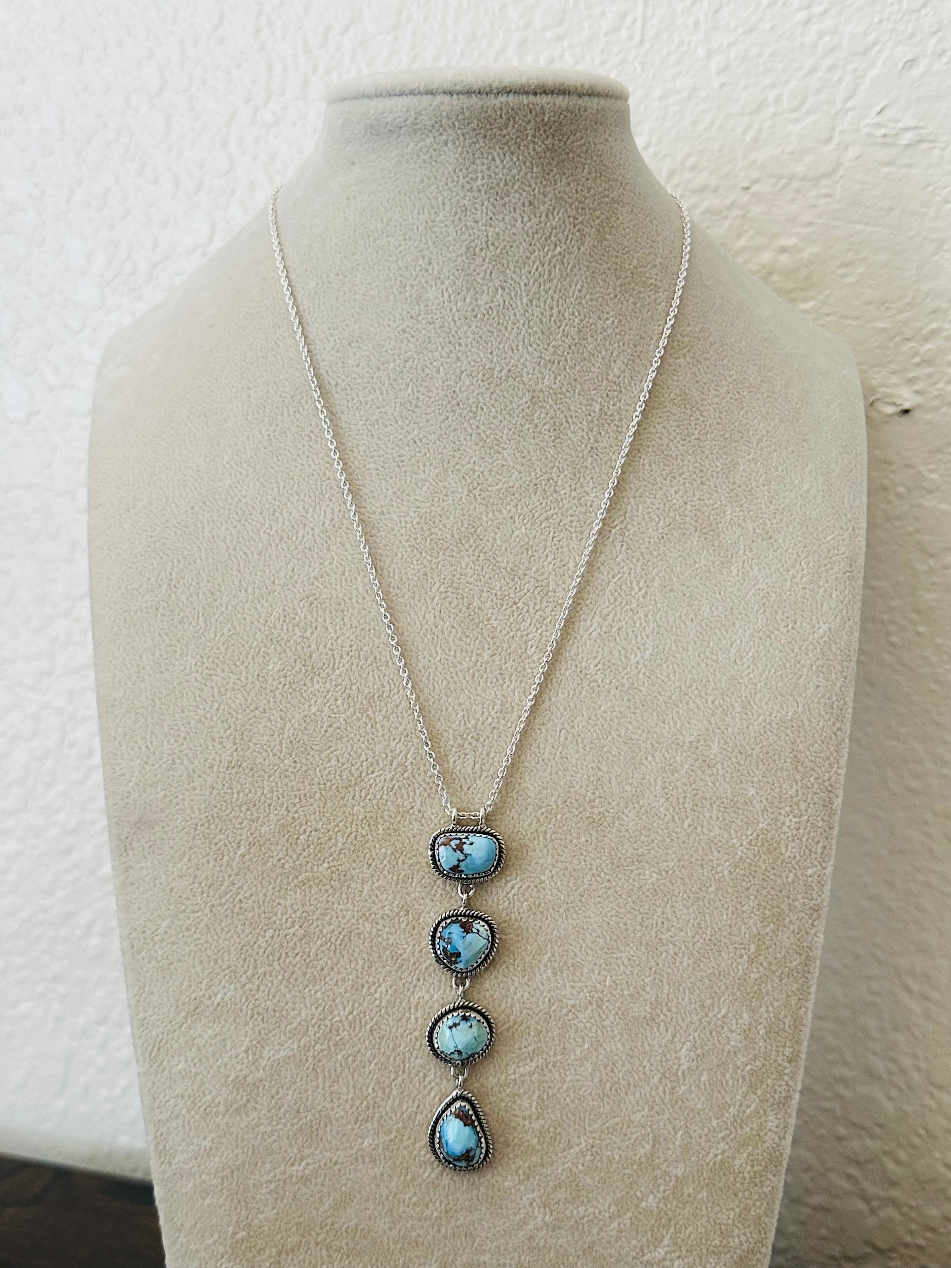 Beautiful necklace. Southwest Handmade Golden Hills Turquoise & Sterling Silver Necklace. It measures 25 1/2 inches long with hang while the chain by itself measures 19 inches long but can be adjusted down to 16 1/2 inches long. Signed by the artist and stamped sterling silver.