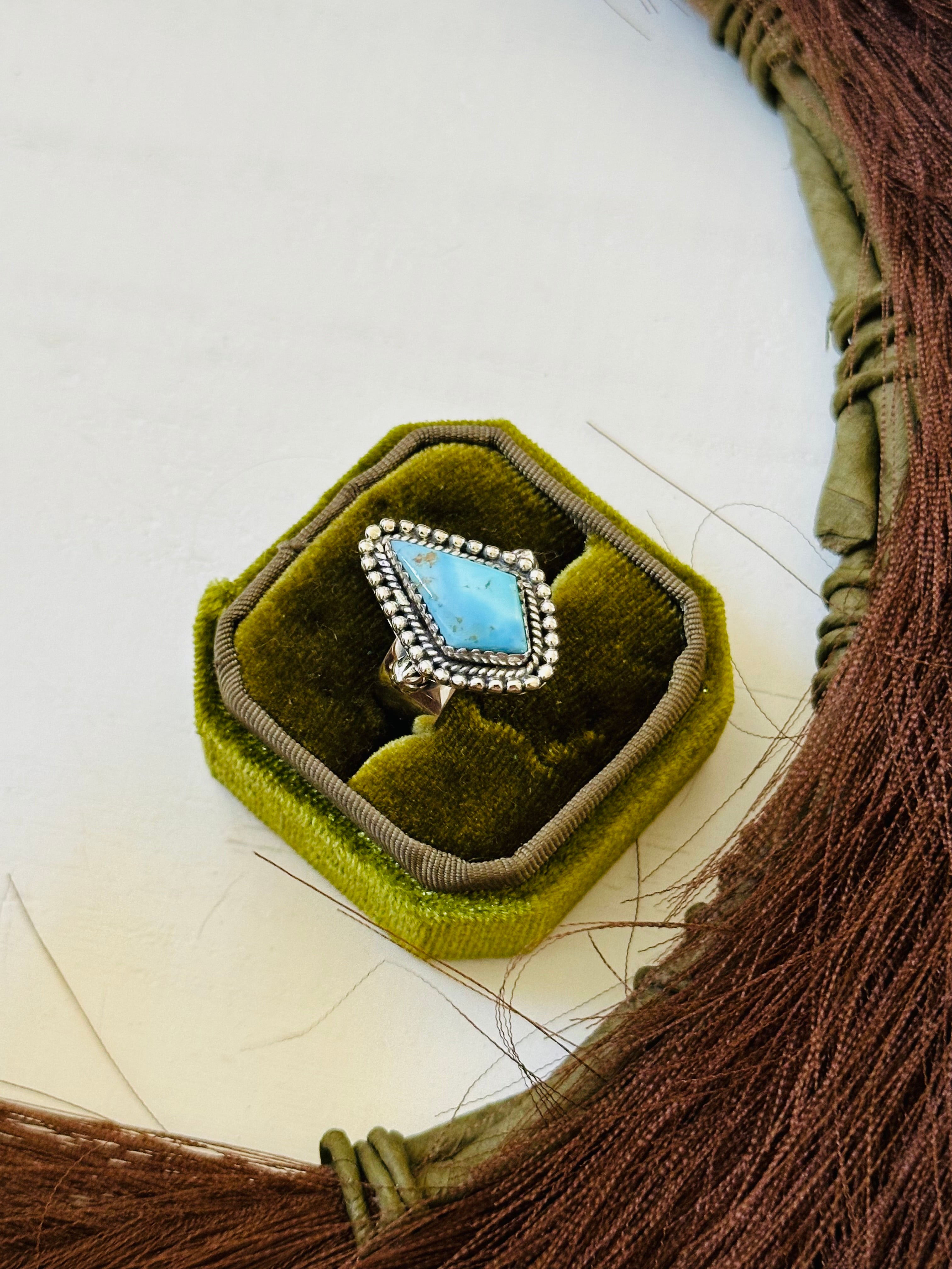 Beautiful ring. Southwest Handmade Golden Hills Turquoise & Sterling Silver Ring Size 8.75. It measures 1 inch long and 3/4 of an inch wide. Signed by the artist and stamped sterling silver.