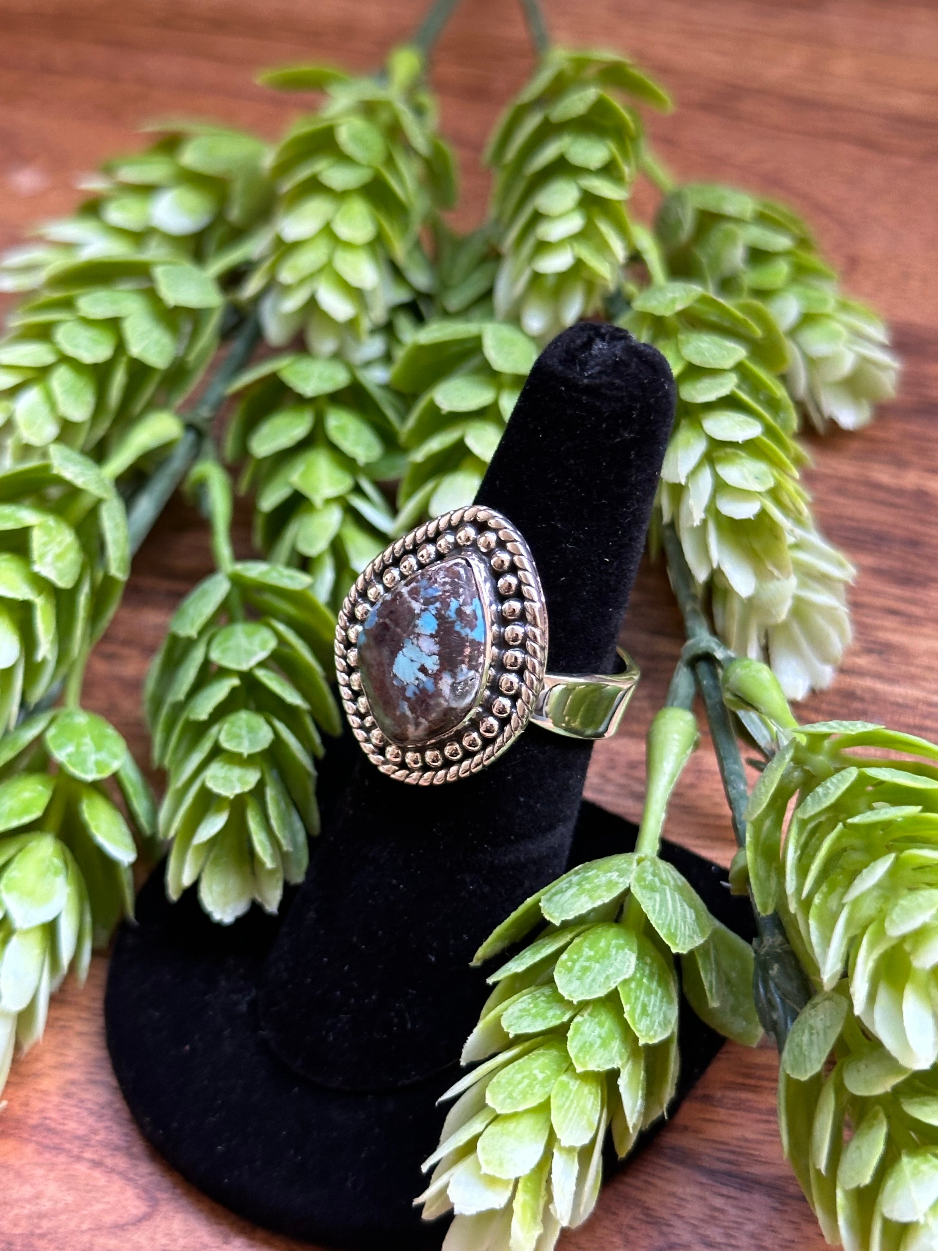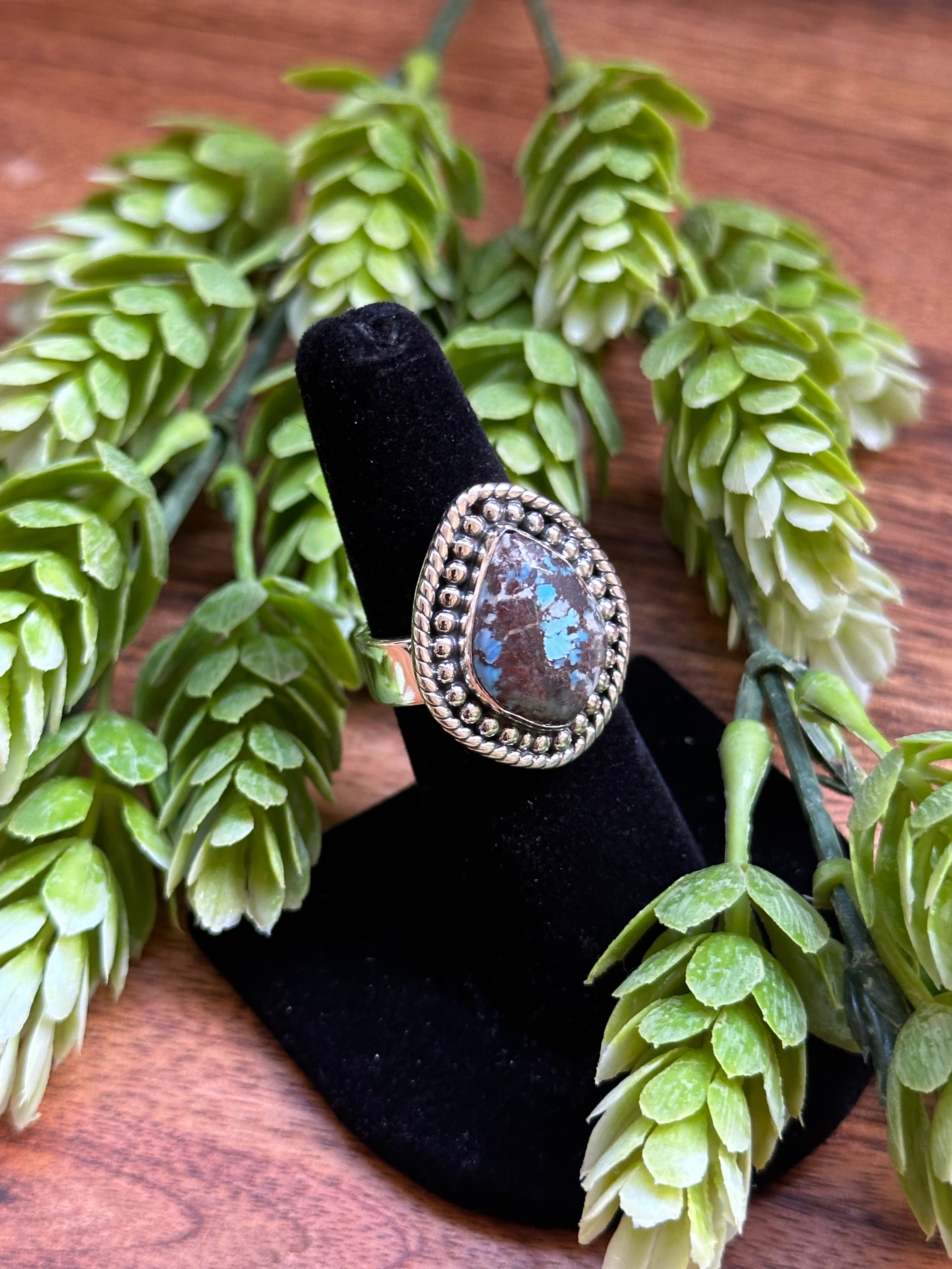 Beautiful ring. Southwest Handmade Golden Hills Turquoise & Sterling Silver Adjustable Ring. It measures 1 inch long and 7/8 of an inch wide. Signed by the artist and stamped sterling silver.