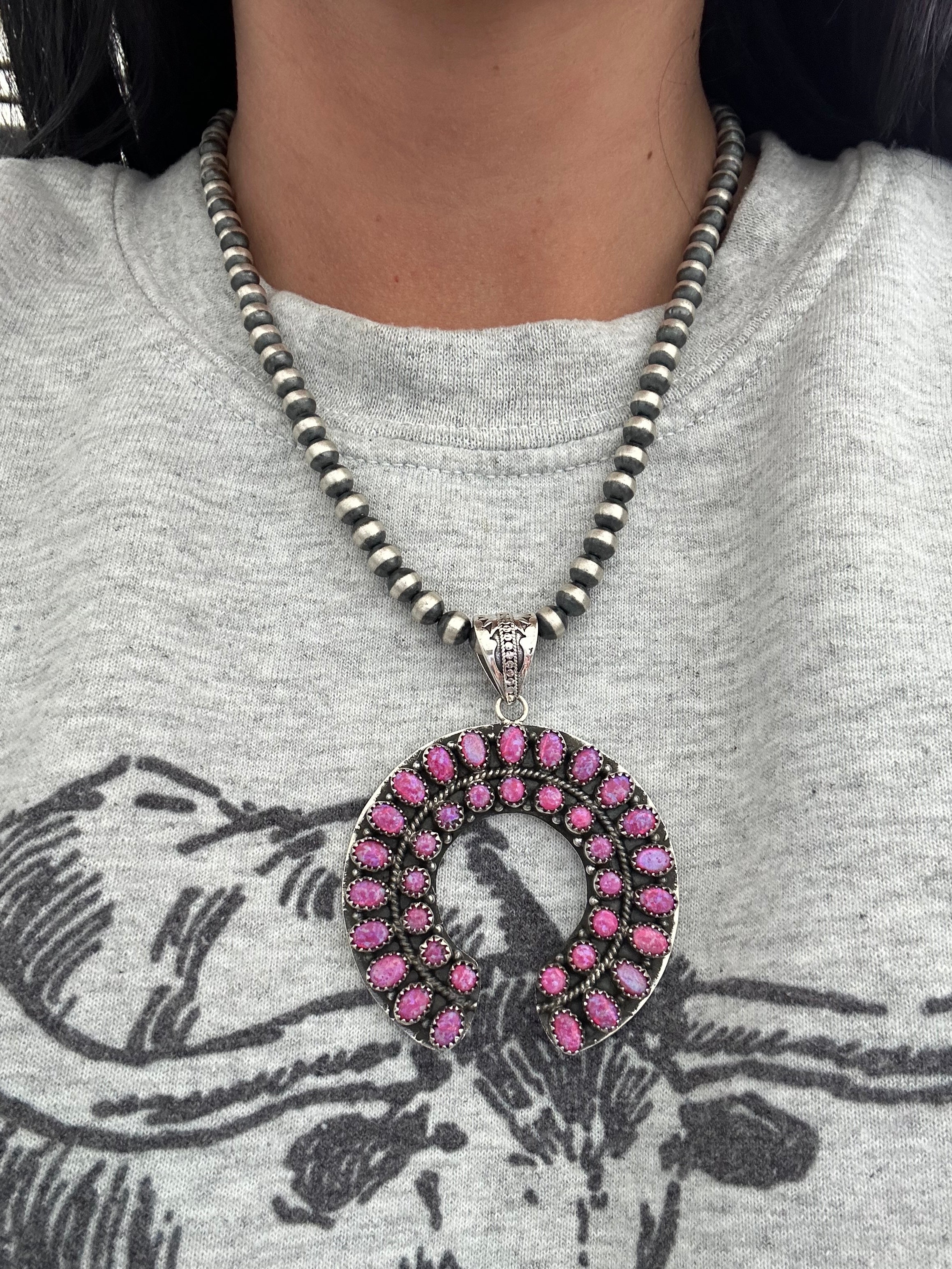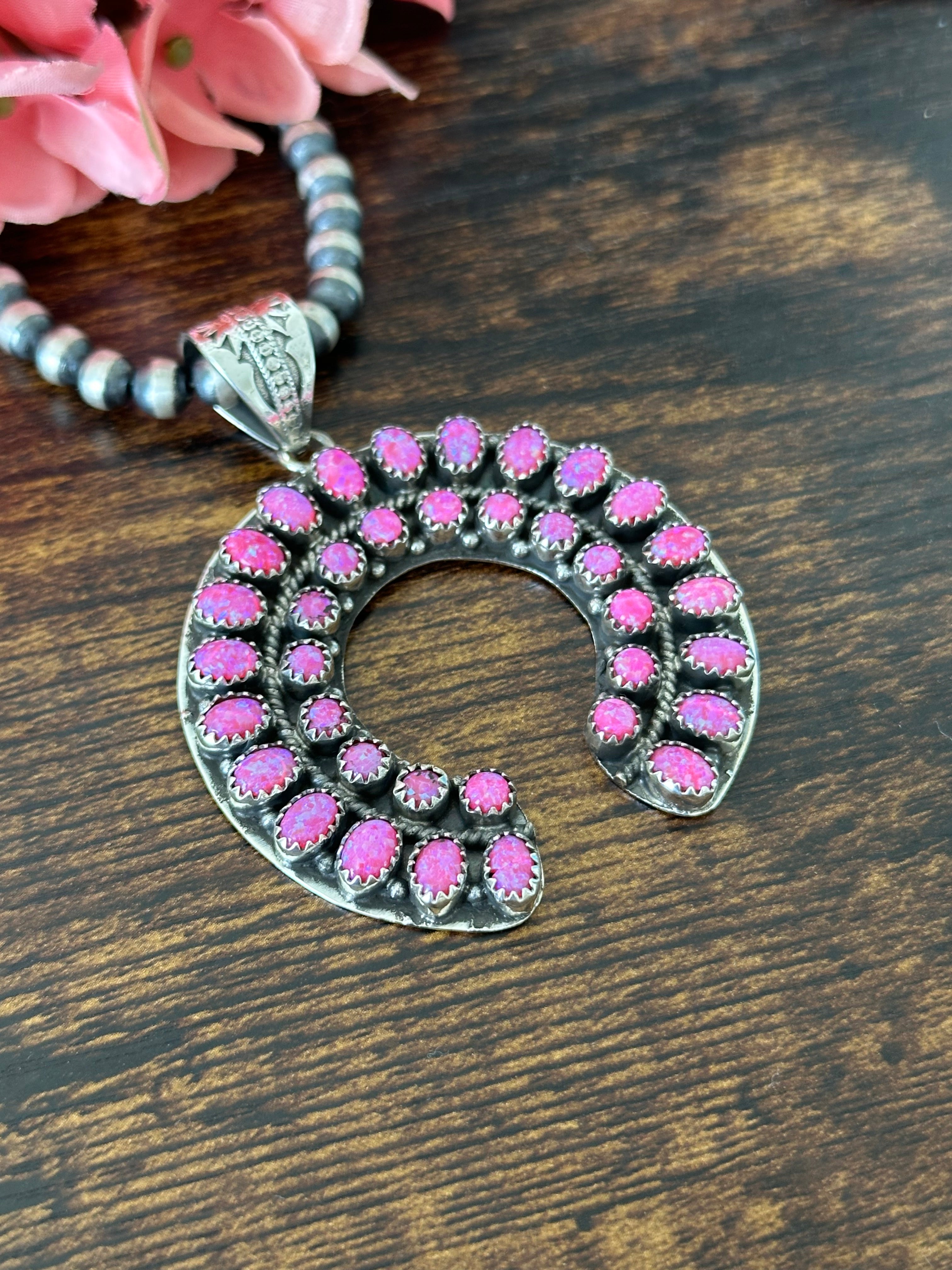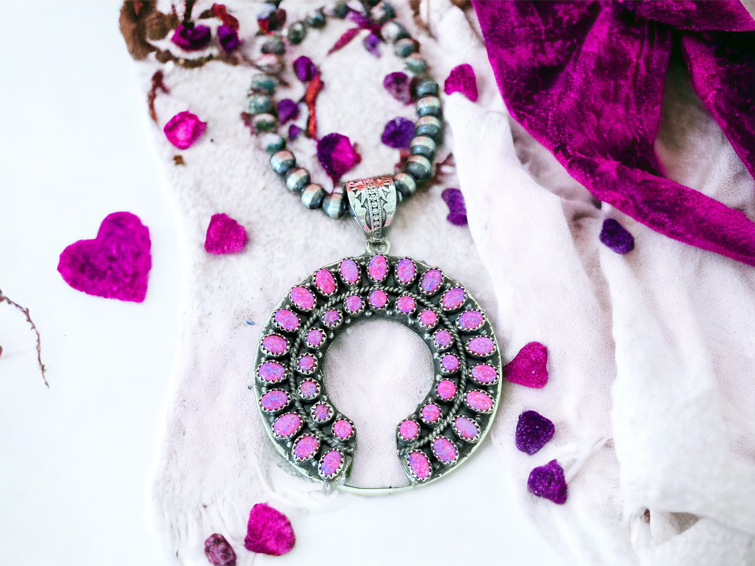 Beautiful cluster pendant. Southwest Handmade Hot Pink Opal & Sterling Silver Cluster Naja Pendant. It measures 2 3/4 inches long and 2 1/8 inches wide. Signed by the artist and stamped sterling silver.