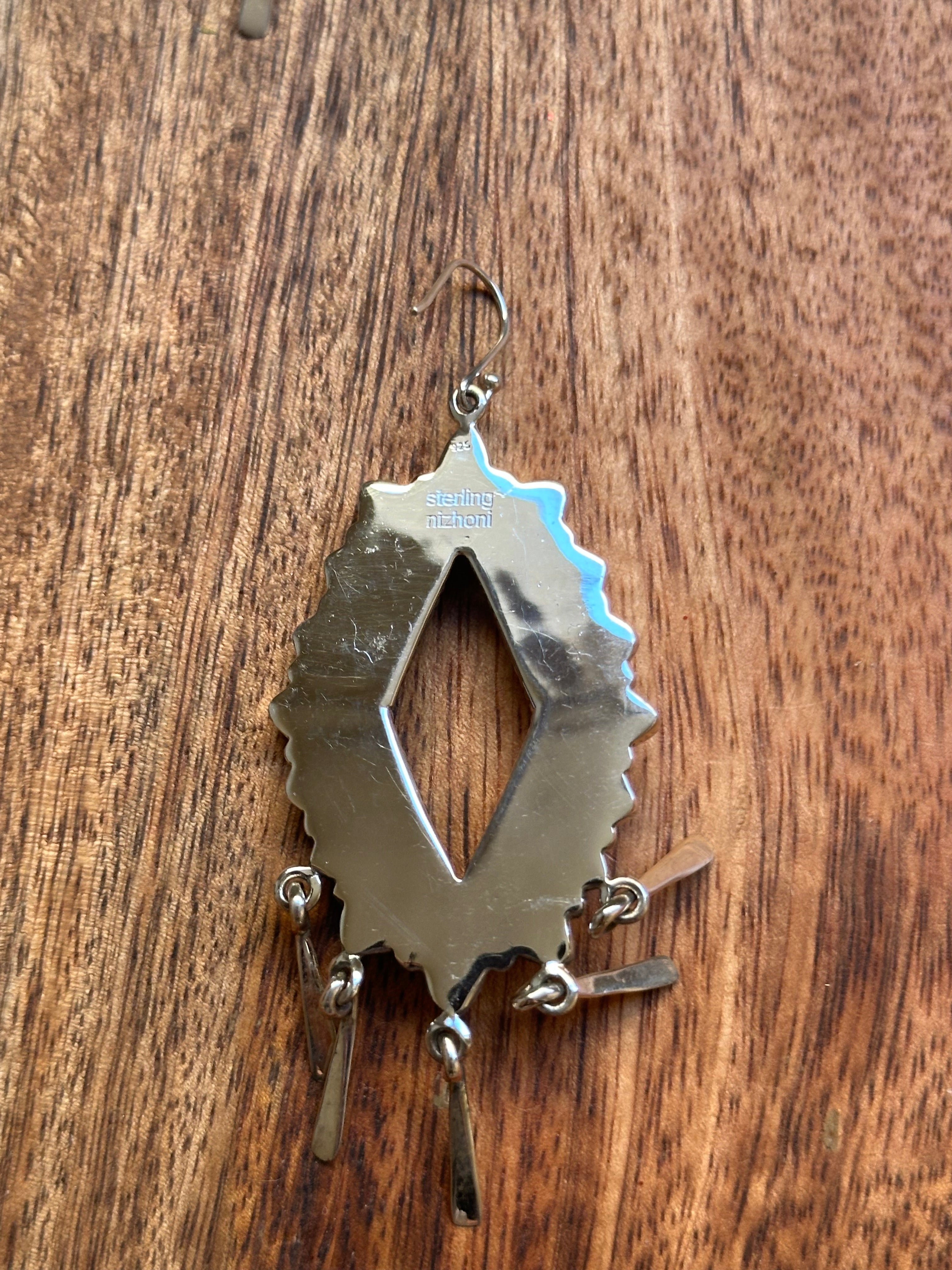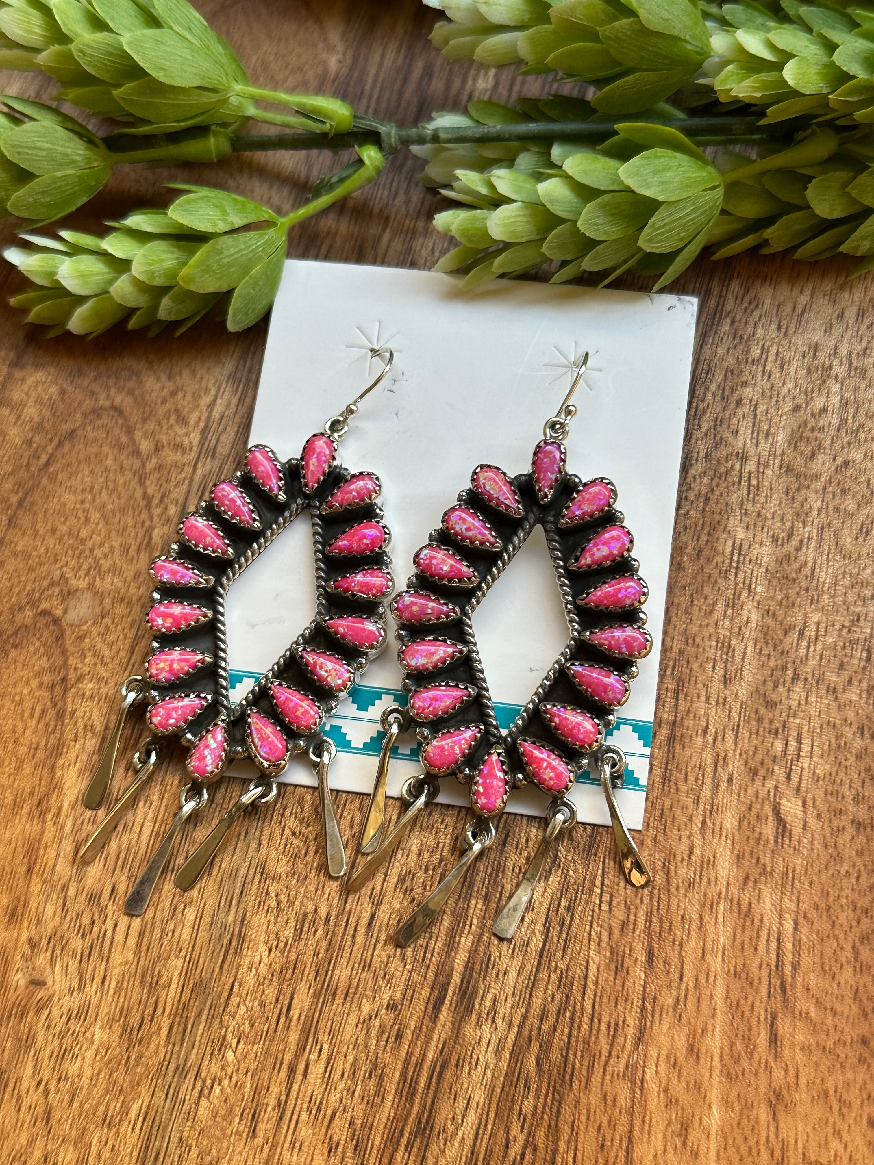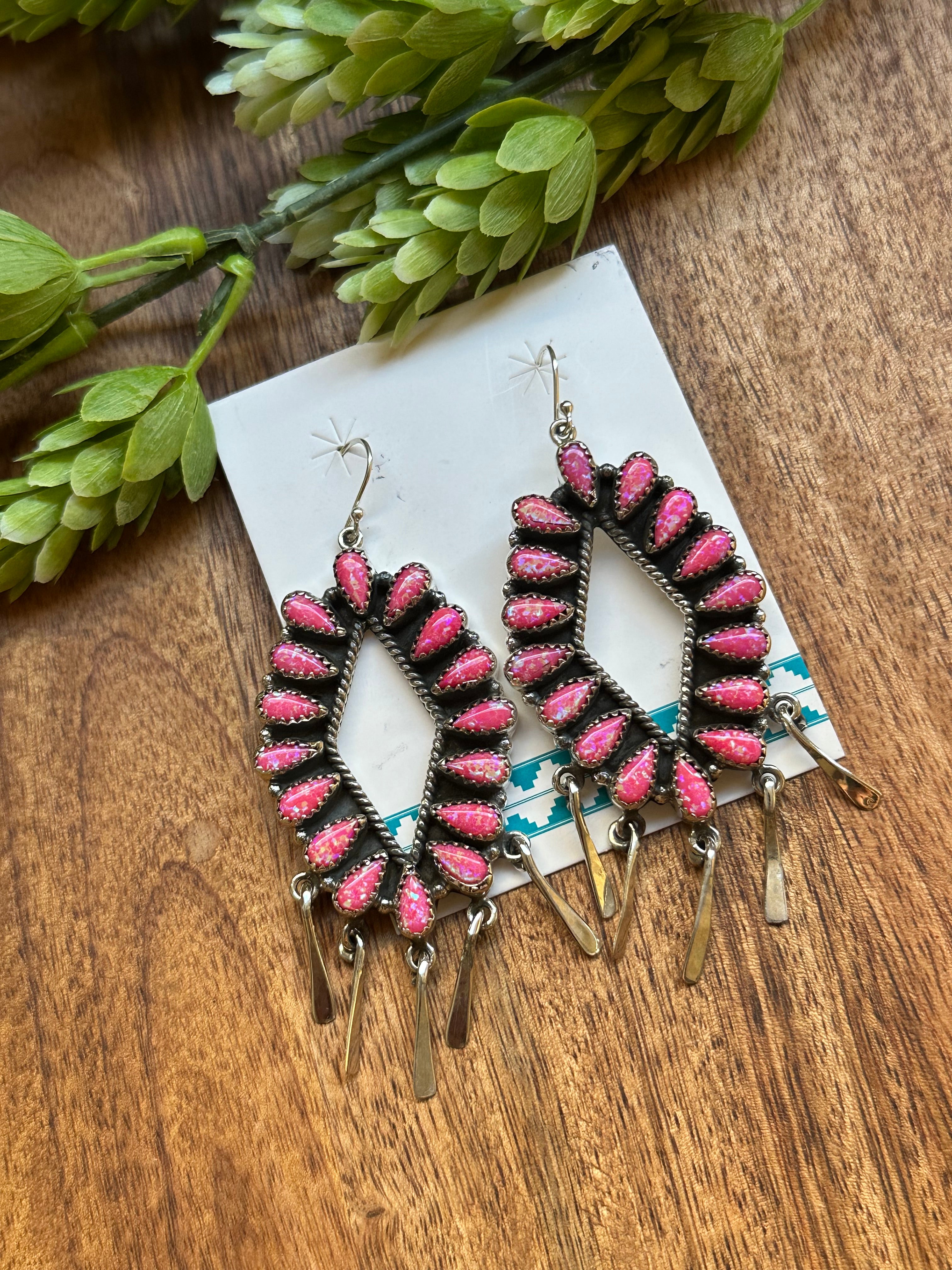 Breathtaking earrings. Southwest Handmade Pink Opal & Sterling Silver Dangle Earrings. It measures 3 3/8 inches long and 1 1/4 inches wide. Signed by the artist and stamped sterling silver.