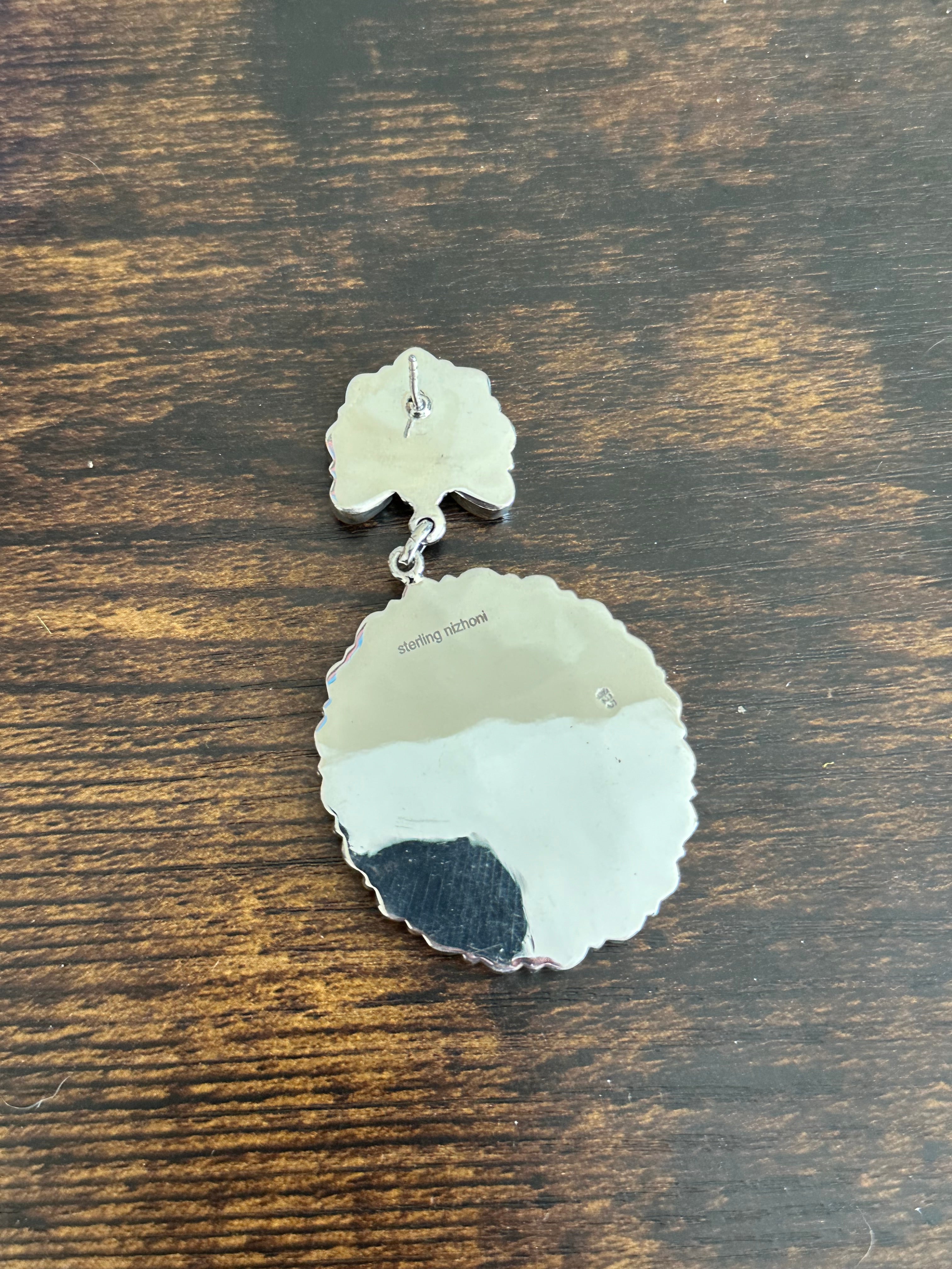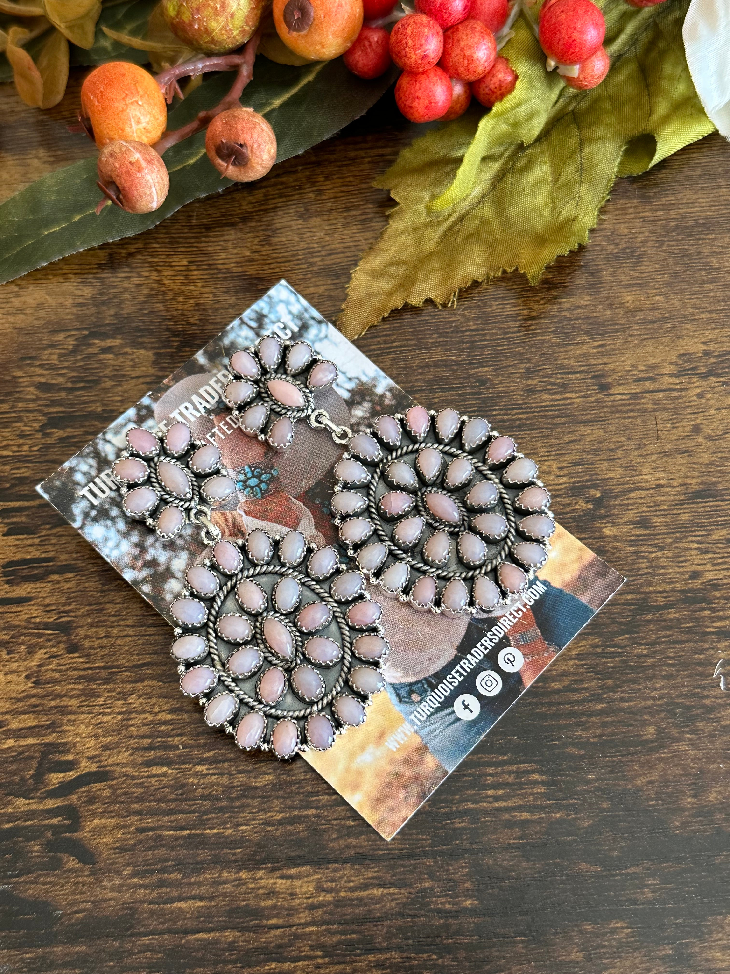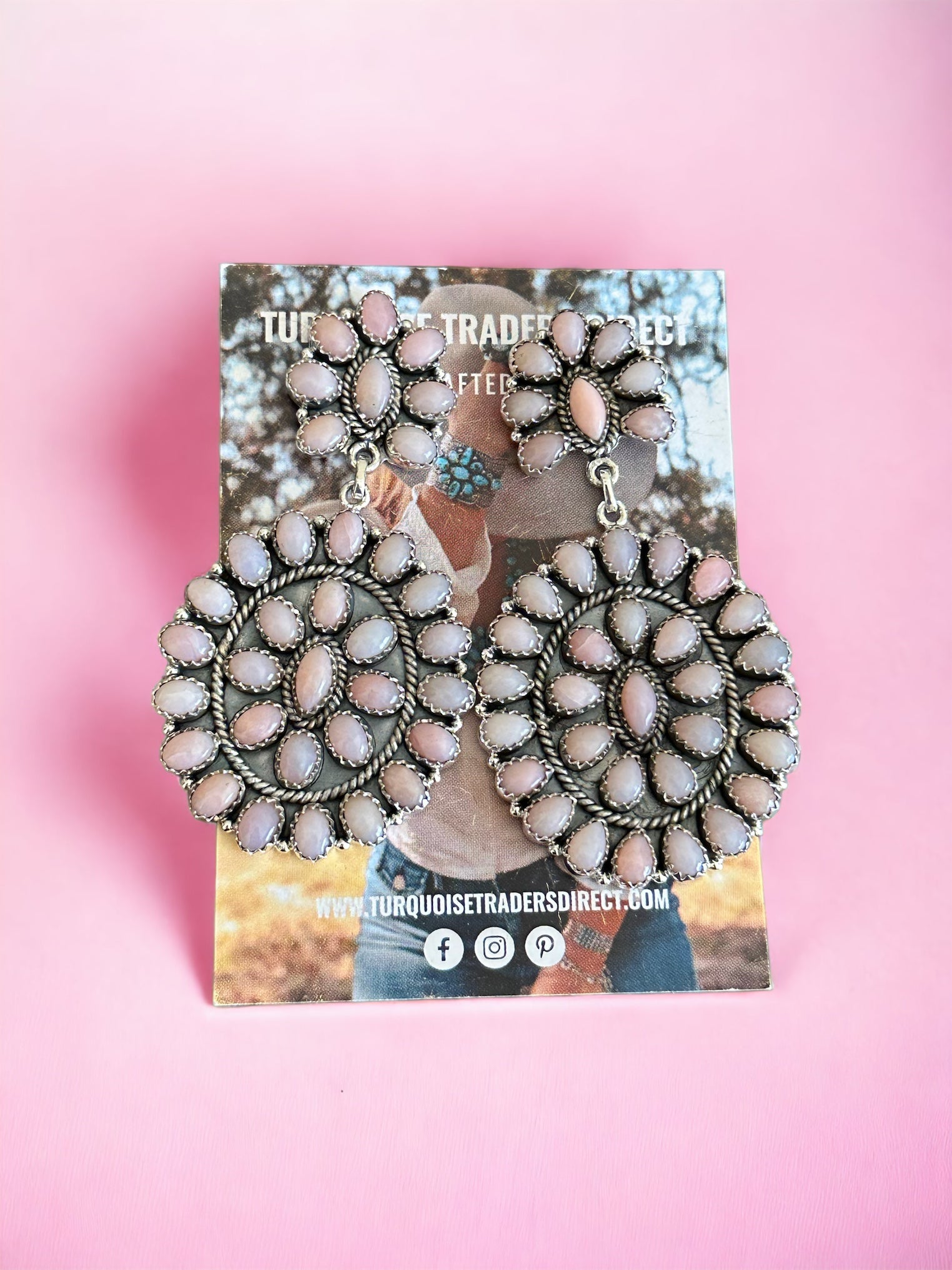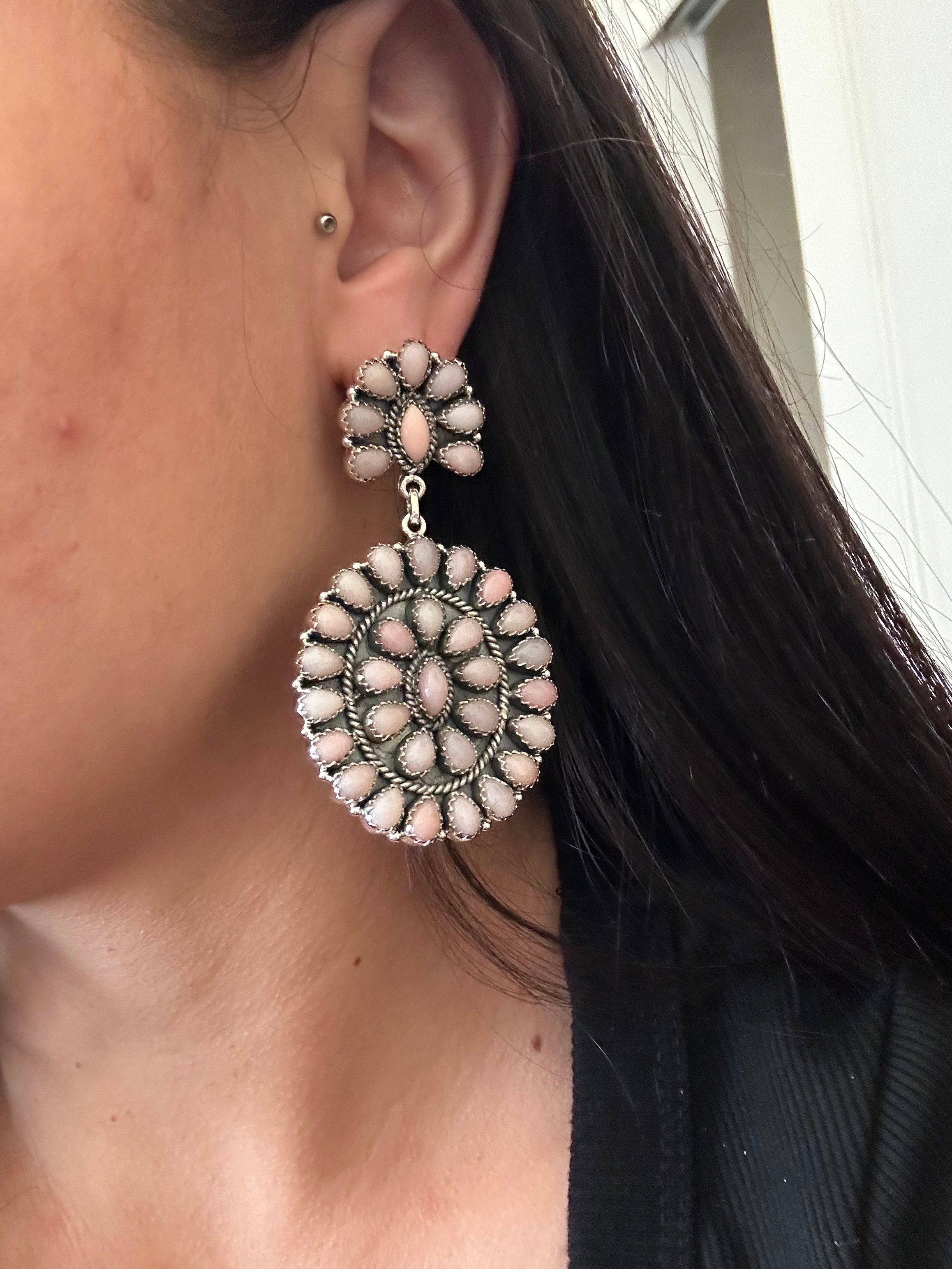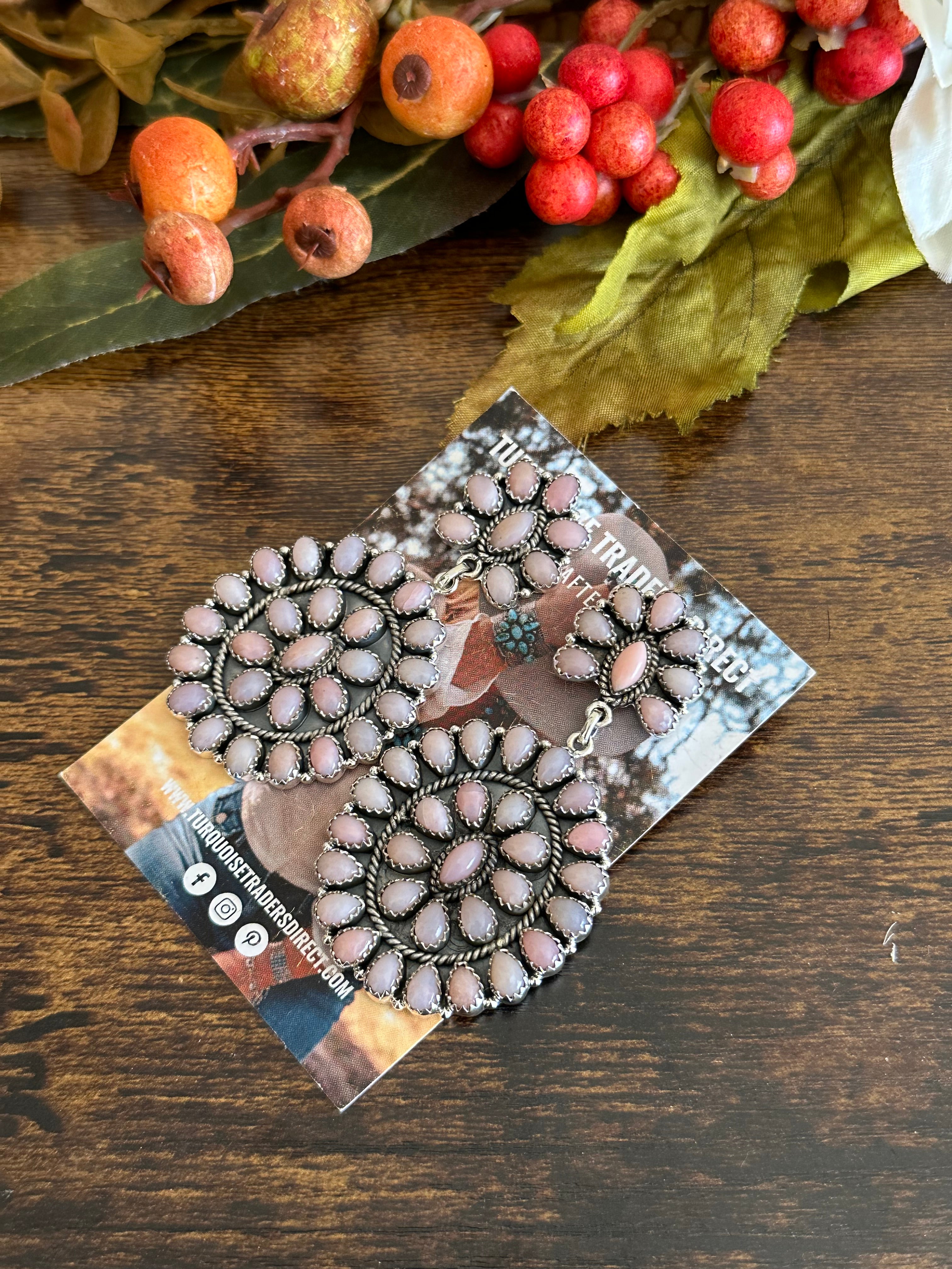 Breathtaking earrings. Southwest Handmade Peruvian Pink Opal & Sterling Silver Post Dangle Cluster Earrings. It measures 2 3/4 inches long and 1 5/8 inches round. Signed by the artist and stamped sterling silver.