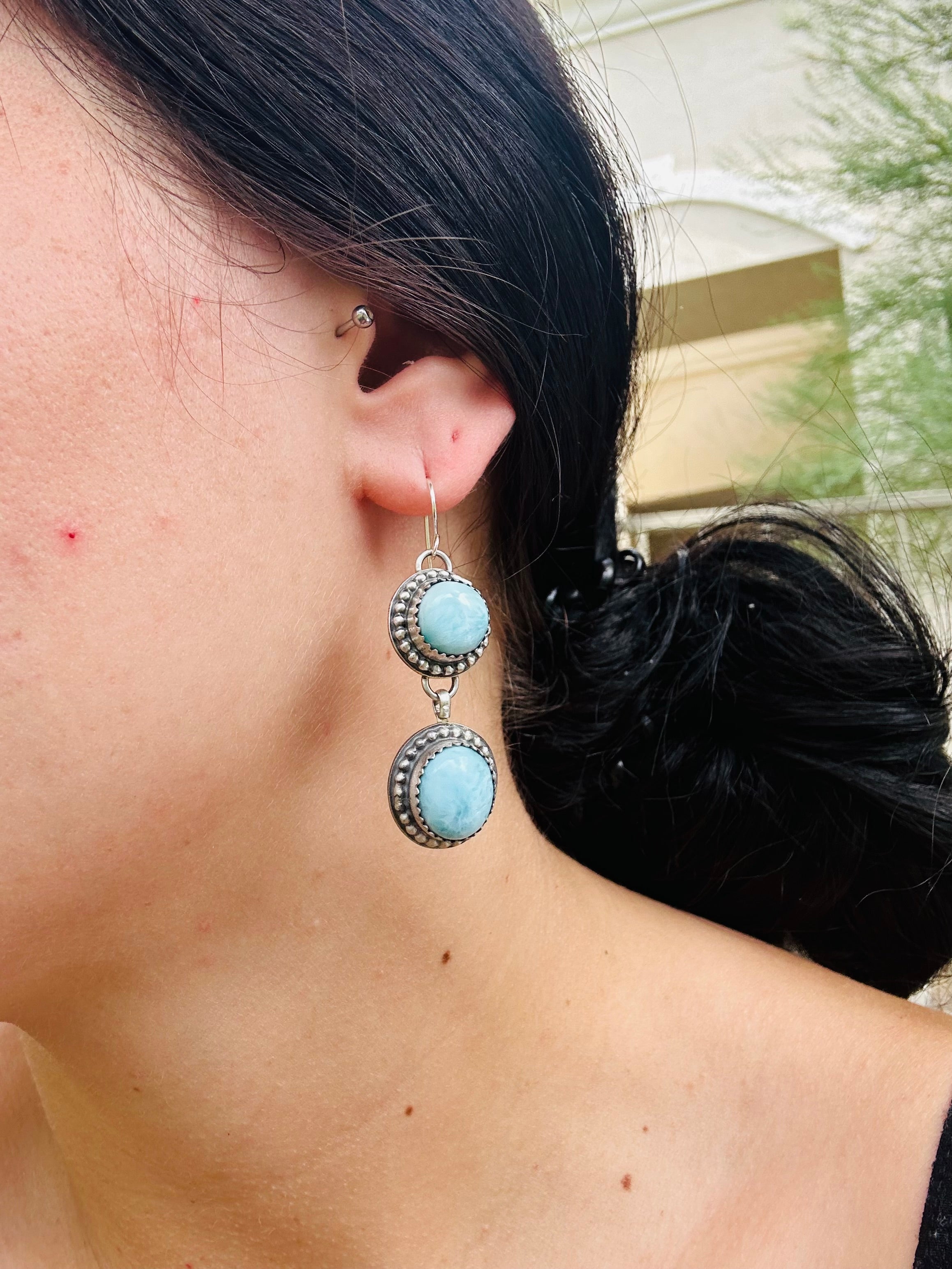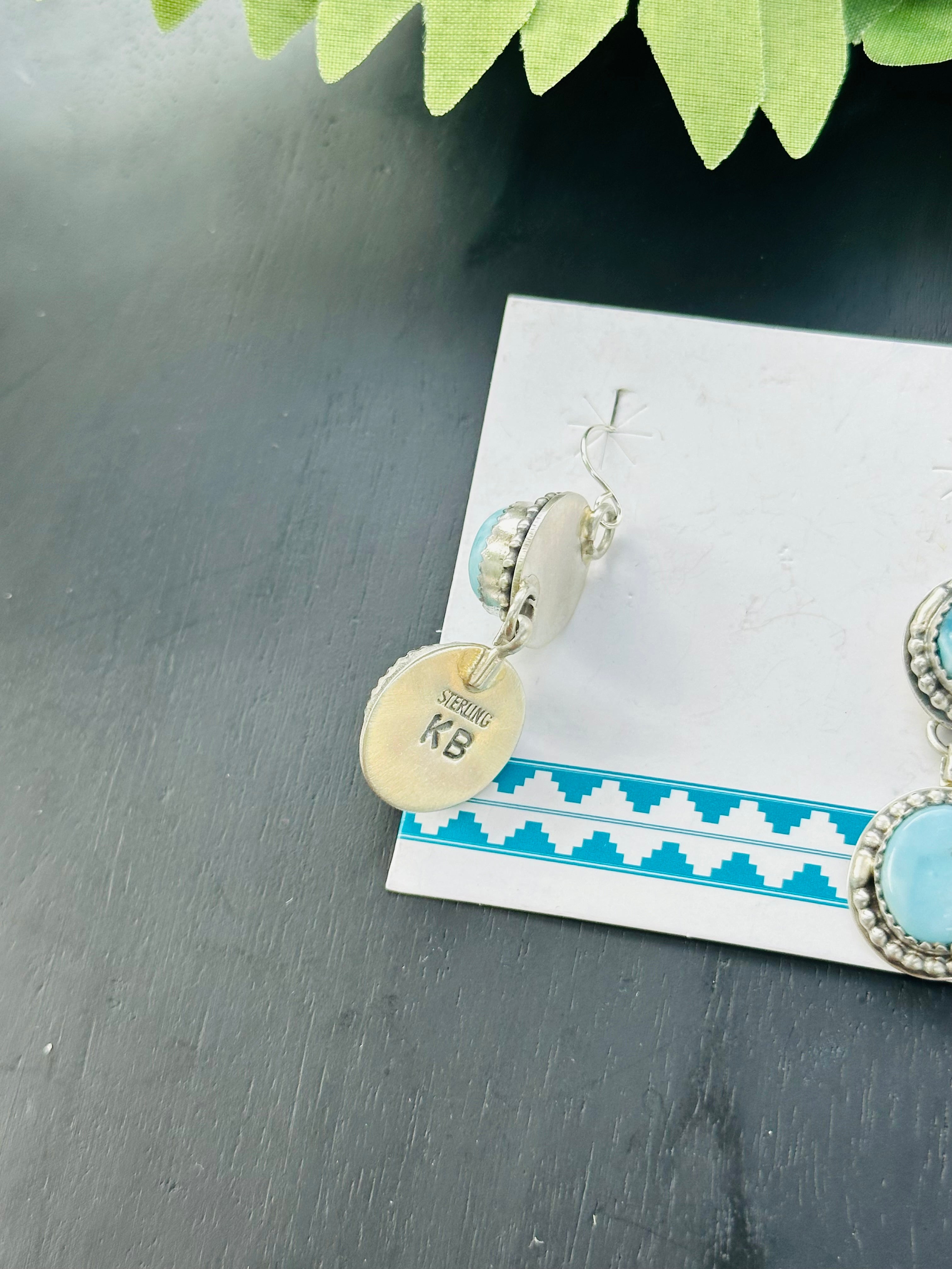 Breathtaking earrings. Kevin Begay Larimar & Sterling Silver Dangle Earrings. It measures 2 inches long and 1/2 of an inch wide. Stamped sterling silver and signed.