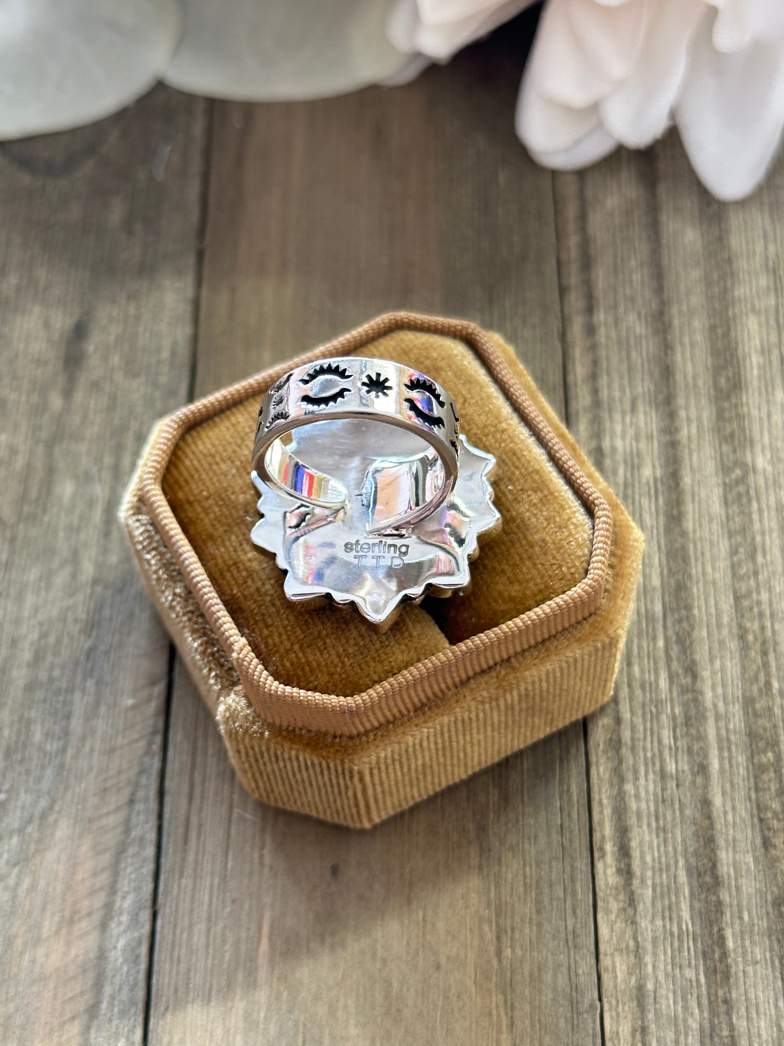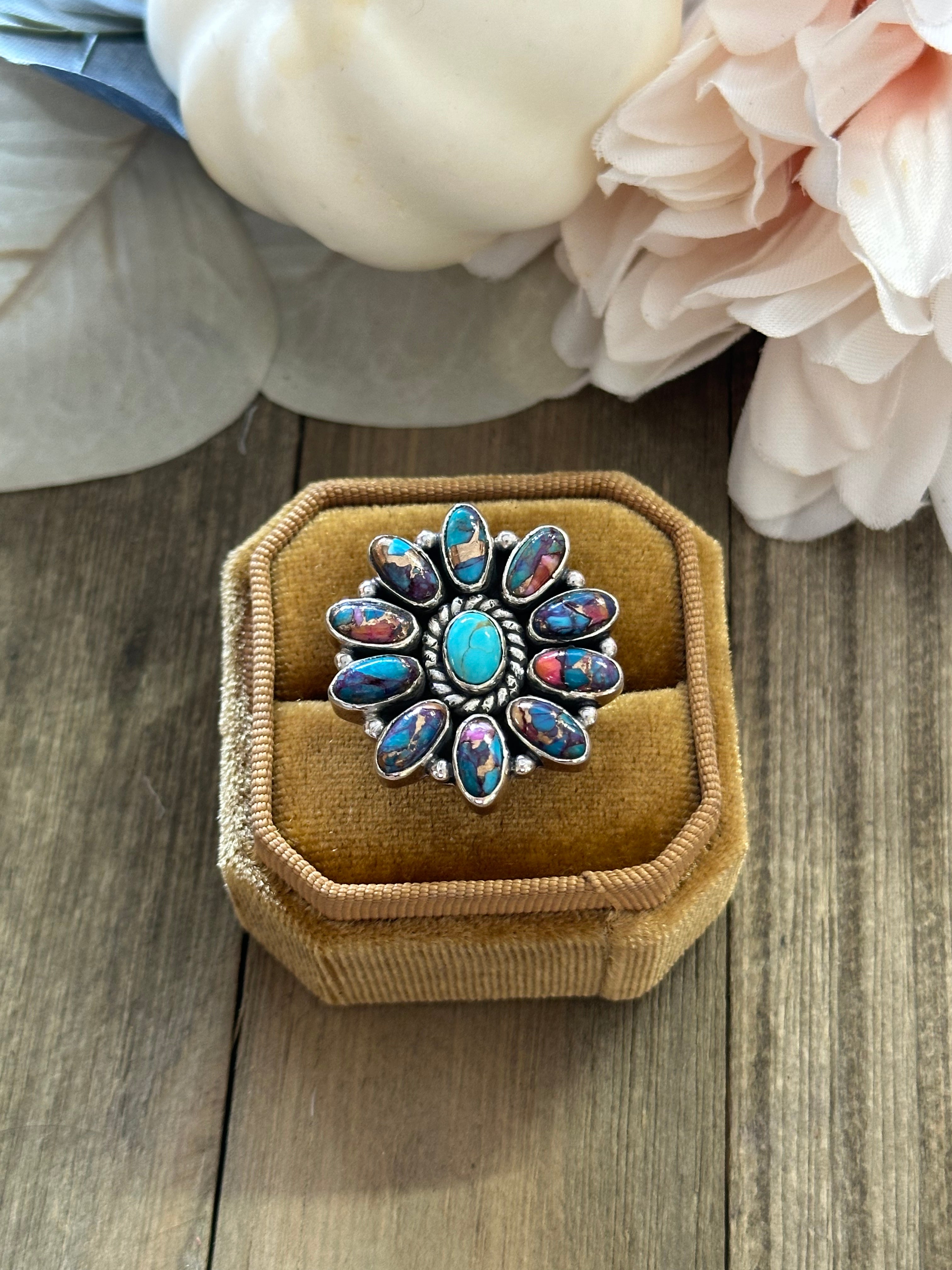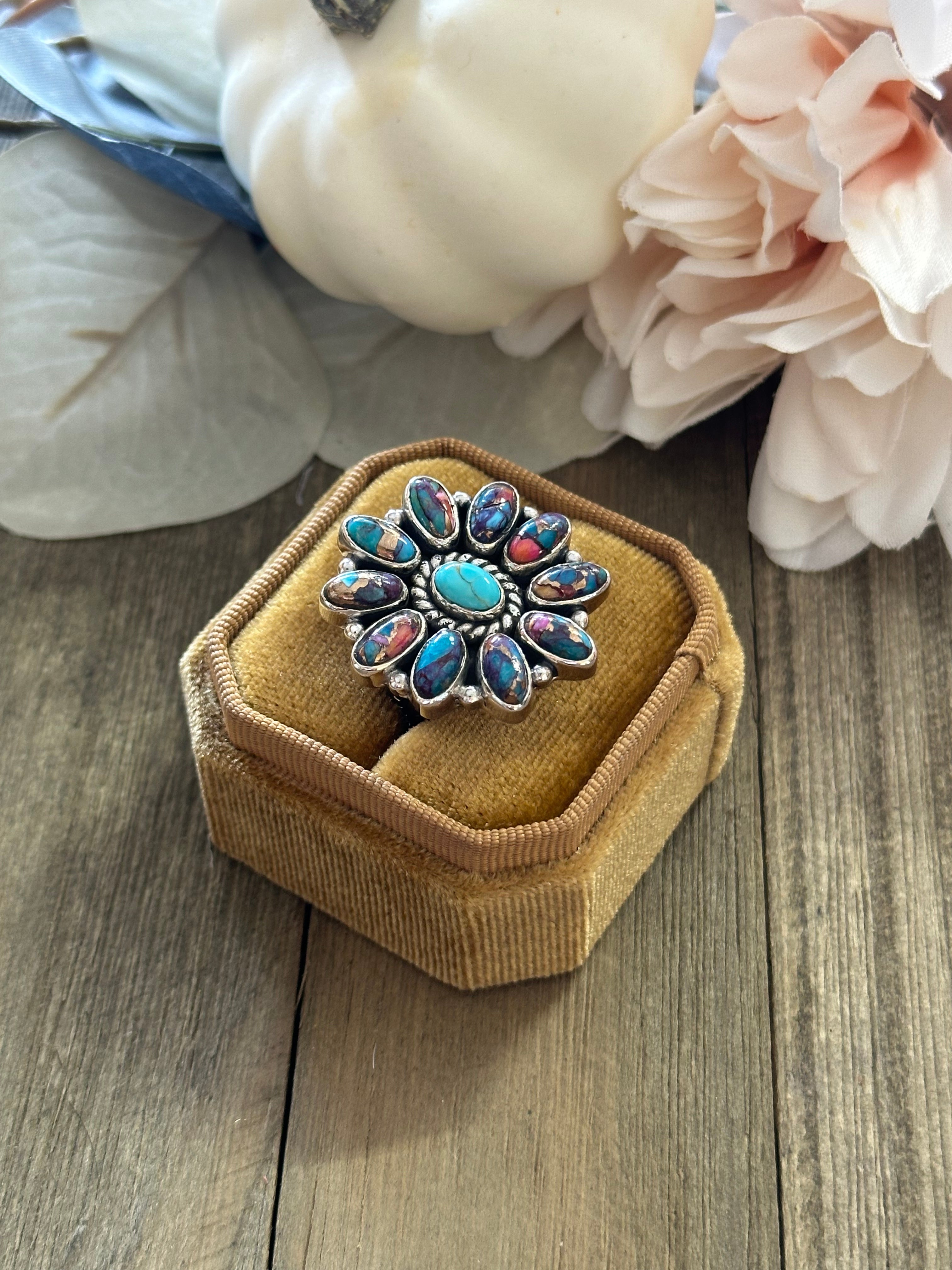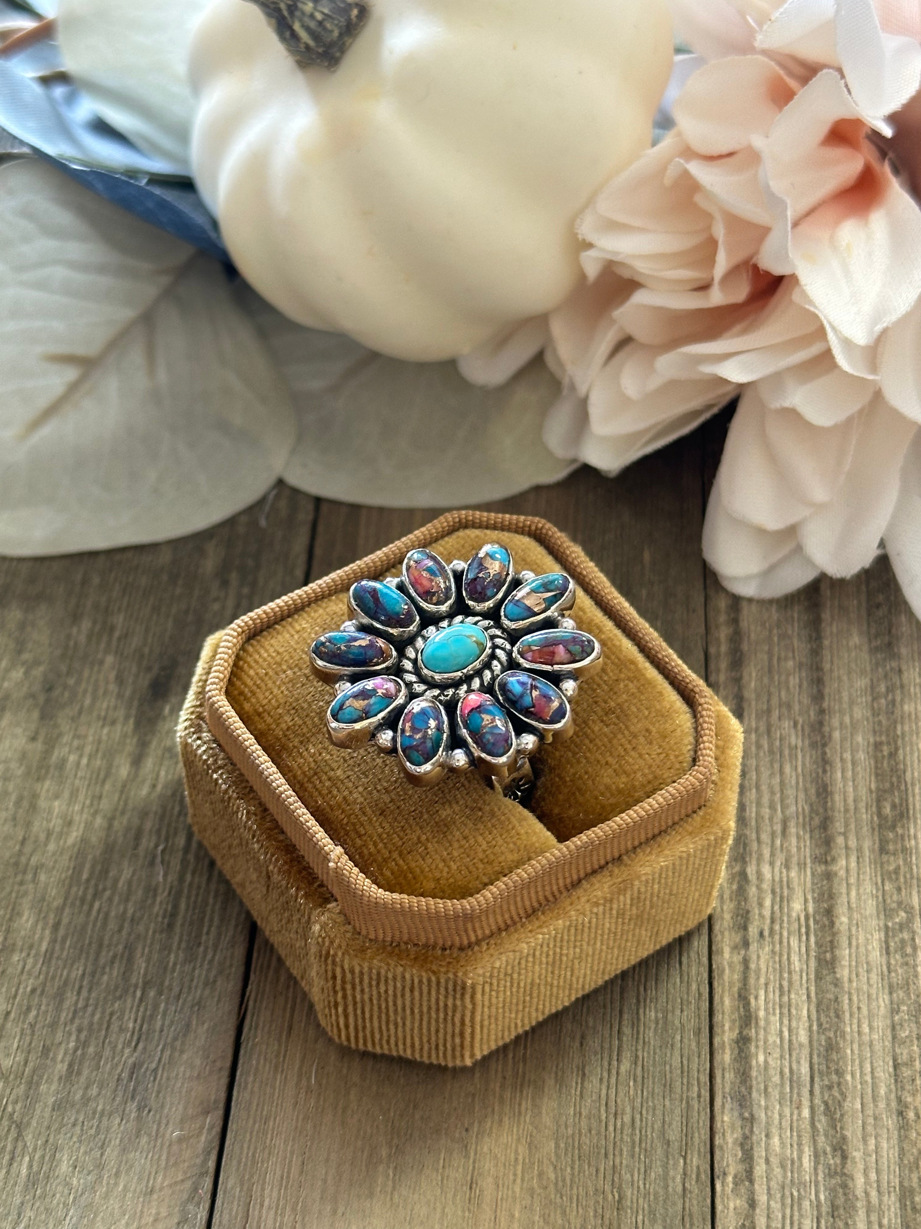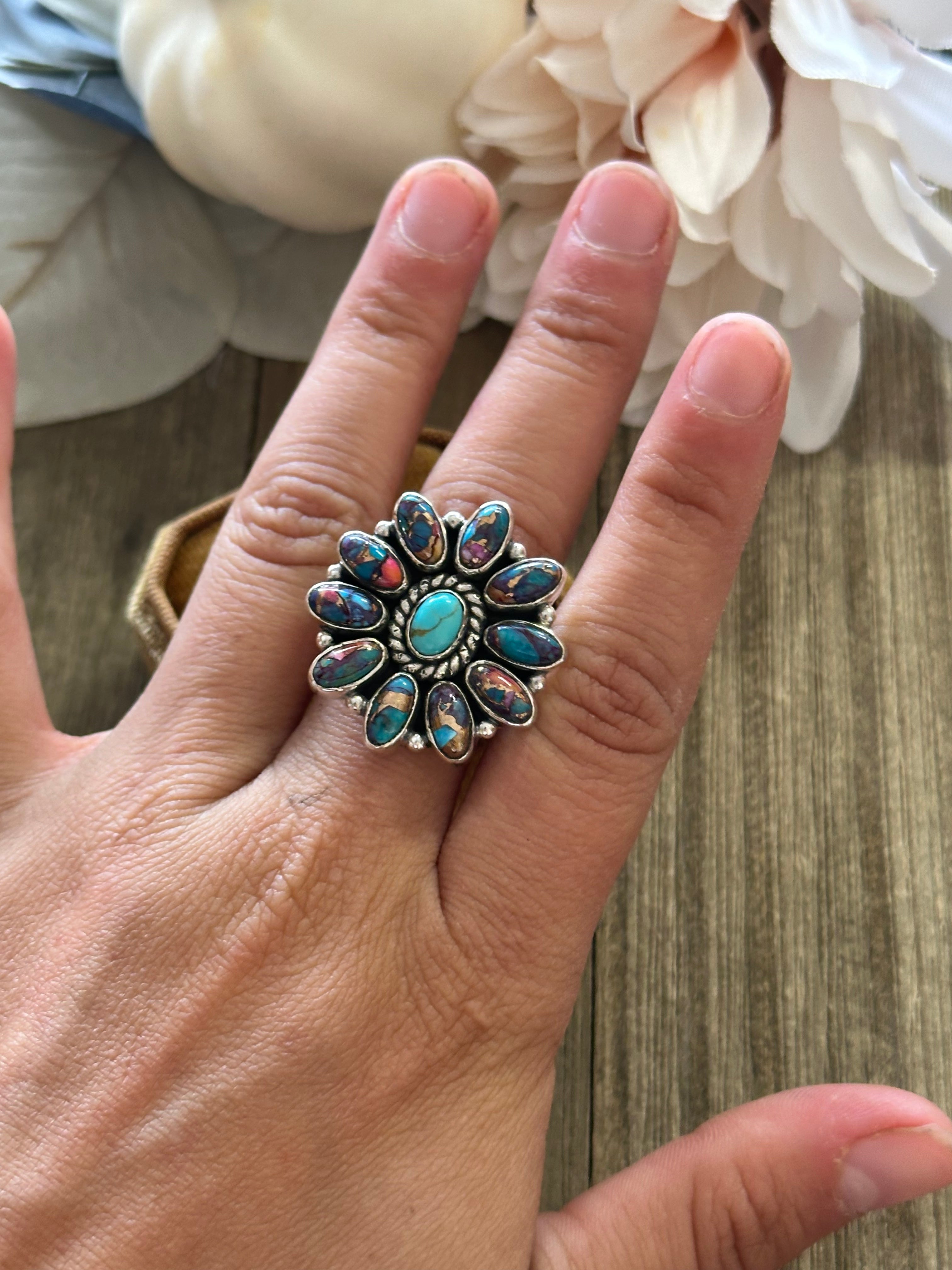 Beautiful cluster ring. Southwest Handmade Mohave Turquoise & Sterling Silver Adjustable Cluster Ring. It measures 1 1/8 inches round. Signed by the artist and stamped sterling silver.