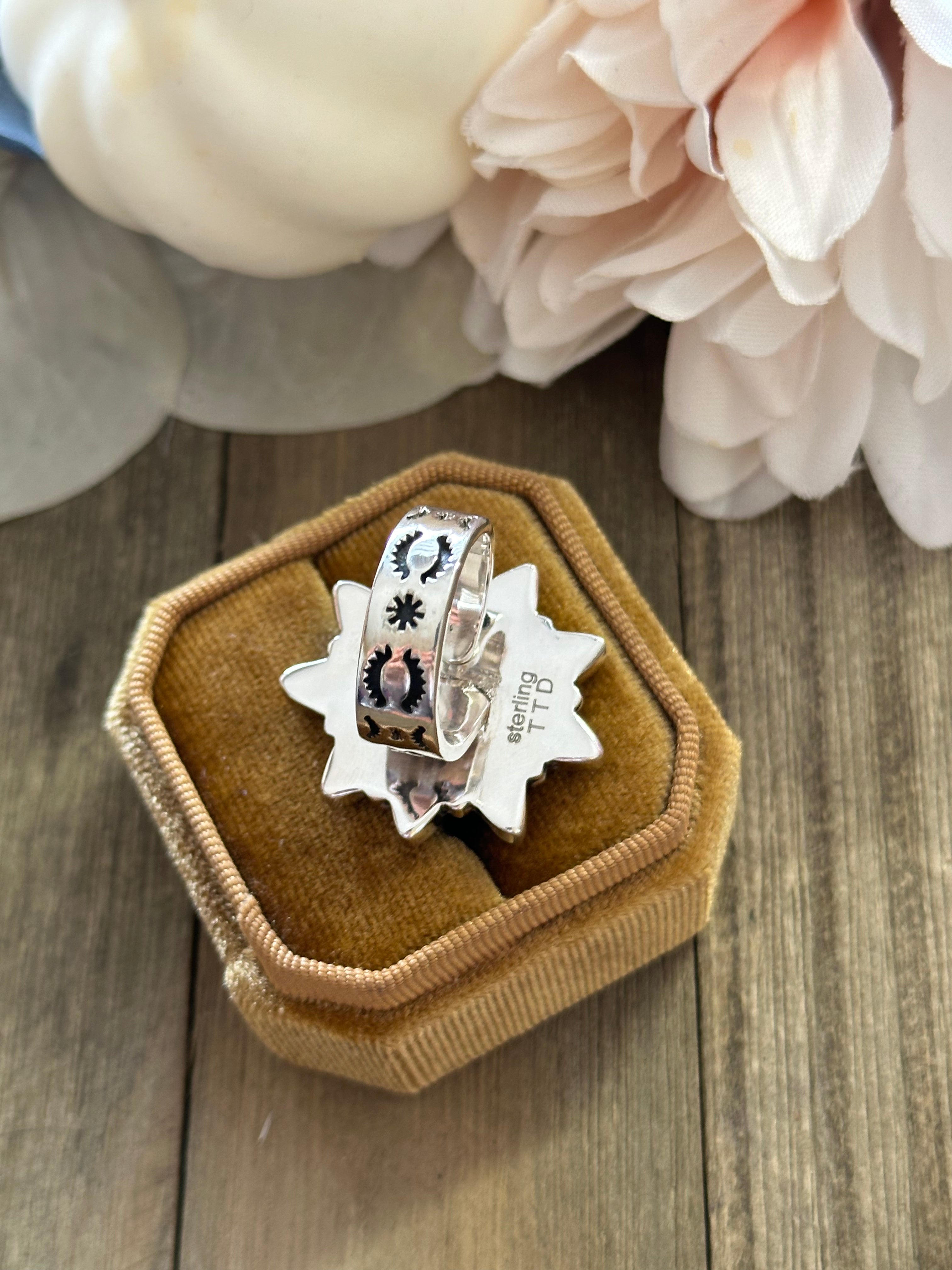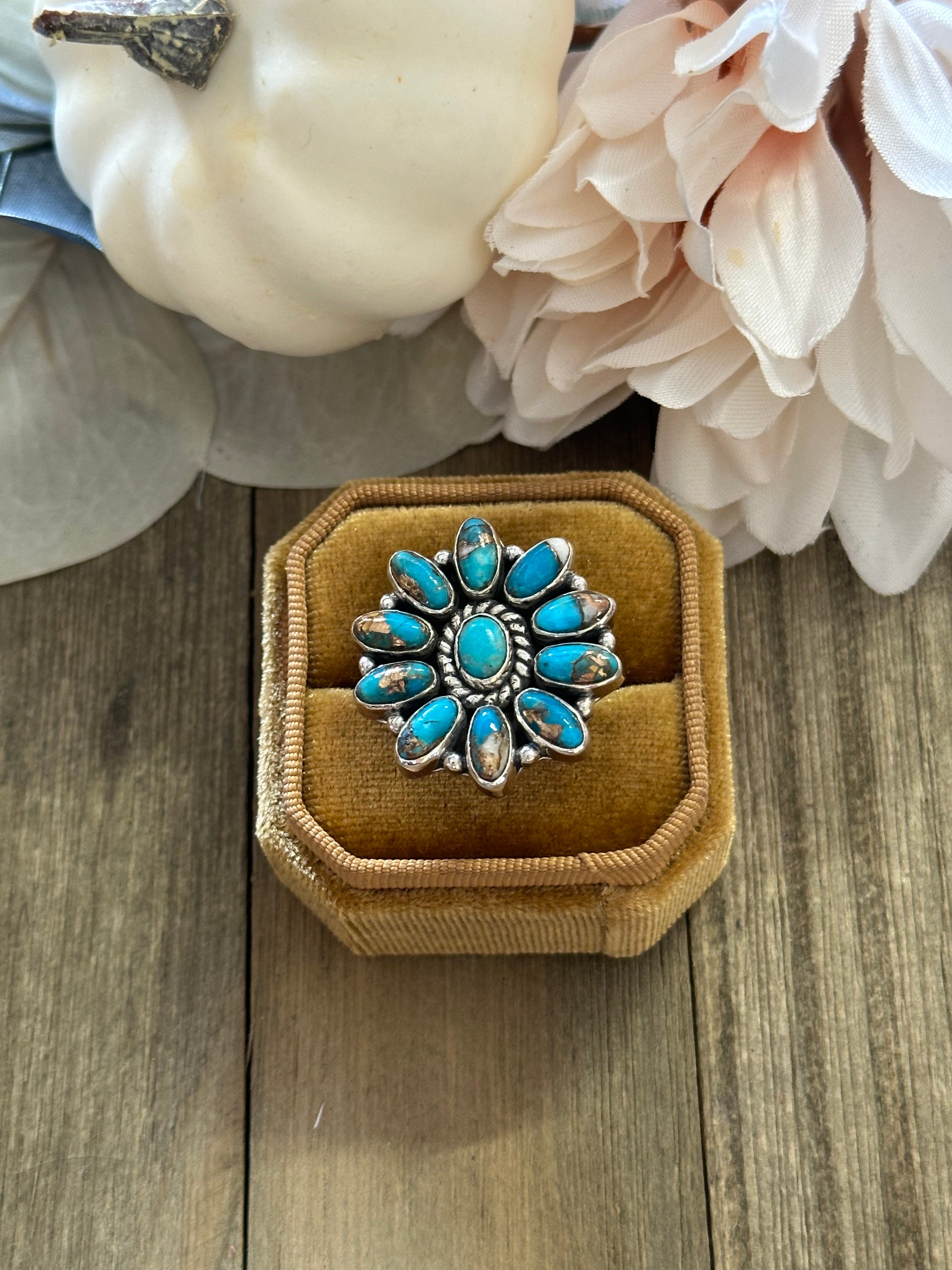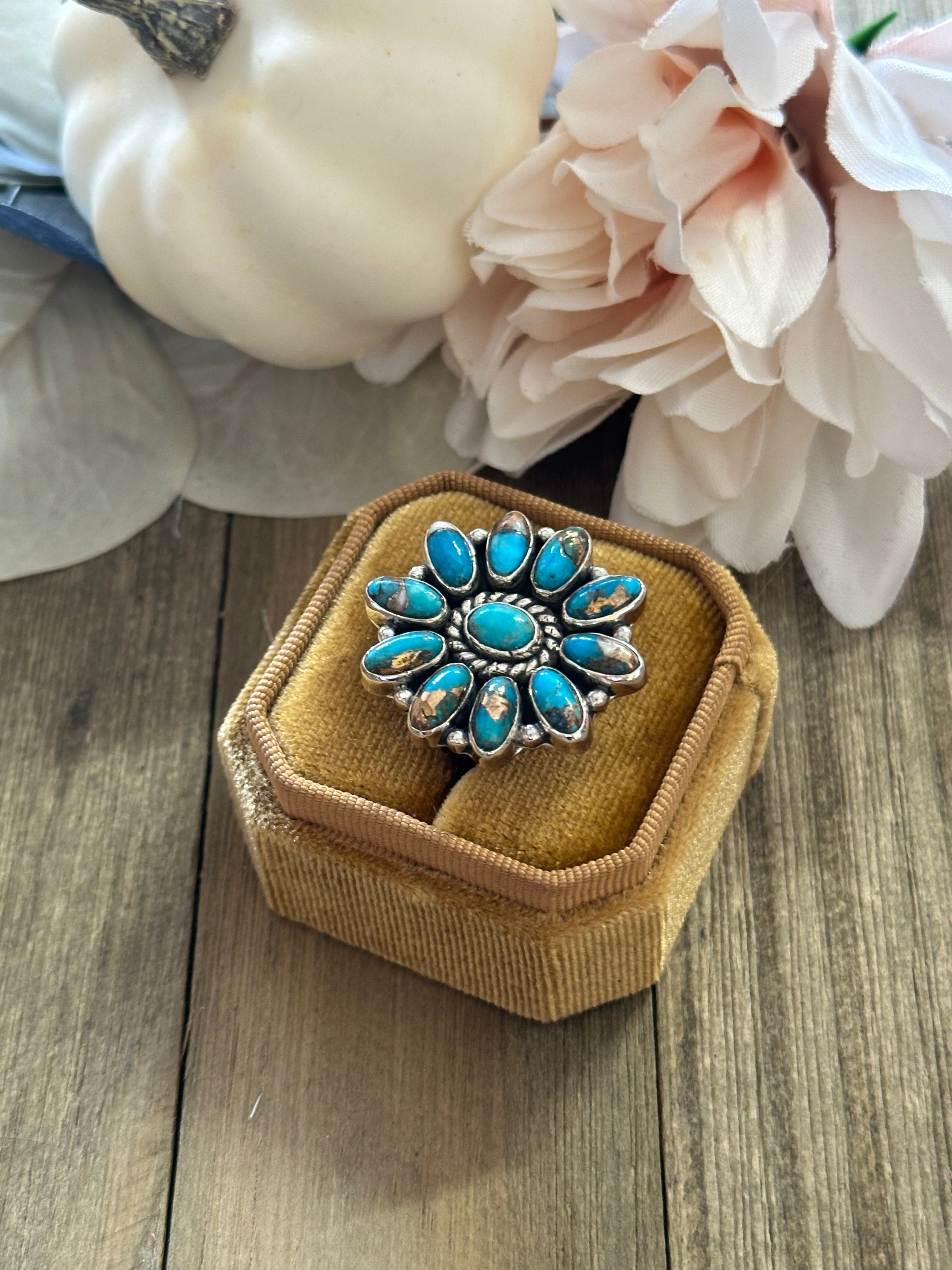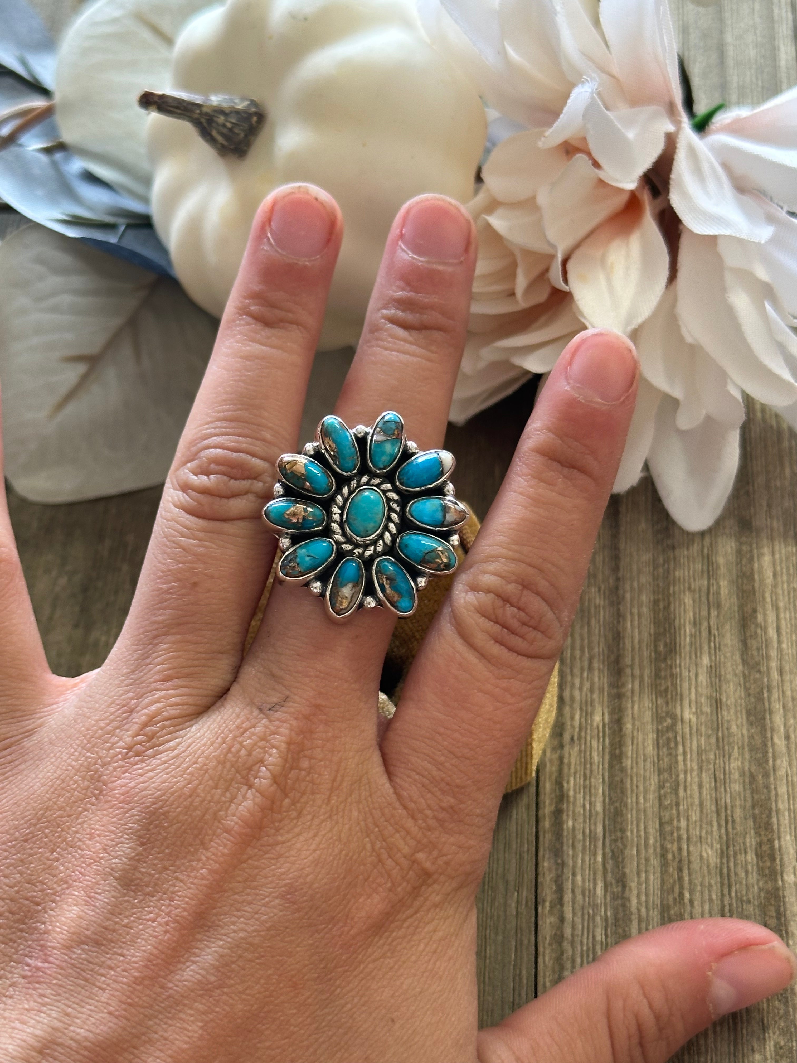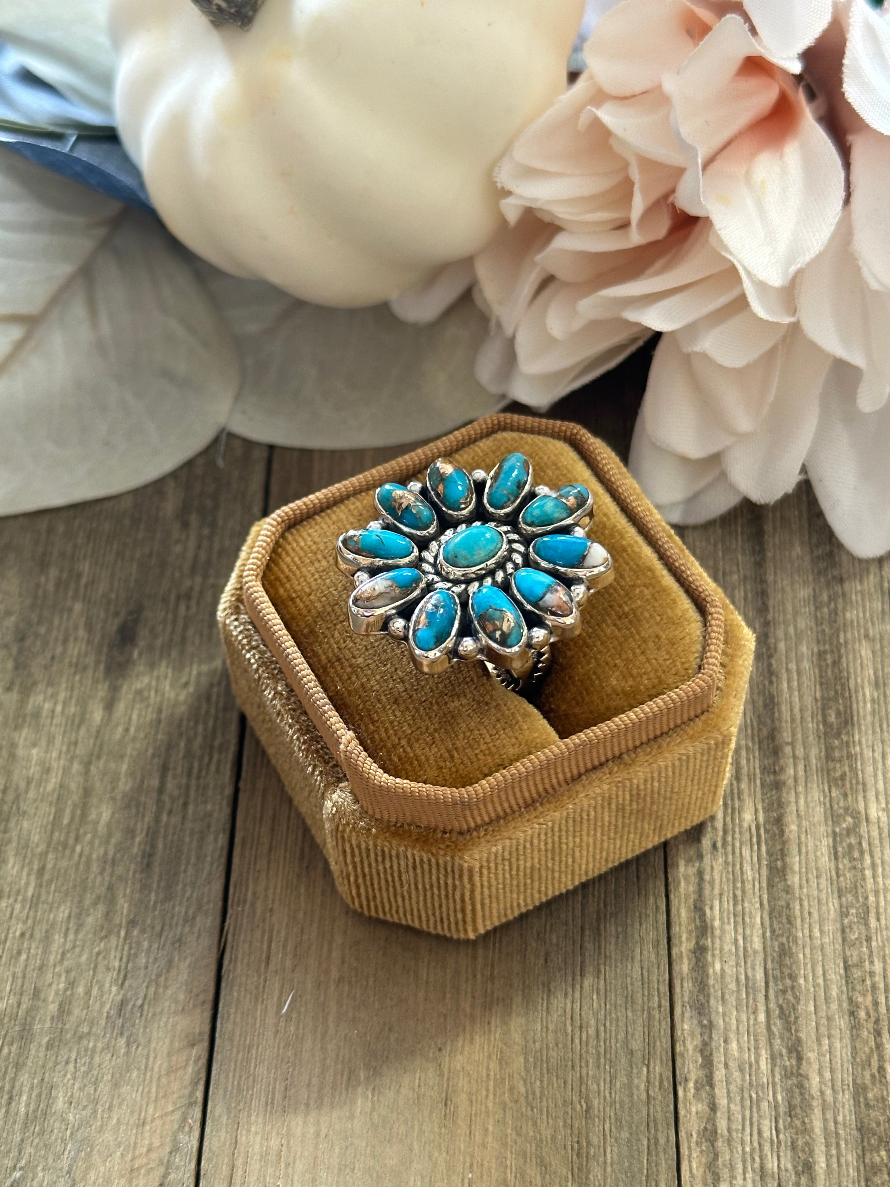 Beautiful cluster ring. Southwest Handmade Mohave Turquoise & Sterling Silver Adjustable Cluster Ring. It measures 1 1/8 inches round. Signed by the artist and stamped sterling silver.
