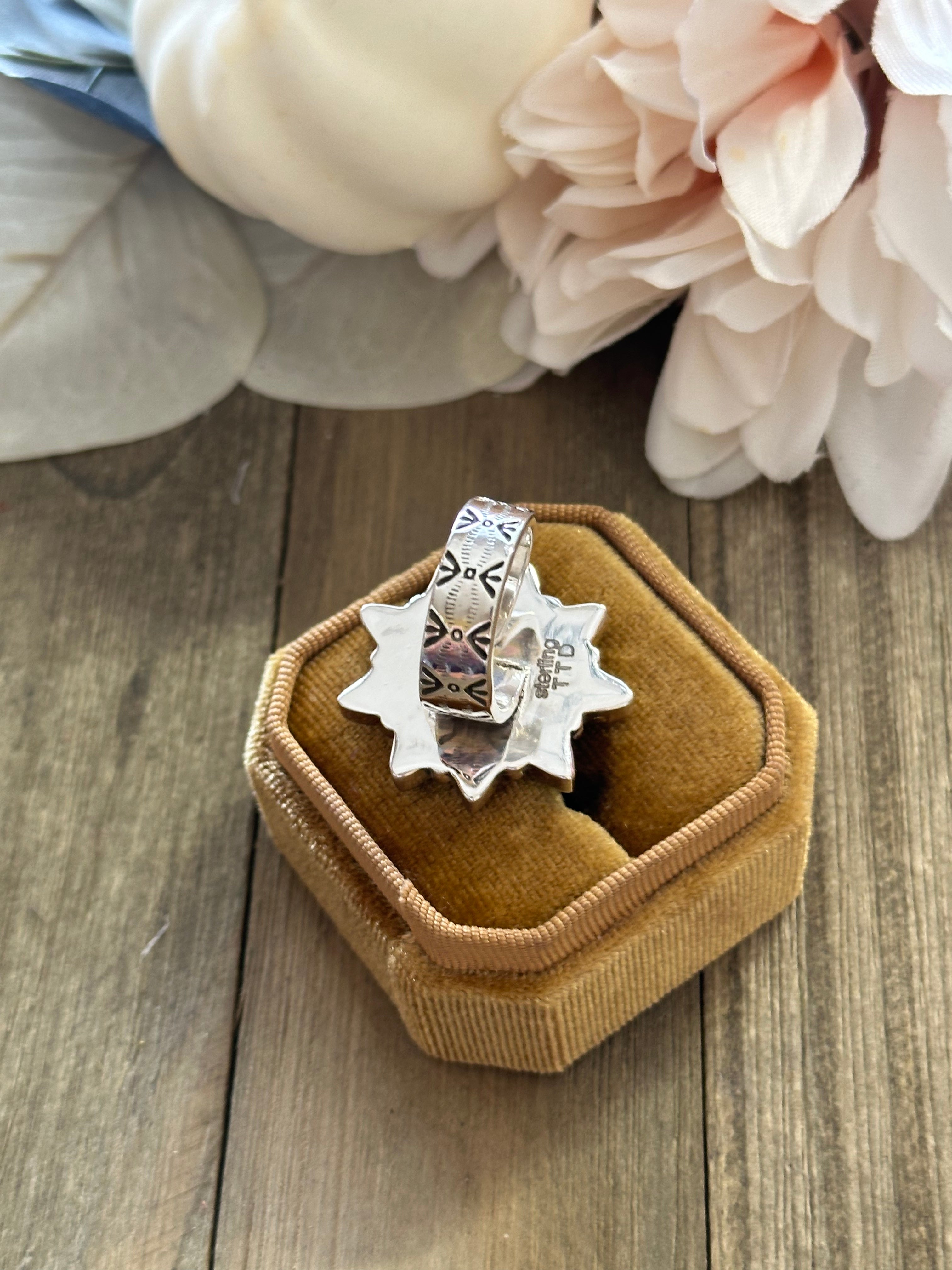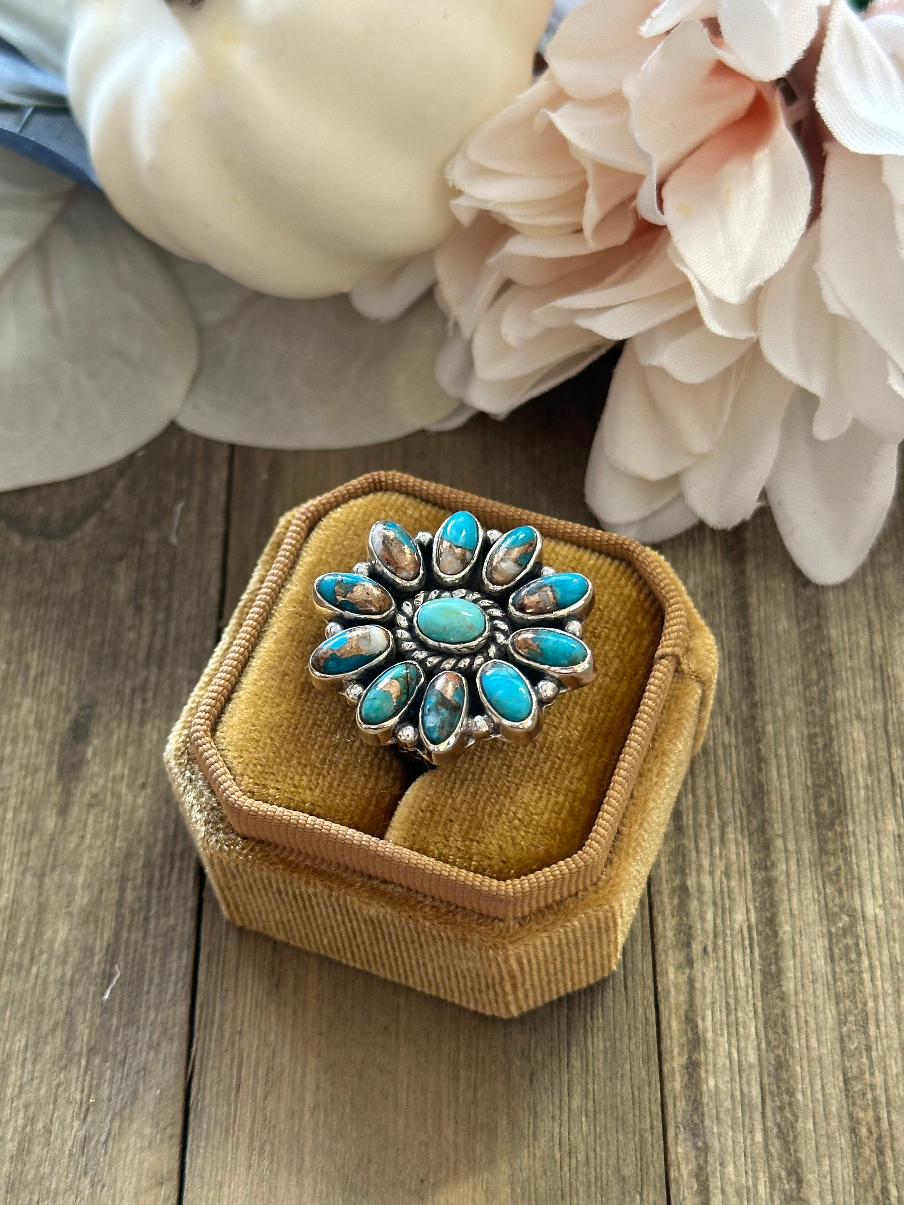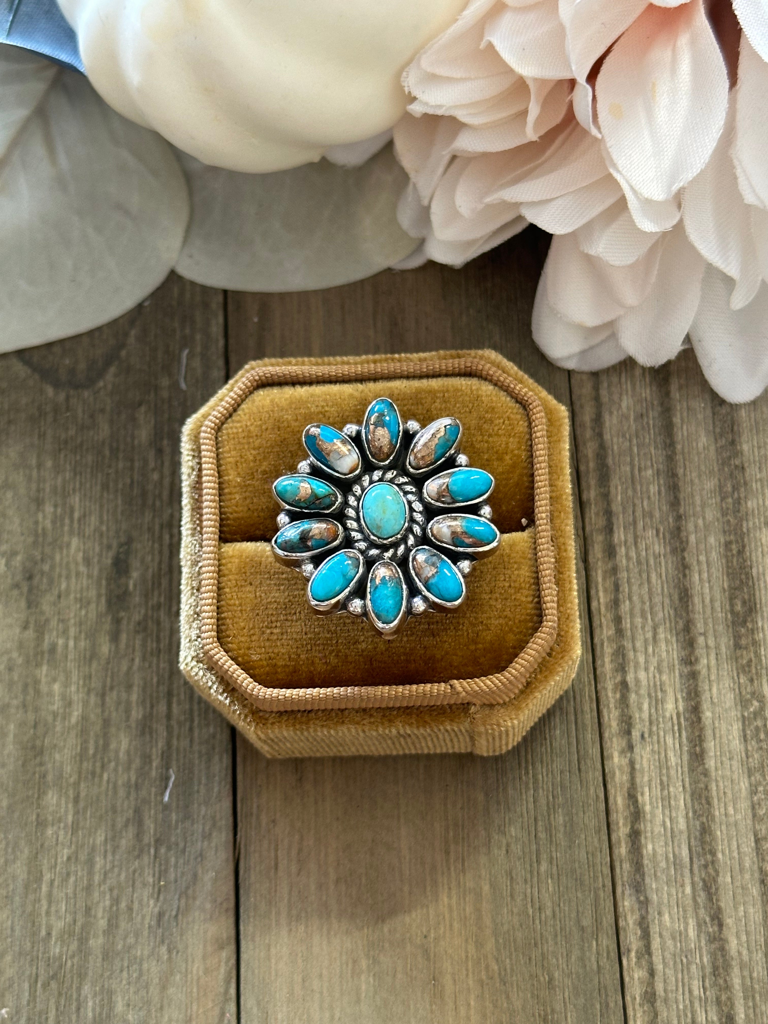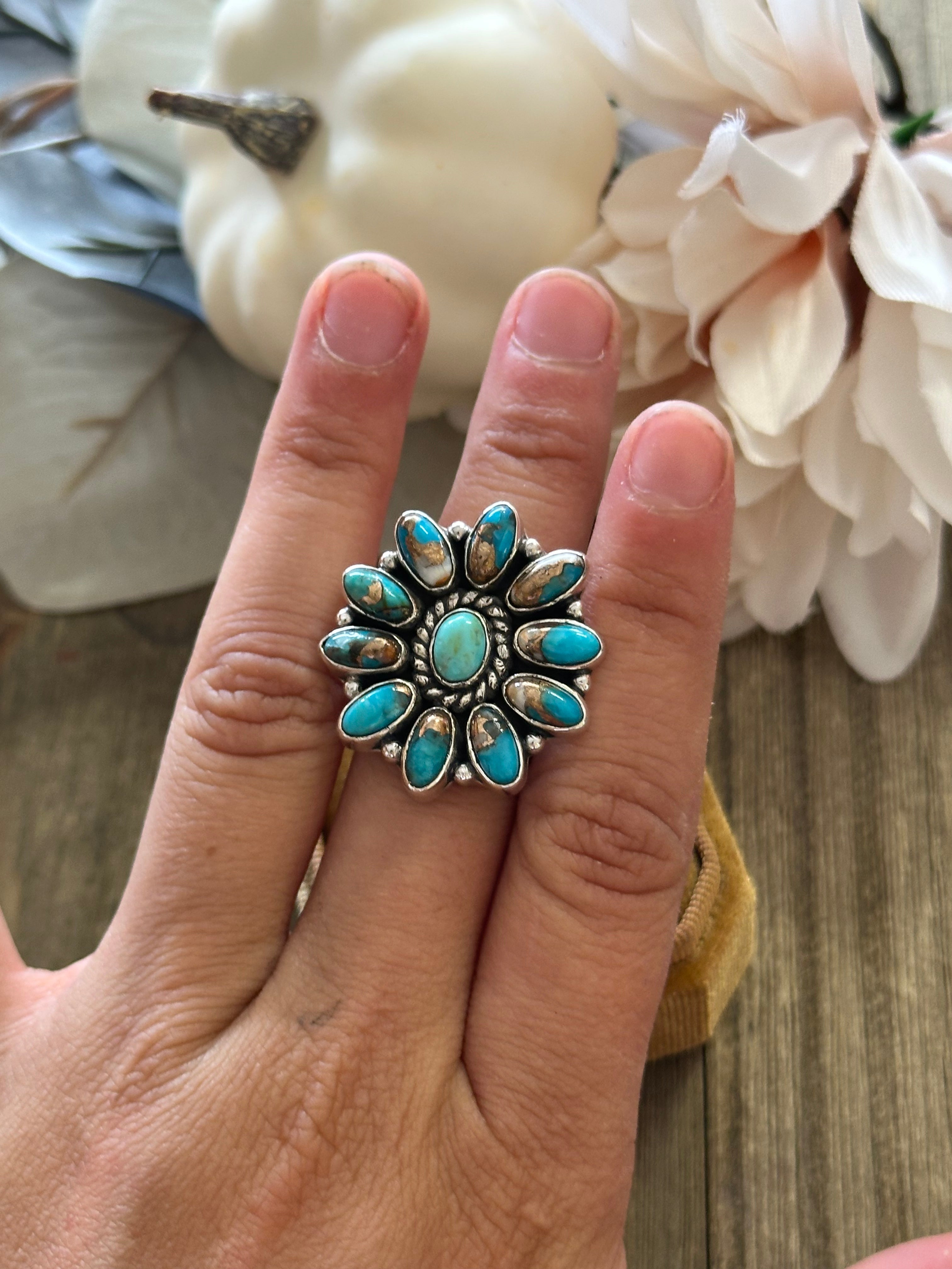 Beautiful cluster ring. Southwest Handmade Mohave Turquoise & Sterling Silver Adjustable Cluster Ring. It measures 1 1/8 inches round. Signed by the artist and stamped sterling silver.