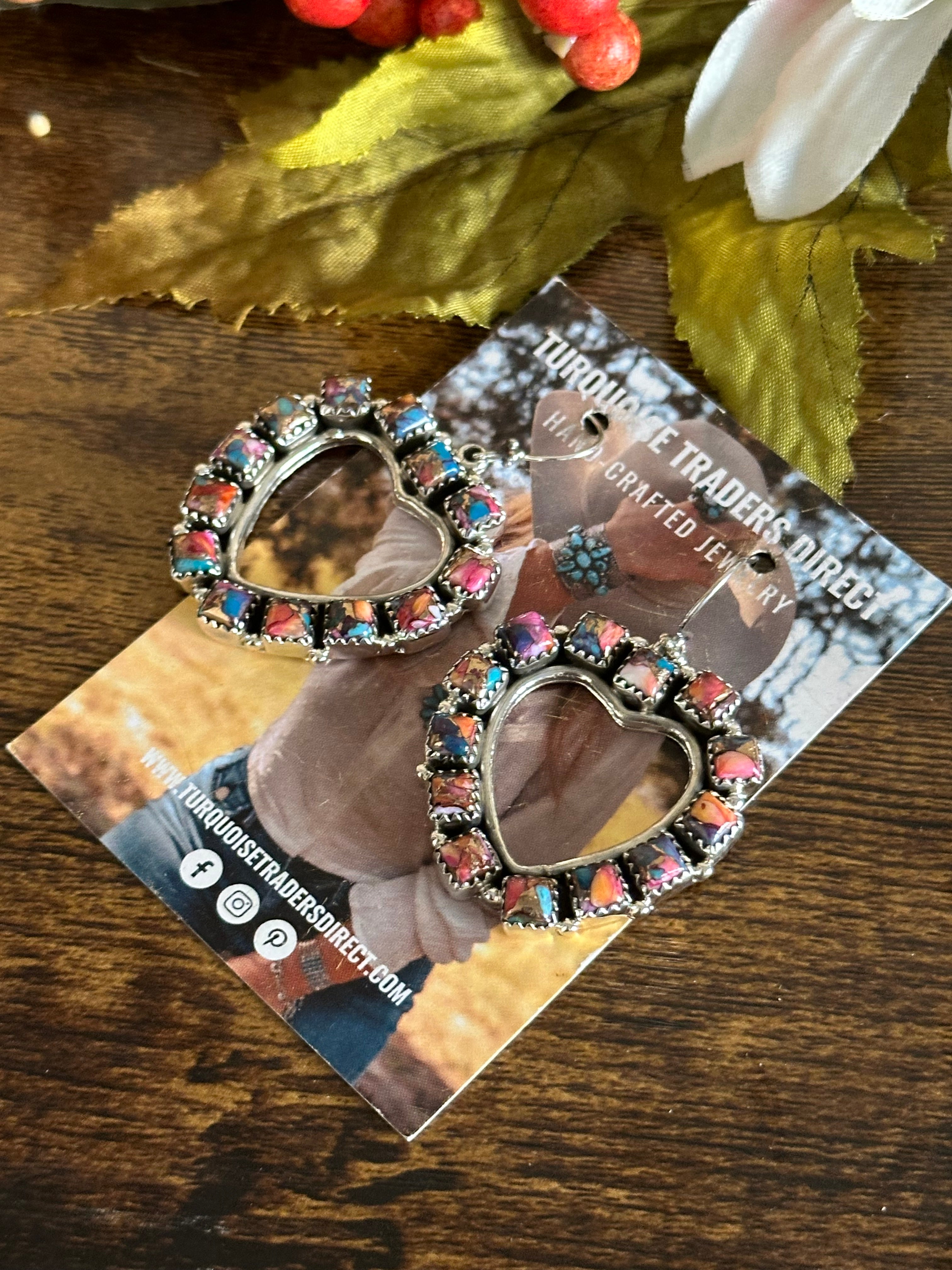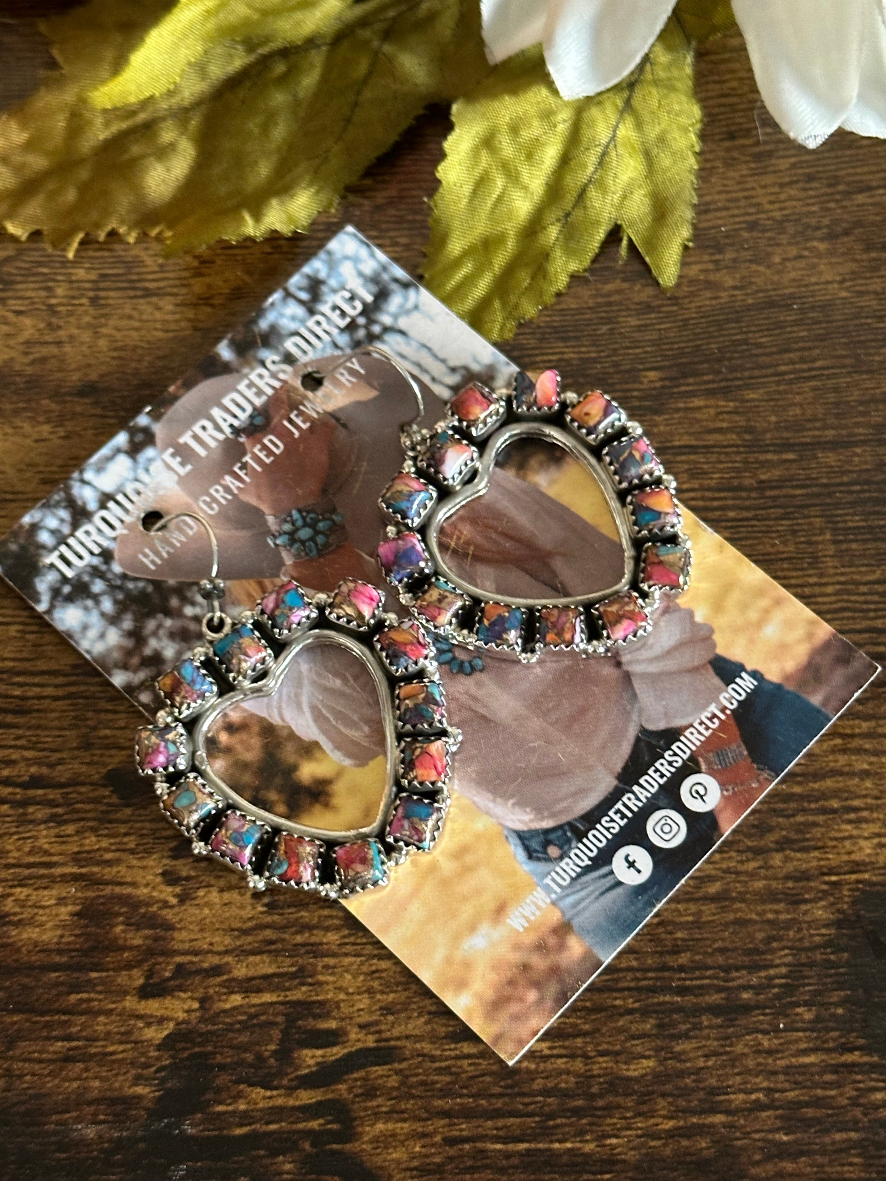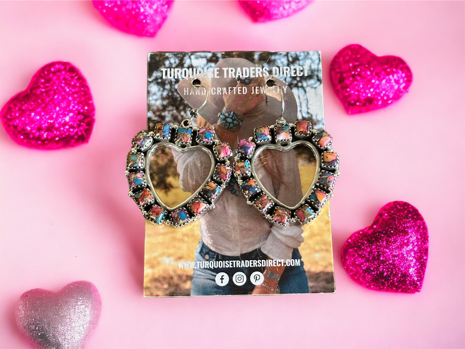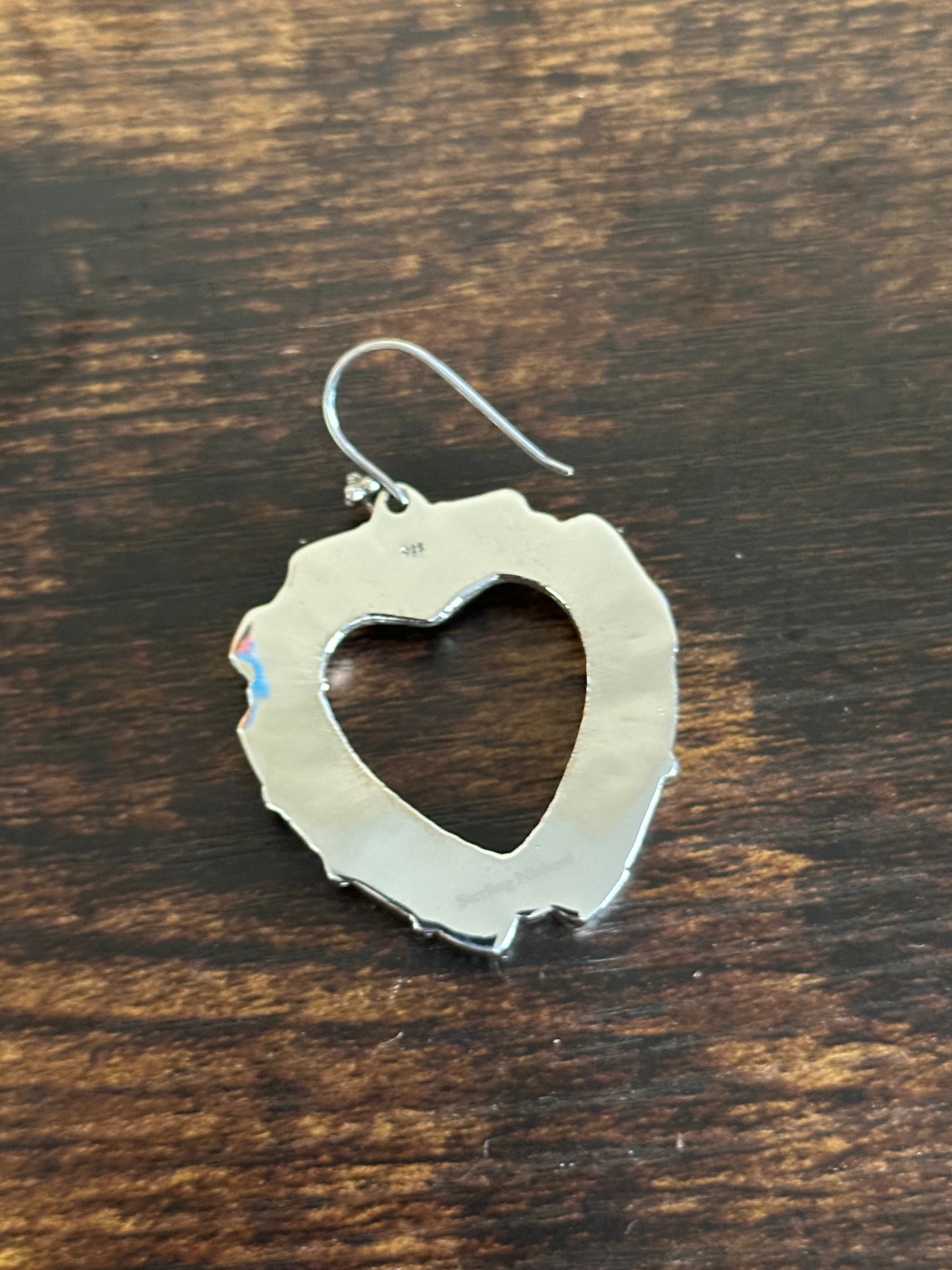 Breathtaking earrings. Southwest Handmade Mohave Turquoise & Sterling Silver Dangle Cluster Heart Earrings. It measures 2 1/8 inches long and 1 1/2 inches wide. Signed by the artist and stamped sterling silver.