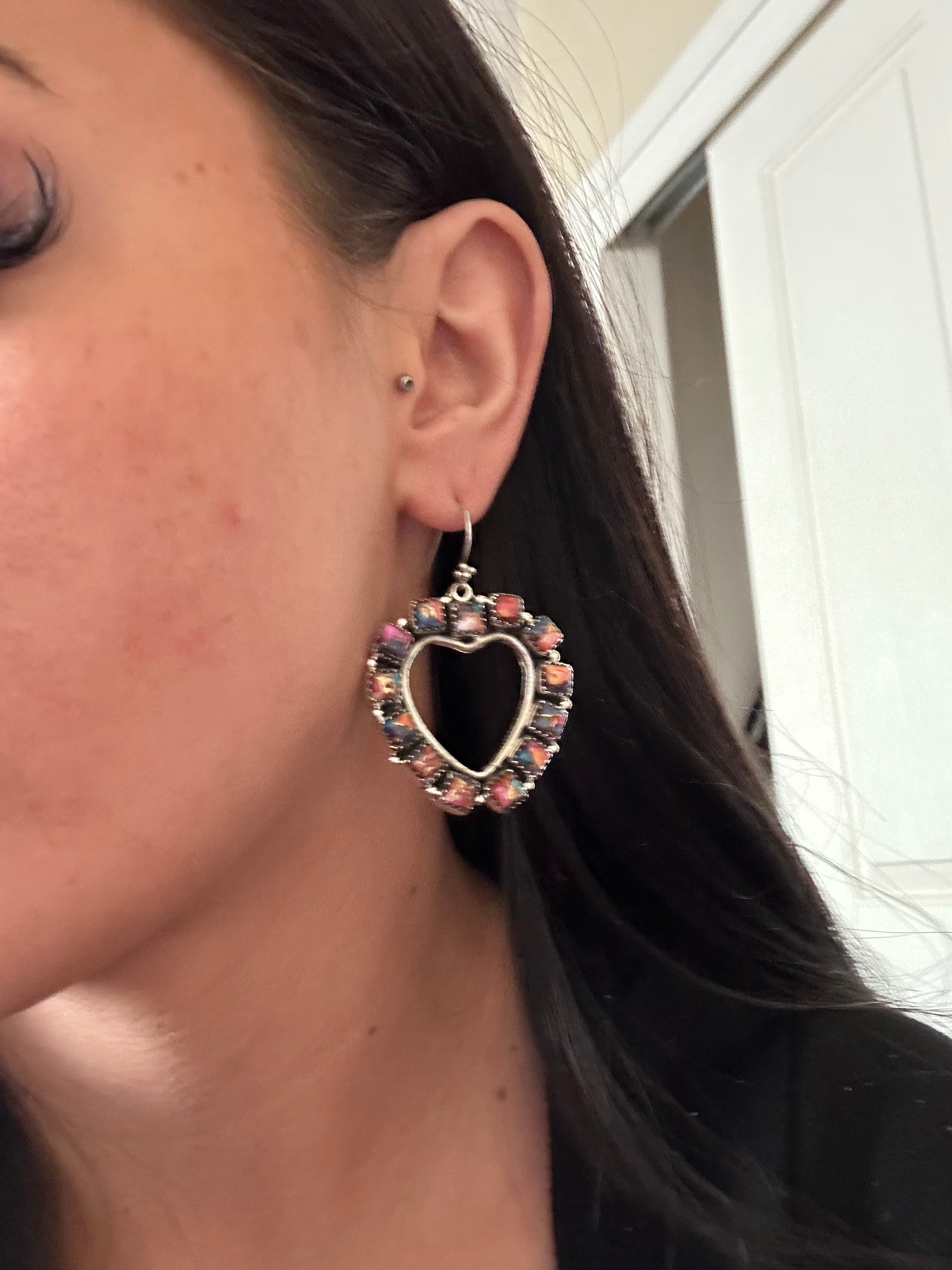 Southwest Handmade Mohave Turquoise & Sterling Silver Dangle Cluster Heart Earrings