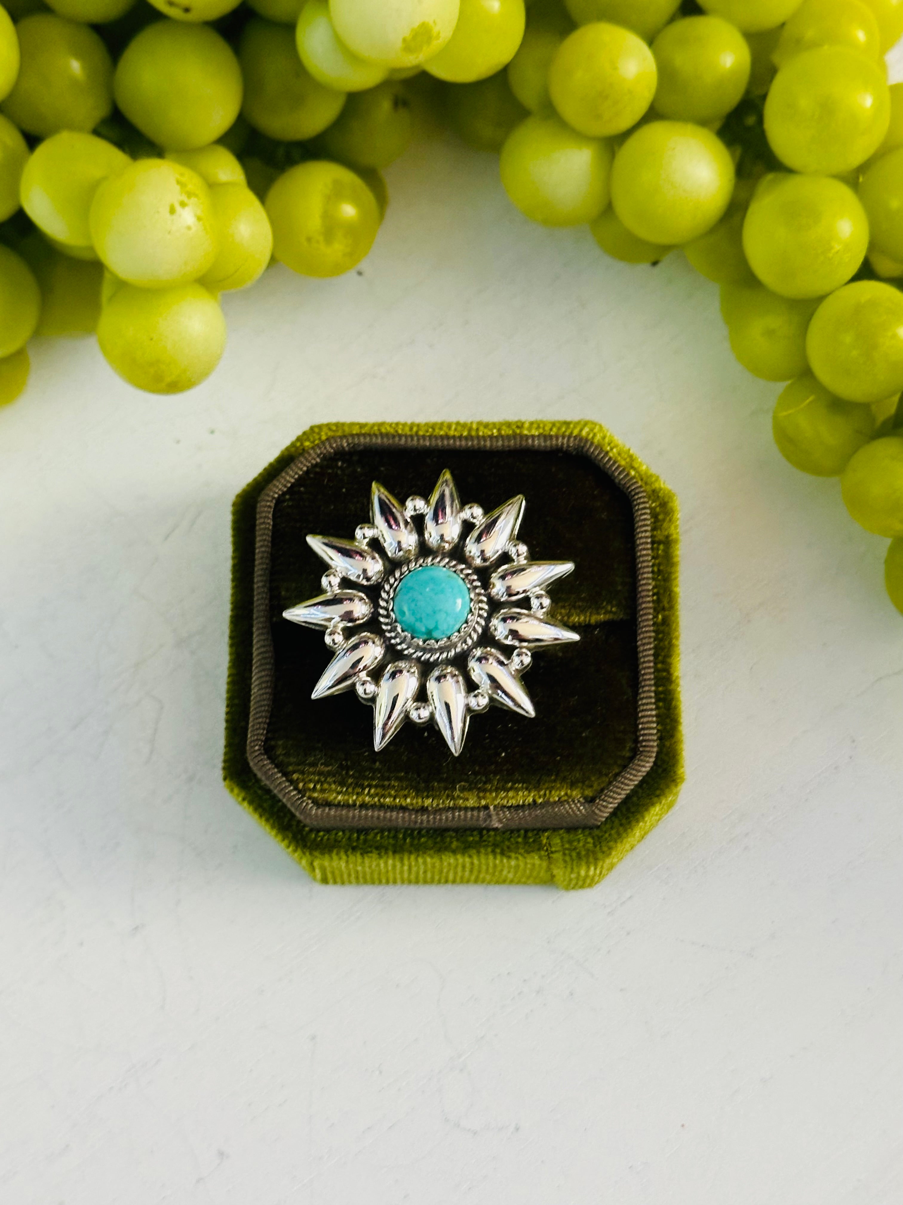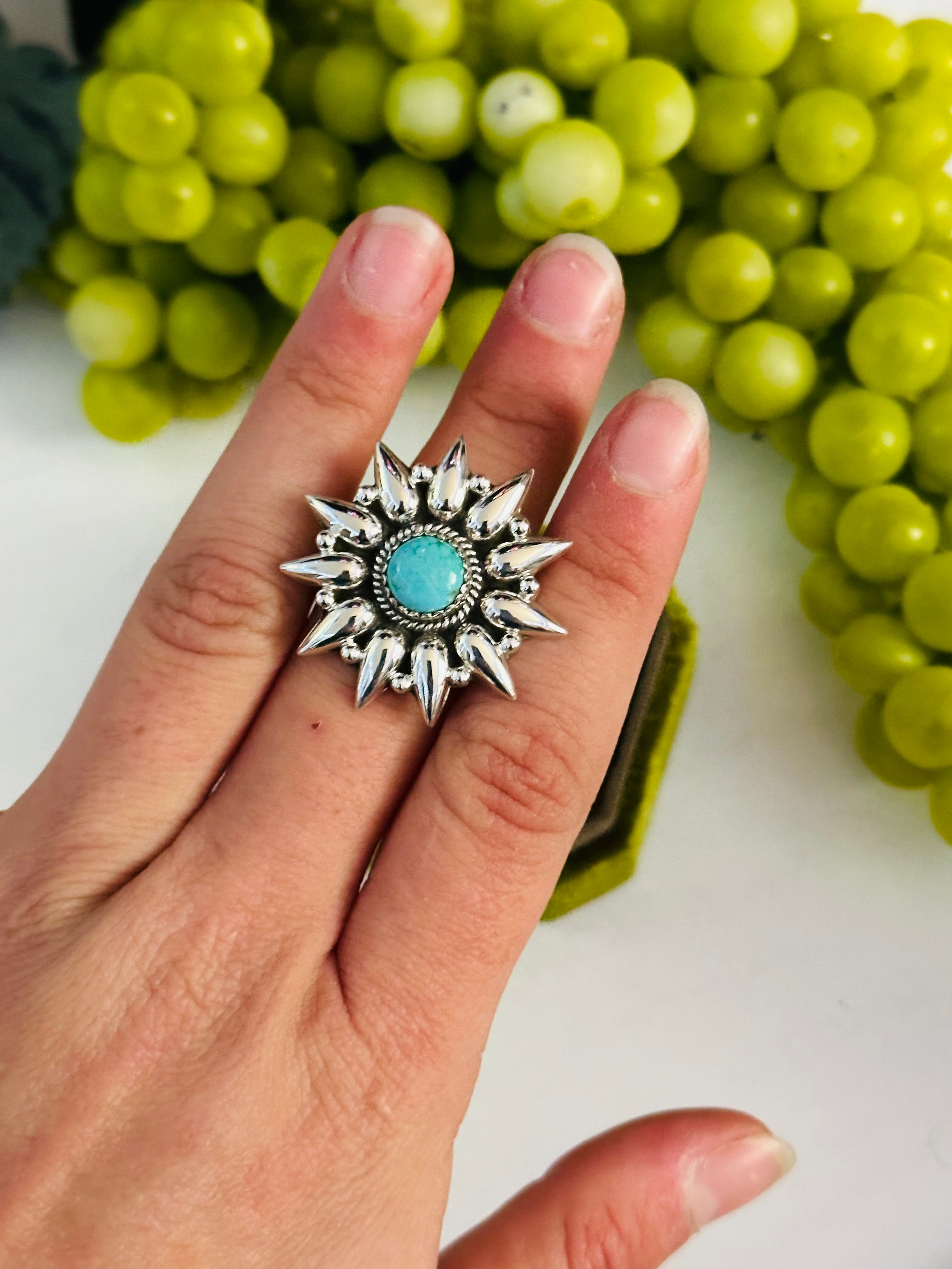 Beautiful ring. Southwest Handmade Kingman Turquoise & Sterling Silver Adjustable Ring. It measures 1 1/4 inches round. Signed by the artist and stamped sterling silver. Stones will differ due to natural stones.