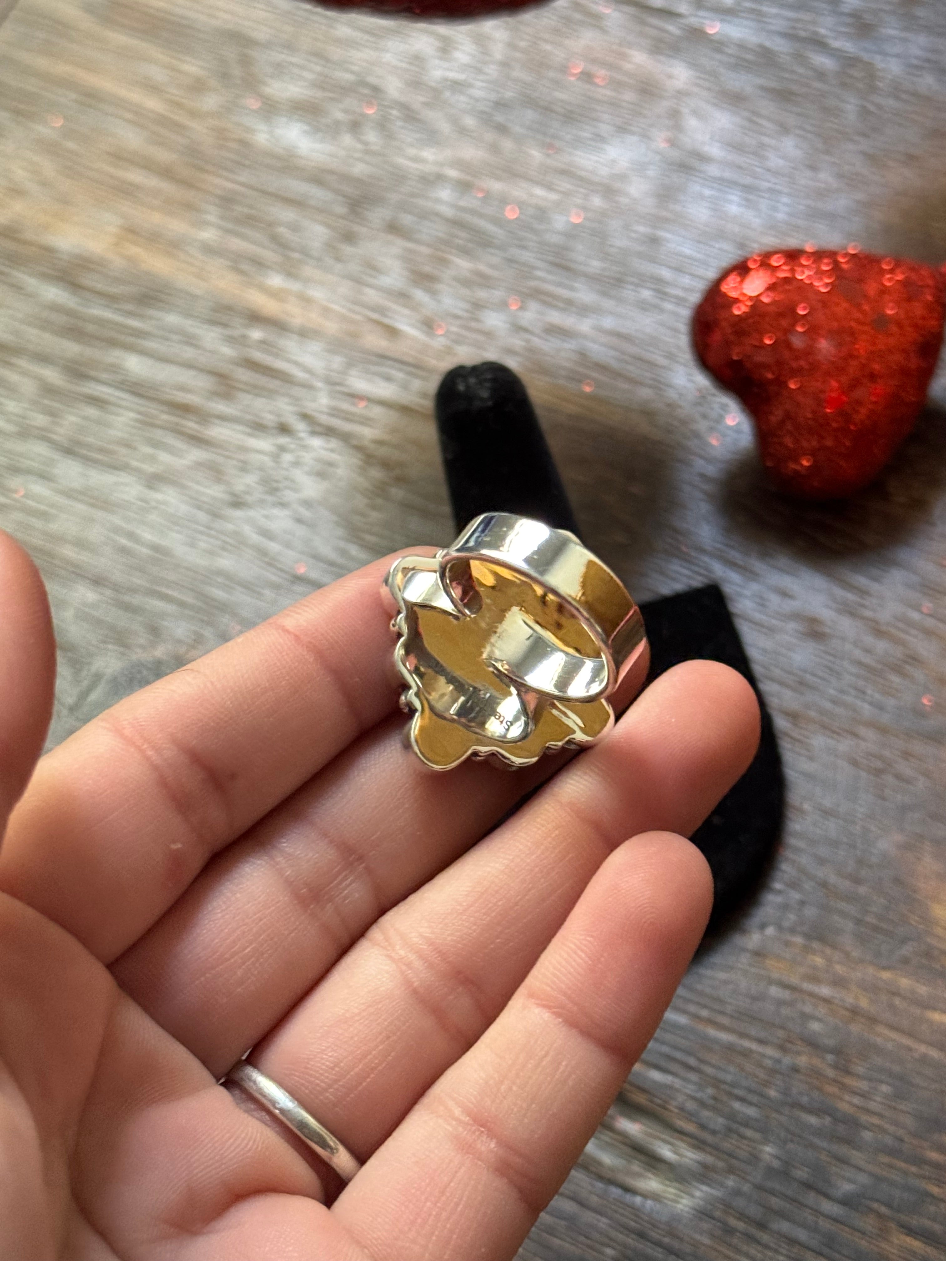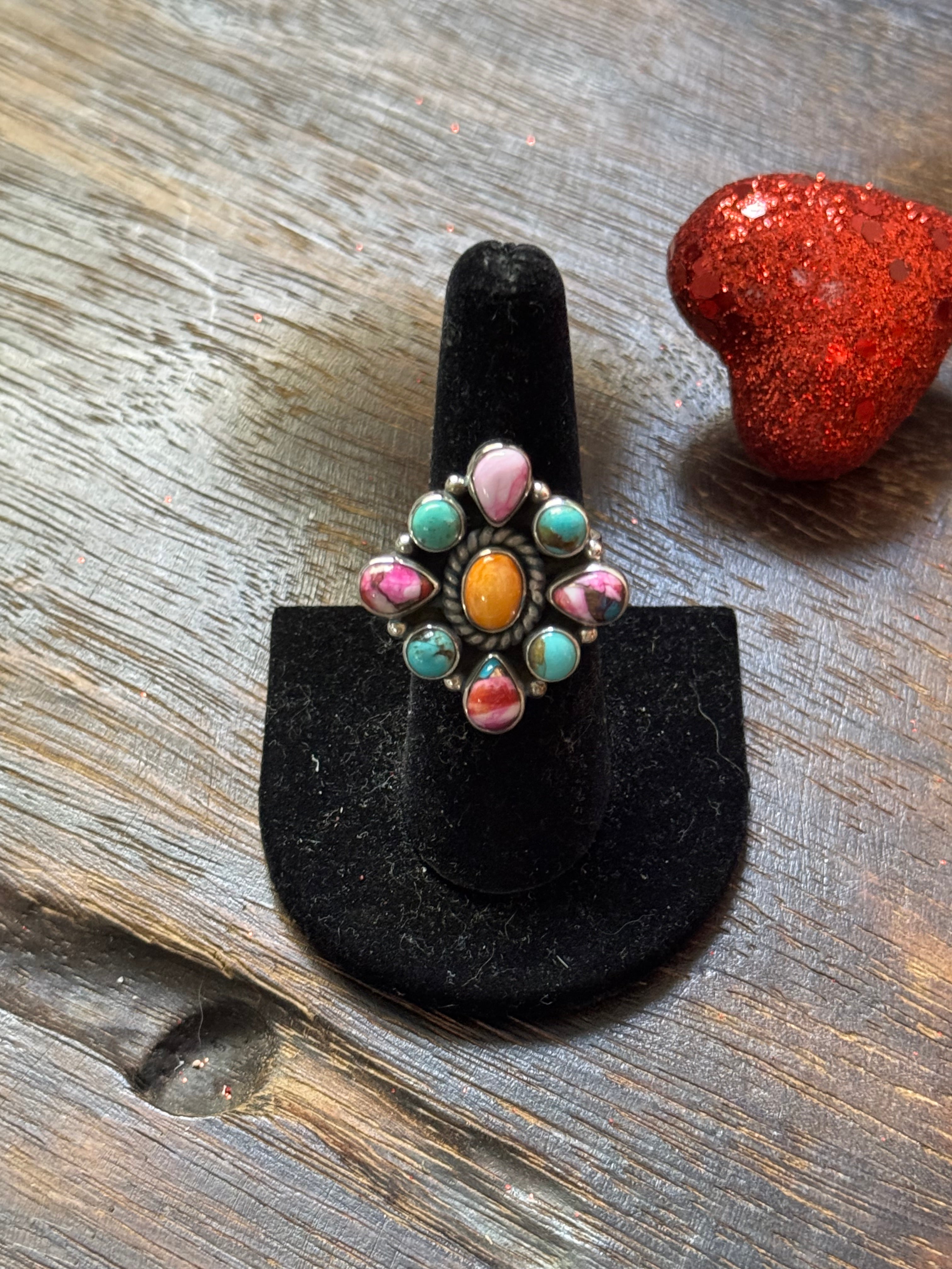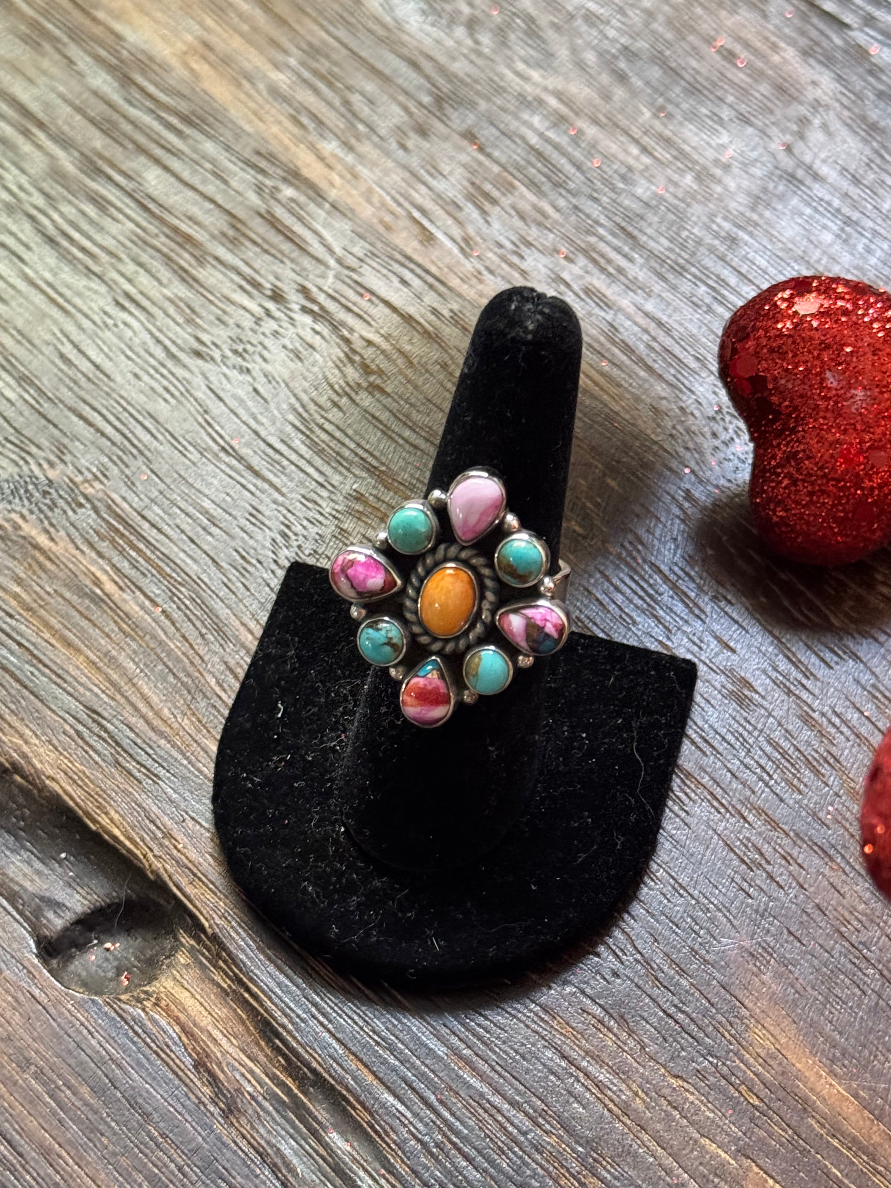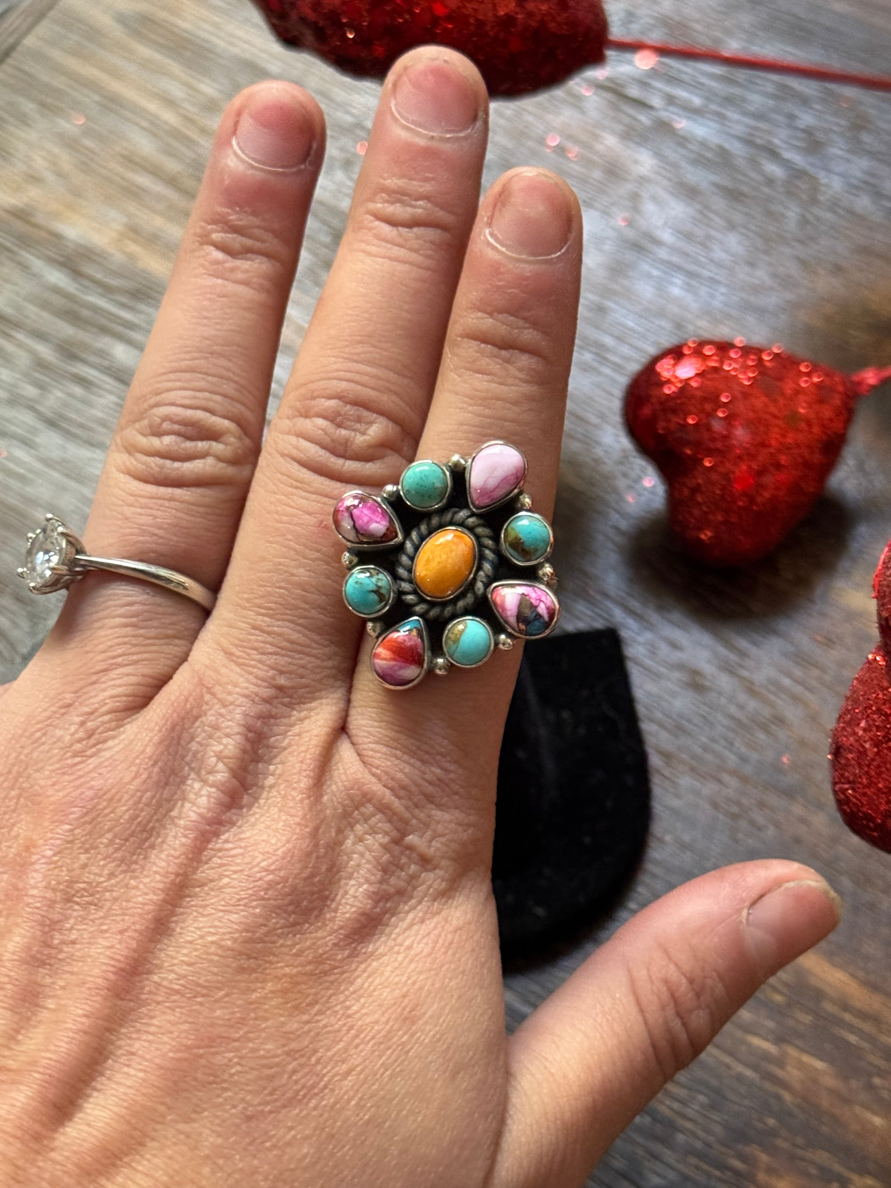 Beautiful ring. Southwest Handmade Multi Stone & Sterling Silver Adjustable Cluster Ring. It measures 1 1/8 inches long and 1 1/8 inches wide. Signed by the artist and stamped sterling silver.