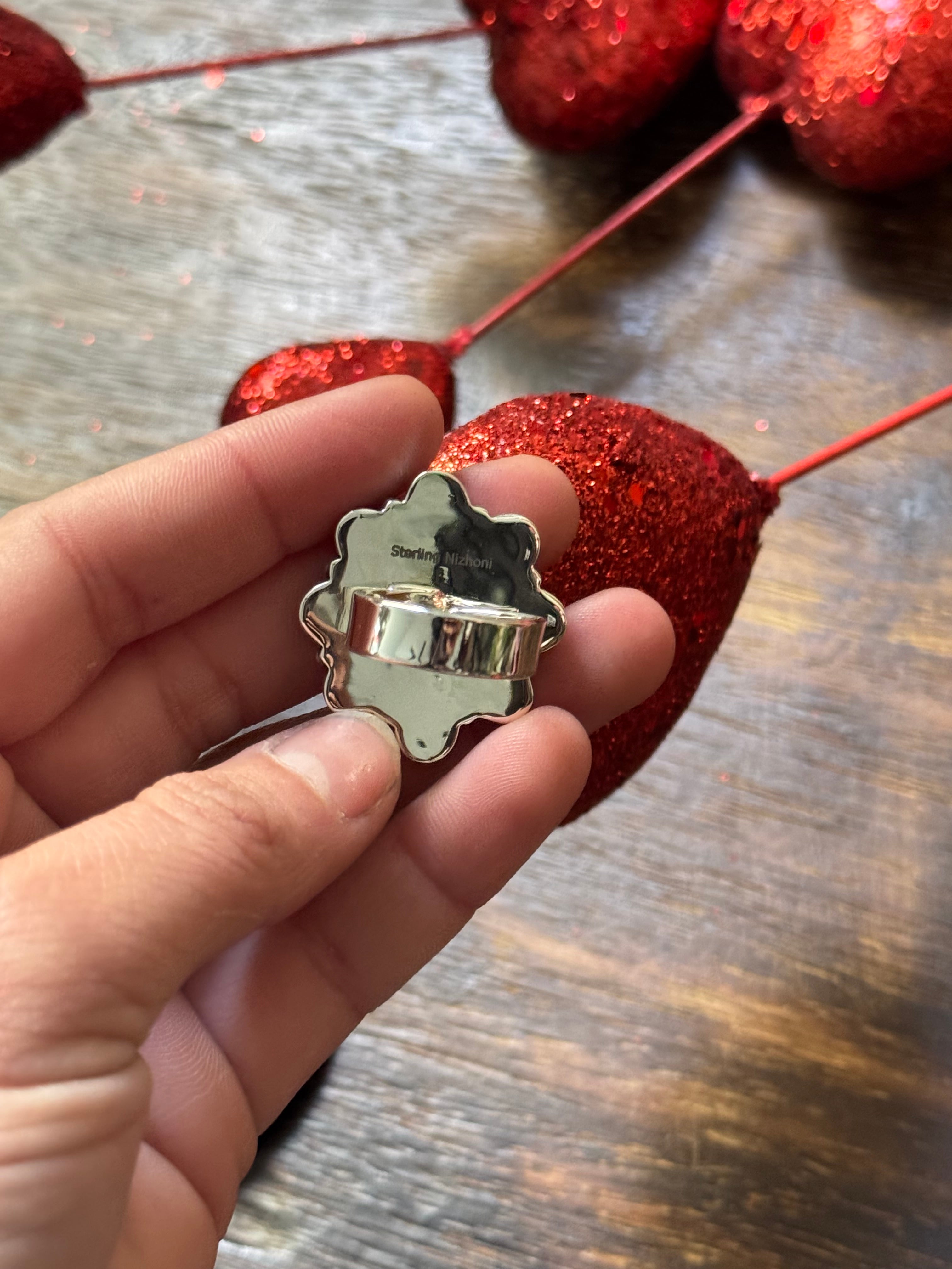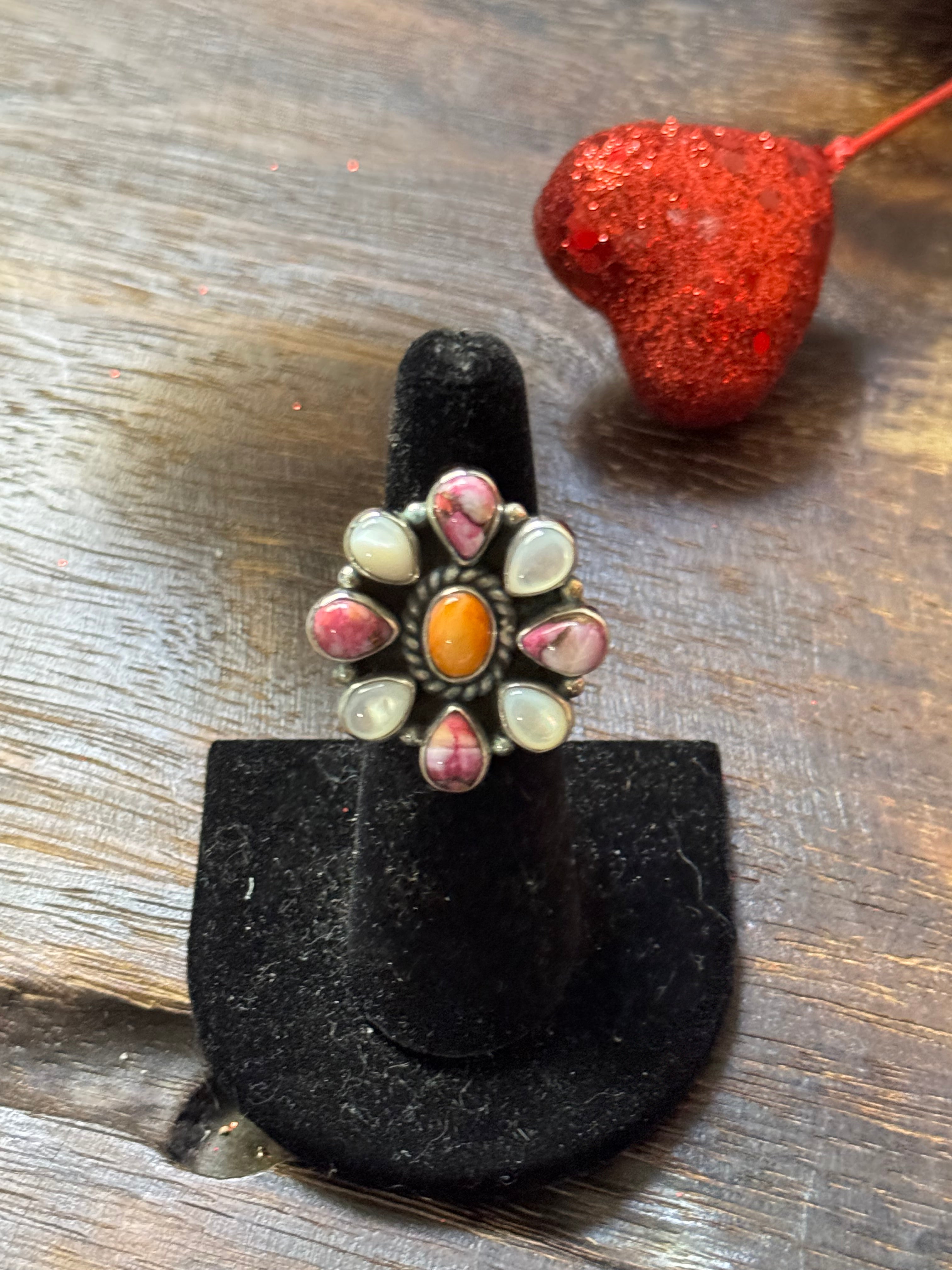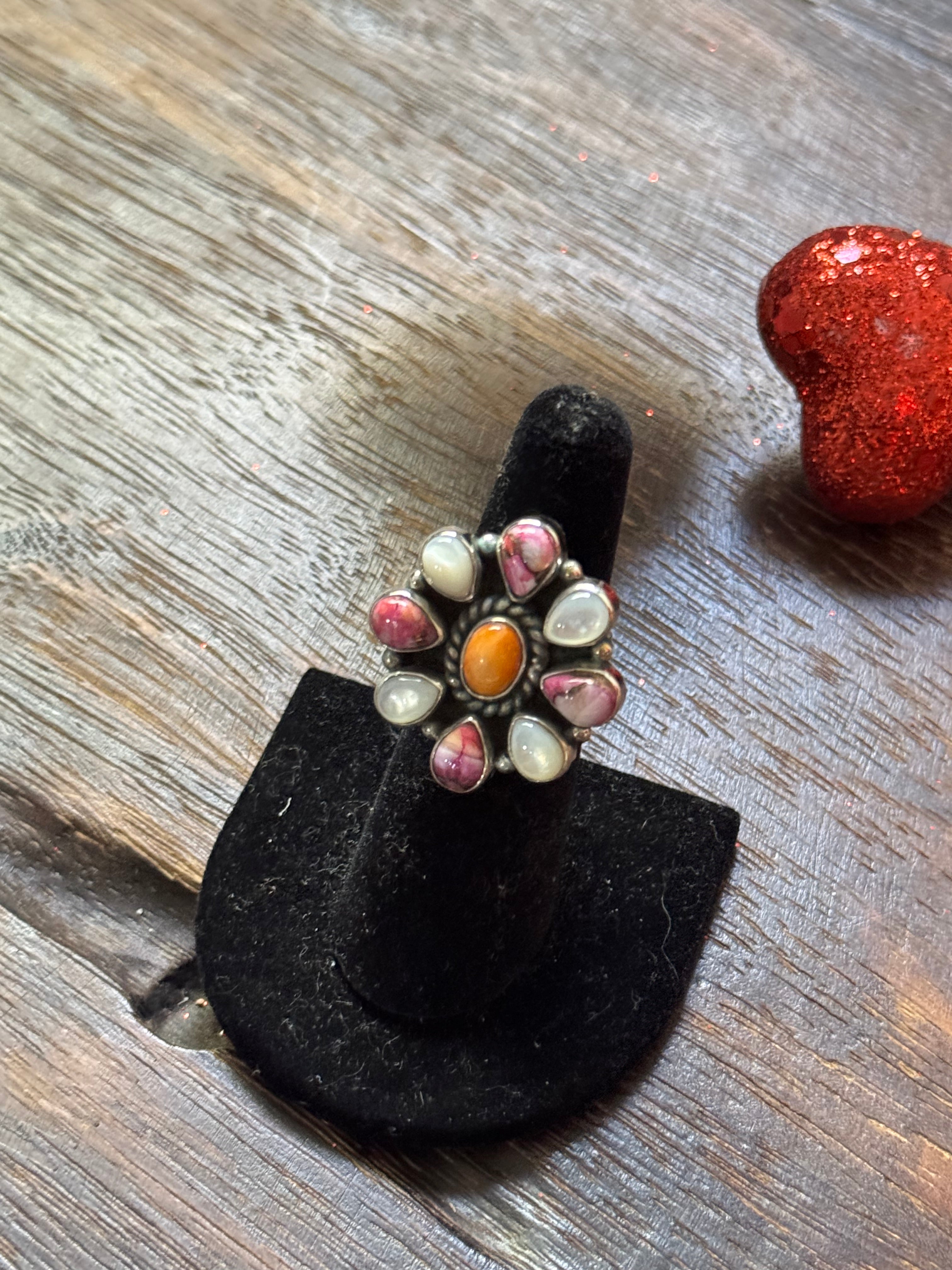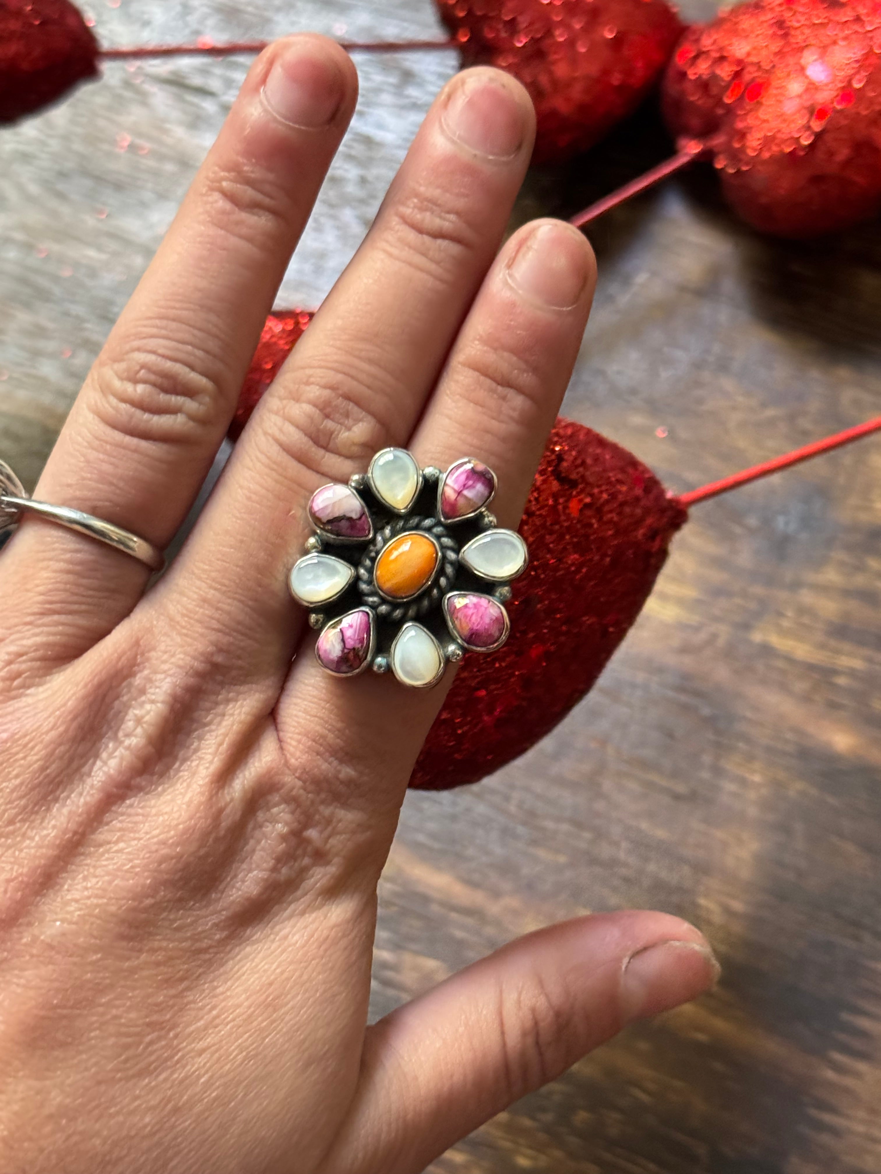 Beautiful ring. Southwest Handmade Multi Stone & Sterling Silver Adjustable Cluster Ring. It measures 1 1/8 inches long and 1 1/8 inches wide. Signed by the artist and stamped sterling silver.