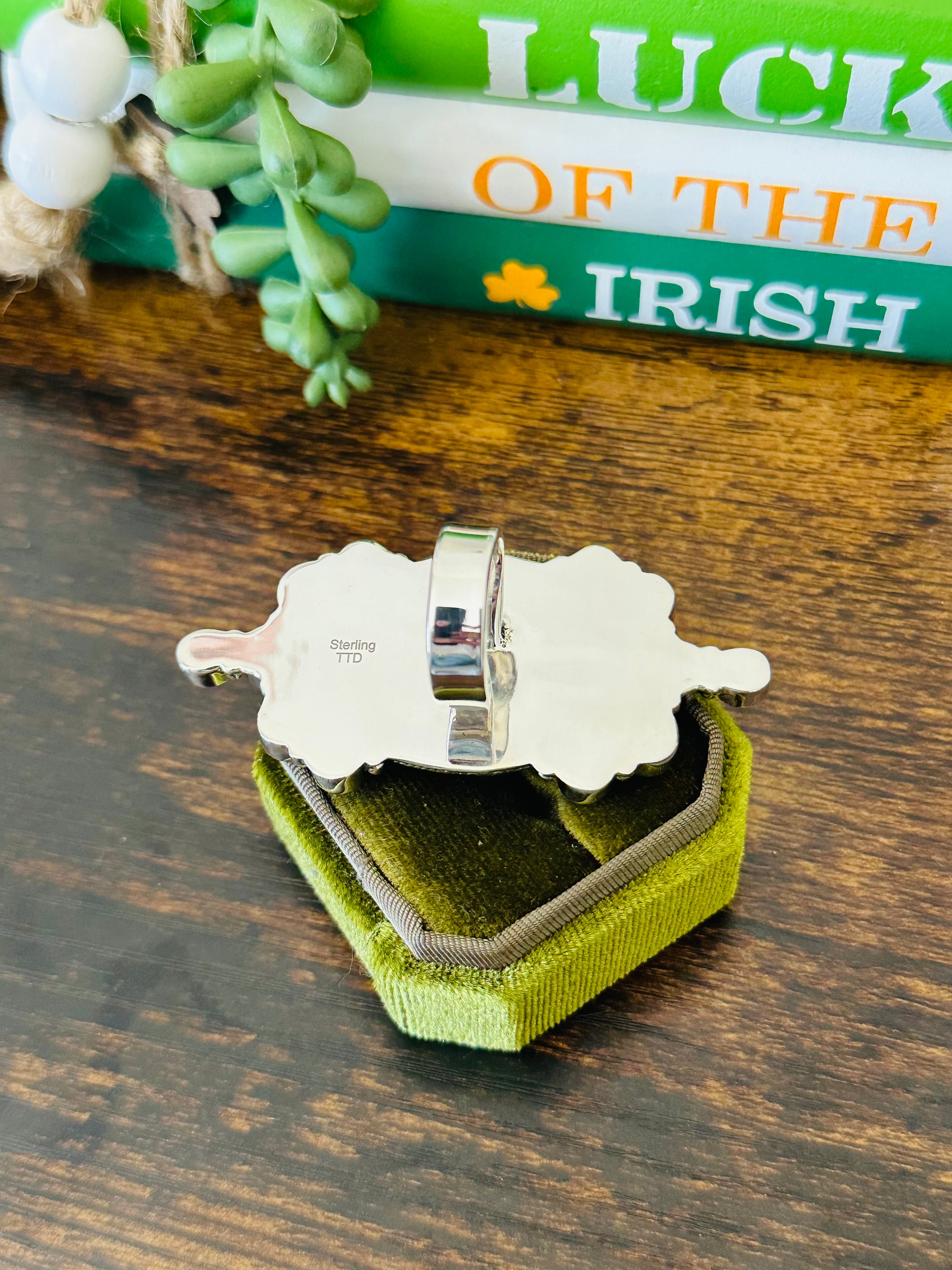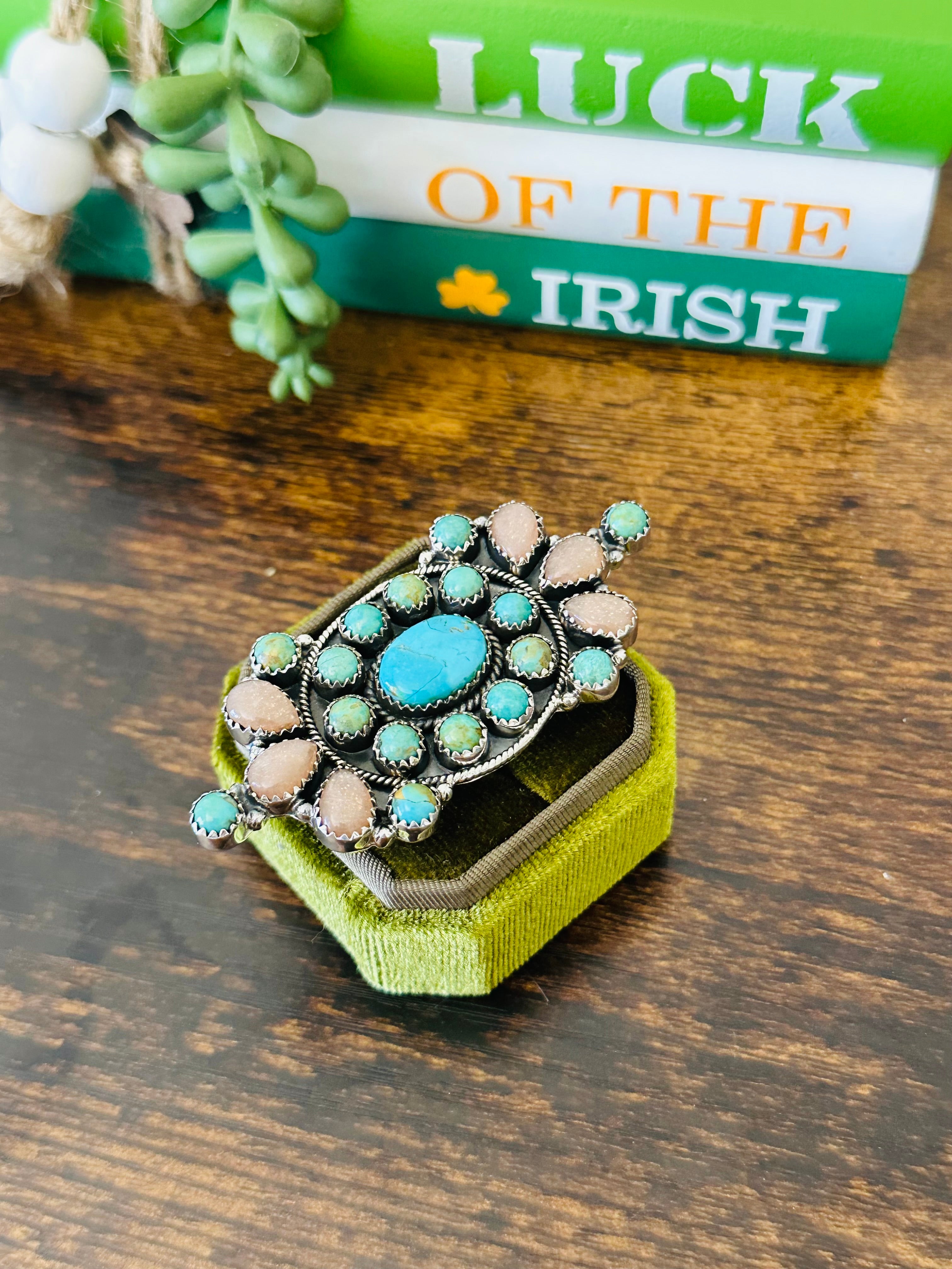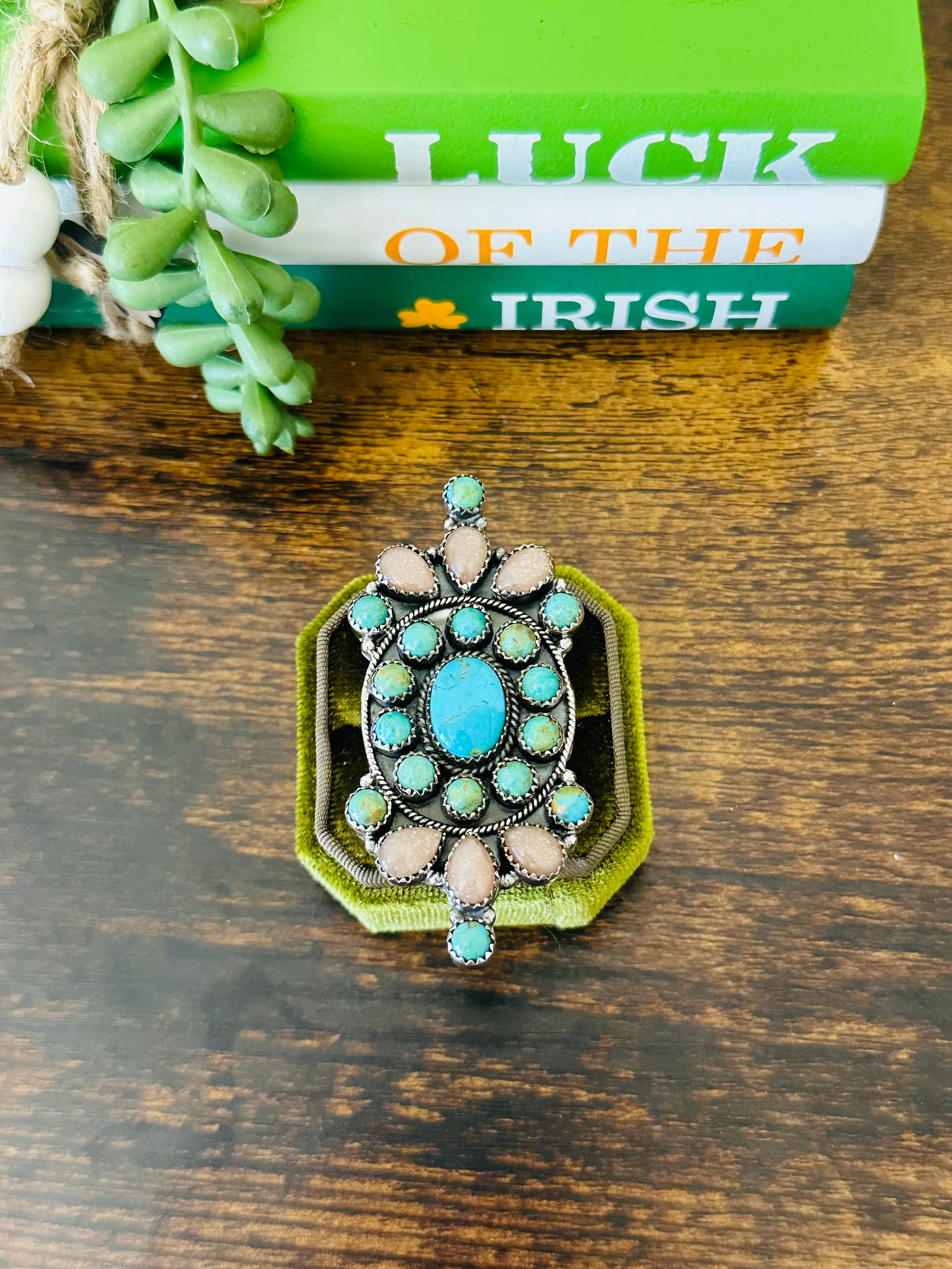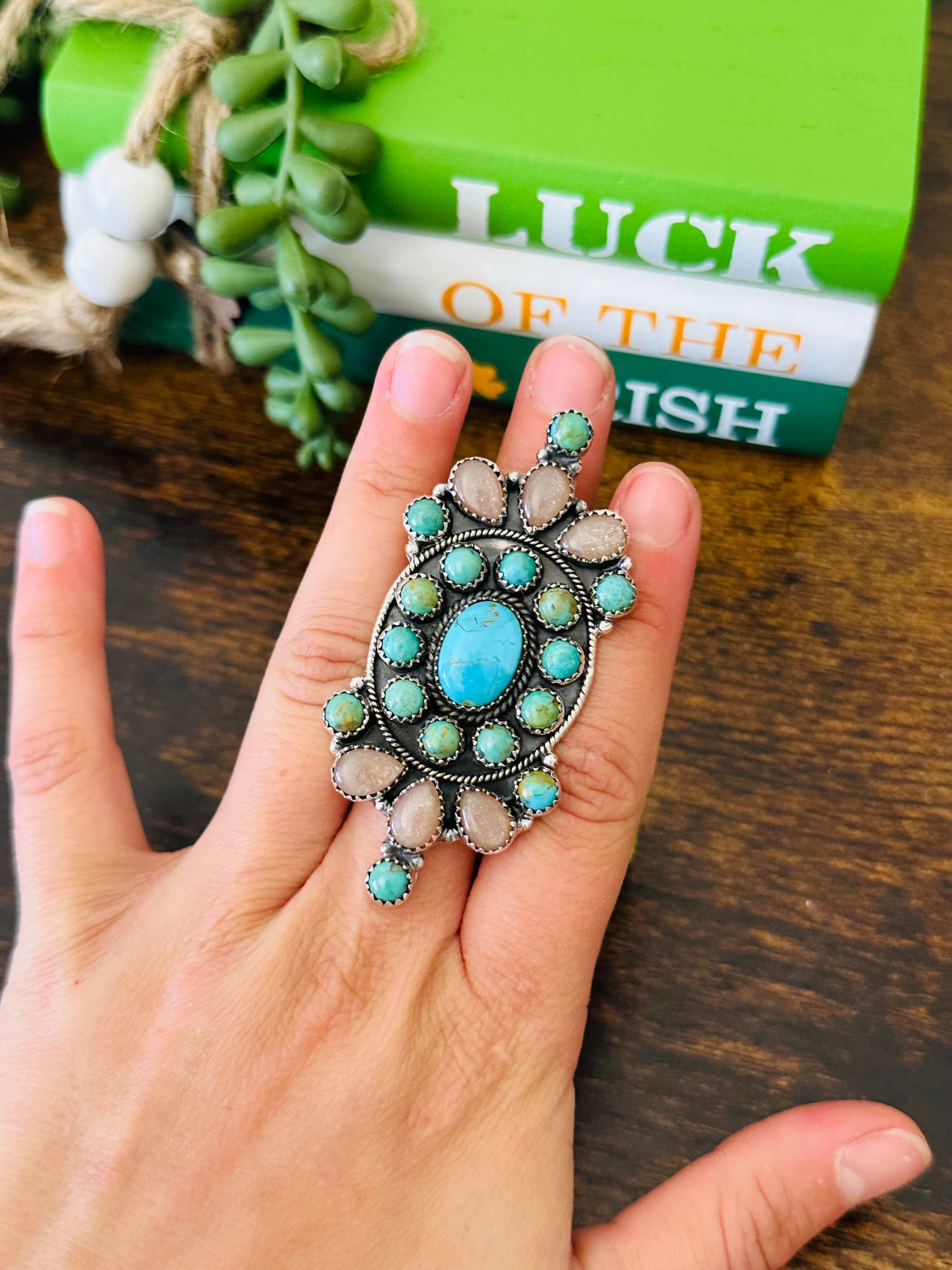 Beautiful cluster ring. Southwest Handmade Multi Stone & Sterling Silver Adjustable Cluster Ring. It measures 2 3/4 inches long and 1 1/4 inches wide. Signed by the artist and stamped sterling silver.