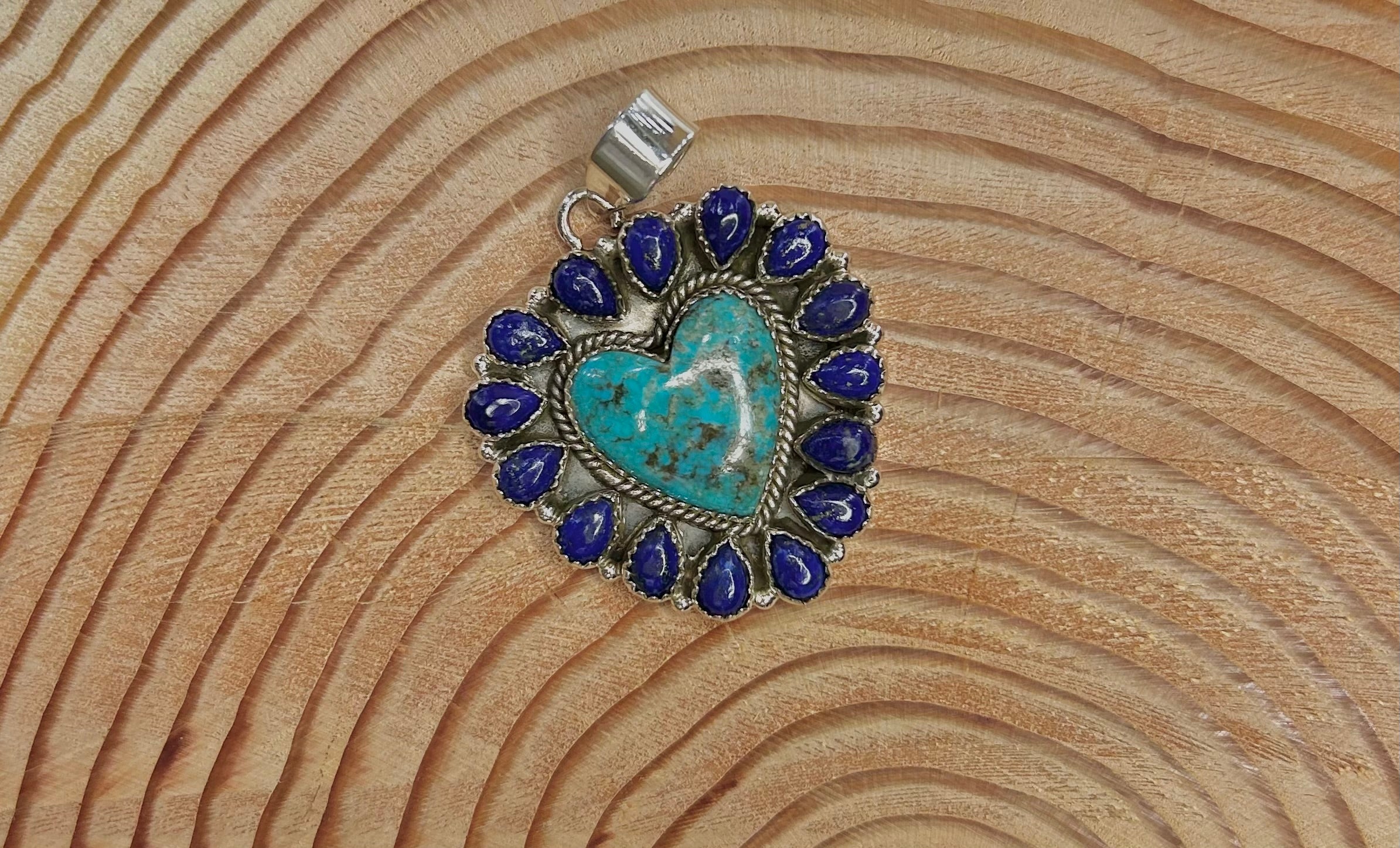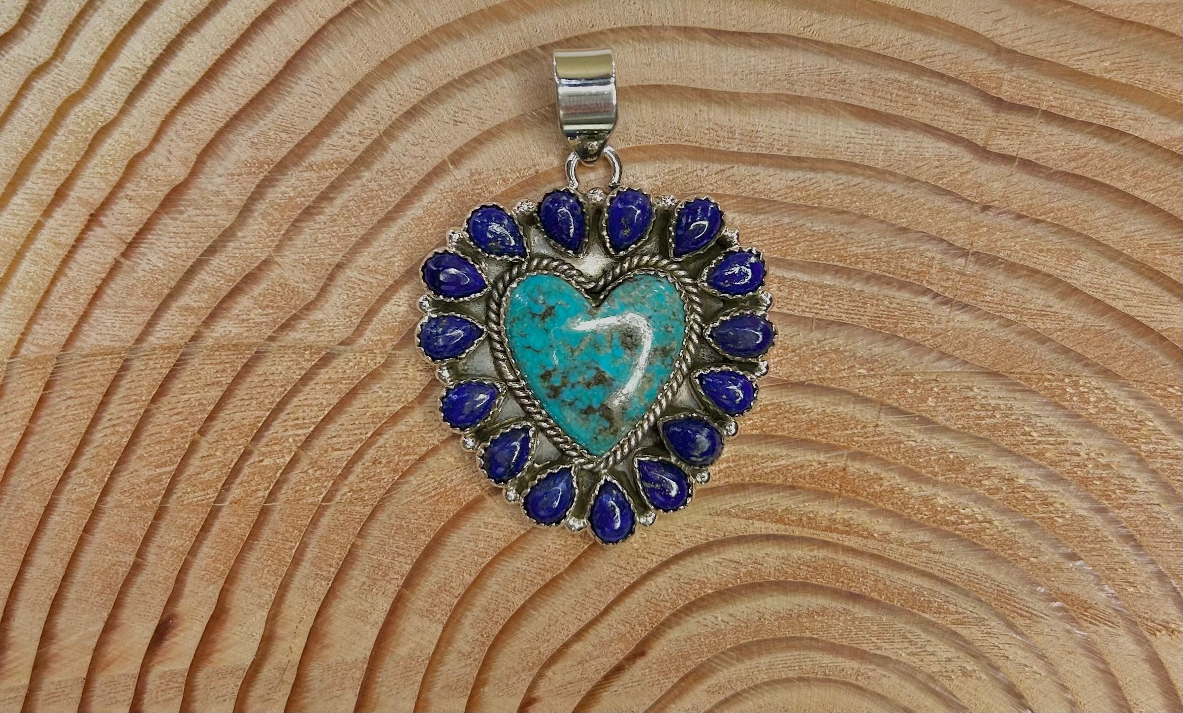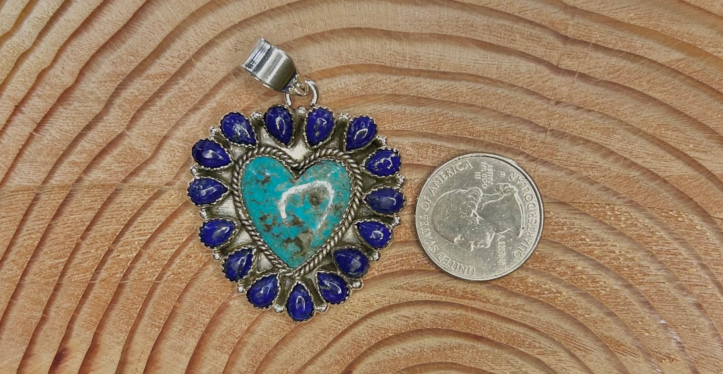 Southwest Handmade Multi Stone & Sterling Silver Heart Pendant. It measures 2 inches long and a little over 1 3/8 inches wide. Pendant Only. Signed by the artist and stamped sterling silver.