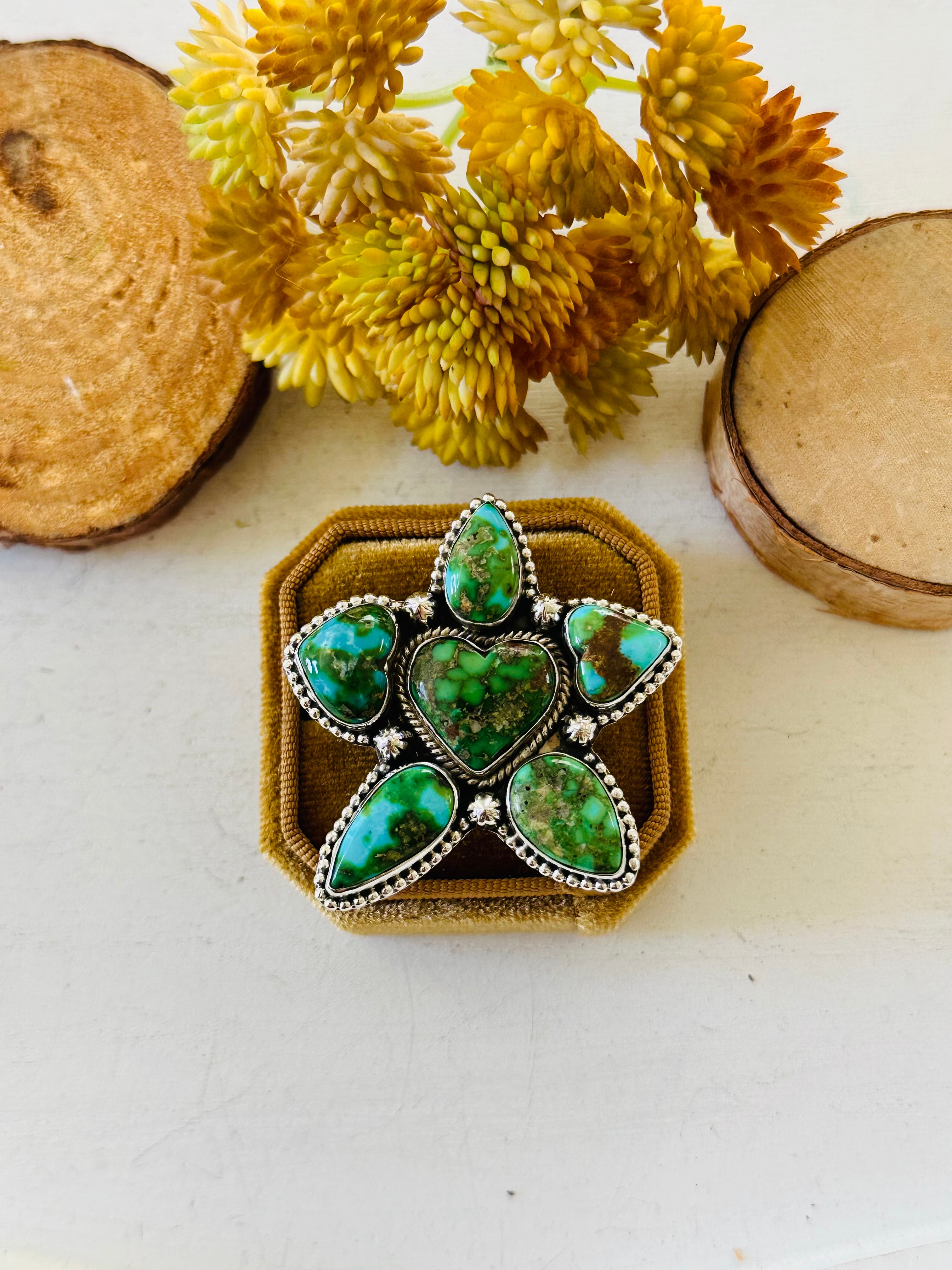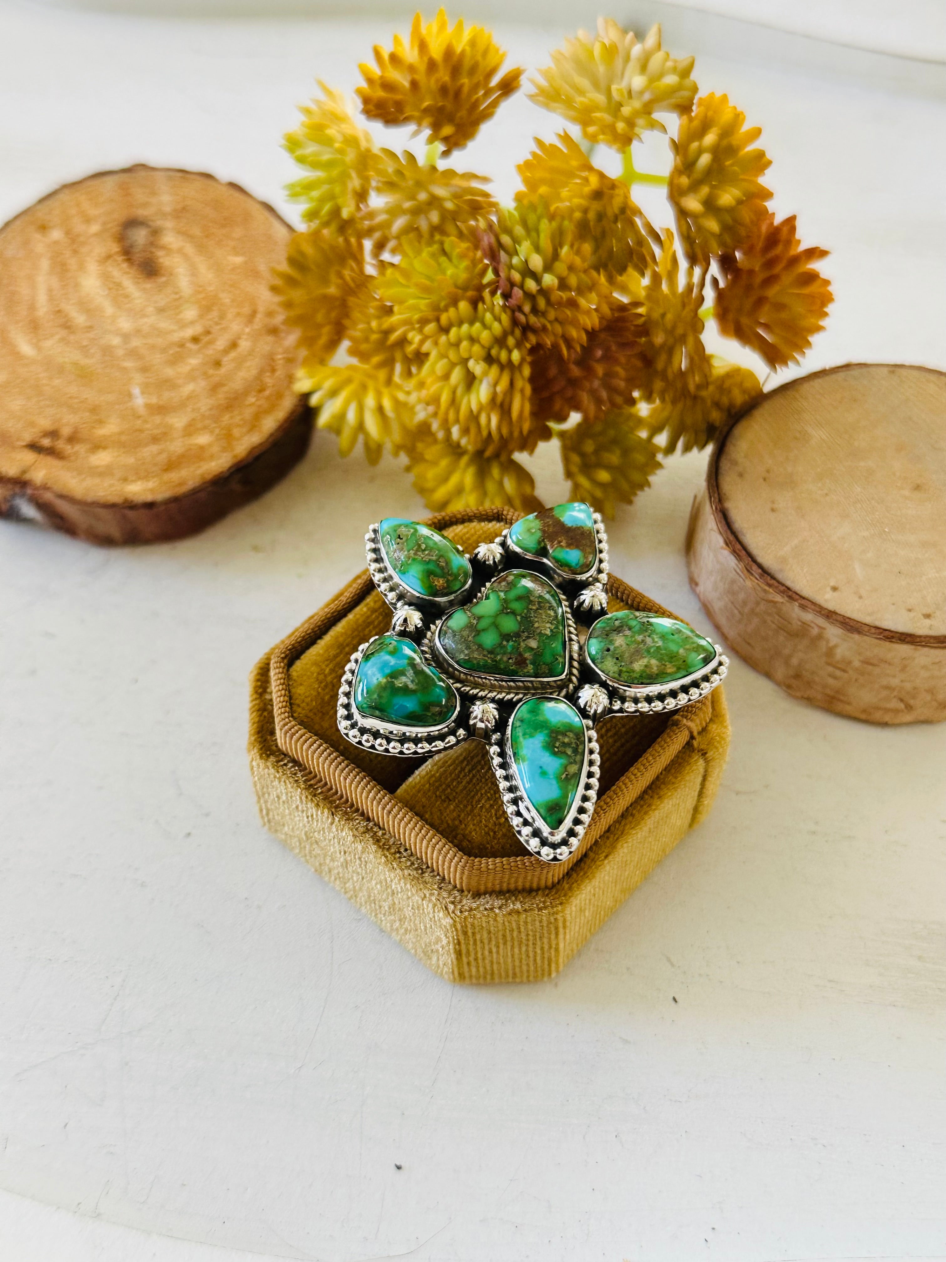 Beautiful ring. Southwest Handmade Sonoran Mountain Turquoise & Sterling Silver Adjustable Cluster Ring. It measures 1 7/8 inches long and 1 3/4 inches wide. Signed by the artist and stamped sterling silver.