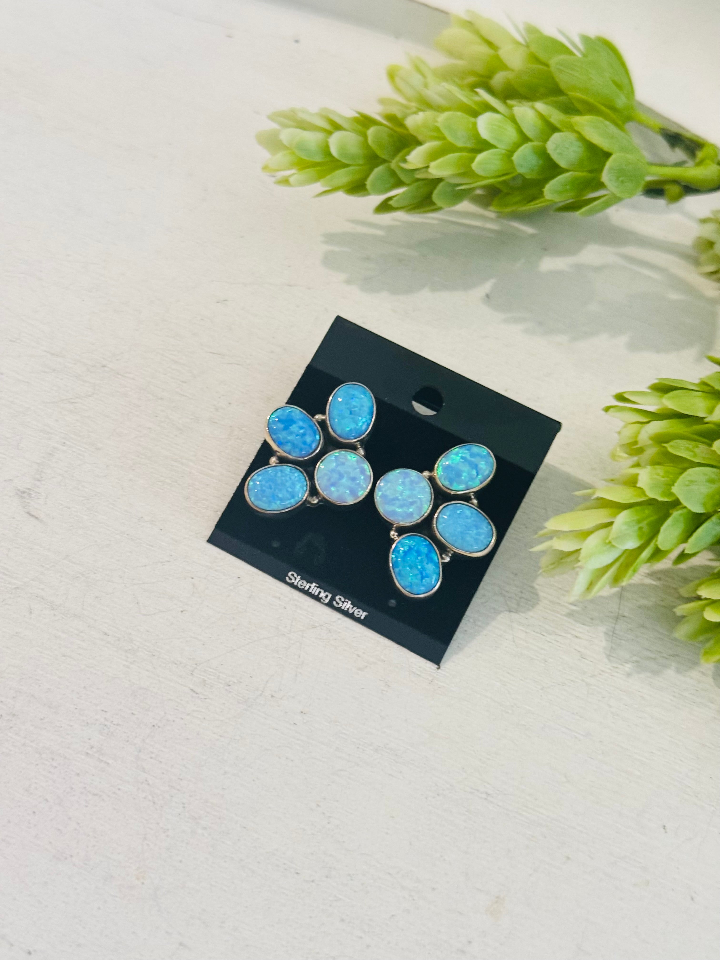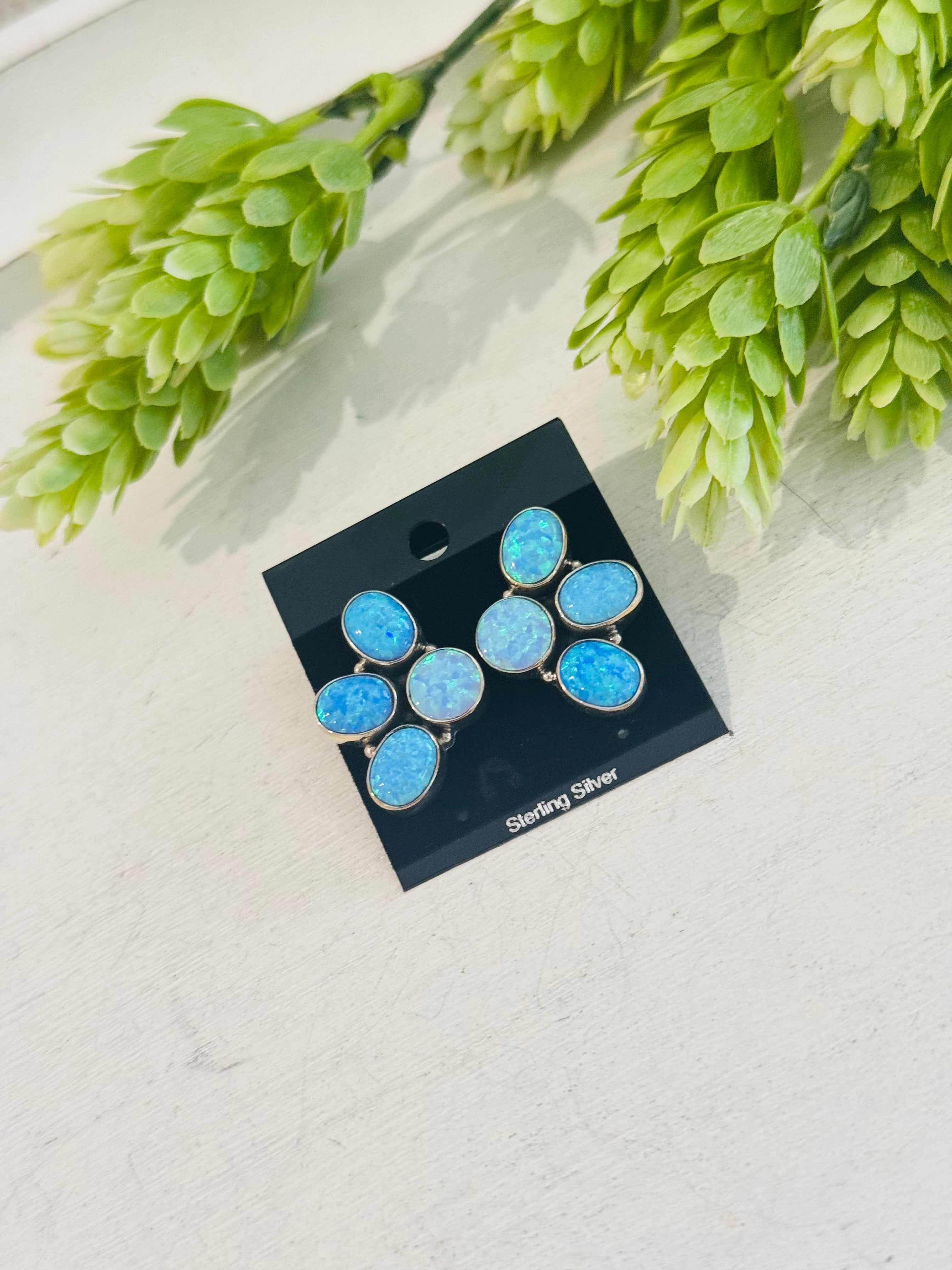 Southwest Handmade Blue Opal & Sterling Silver Post Dangle Cluster Earrings