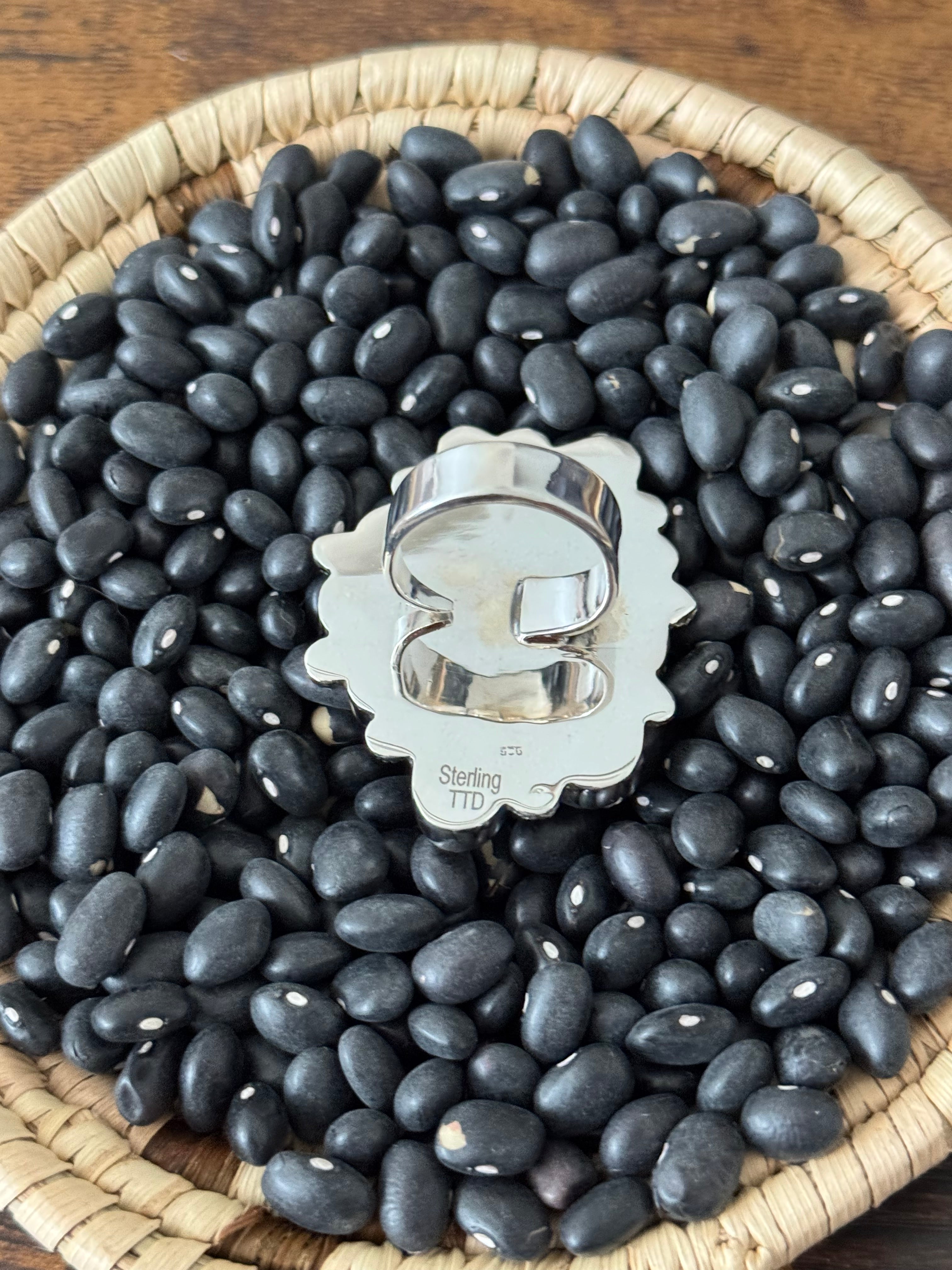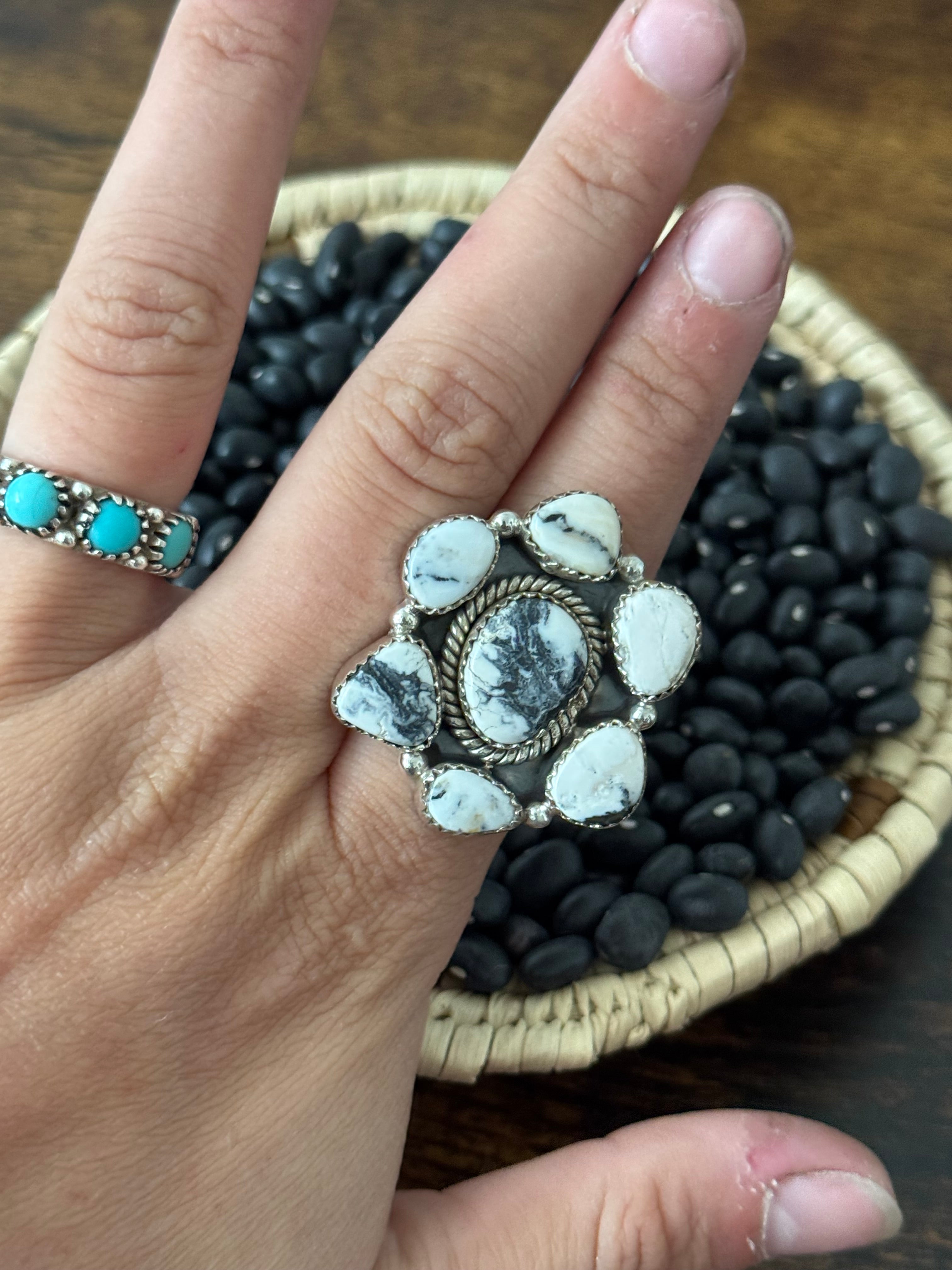Beautiful ring. Southwest Handmade White Buffalo & Sterling Silver Adjustable Cluster Ring. It measures 1 1/4 inches long and 1 1/8 inches wide. Signed by the artist and stamped sterling silver.