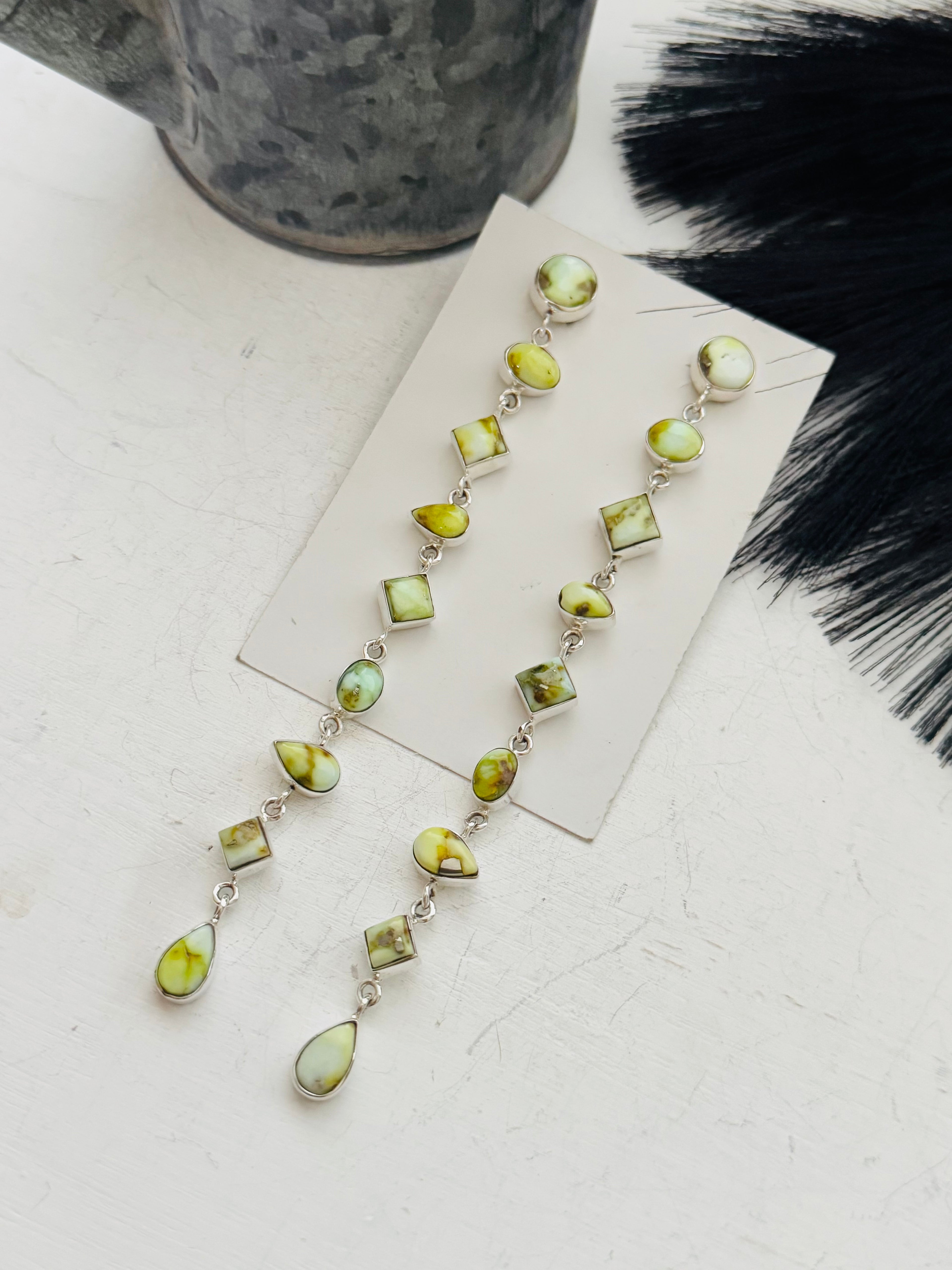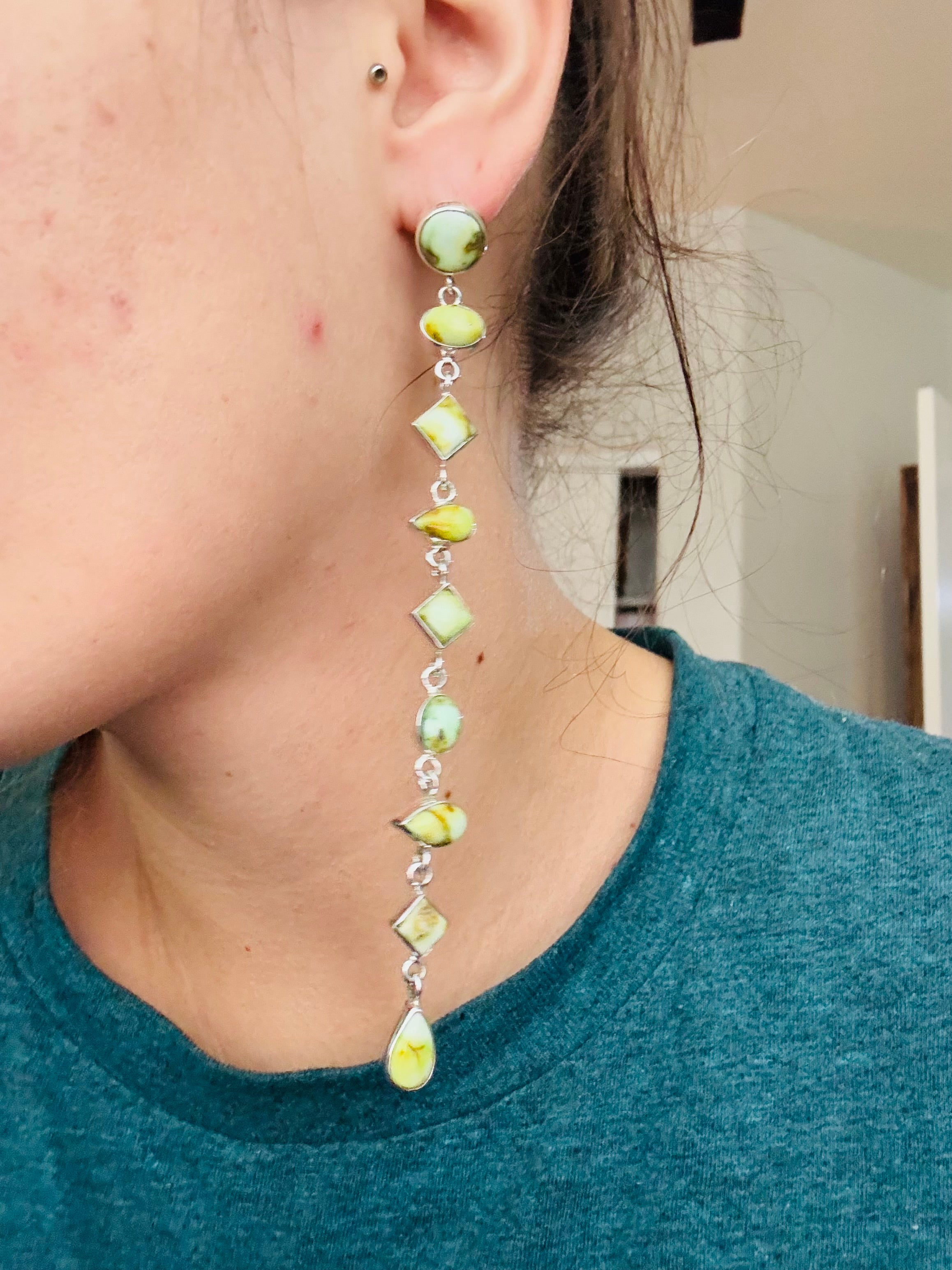 Breathtaking earrings. Southwest Handmade Palomino Variscite & Sterling Silver Post Dangle Earrings. It measures 5 1/4 inches long and 1/2 of an inch wide. Signed by the artist and stamped sterling silver.