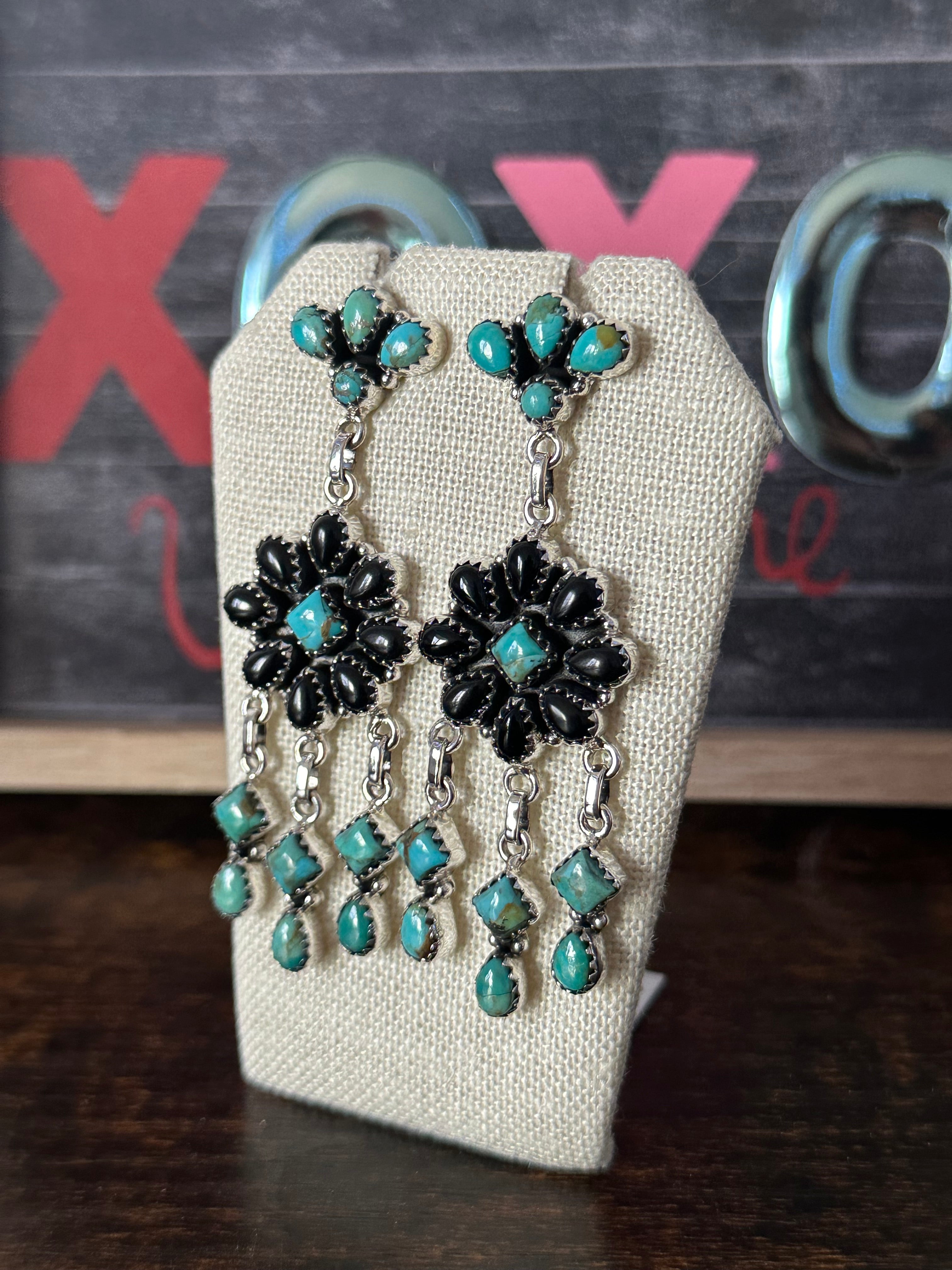 Breathtaking earrings. Southwest Handmade Multi Stone & Sterling Silver Post Dangle Earrings. It measures 2 1/2 inches long and 7/8 of an inch wide. Signed by the artist and stamped sterling silver.