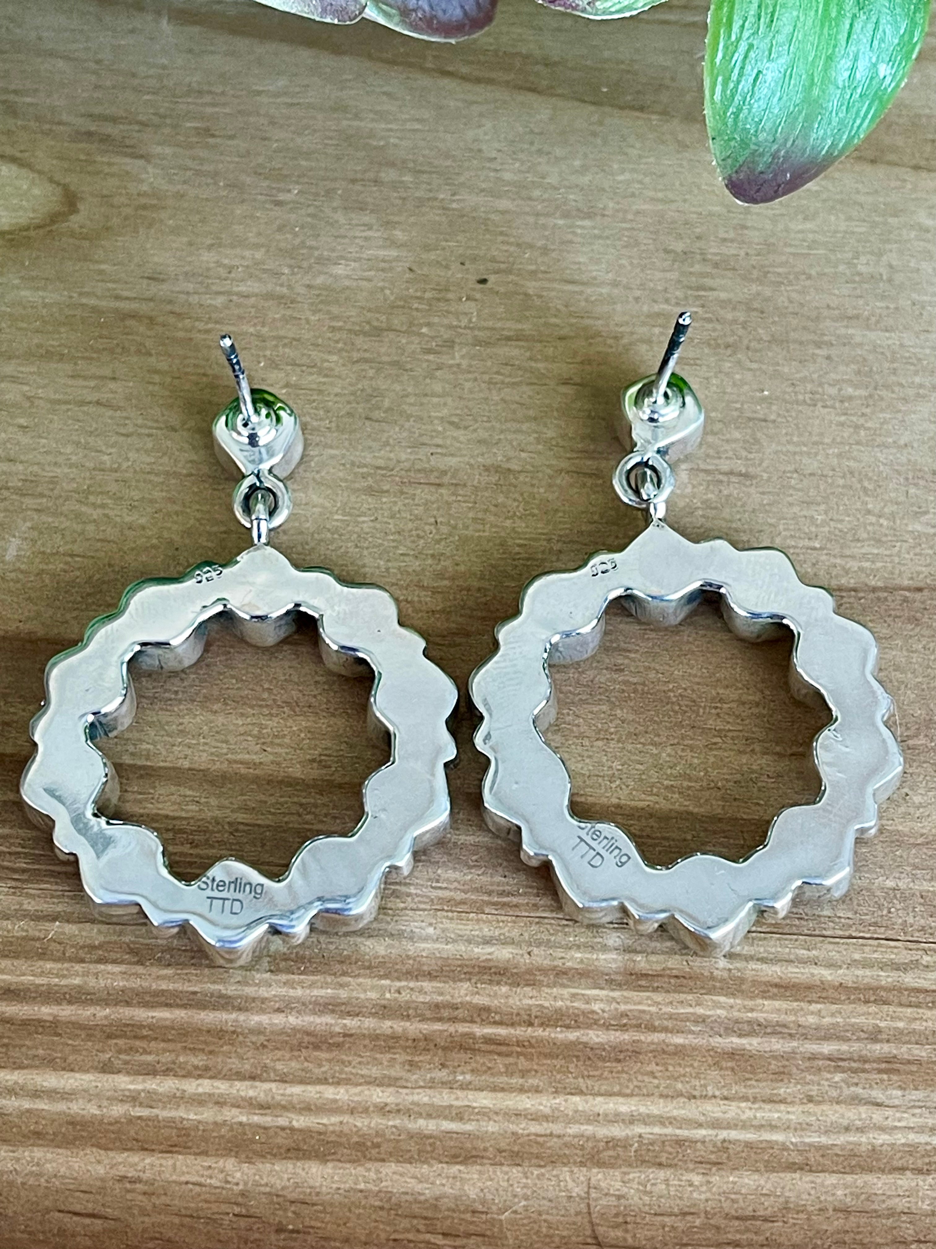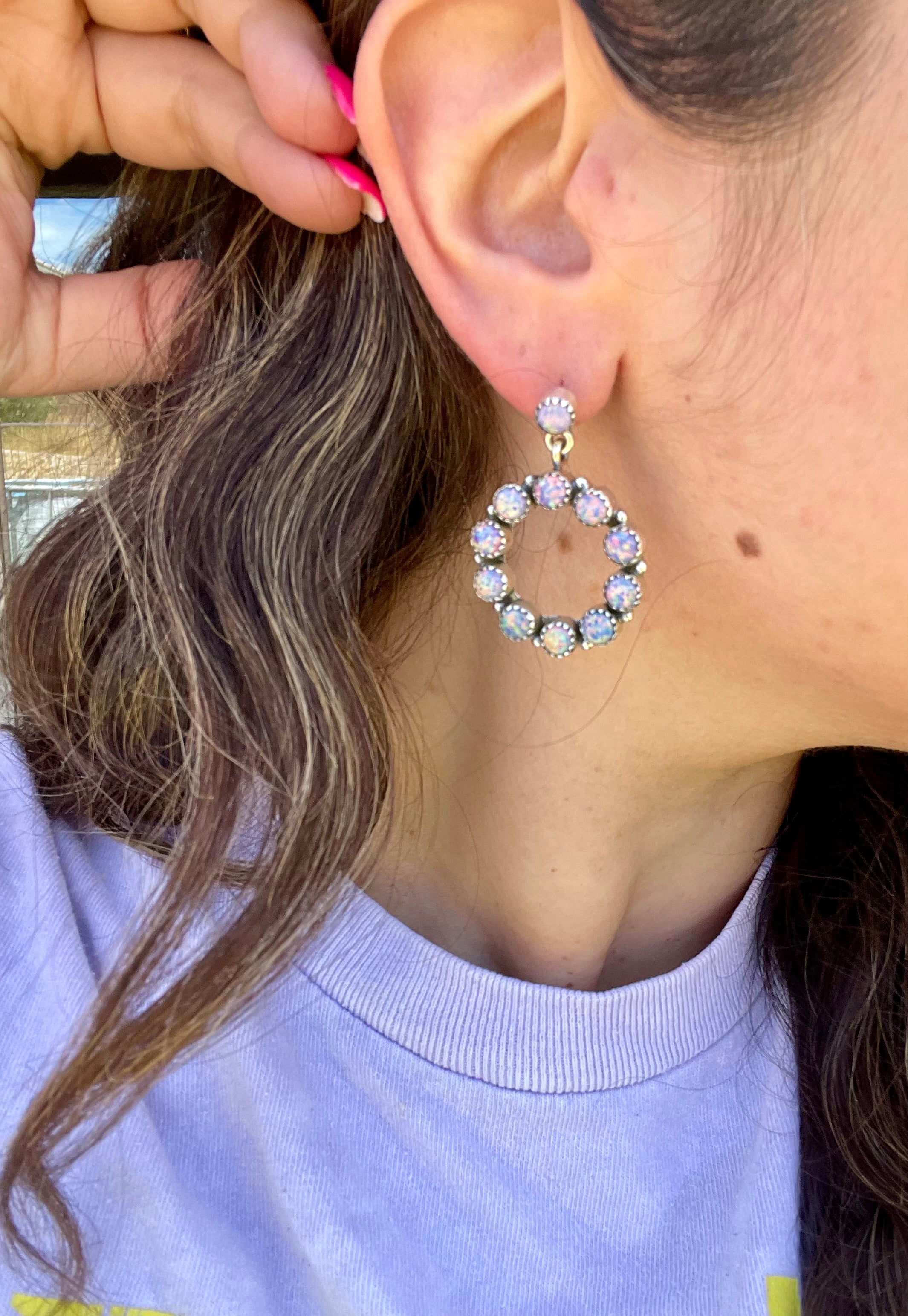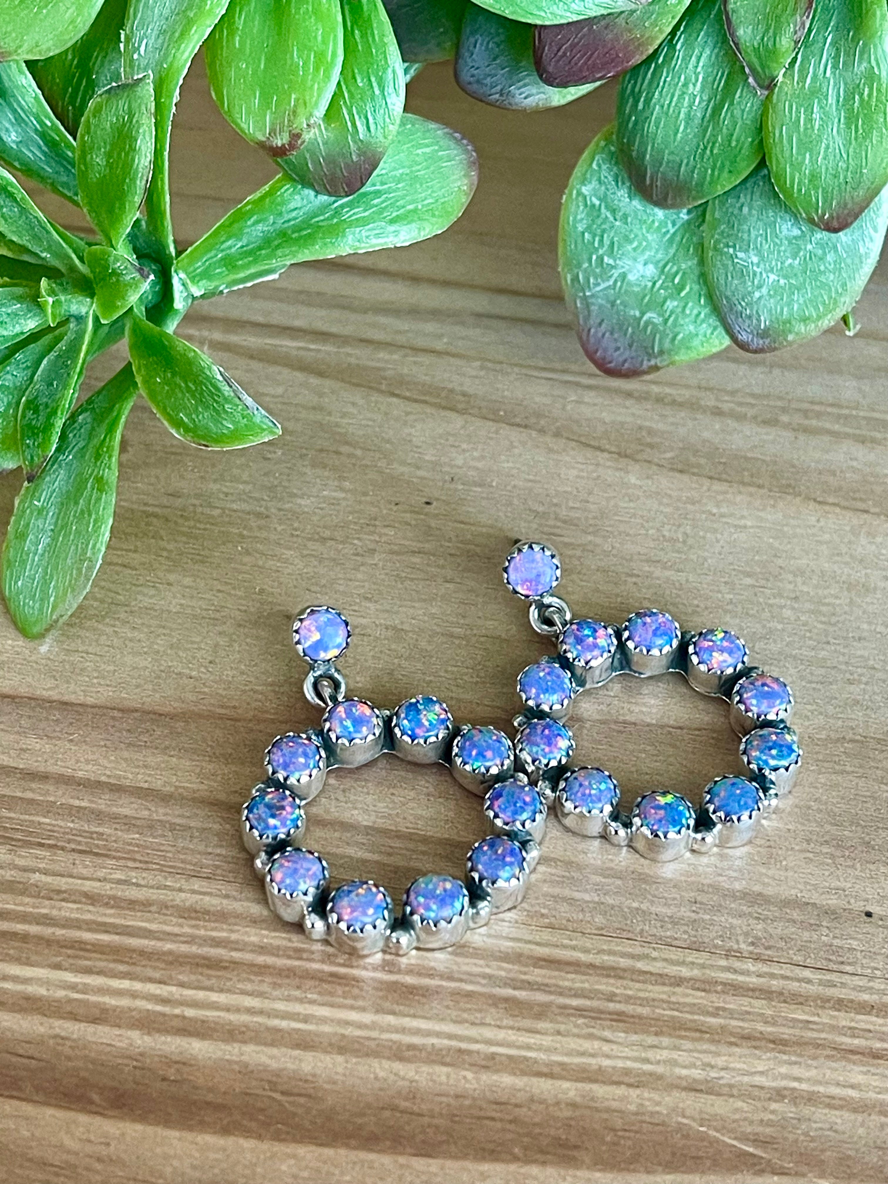 Breathtaking earrings. Southwest Handmade Fire Purple Opal & Sterling Silver Post Earrings. It measures just under 2 inches long and 1 1/4 of an inch wide. Signed by the artist and stamped sterling silver.