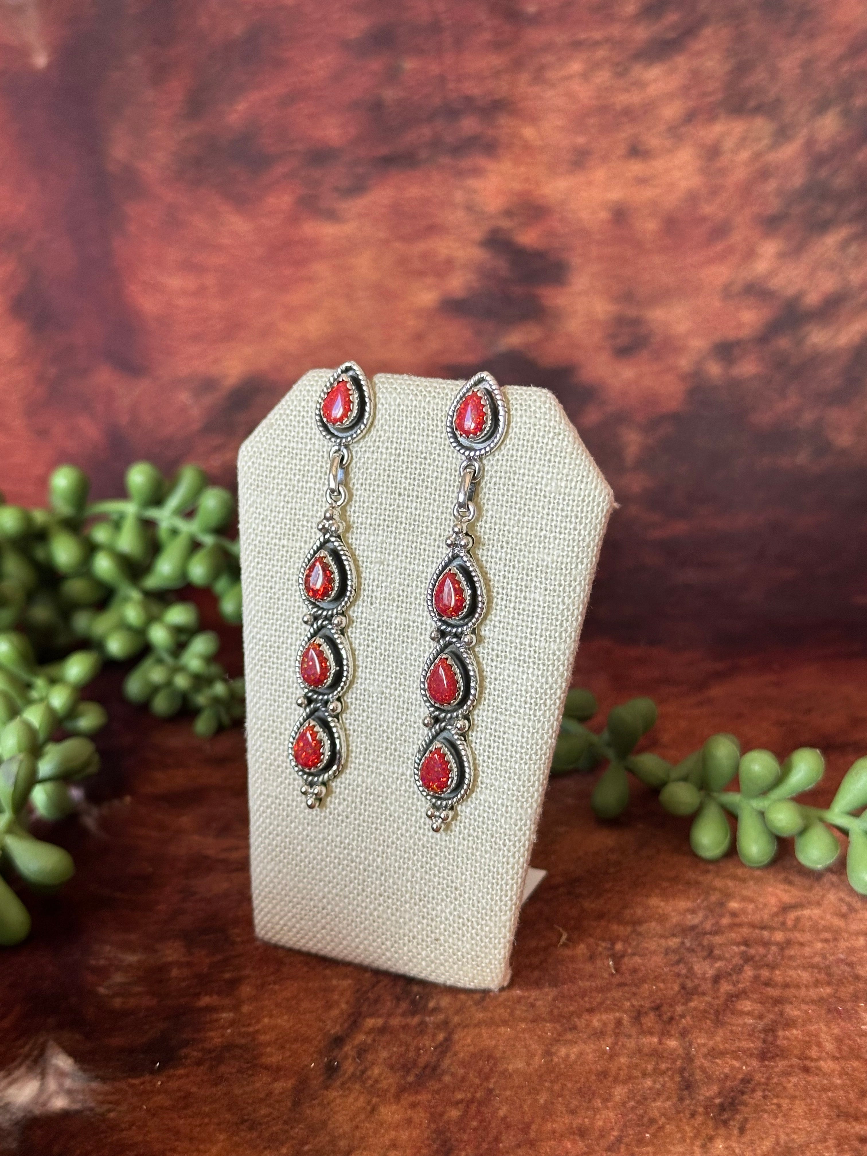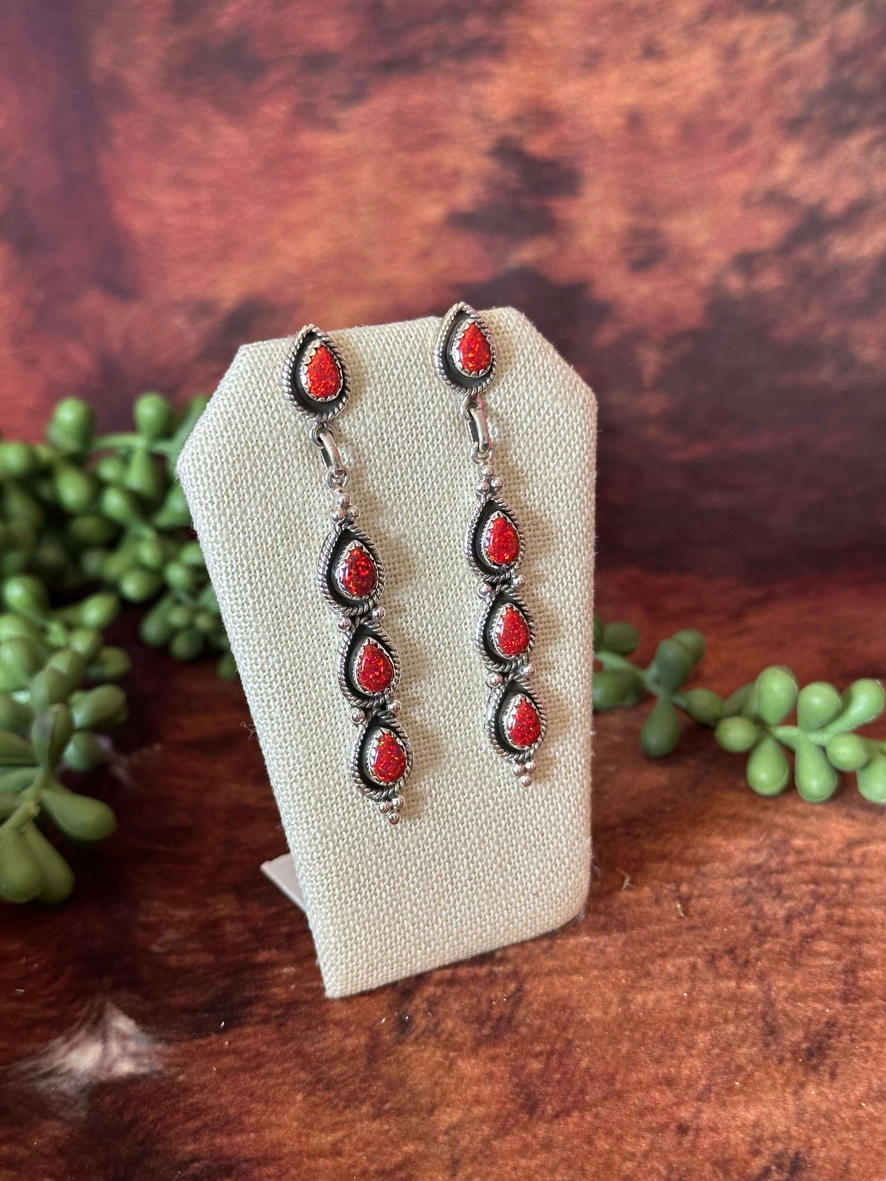 Breathtaking earrings. Southwest Handmade Red Opal & Sterling Silver Post Dangle Earrings. It measures 2 3/4 inches long and 3/8 of an inch wide. Signed by the artist and stamped sterling silver.