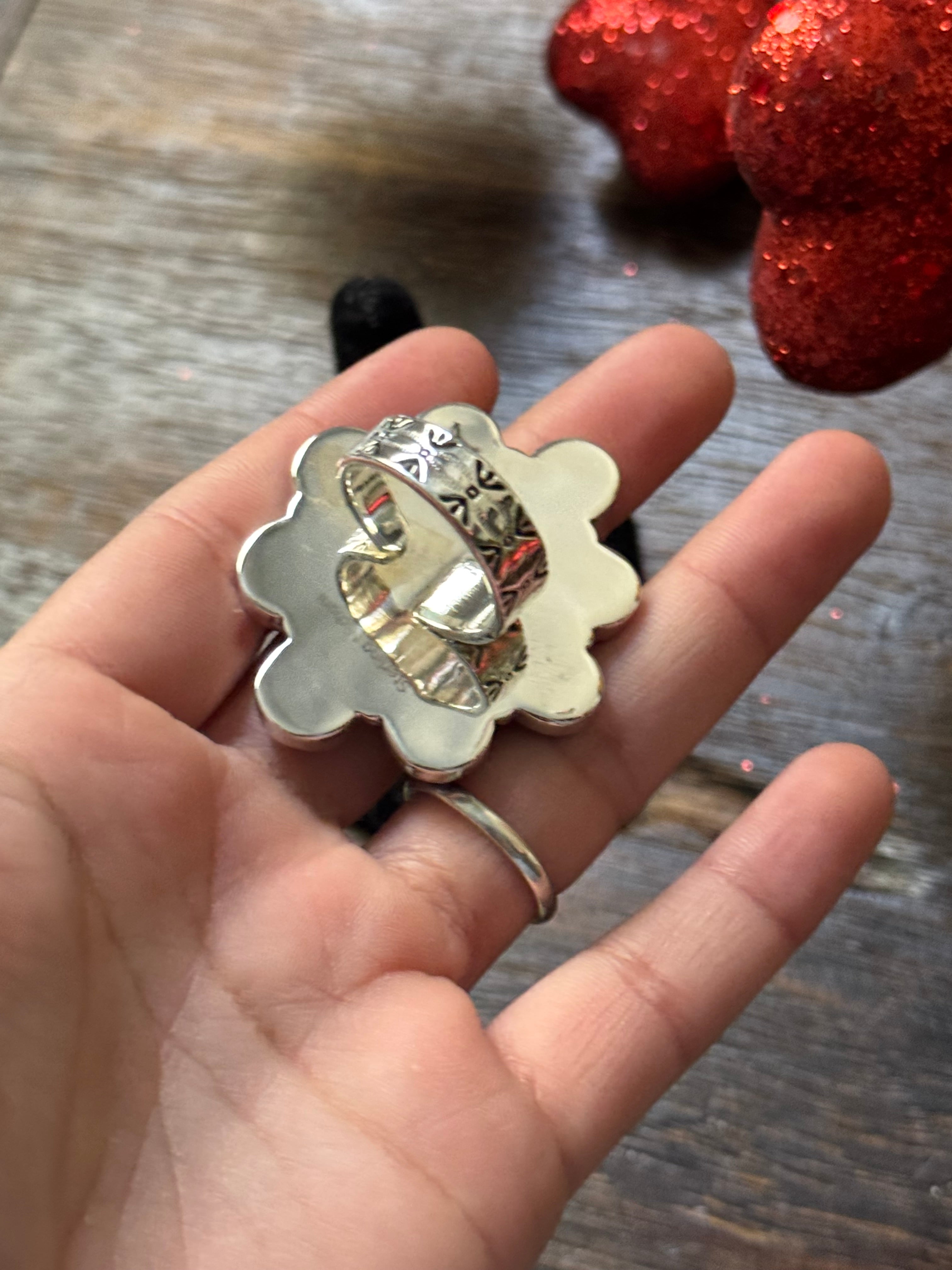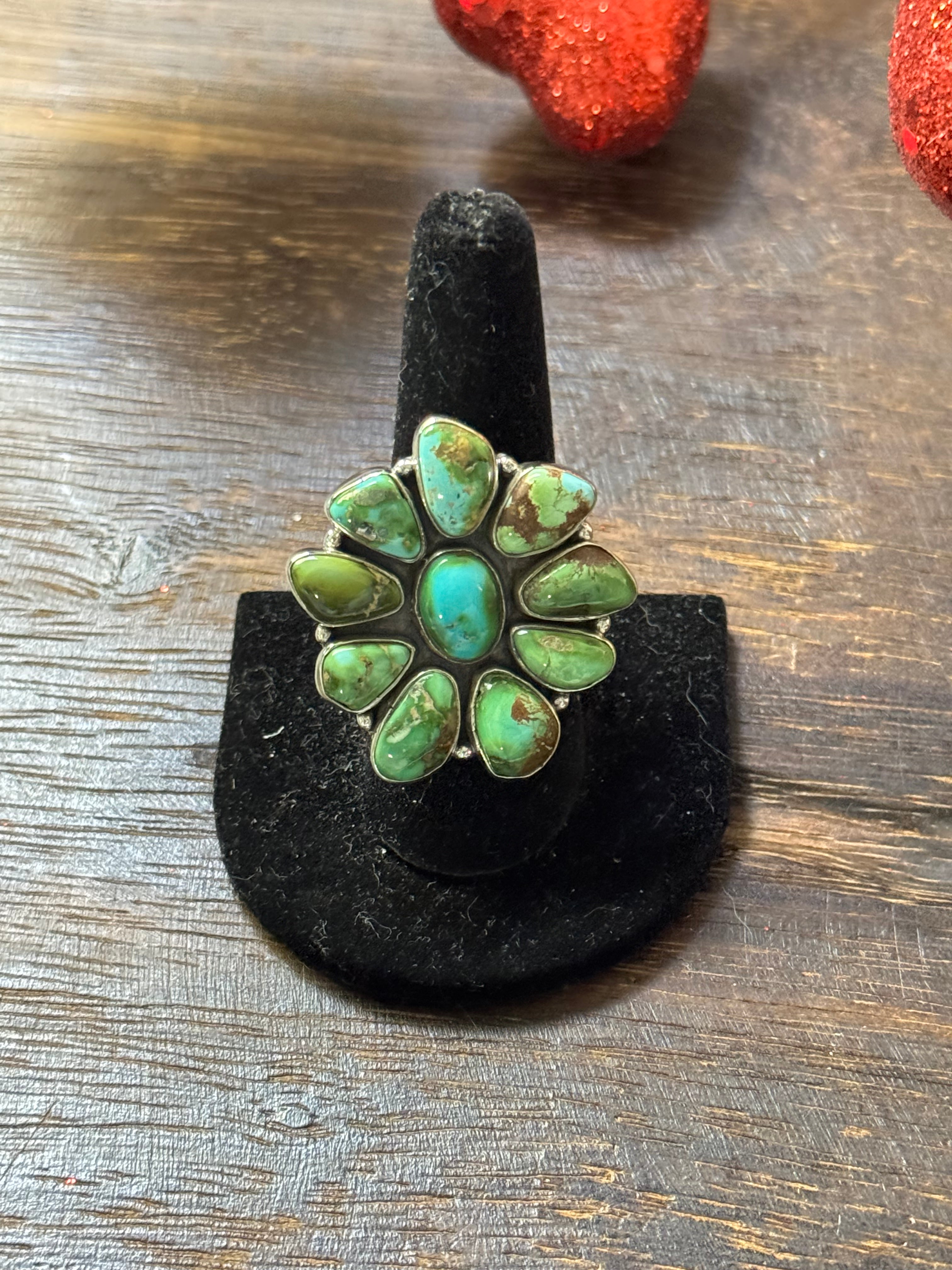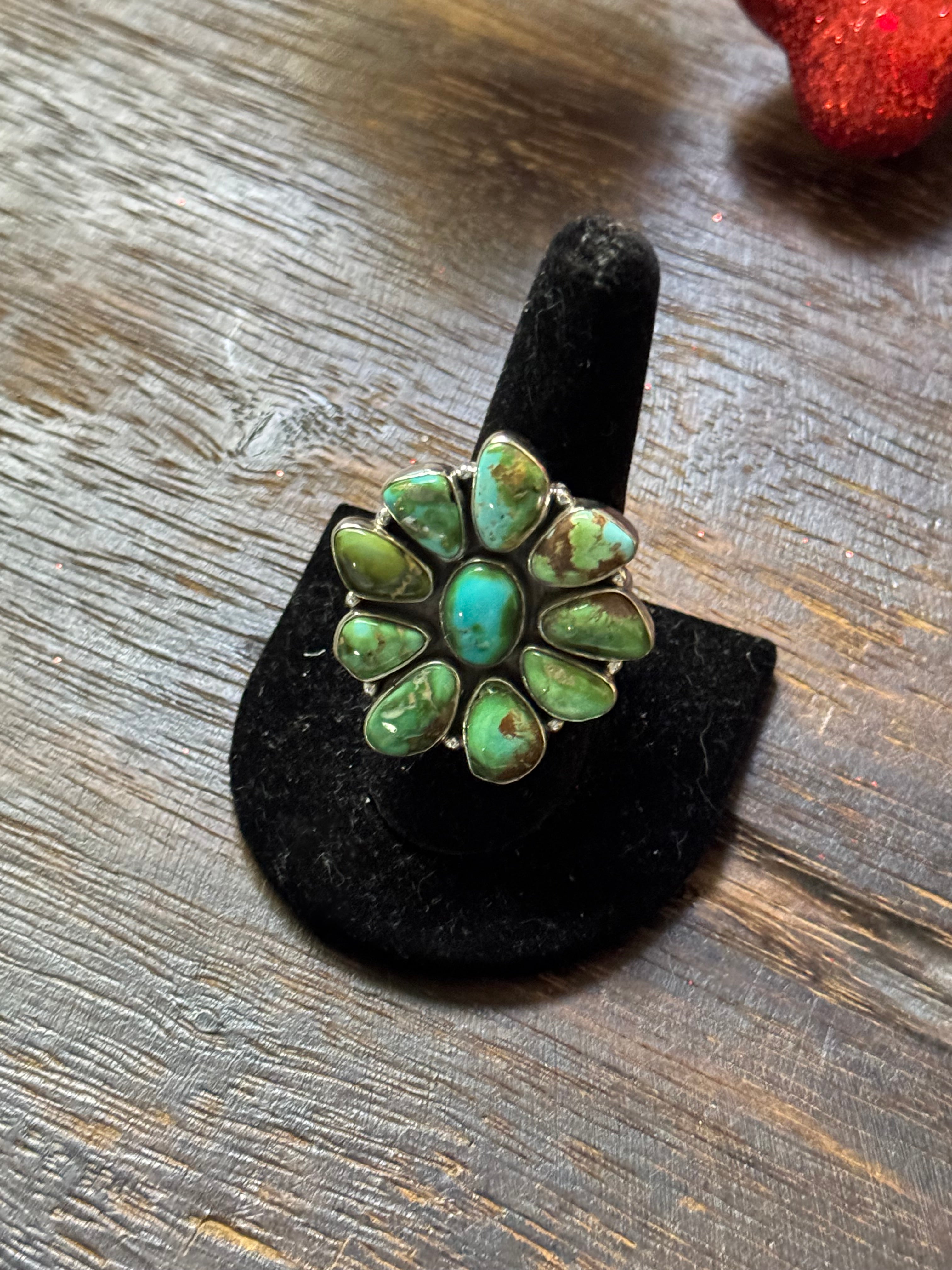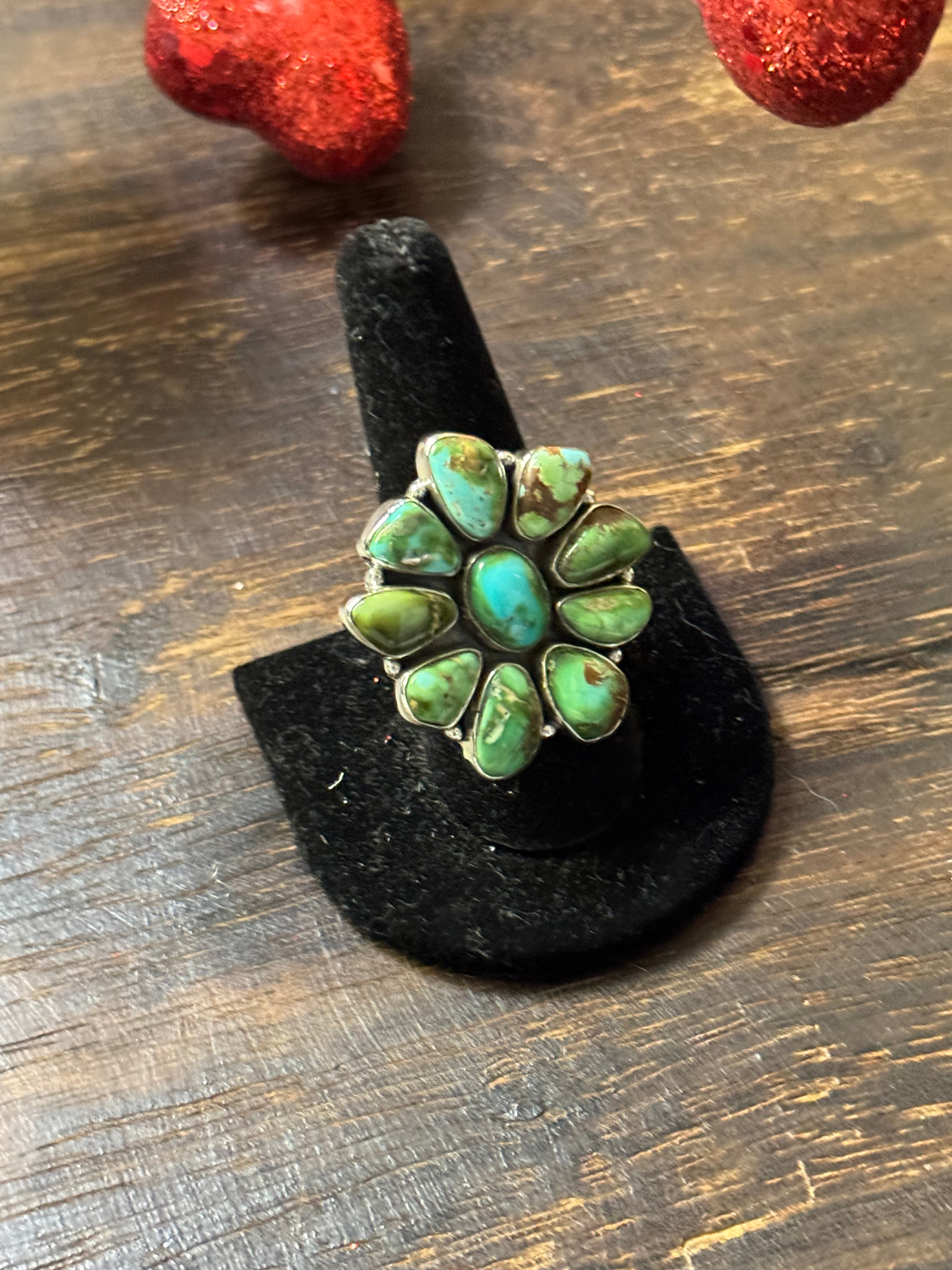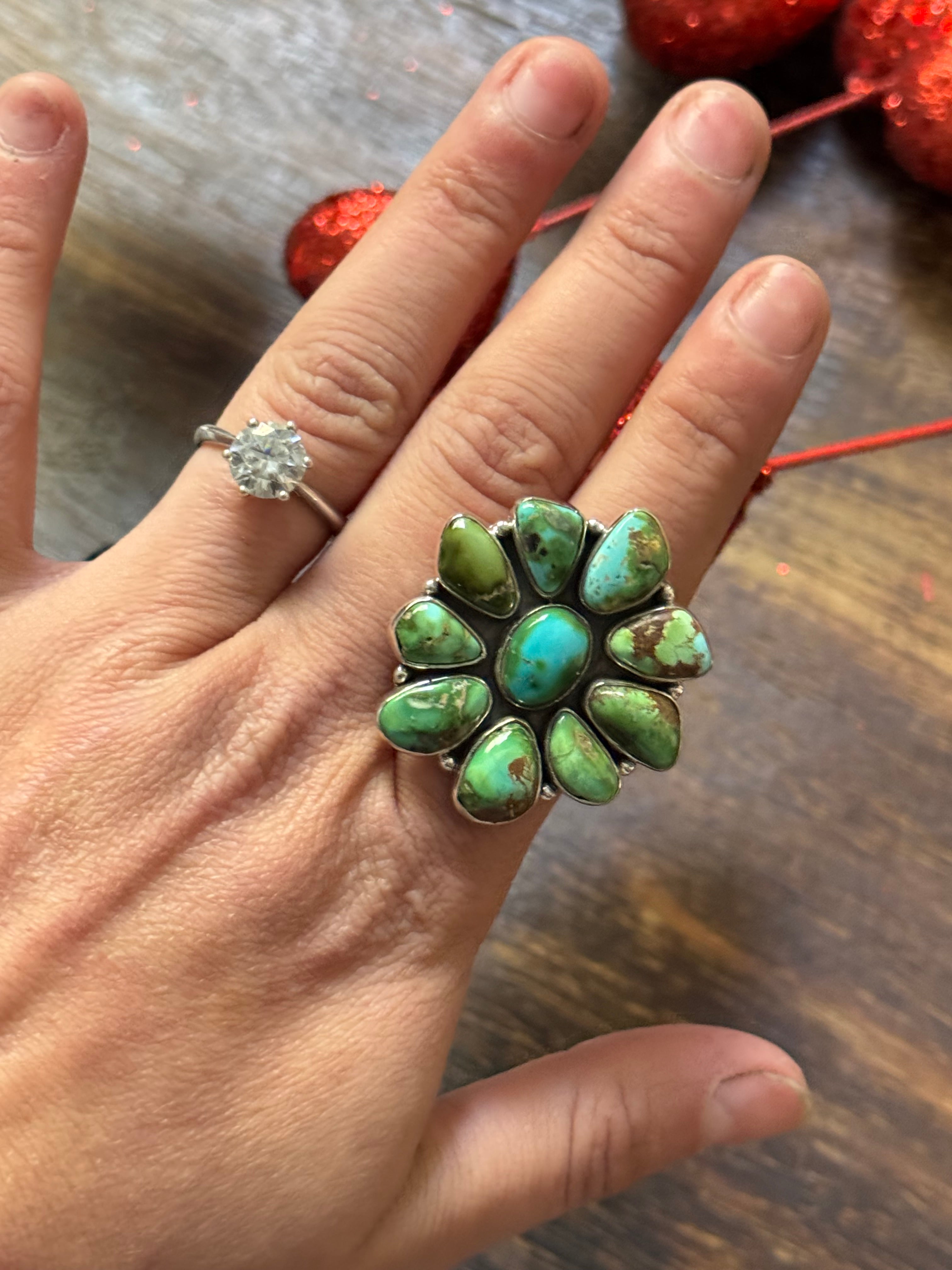 Beautiful ring. Southwest Handmade Sonoran Mountain Turquoise & Sterling Silver Adjustable Cluster Ring. It measures 1 1/2 inches long and 1 3/8 inches wide. Signed by the artist and stamped sterling silver.