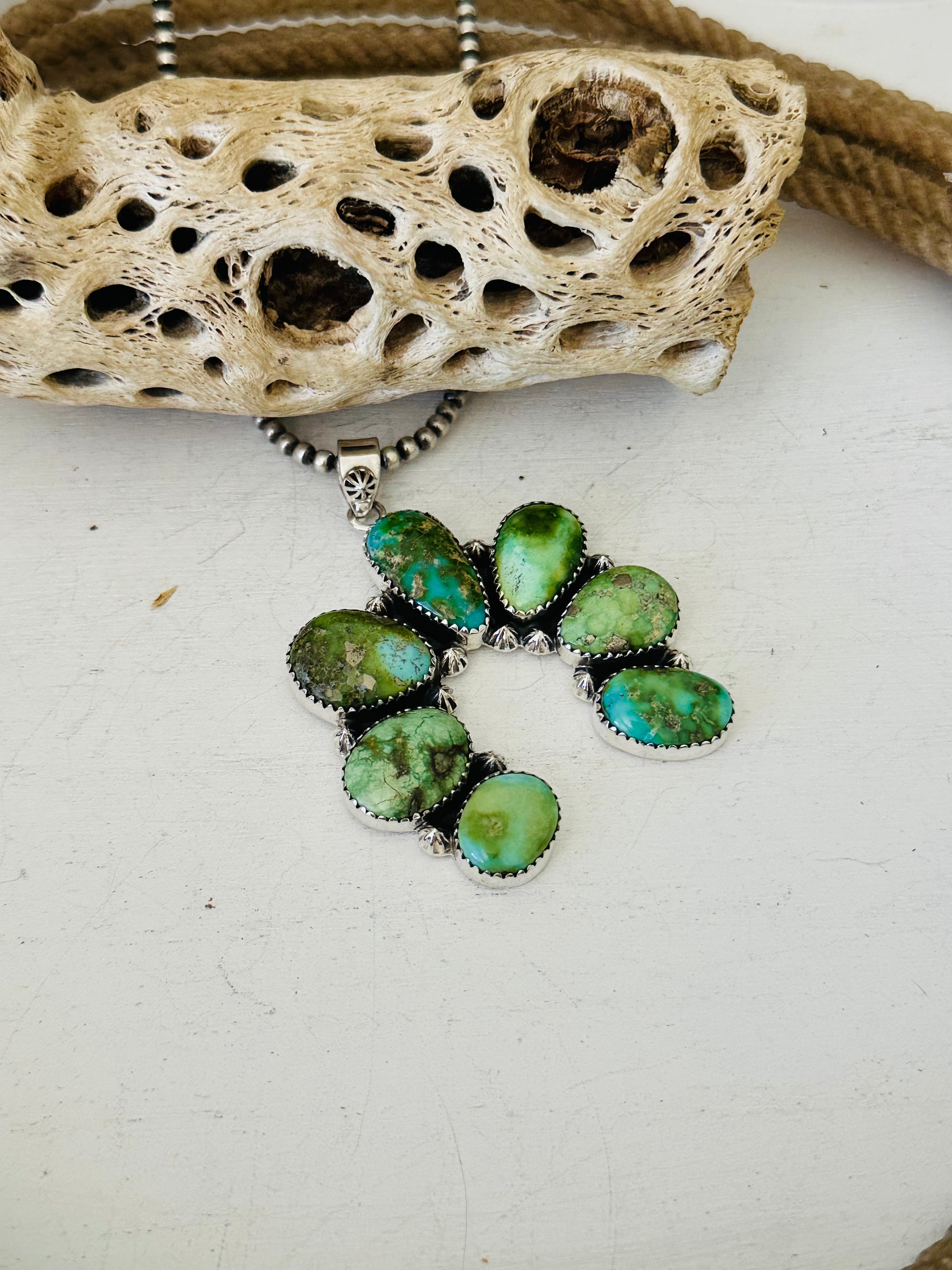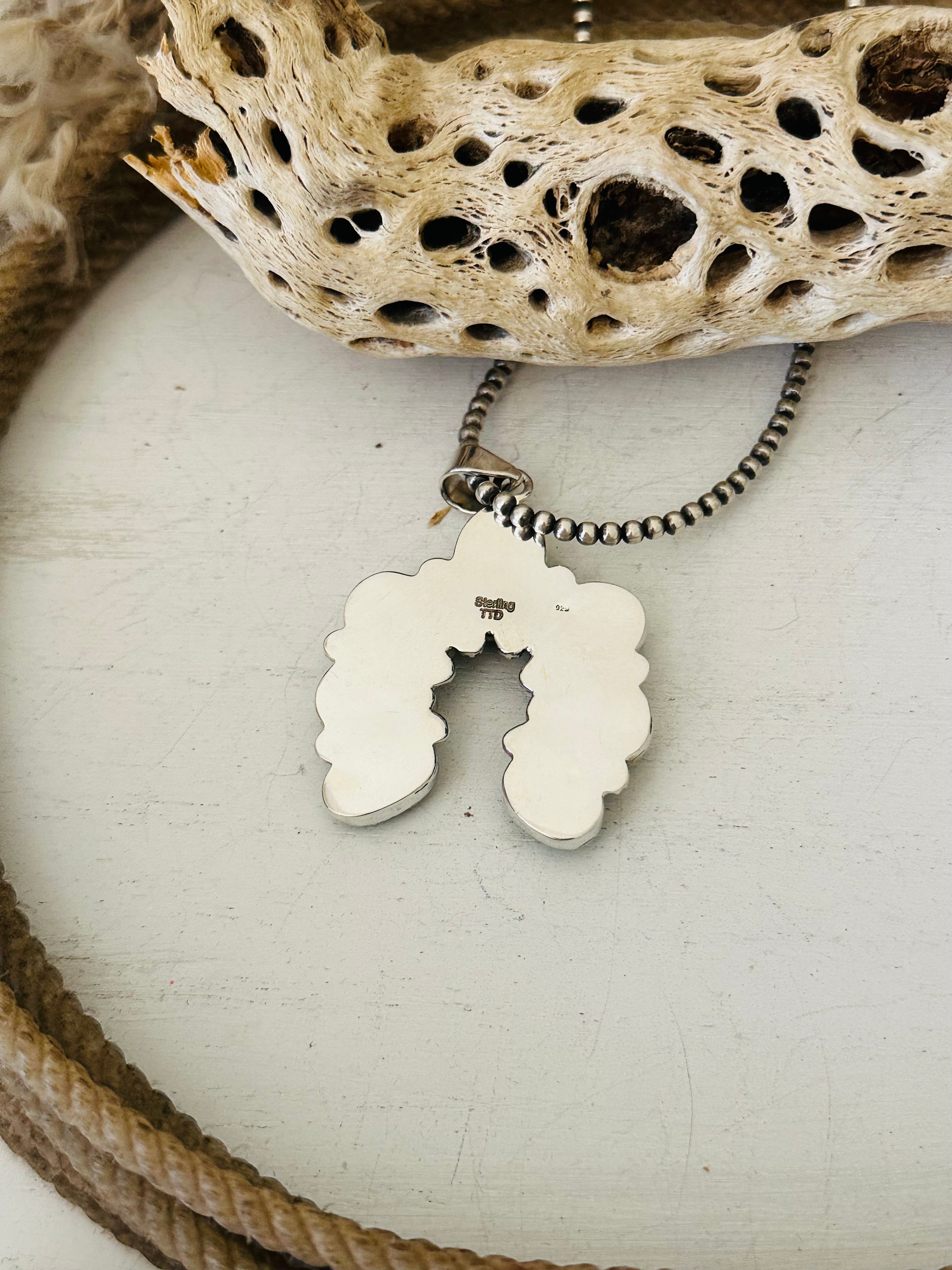 A beautiful pendant Southwest Handmade Sonoran Gold Turquoise & Sterling Silver Naja Pendant. It measures 2 1/2 inches long and 1 7/8 inches wide. Pendant Only. Signed by the artist and stamped sterling silver. Stones will differ due to natural stones.
