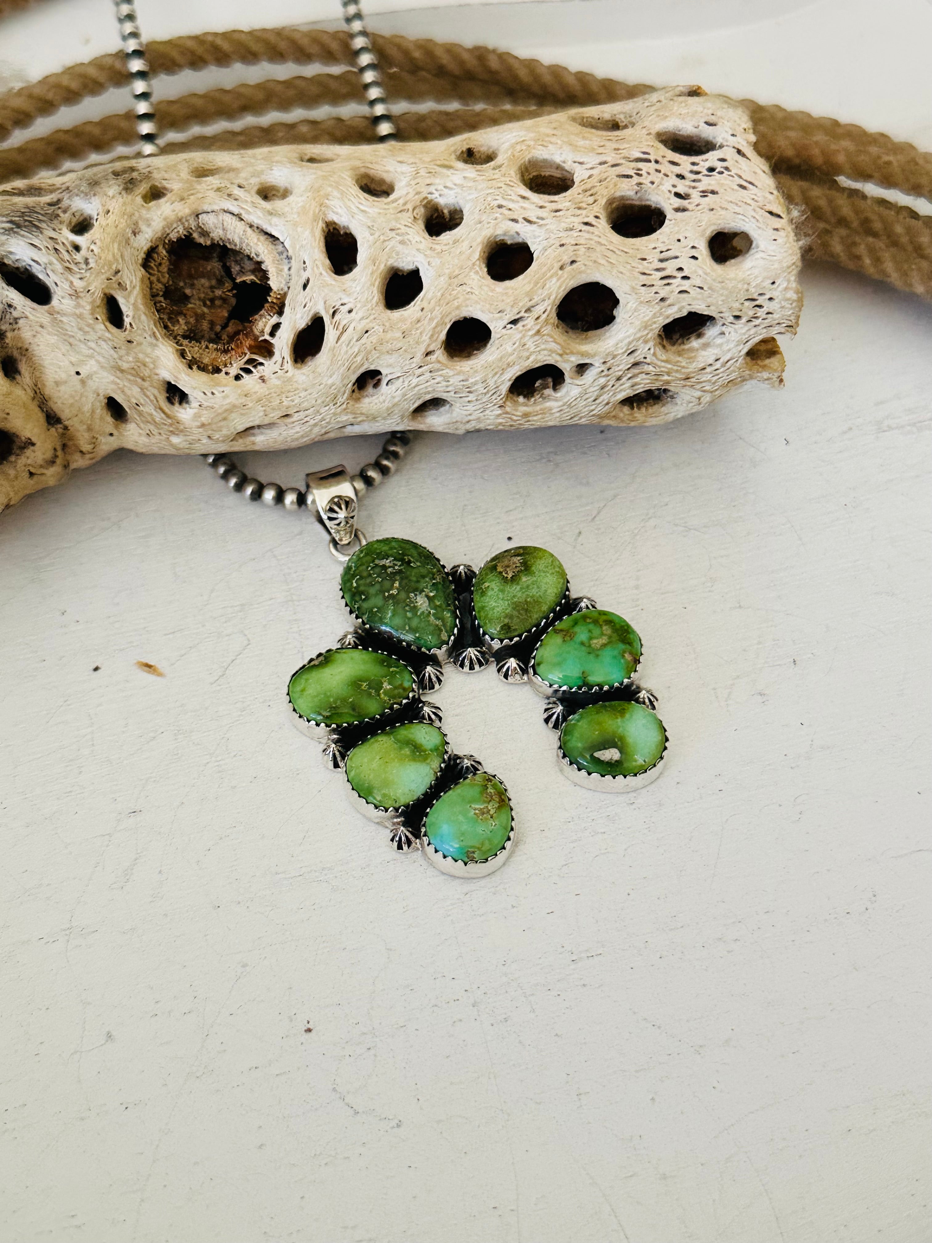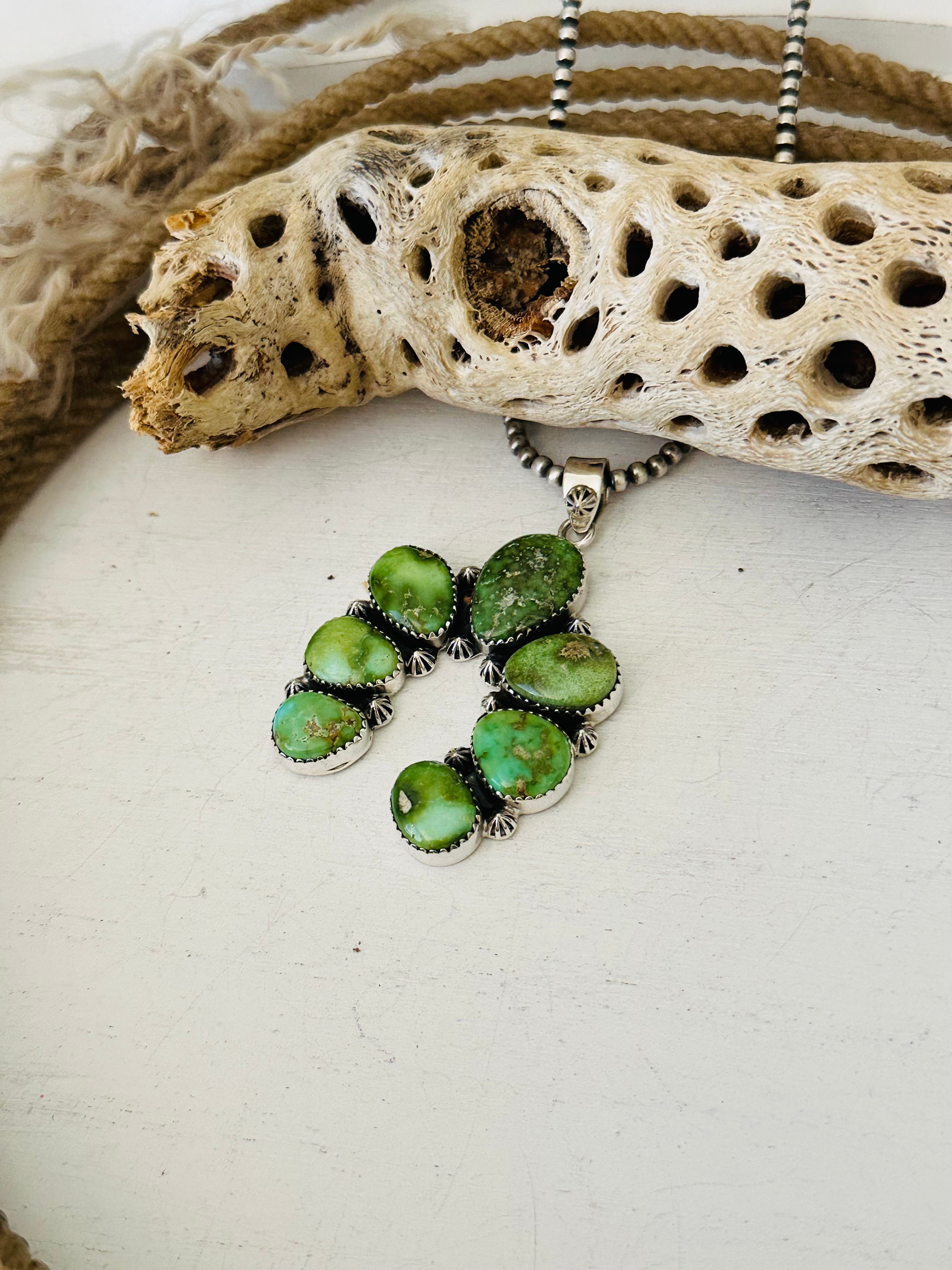 A beautiful pendant Southwest Handmade Sonoran Gold Turquoise & Sterling Silver Naja Pendant. It measures 2 3/8 inches long and 1 5/8 inches wide. Pendant Only. Signed by the artist and stamped sterling silver. Stones will differ due to natural stones.