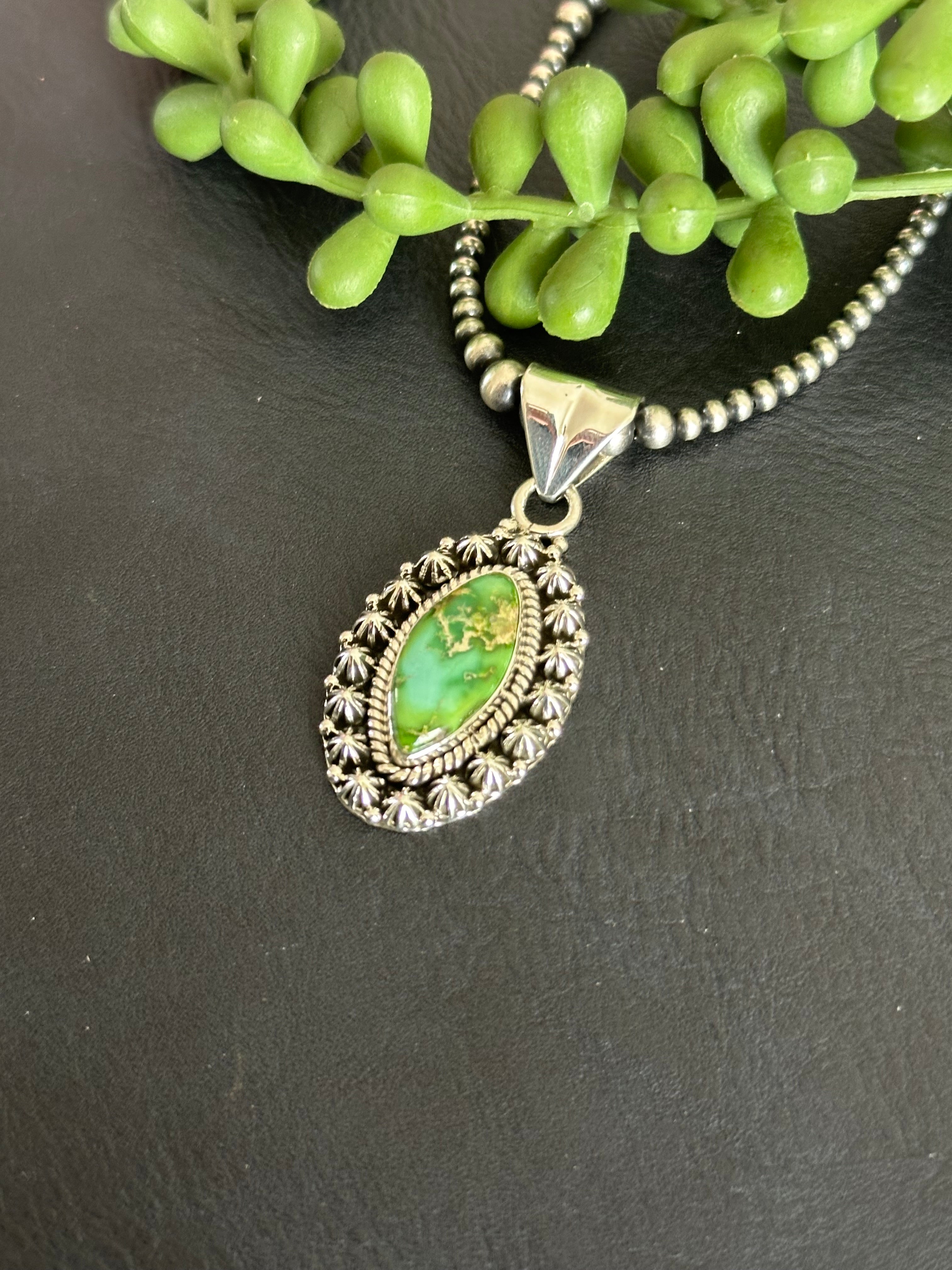 Beautiful craftsmanship. Southwest Handmade Sonoran Gold Turquoise & Sterling Silver Pendant. It measures 1 7/8 inches long and 7/8 of an inch wide. Pendant Only. Signed by the artist and stamped sterling silver.