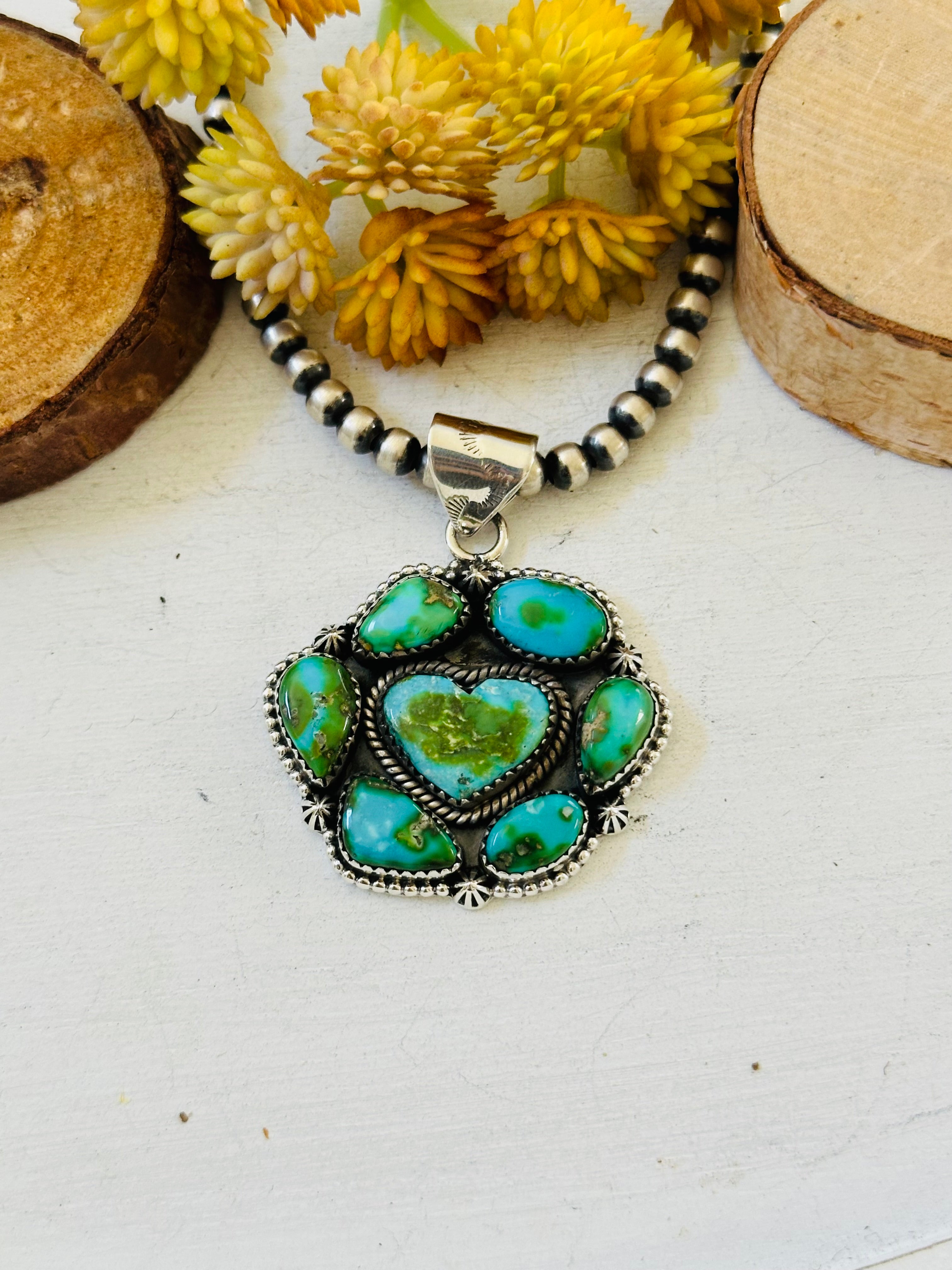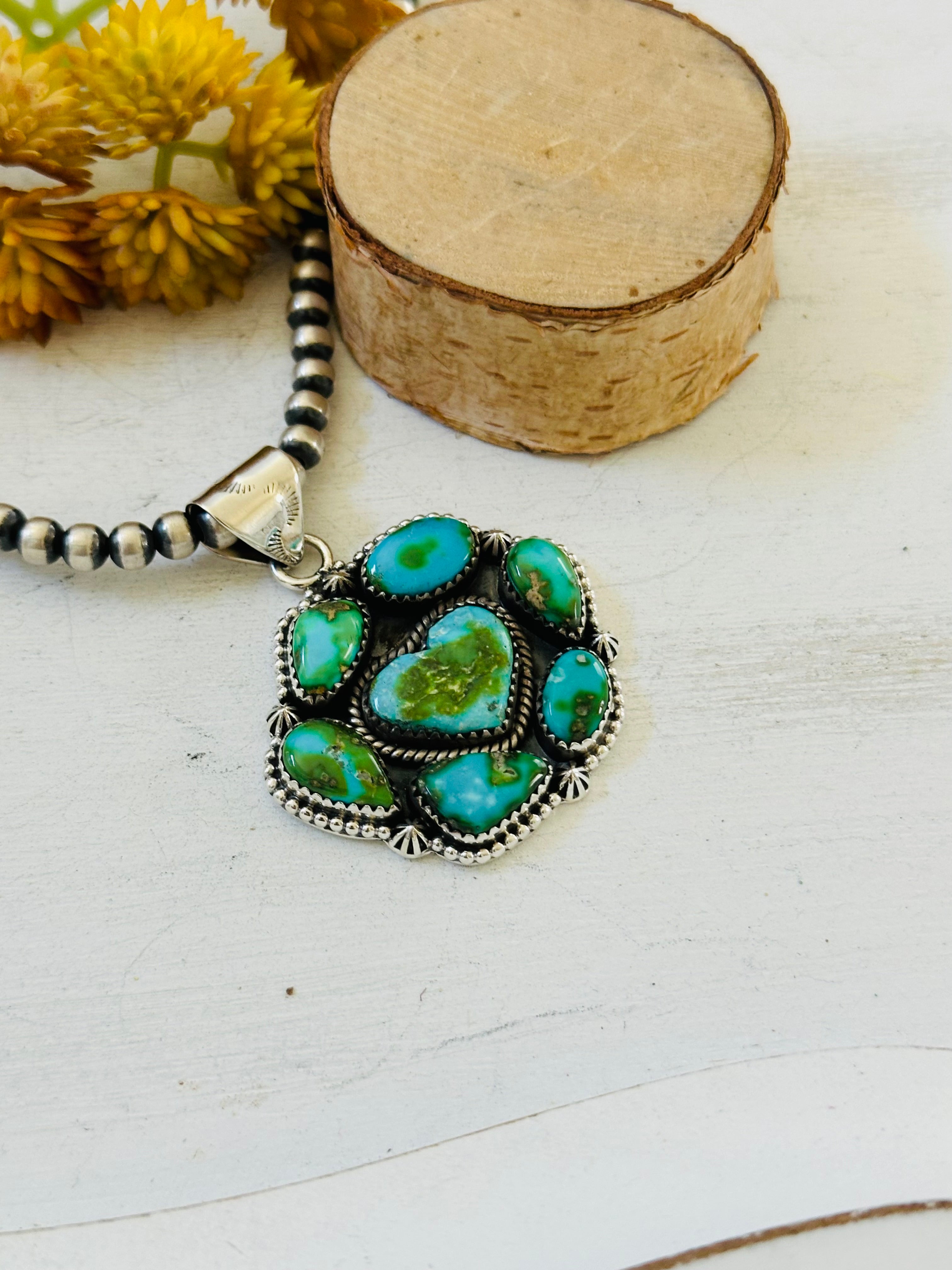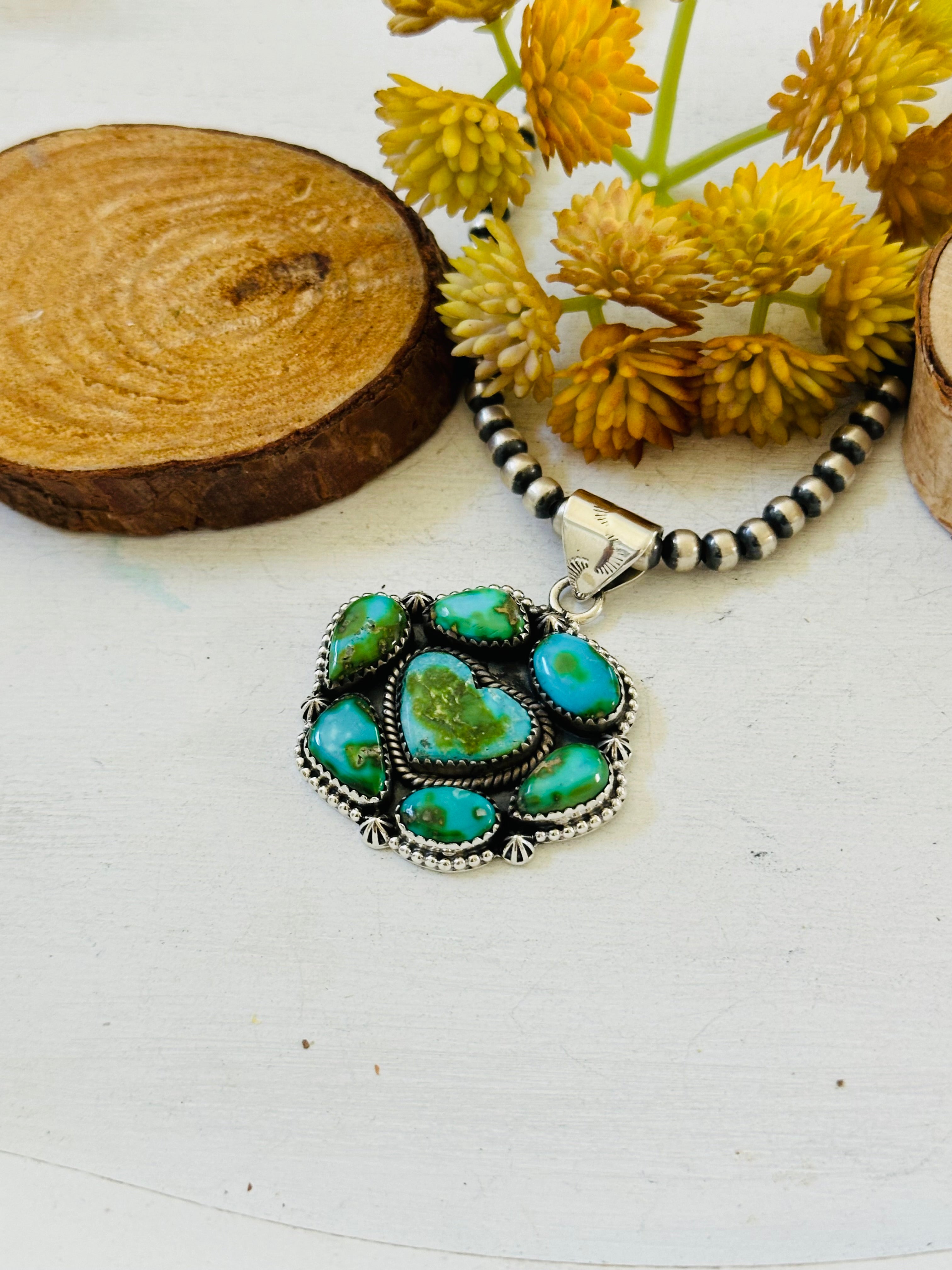 Beautiful craftsmanship. Southwest Handmade Sonoran Mountain Turquoise & Sterling Silver Cluster Pendant. It measures 2 inches long and 1 5/8 inches wide. Pendant Only. Signed by the artist and stamped sterling silver.