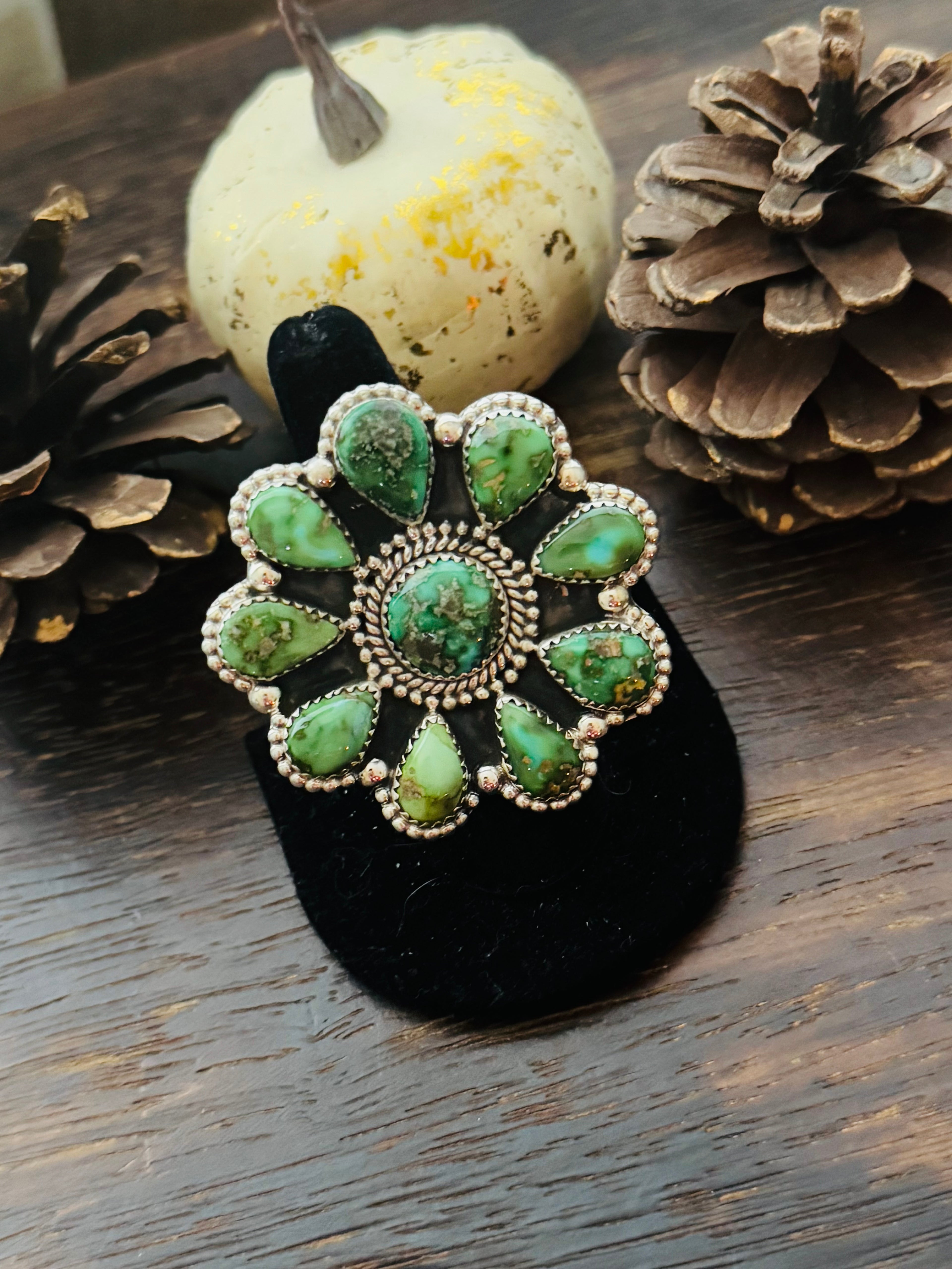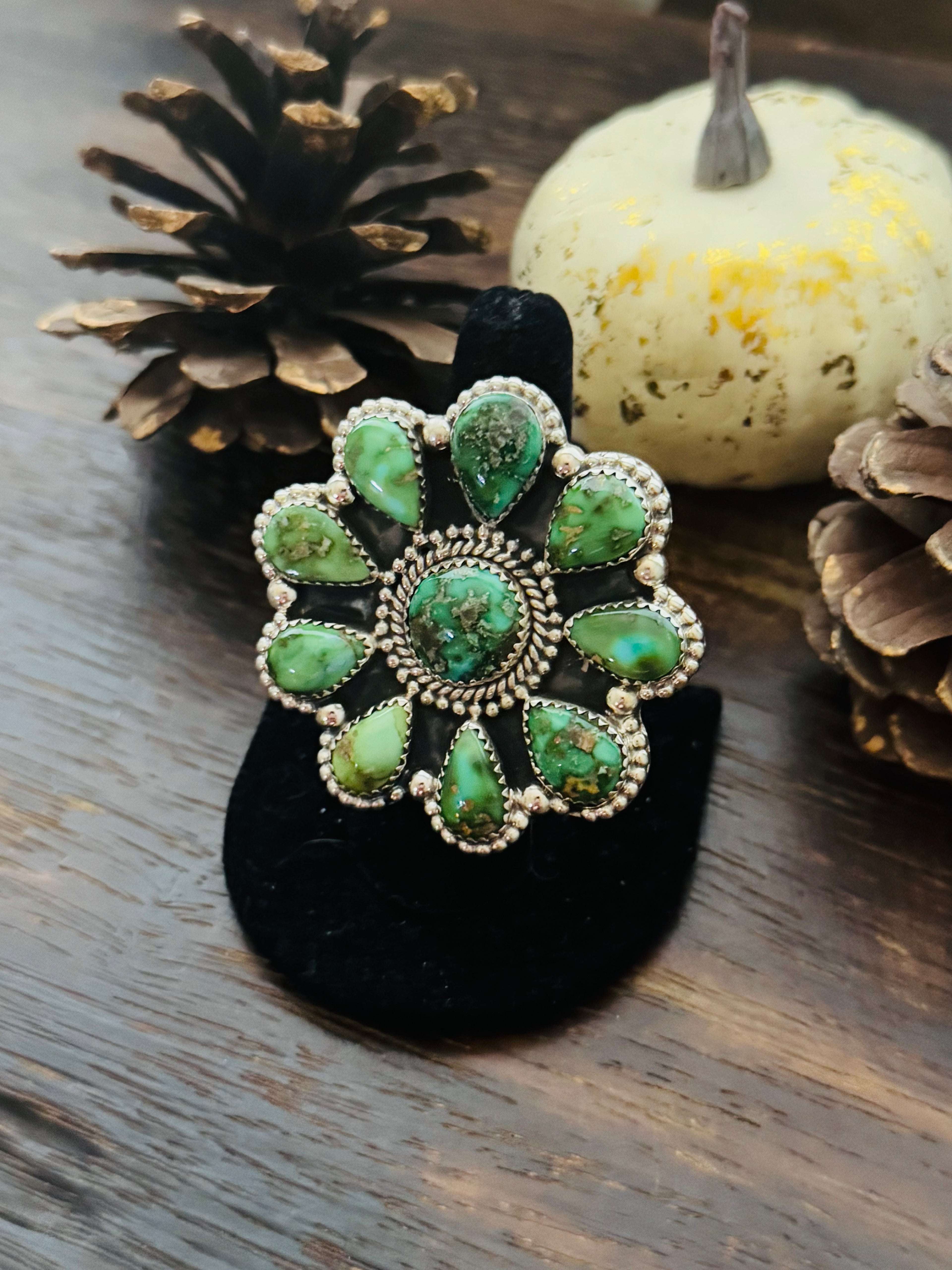 Beautiful ring. Southwest Handmade Sonoran Mountain Turquoise & Sterling Silver Adjustable Cluster Ring. It measures 2 inches long and 2 inches wide. Signed by the artist and stamped sterling silver.