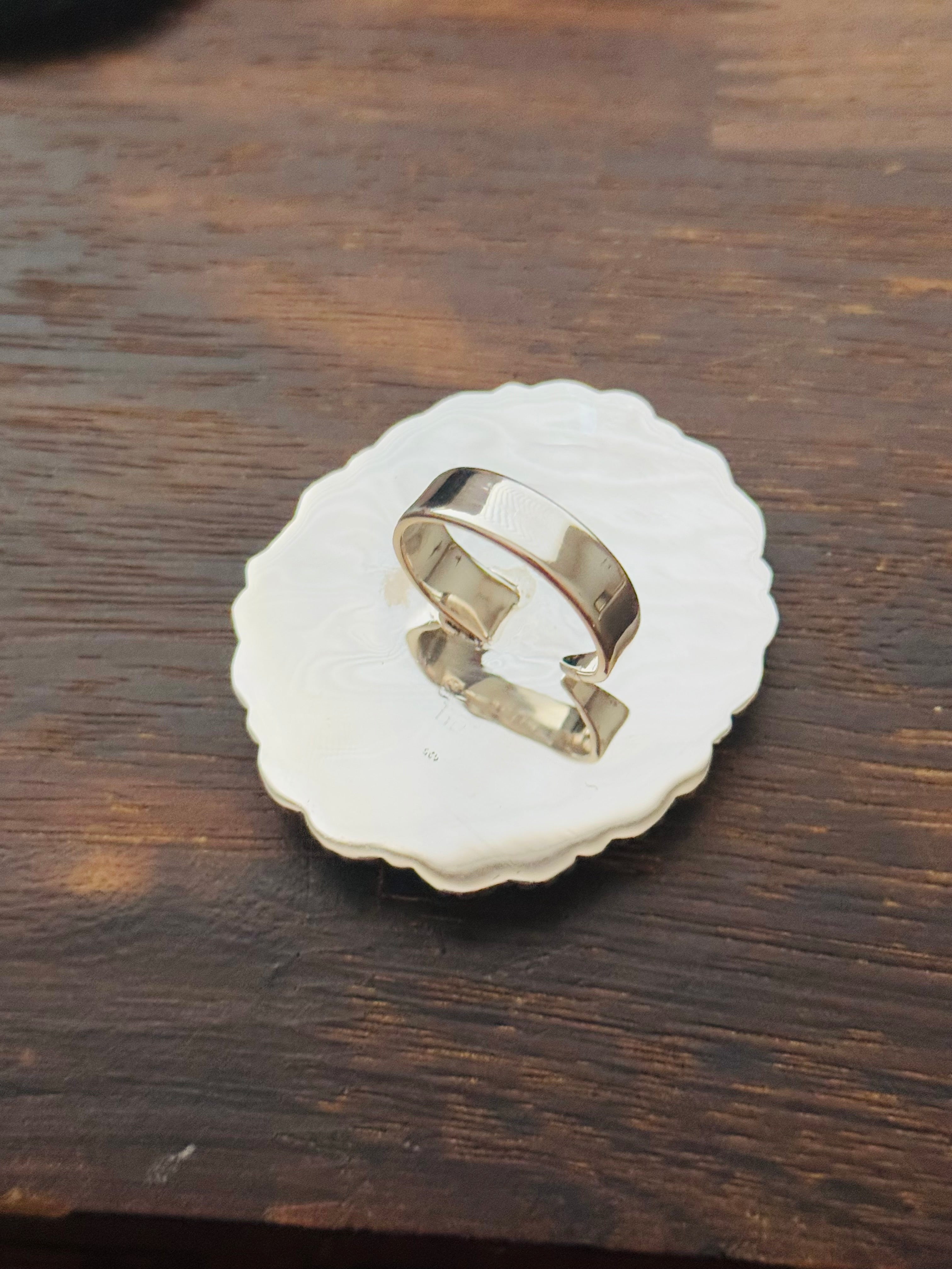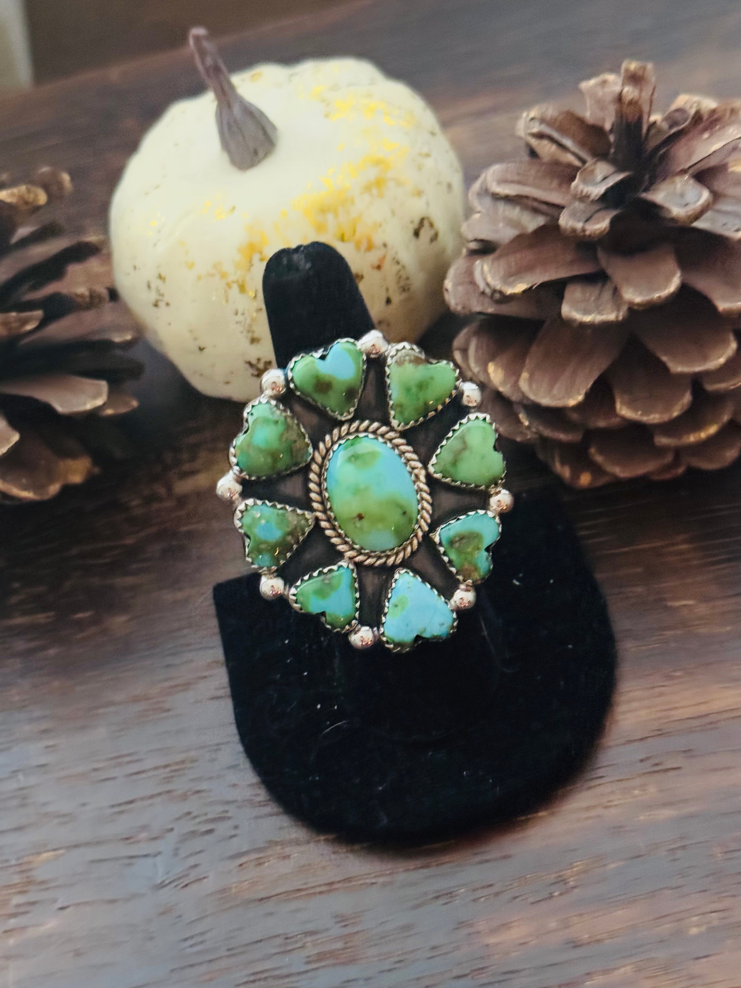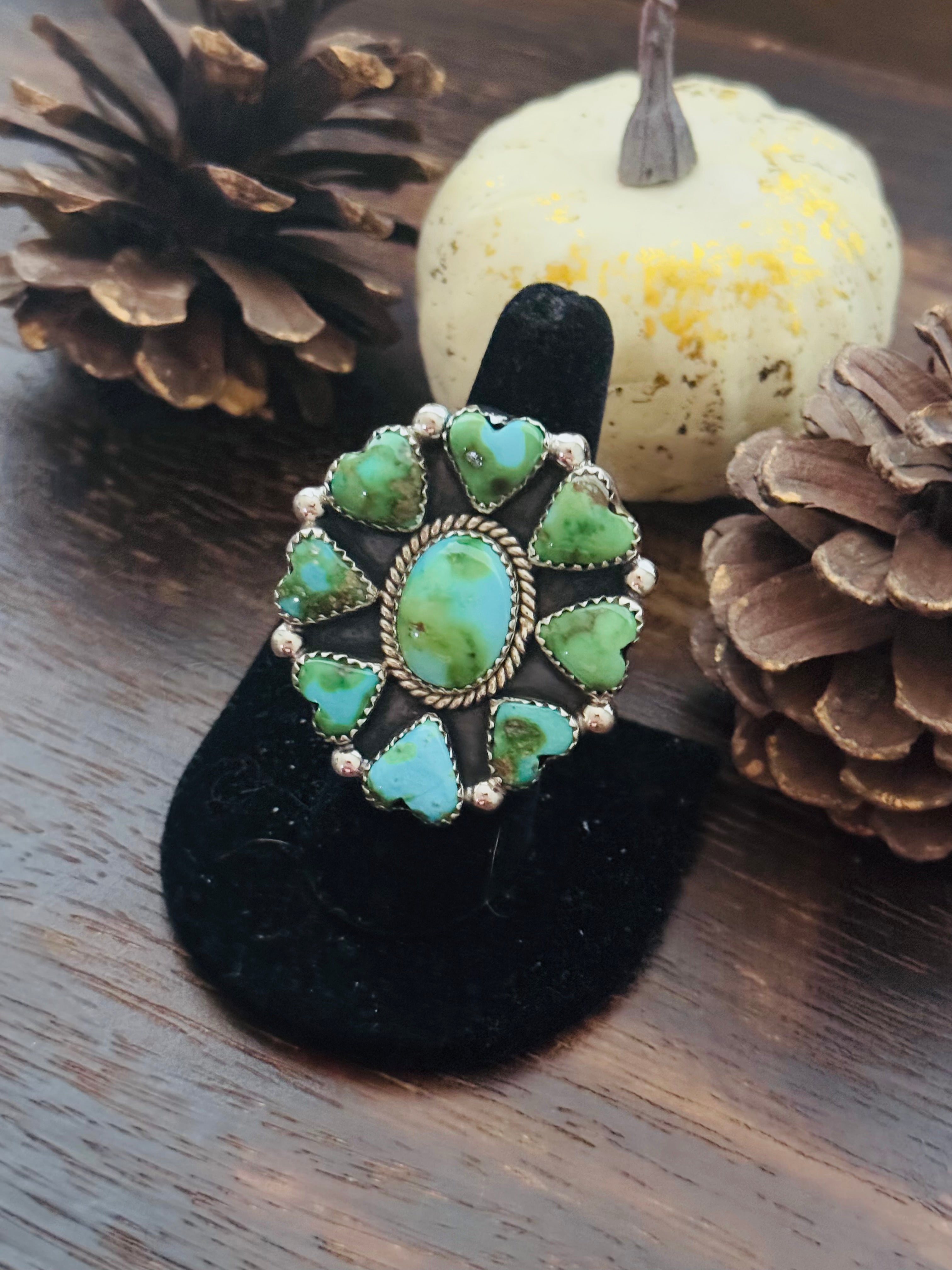 Beautiful ring. Southwest Handmade Sonoran Mountain Turquoise & Sterling Silver Adjustable Cluster Ring. It measures 1 5/8 inches long and 1 1/2 inches wide. Signed by the artist and stamped sterling silver.