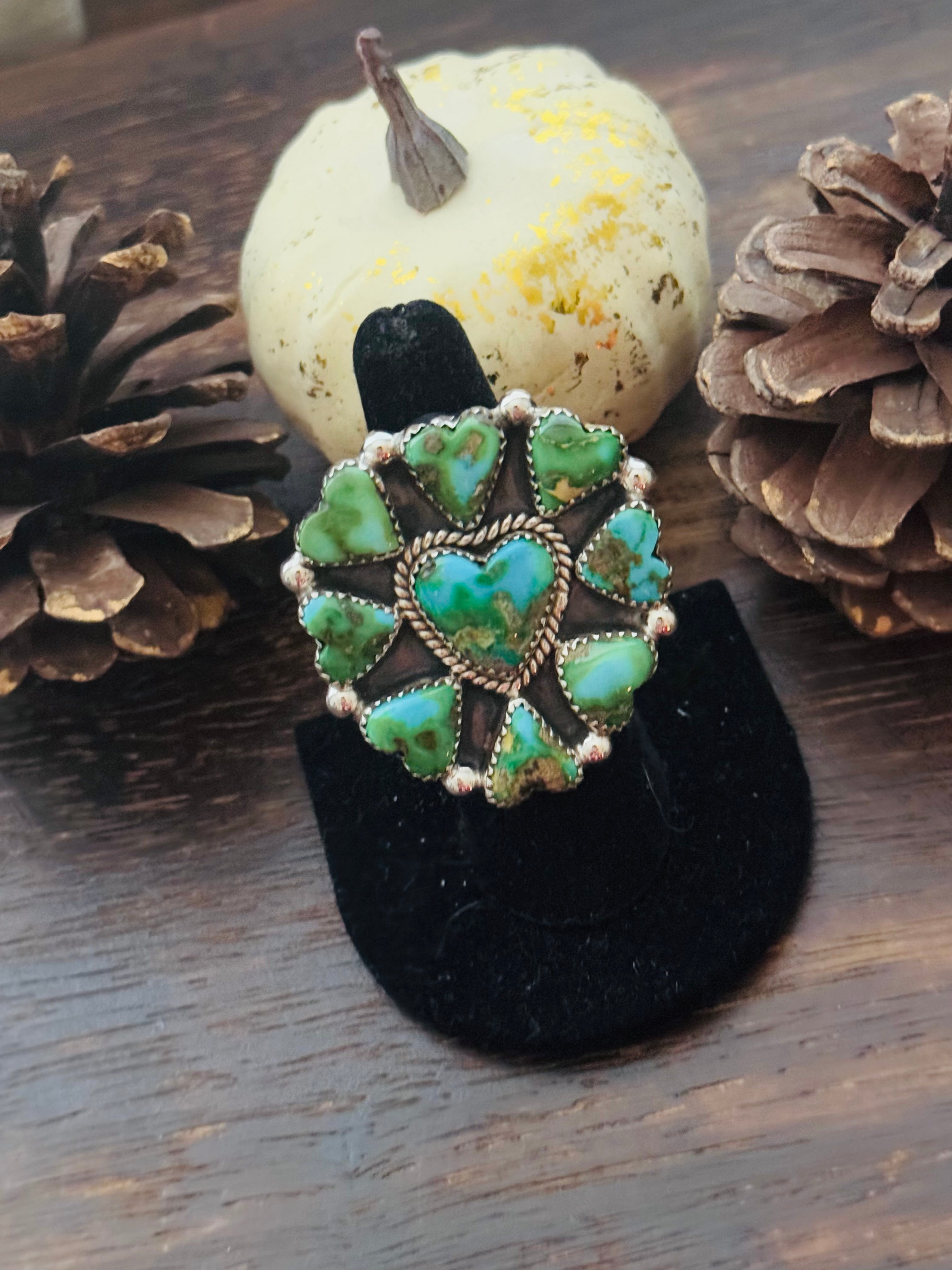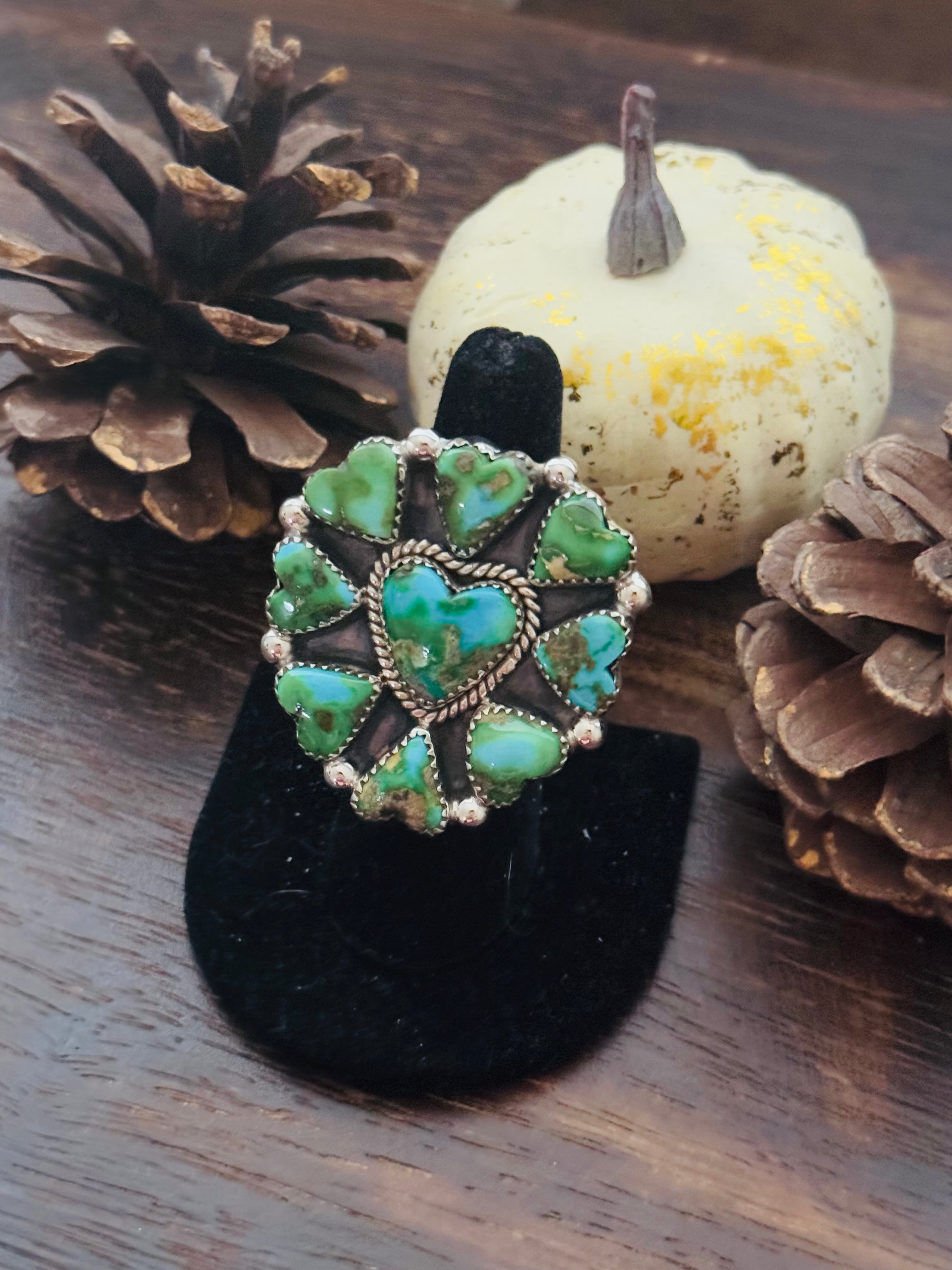 Beautiful ring. Southwest Handmade Sonoran Mountain Turquoise & Sterling Silver Adjustable Cluster Ring. It measures 1 3/4 inches long and 1 1/2 inches wide. Signed by the artist and stamped sterling silver.
