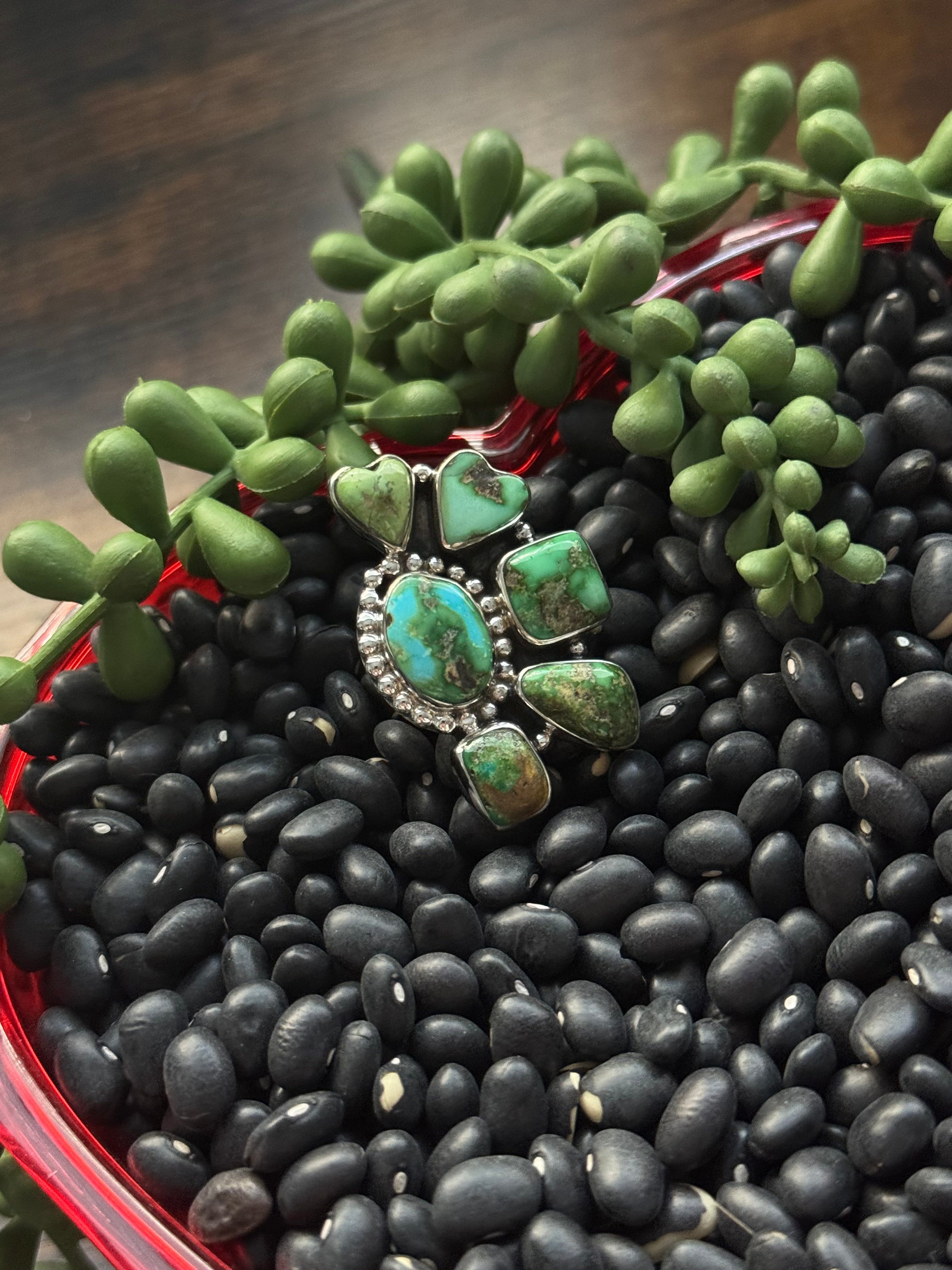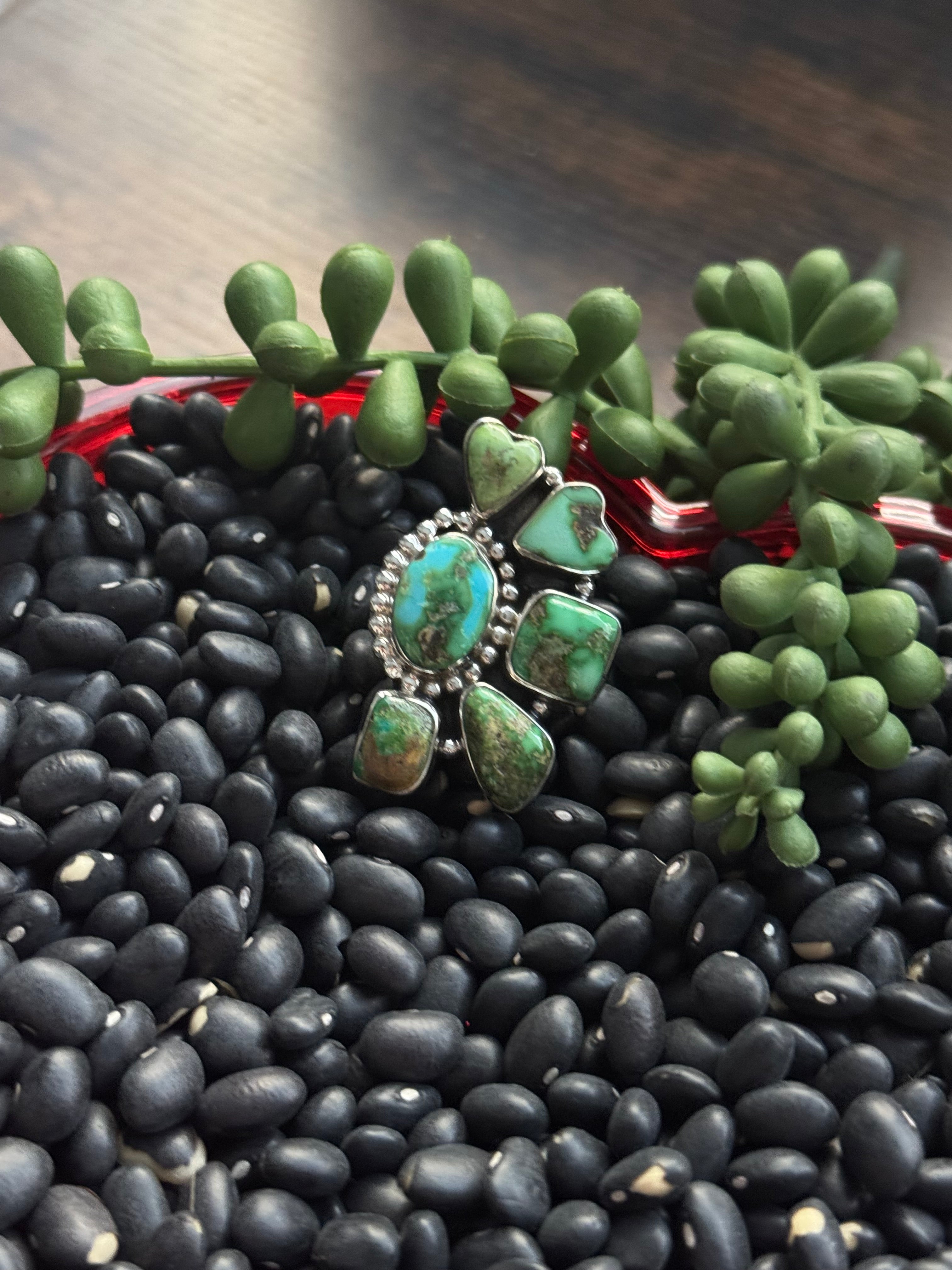 Beautiful ring. Southwest Handmade Sonoran Mountain Turquoise & Sterling Silver Adjustable Cluster Ring. It measures 1 1/2 inches long and 1 inch wide. Signed by the artist and stamped sterling silver.