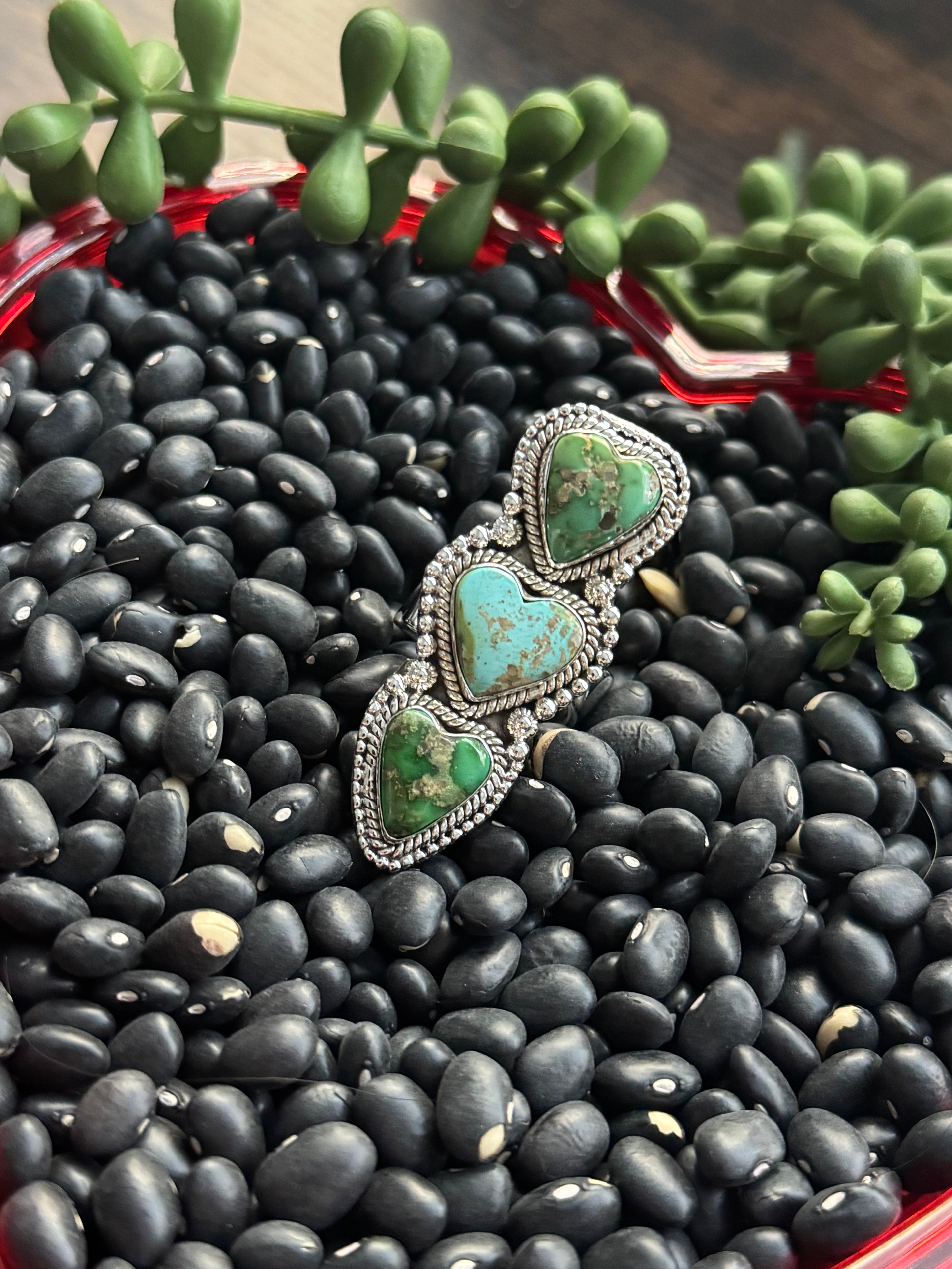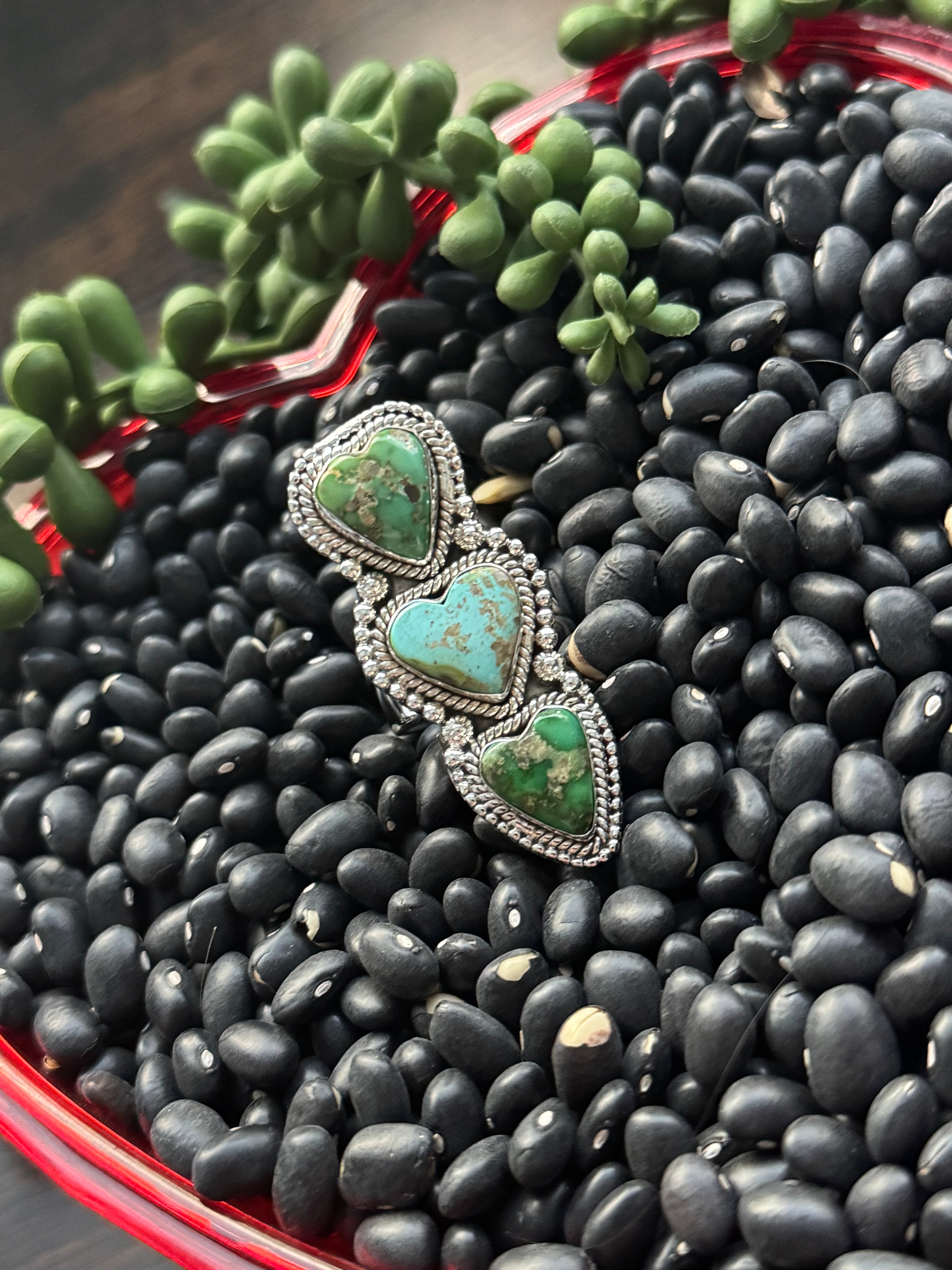 Beautiful ring. Southwest Handmade Sonoran Mountain Turquoise & Sterling Silver Adjustable Cluster Triple Heart Ring. It measures just under 2 inches long and just over 3/4 of an inches wide. Signed by the artist and stamped sterling silver.
