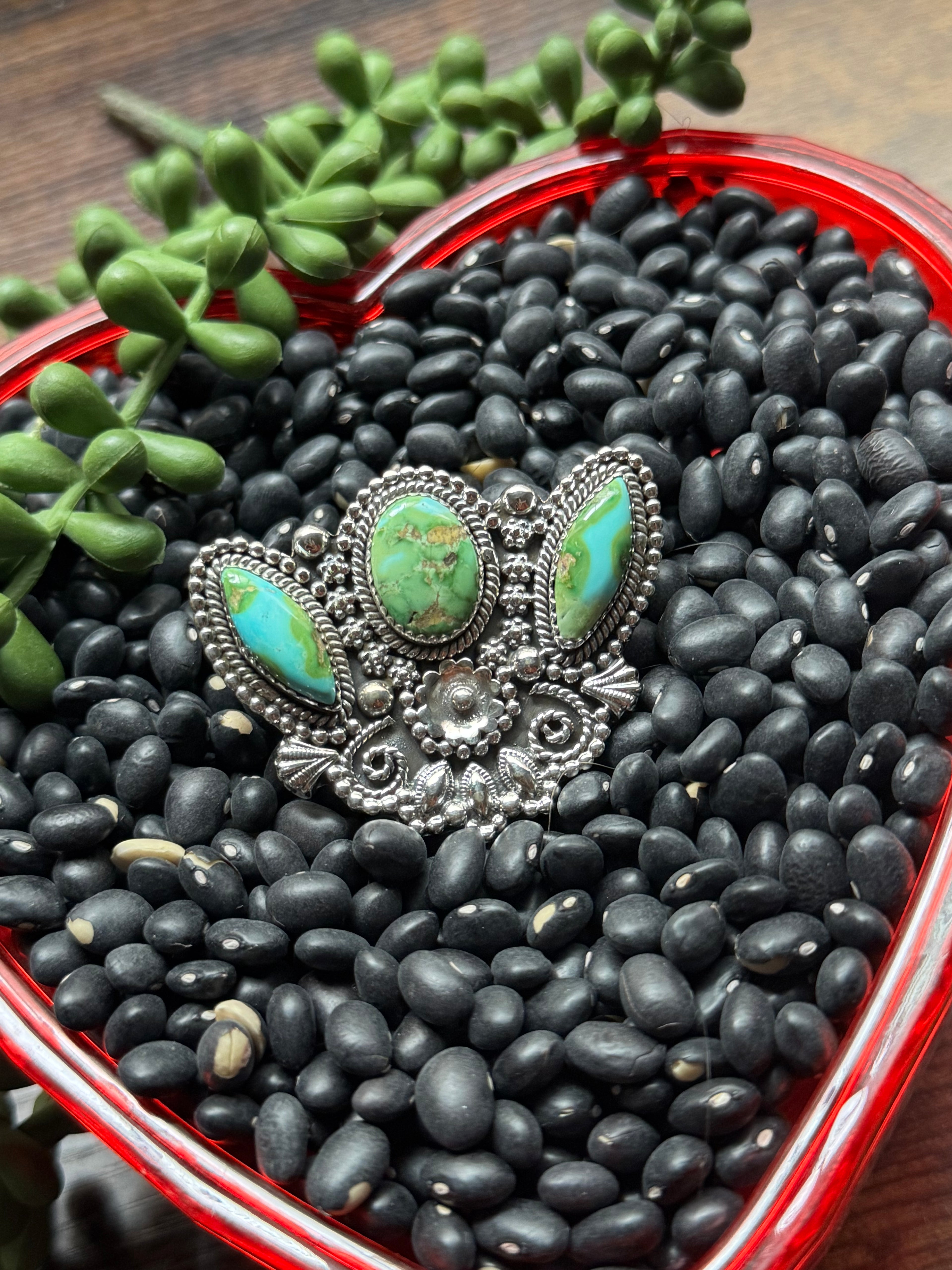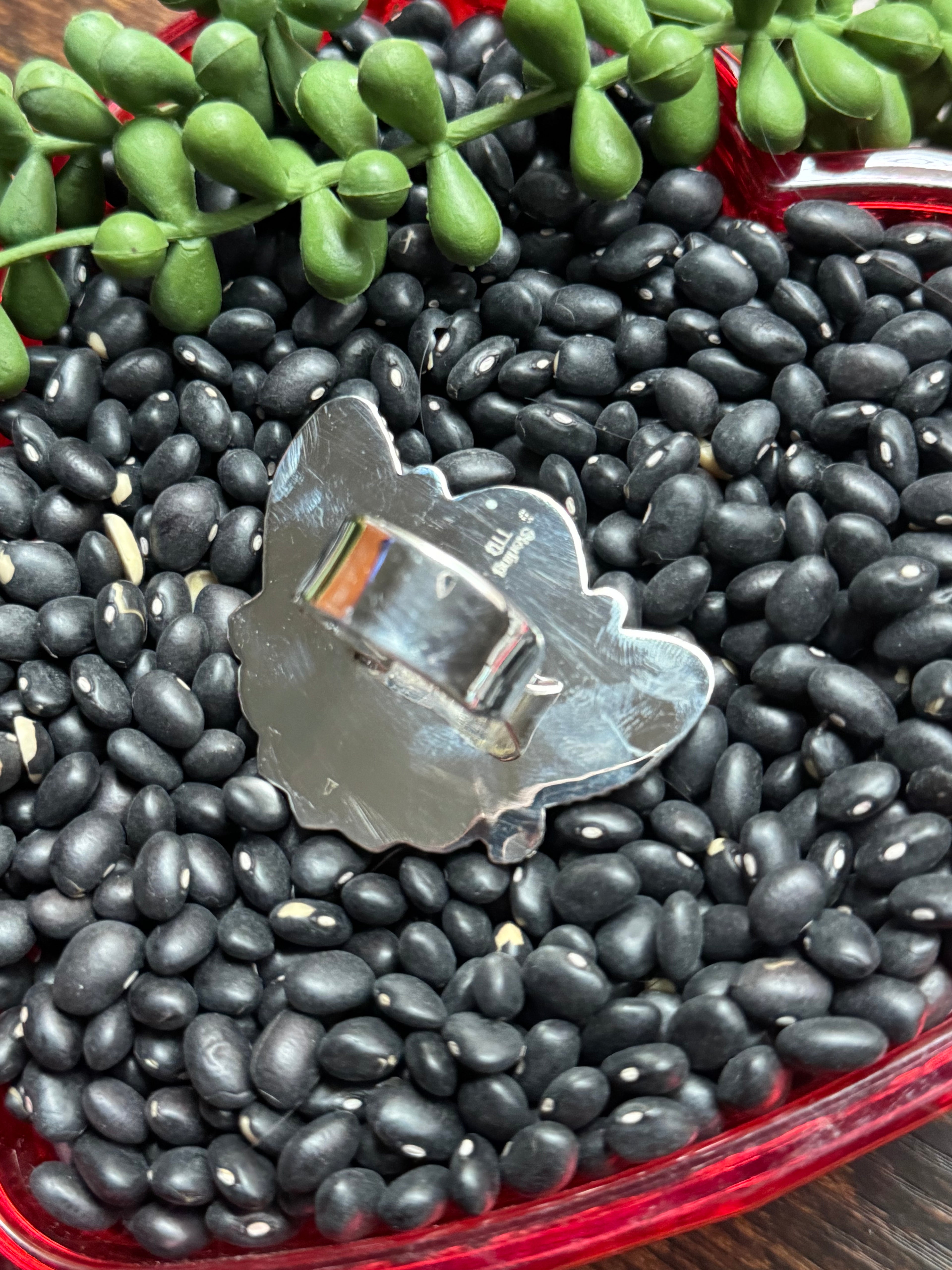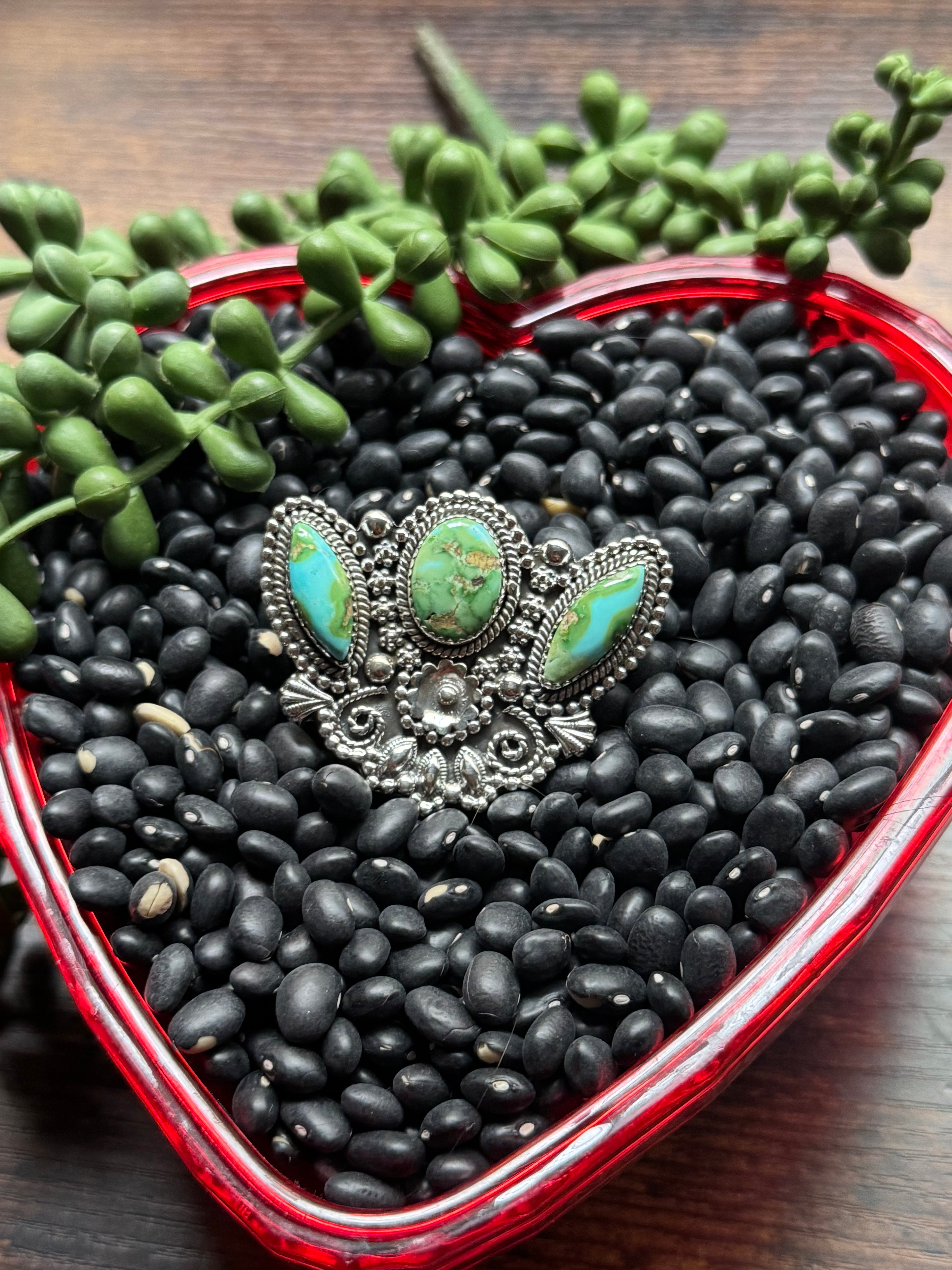 Beautiful ring. Southwest Handmade Sonoran Mountain Turquoise & Sterling Silver Adjustable Cluster Ring. It measures just under 1 3/4 inches long and just under 2 1/8 inches wide. Signed by the artist and stamped sterling silver.