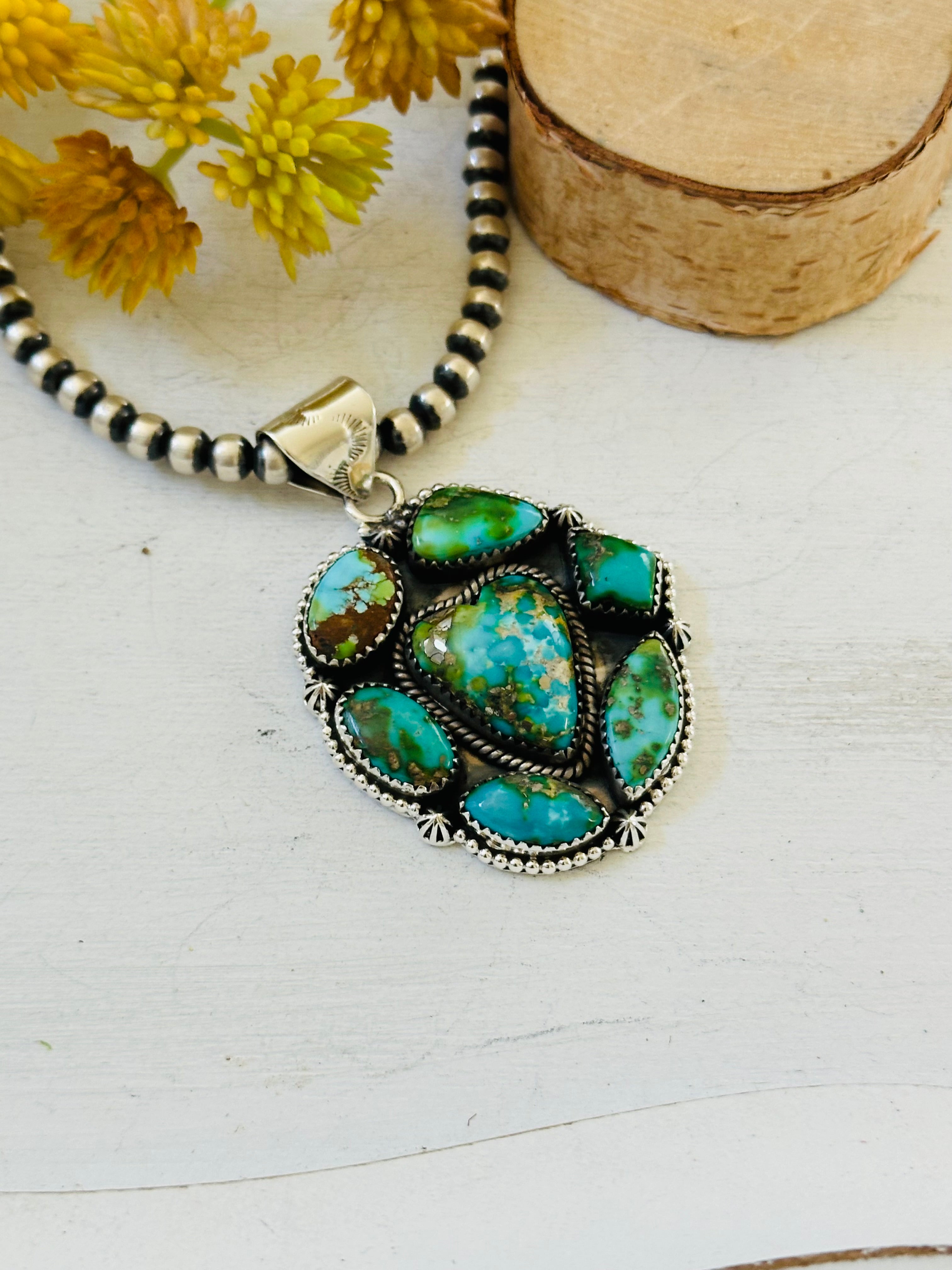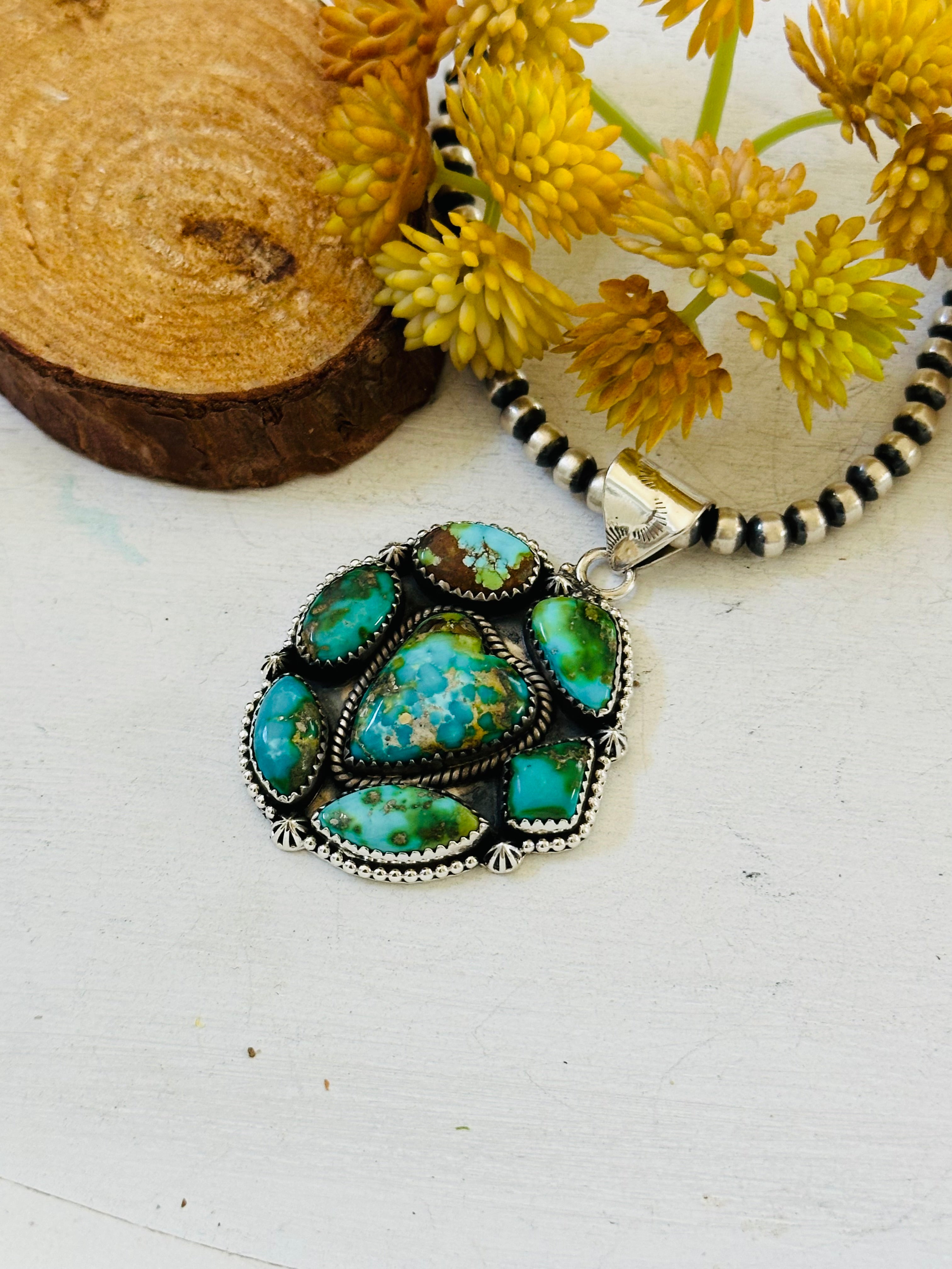 Beautiful craftsmanship. Southwest Handmade Sonoran Mountain Turquoise & Sterling Silver Cluster Pendant. It measures 2 1/2 inches long and 1 5/8 inches wide. Pendant Only. Signed by the artist and stamped sterling silver.