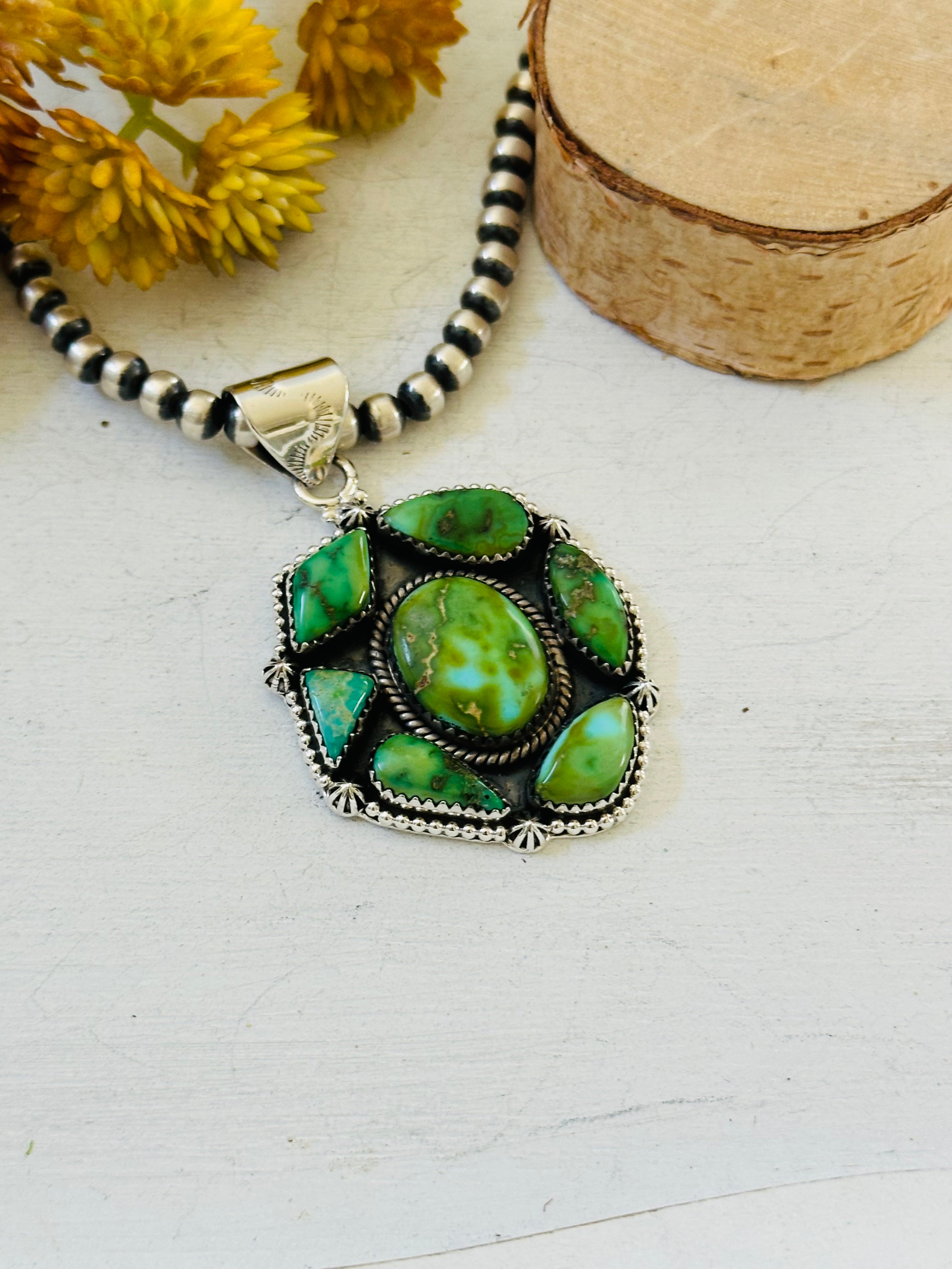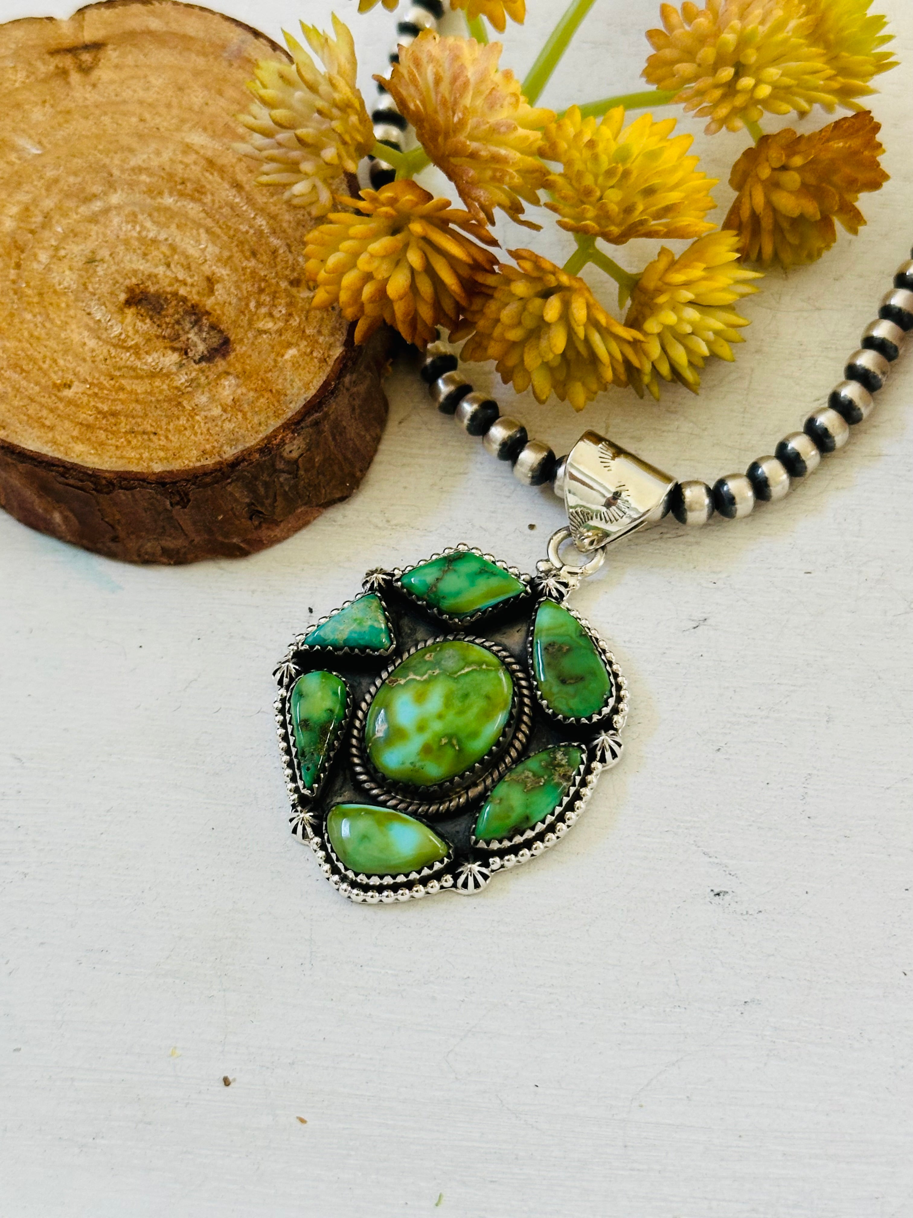Beautiful craftsmanship. Southwest Handmade Sonoran Mountain Turquoise & Sterling Silver Cluster Pendant. It measures 2 3/8 inches long and 1 1/2 inches wide. Pendant Only. Signed by the artist and stamped sterling silver.