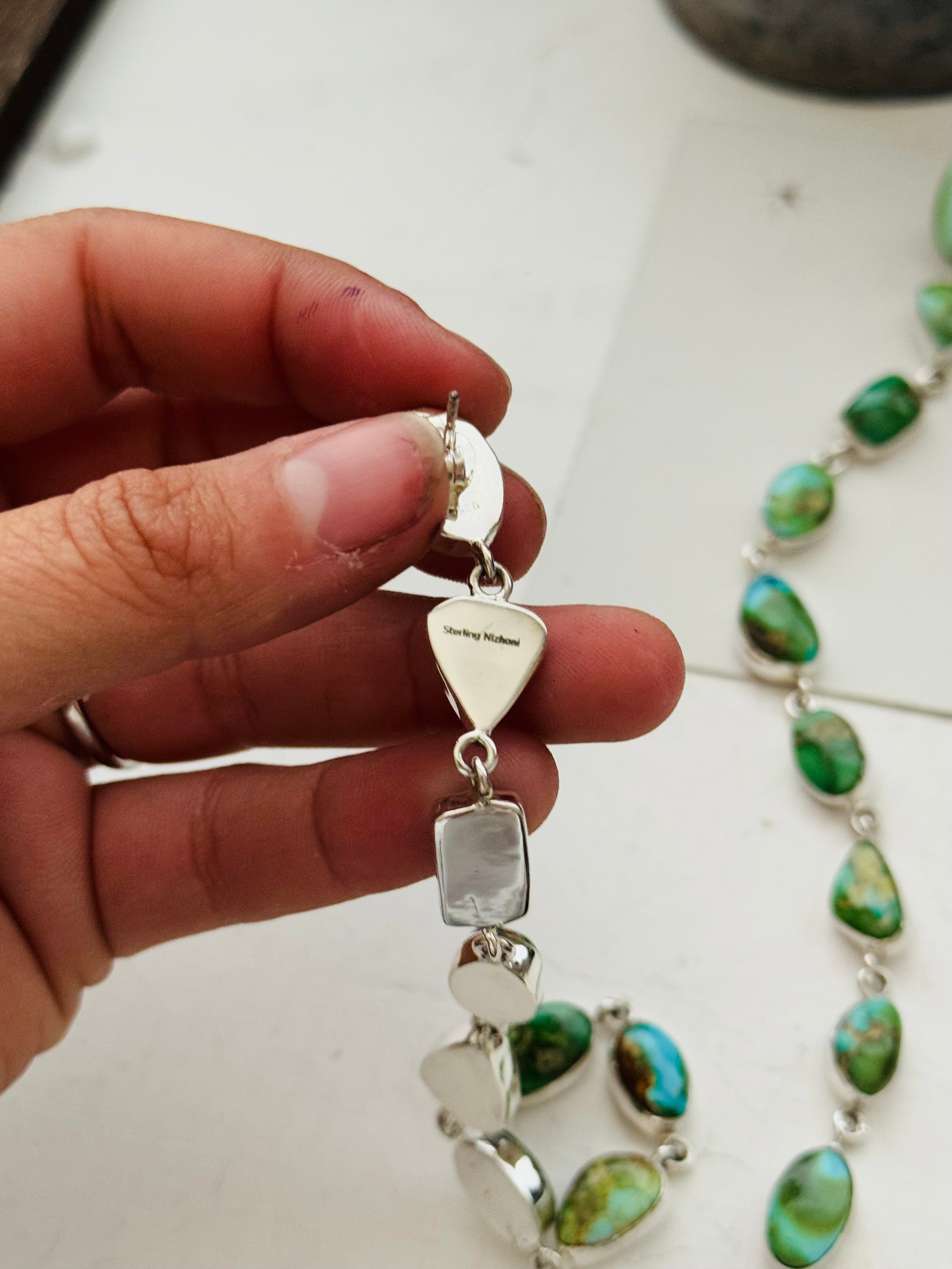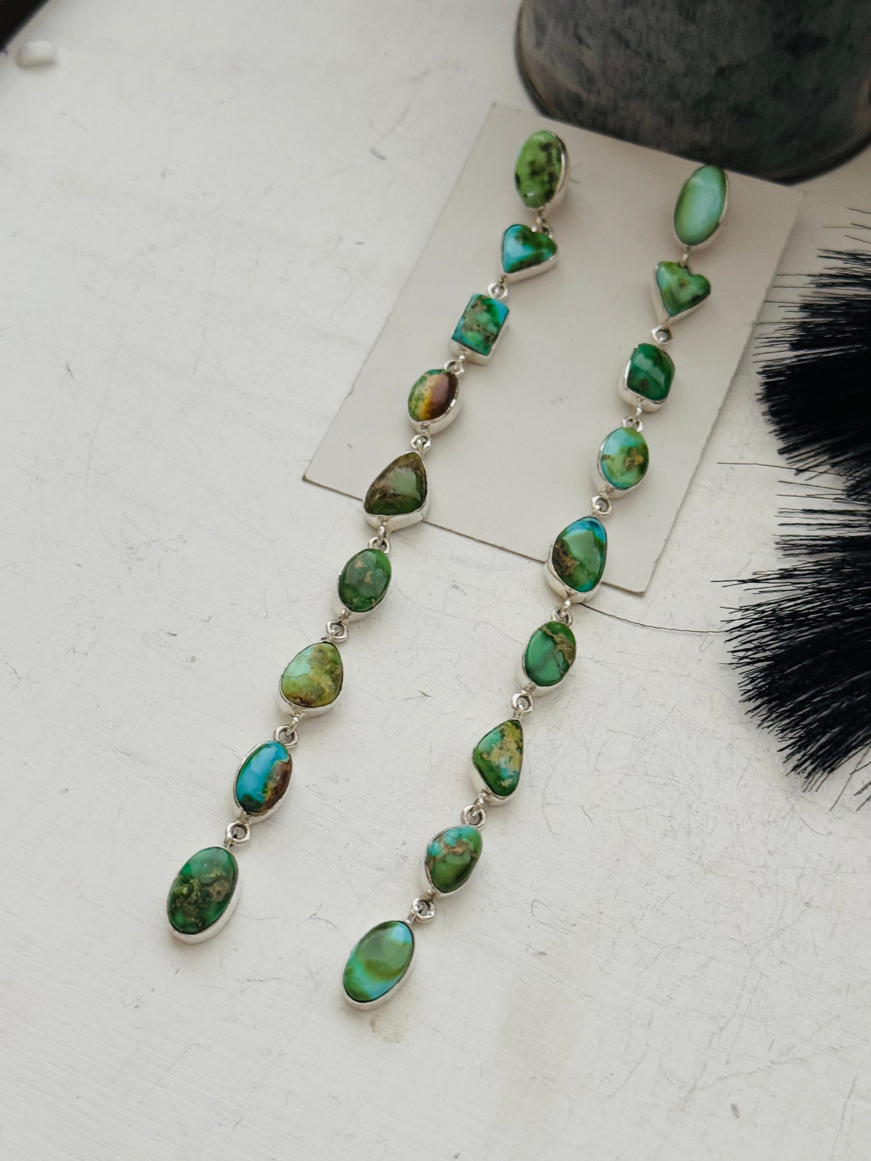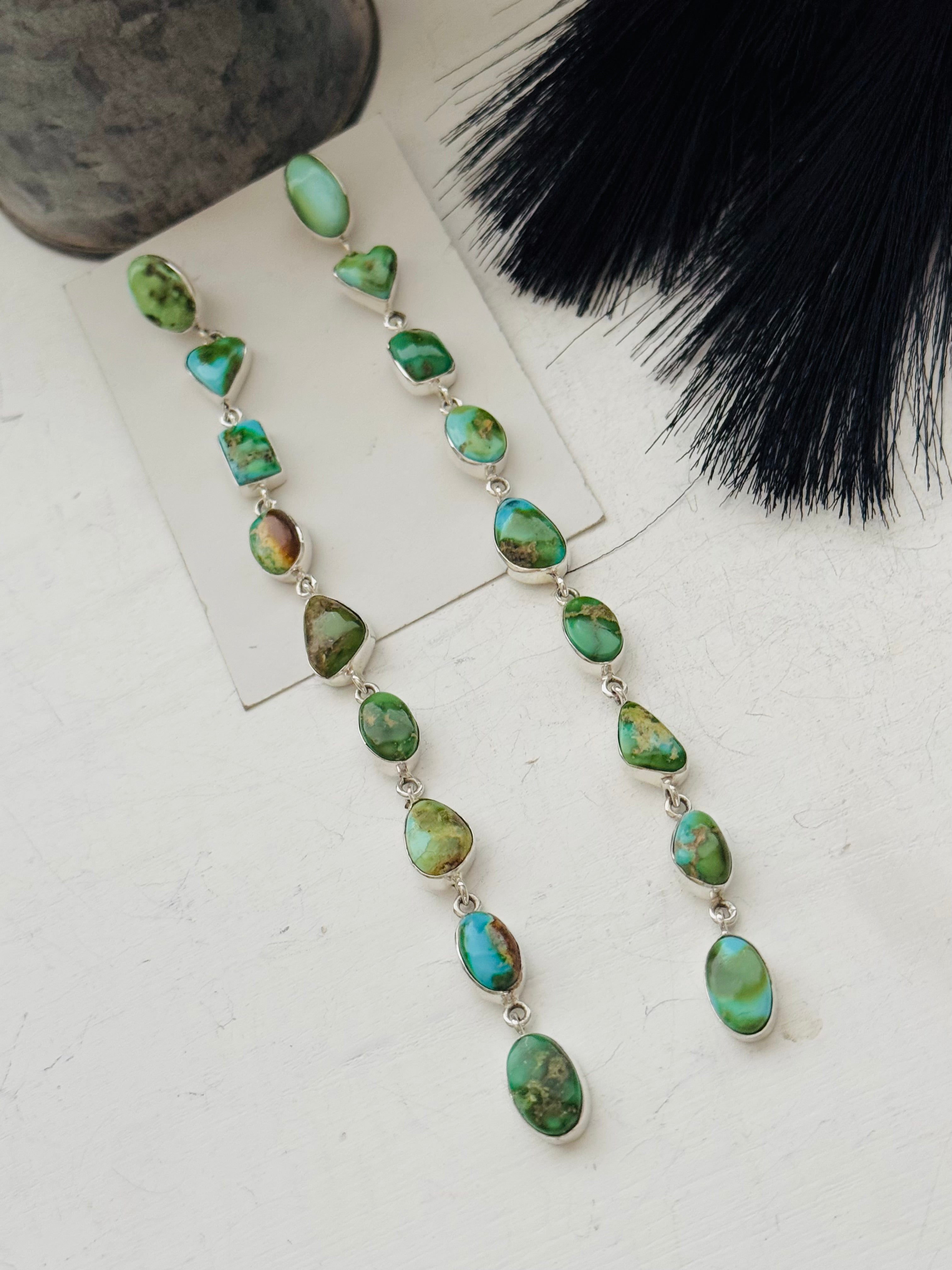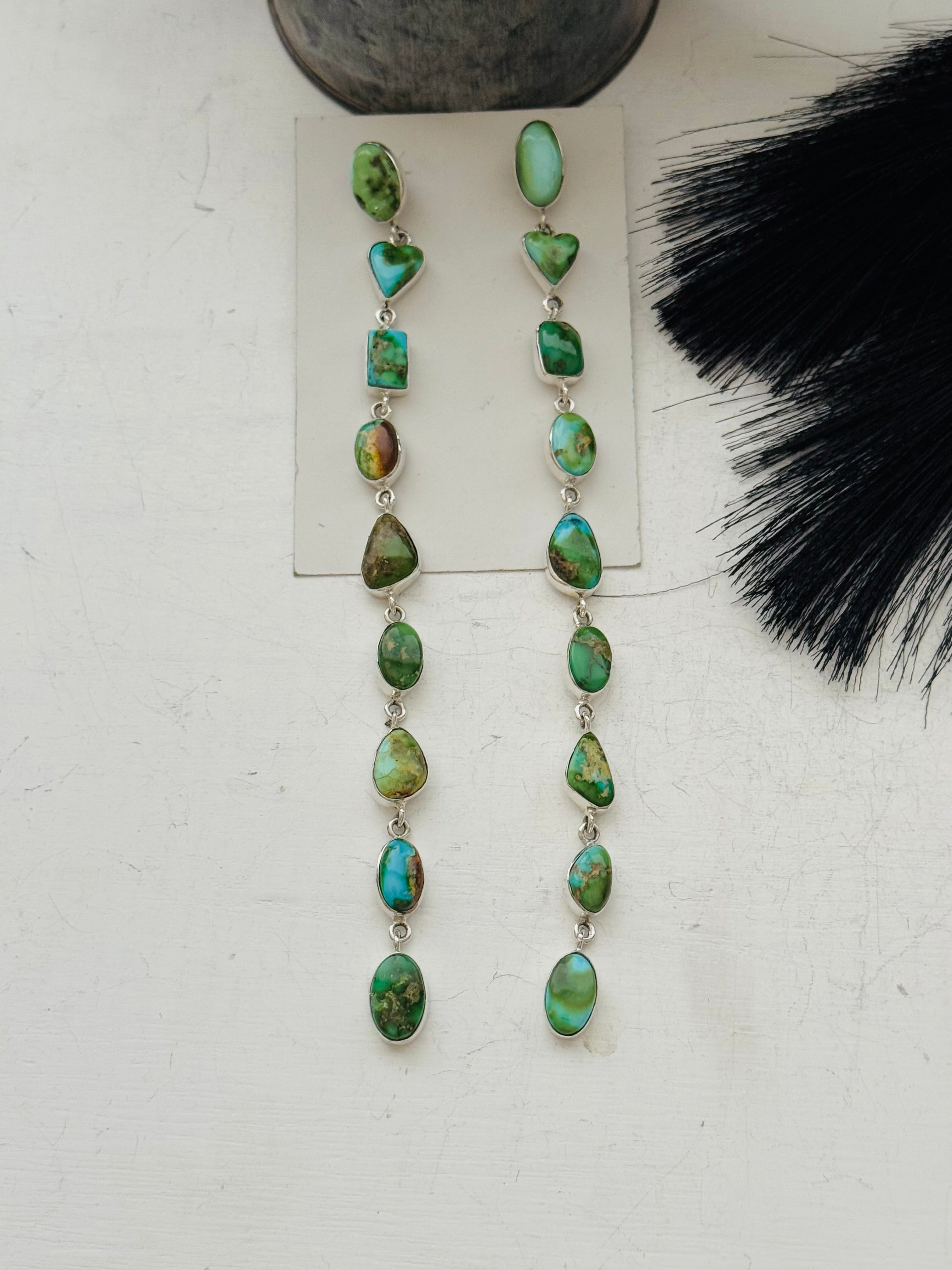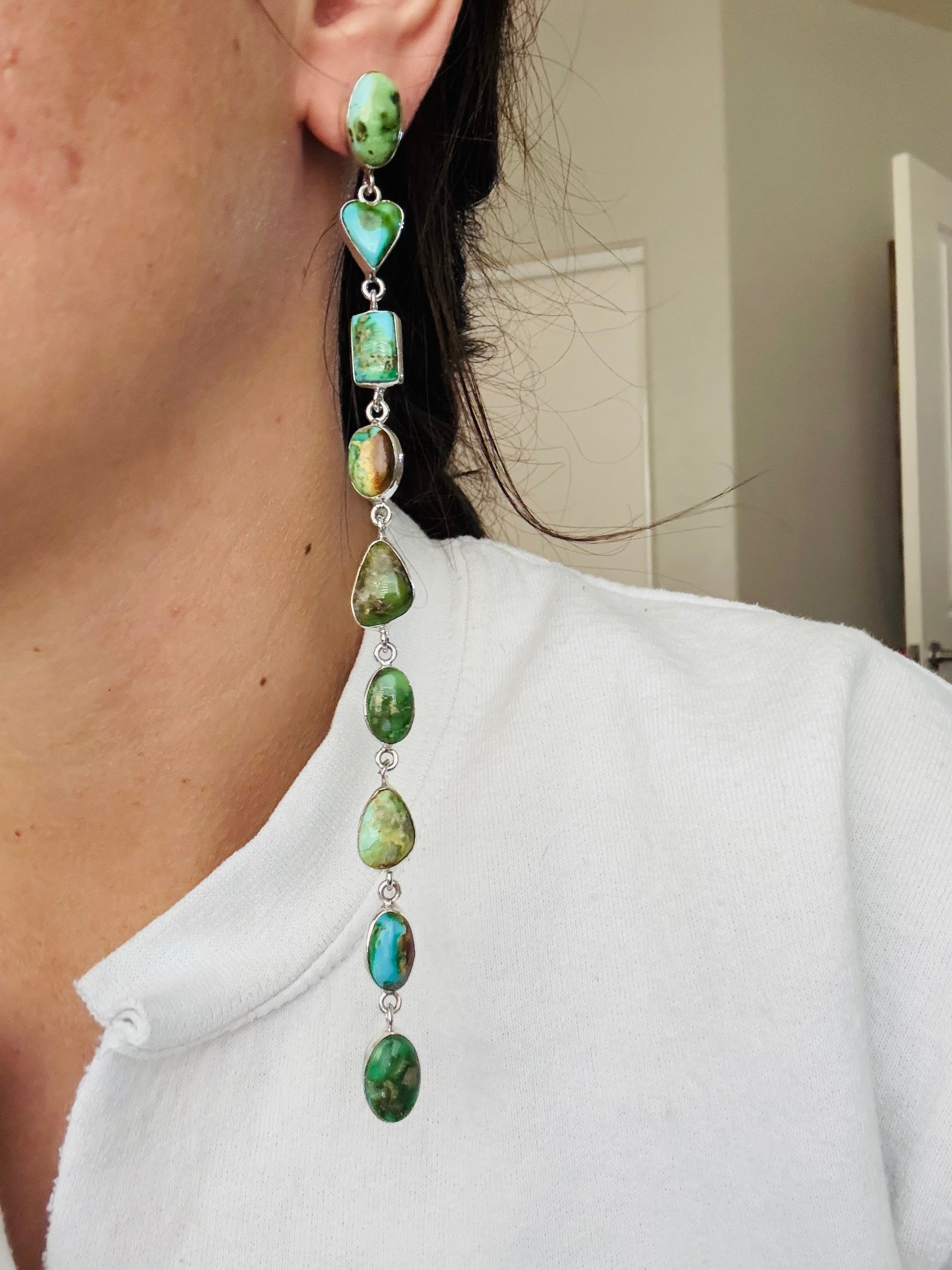 Breathtaking earrings. Southwest Handmade Sonoran Mountain Turquoise & Sterling Silver Post Dangle Earrings. It measures 6 5/8 inches long and 3/8 of an inch wide. Signed by the artist and stamped sterling silver.