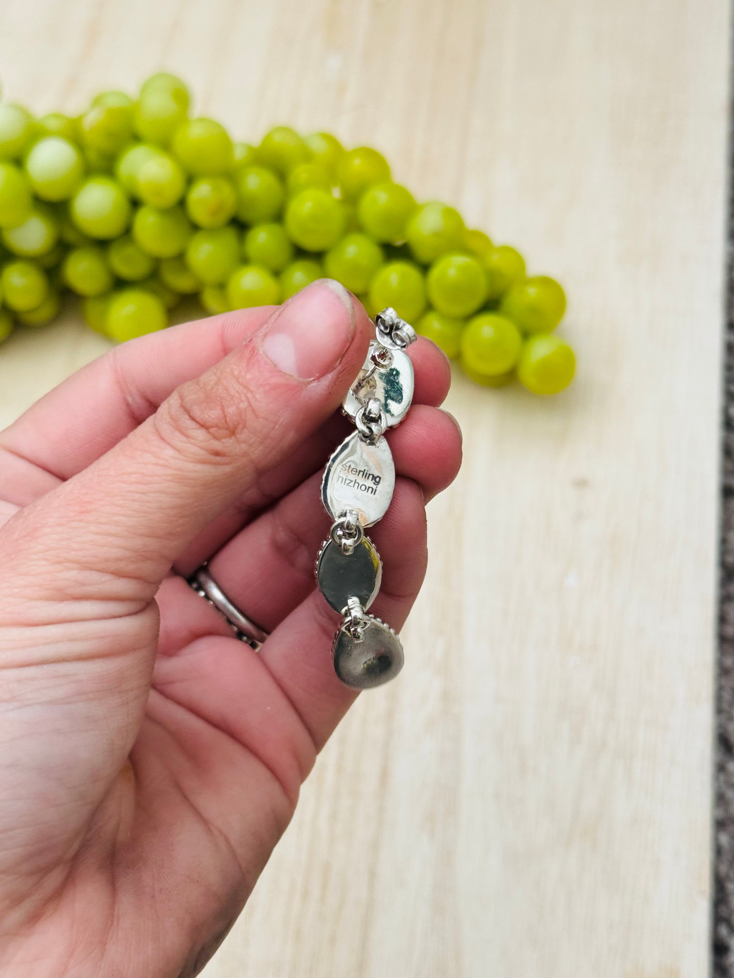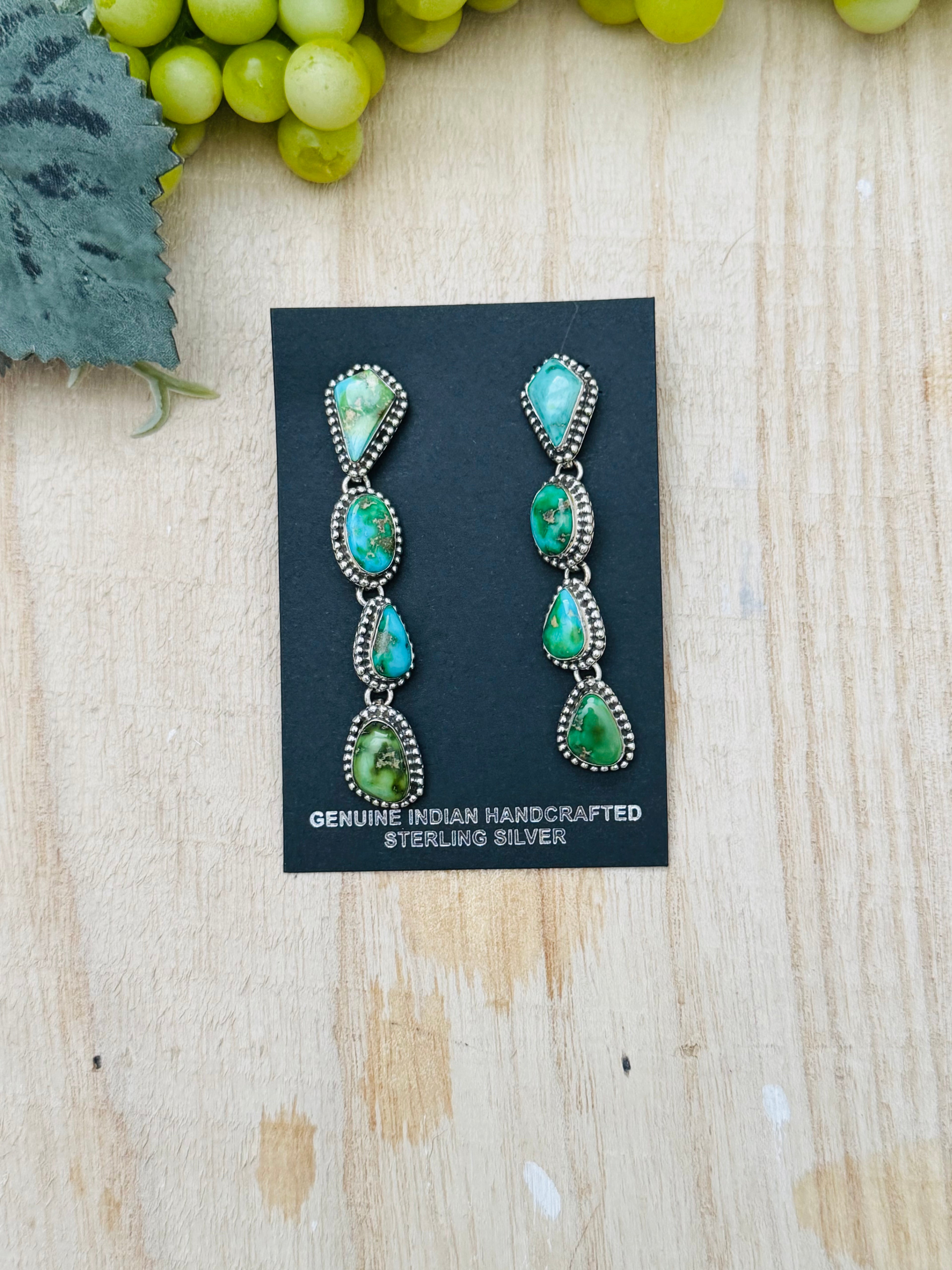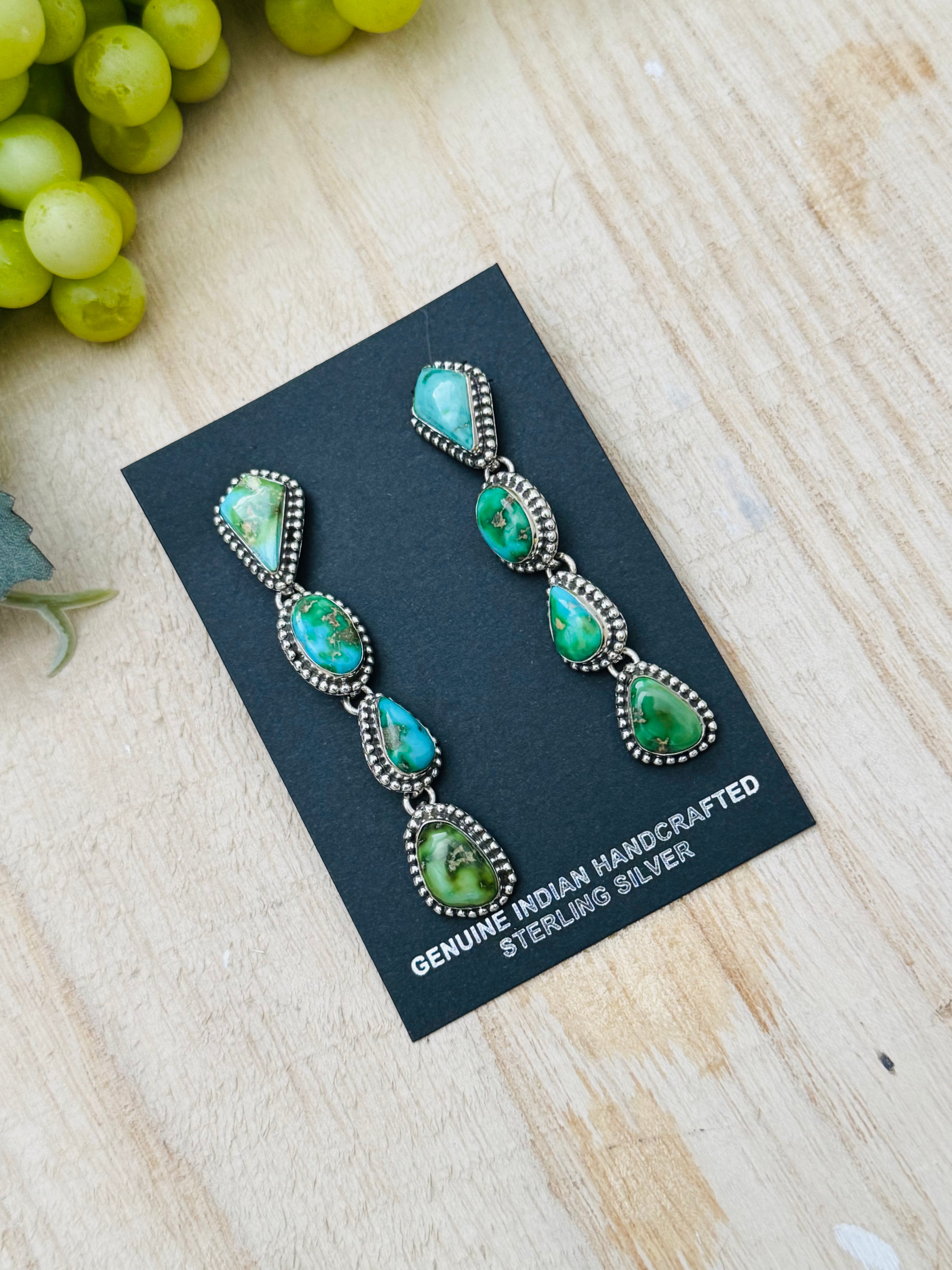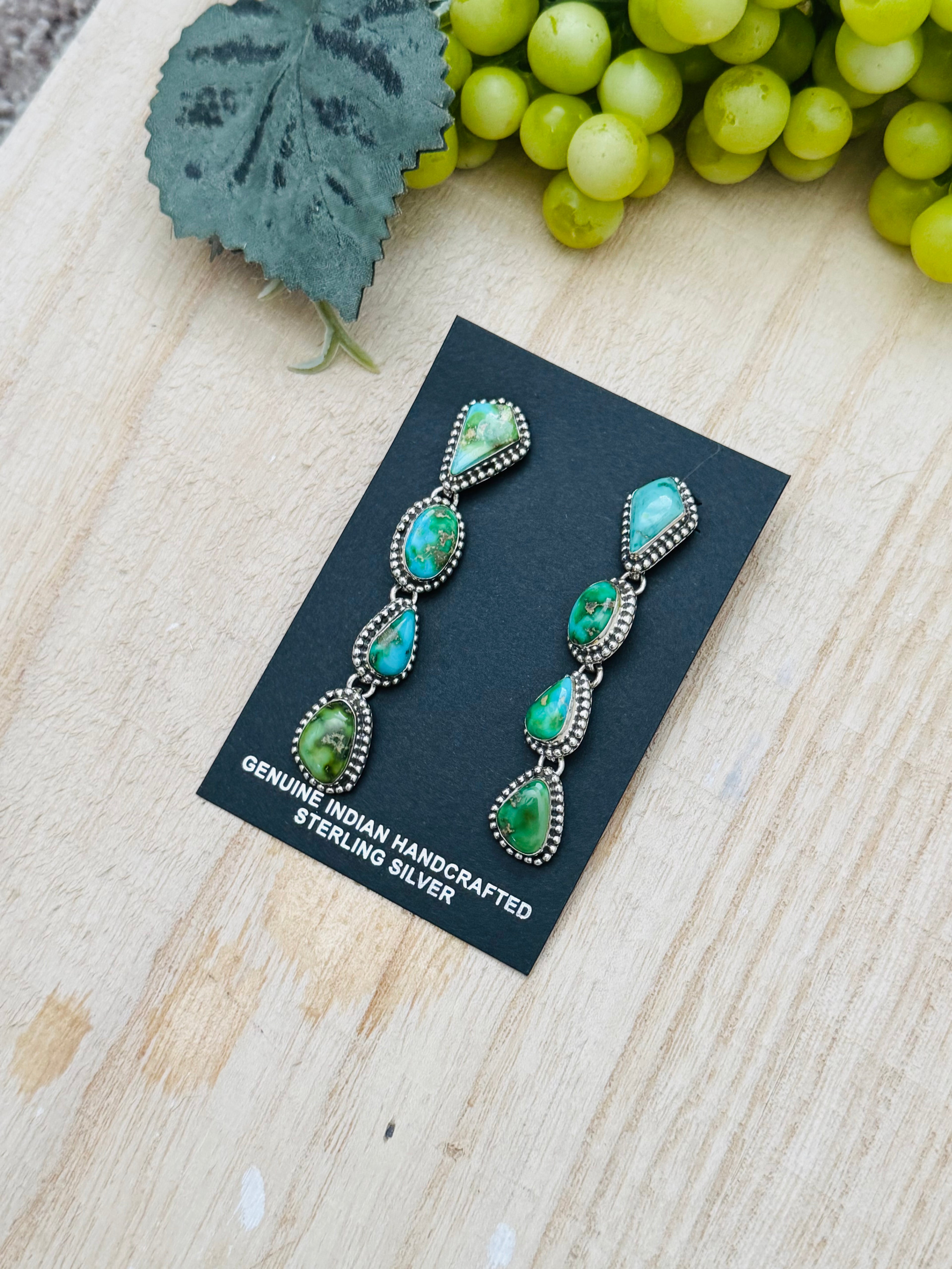 Breathtaking earrings. Southwest Handmade Sonoran Mountain Turquoise & Sterling Silver Post Dangle Earrings. It measures 2 3/4 inches long and 1/2 of an inch wide. Signed by the artist and stamped sterling silver.