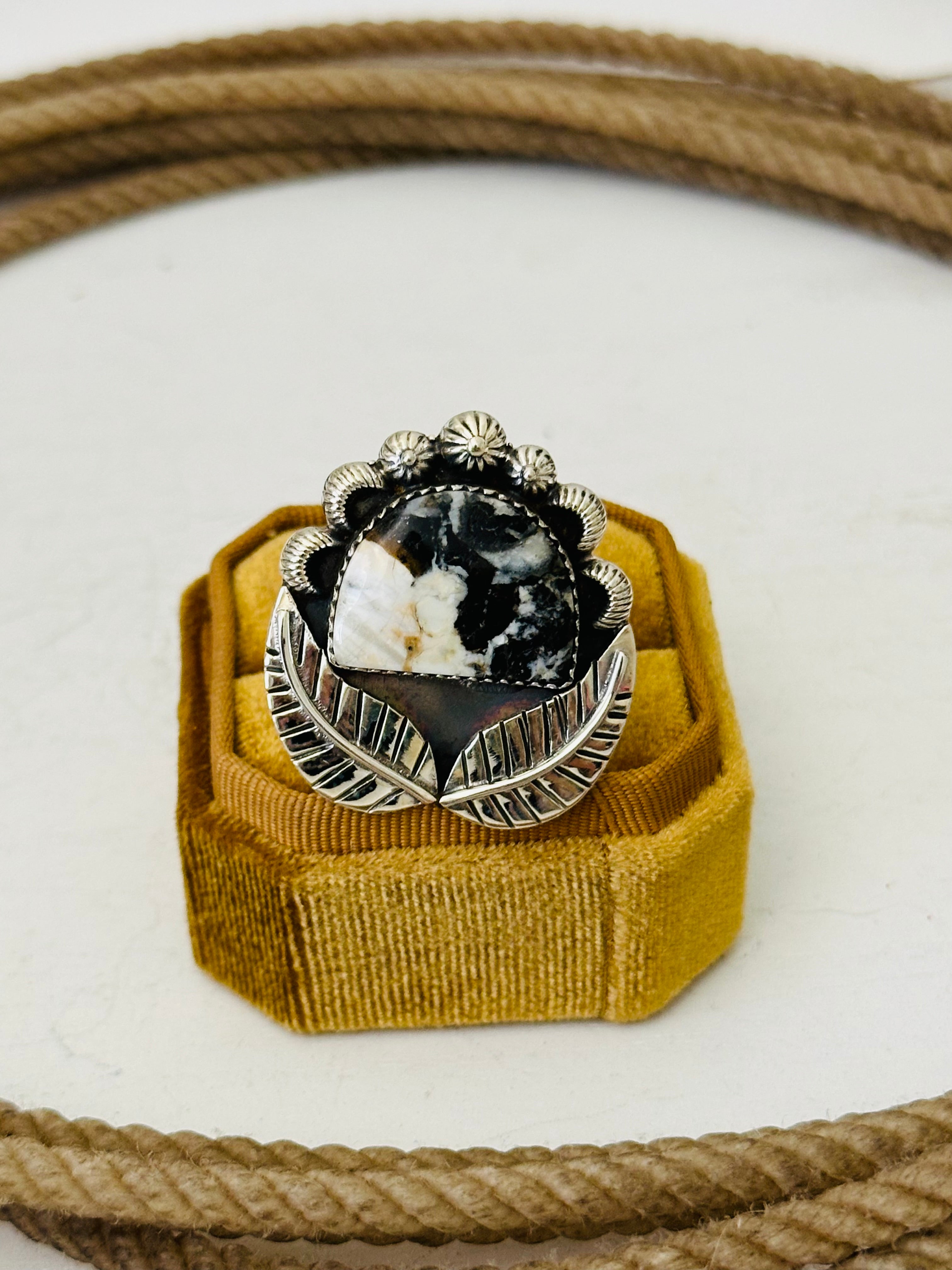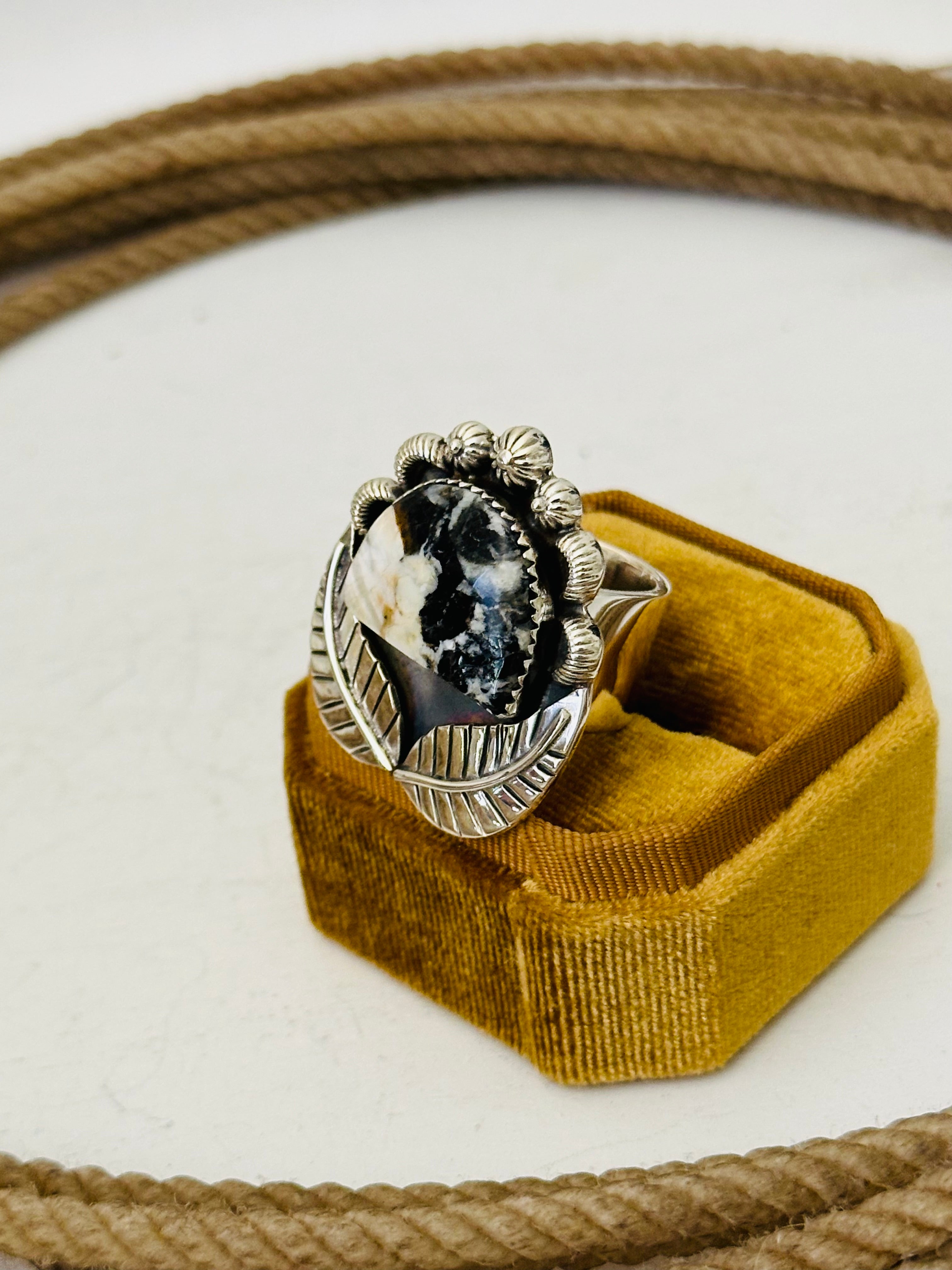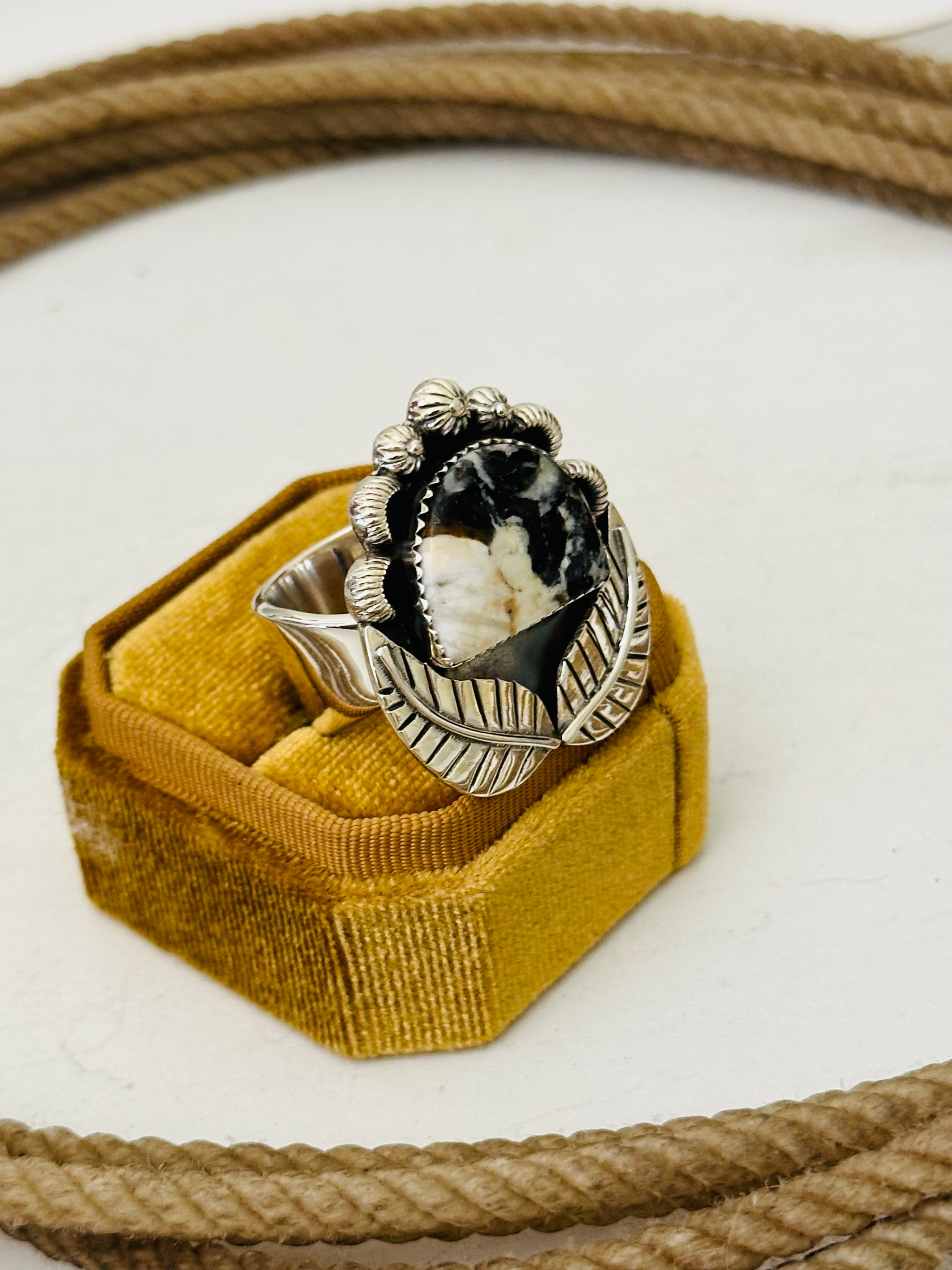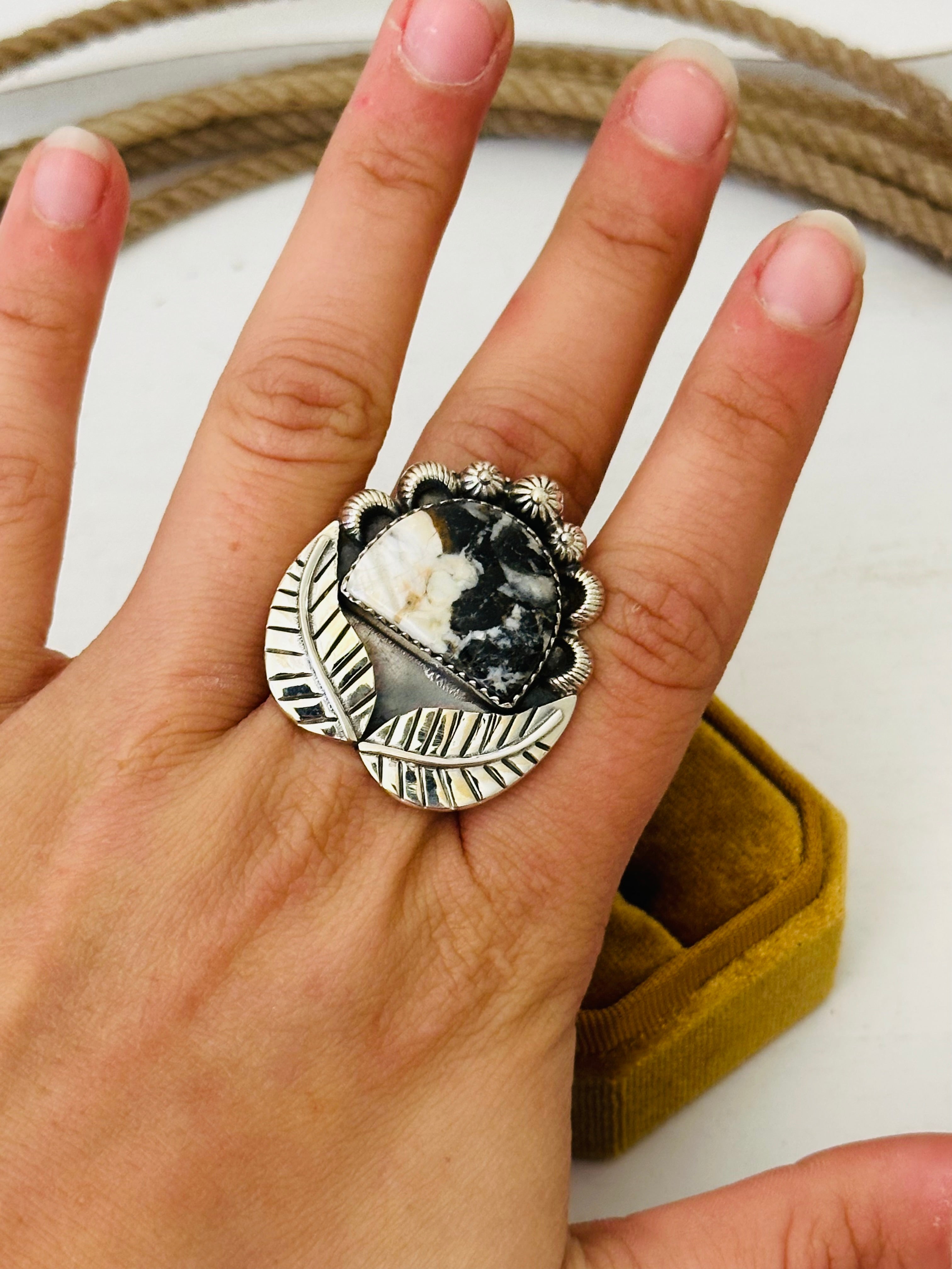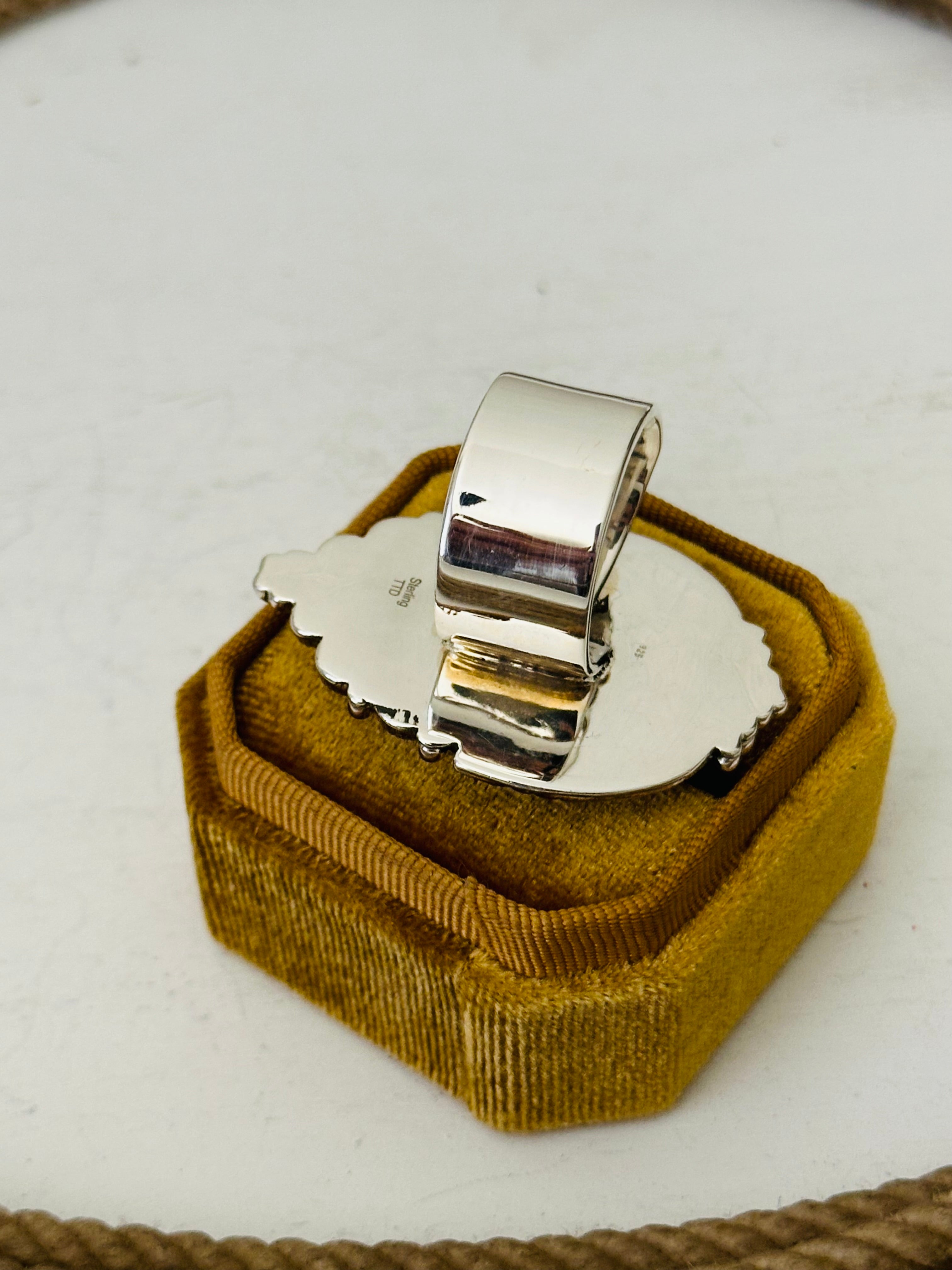 Beautiful ring. Southwest Handmade White Buffalo & Sterling Silver Adjustable Ring. It measures 1 1/2 inches long and 1 1/4 inches wide. Signed by the artist and stamped sterling silver.
