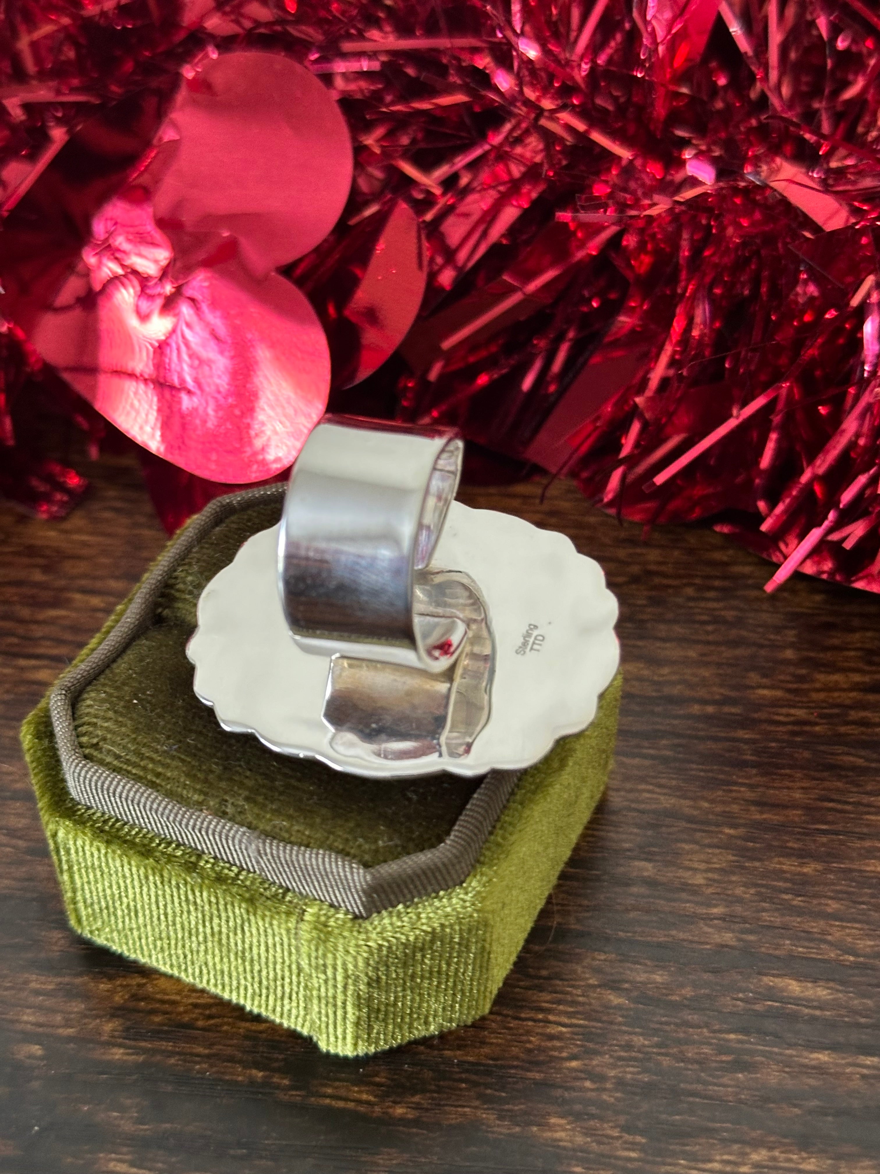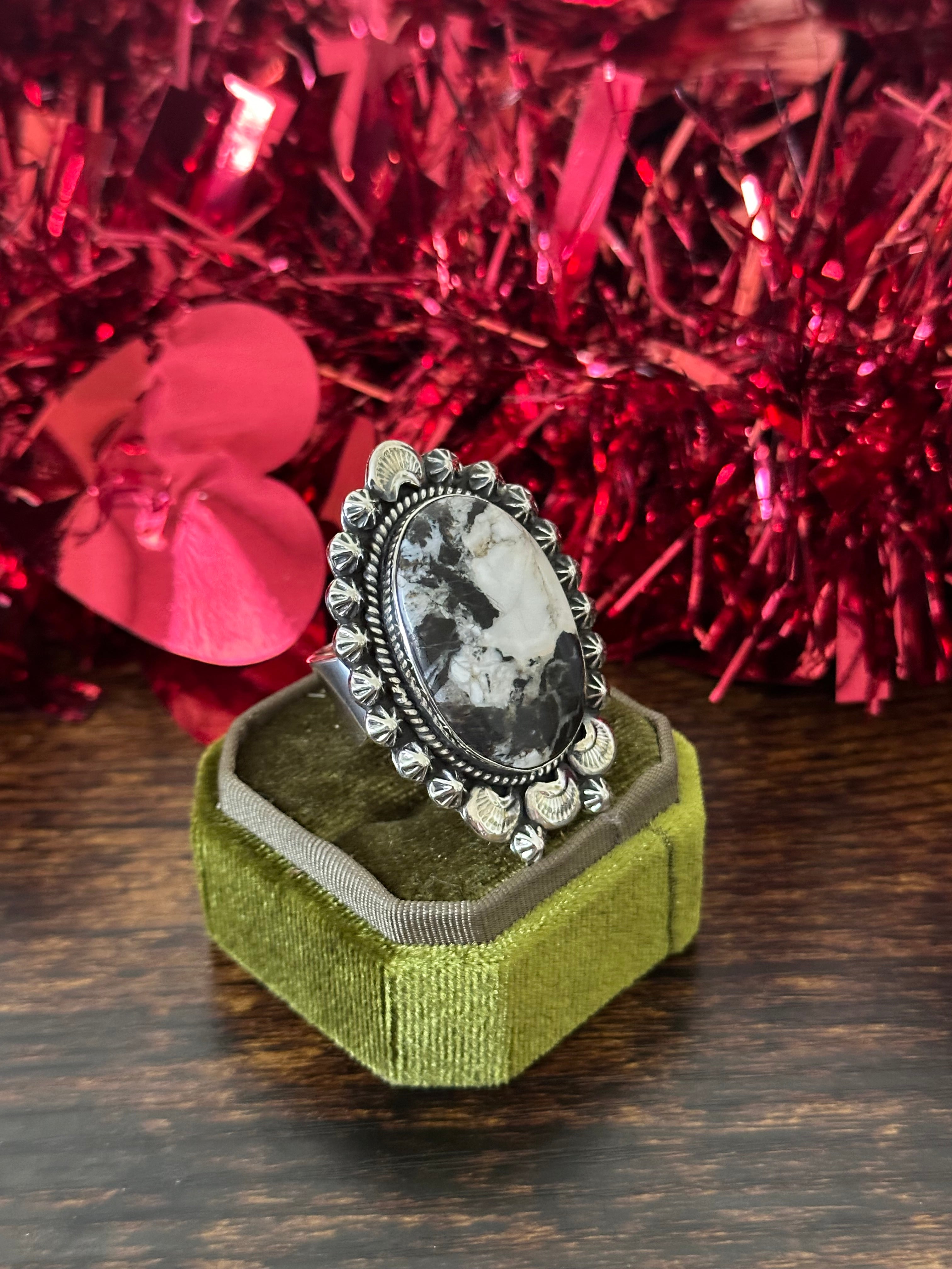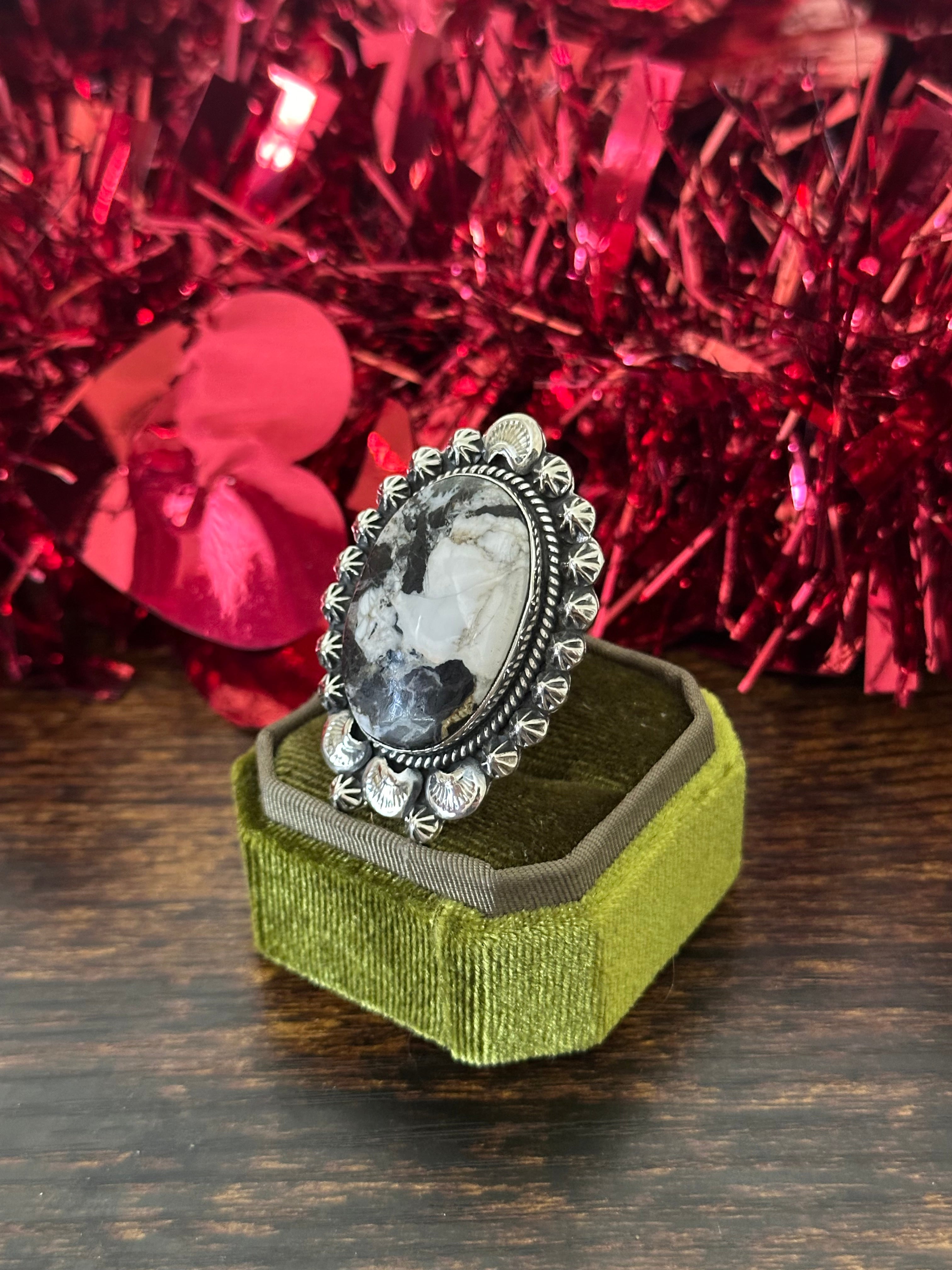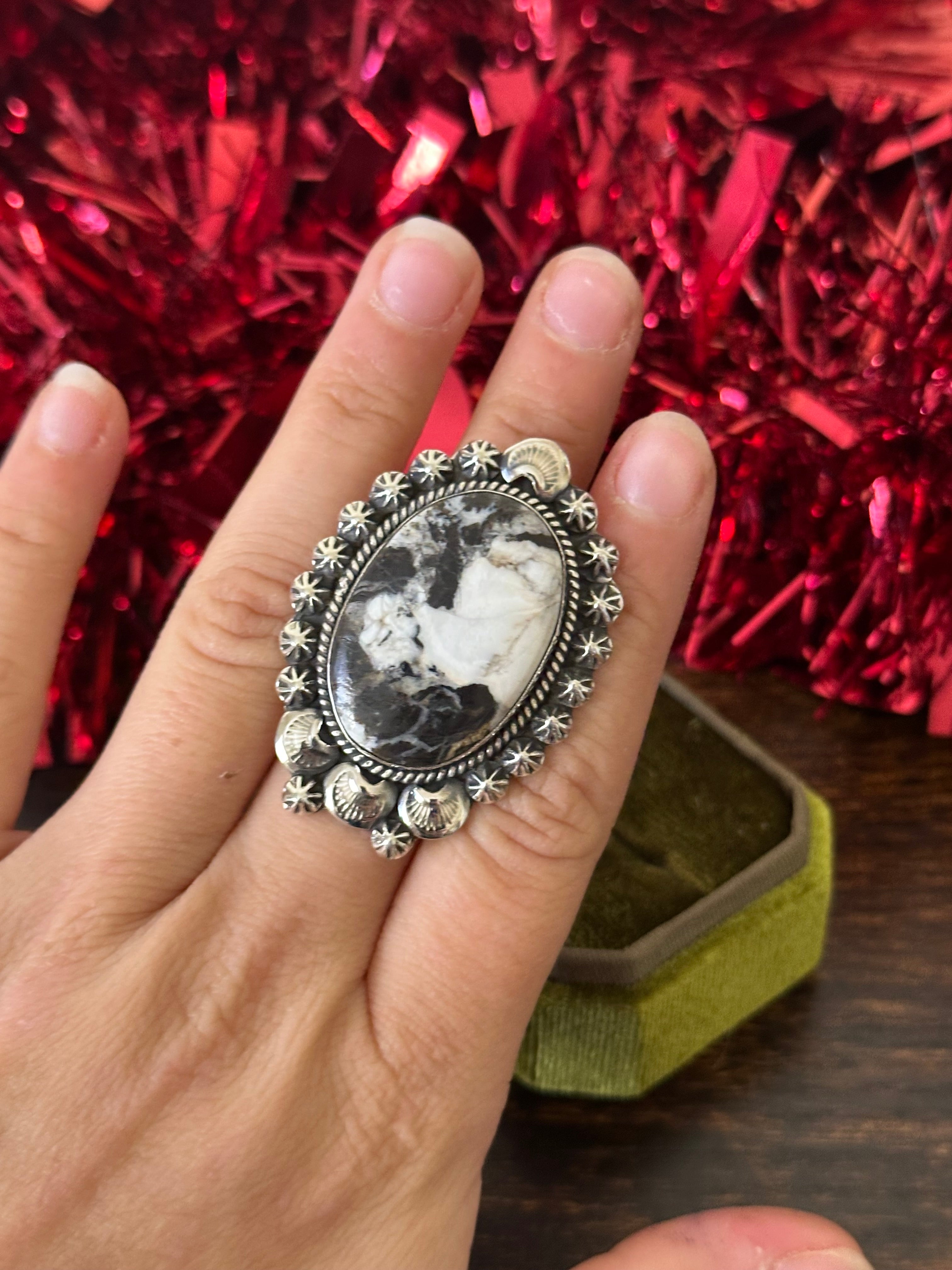 Beautiful ring. Southwest Handmade White Buffalo & Sterling Silver Adjustable Ring. It measures 1 7/8 inches long and 1 3/8 inches wide. Signed by the artist and stamped sterling silver.