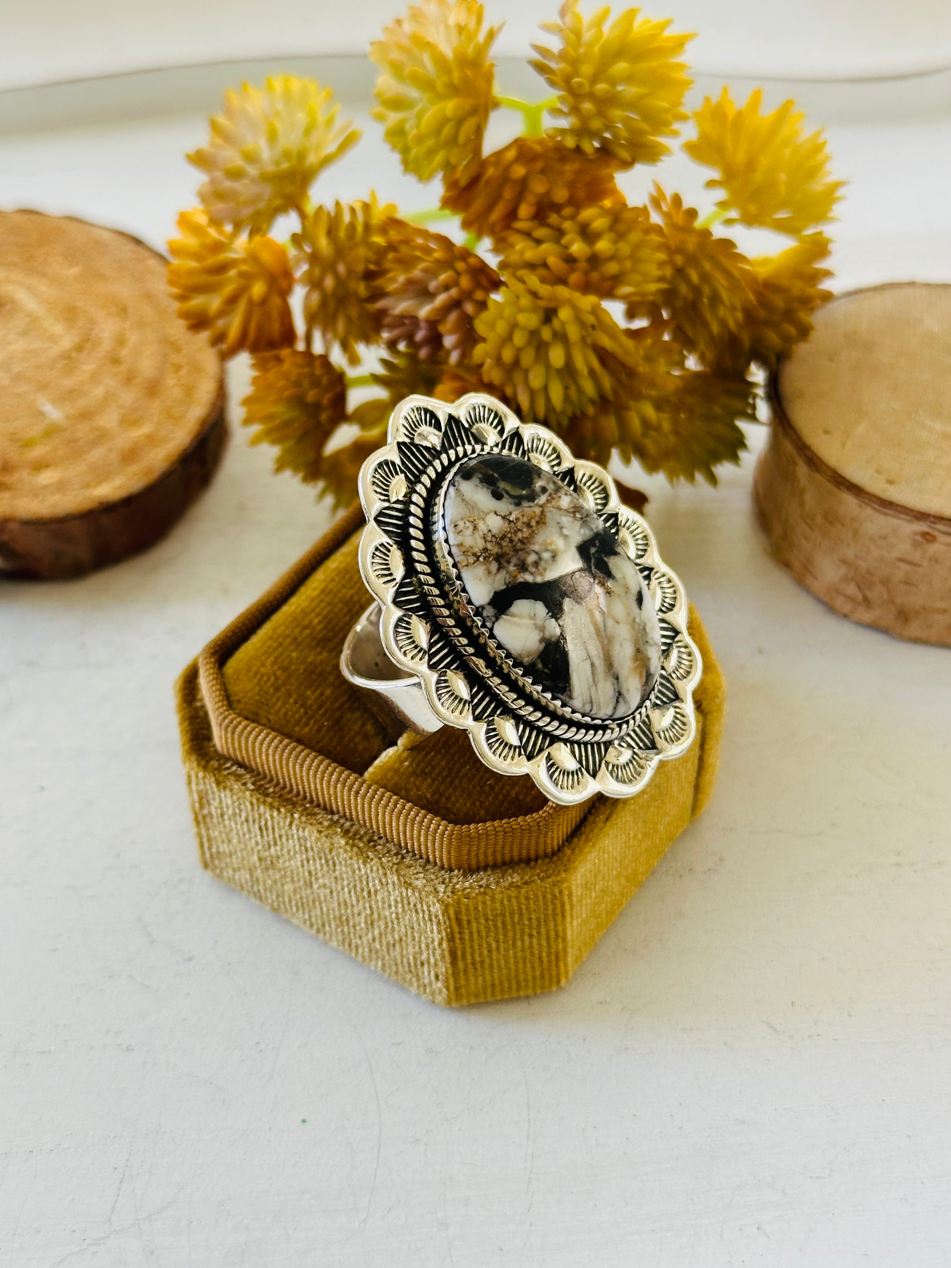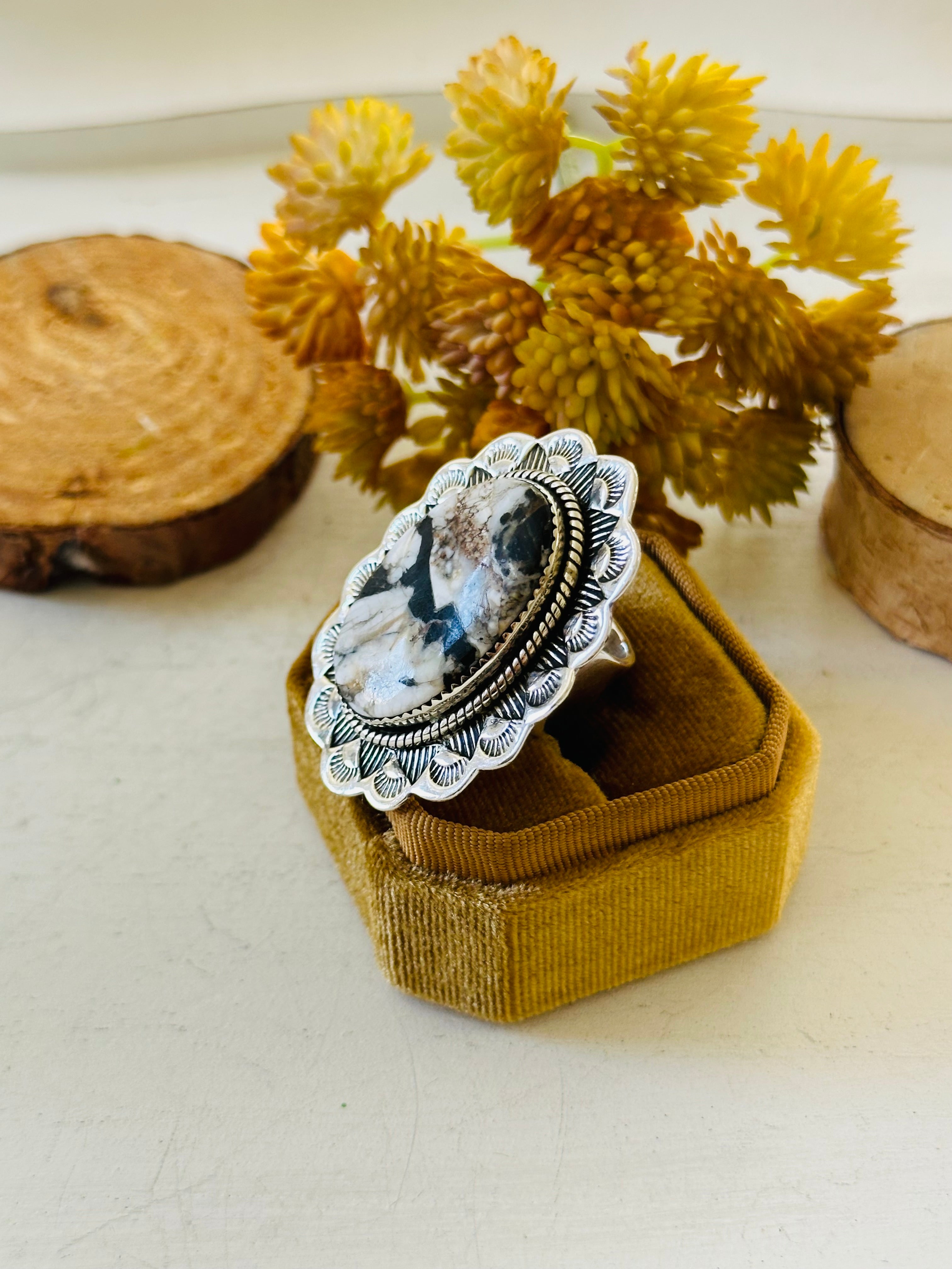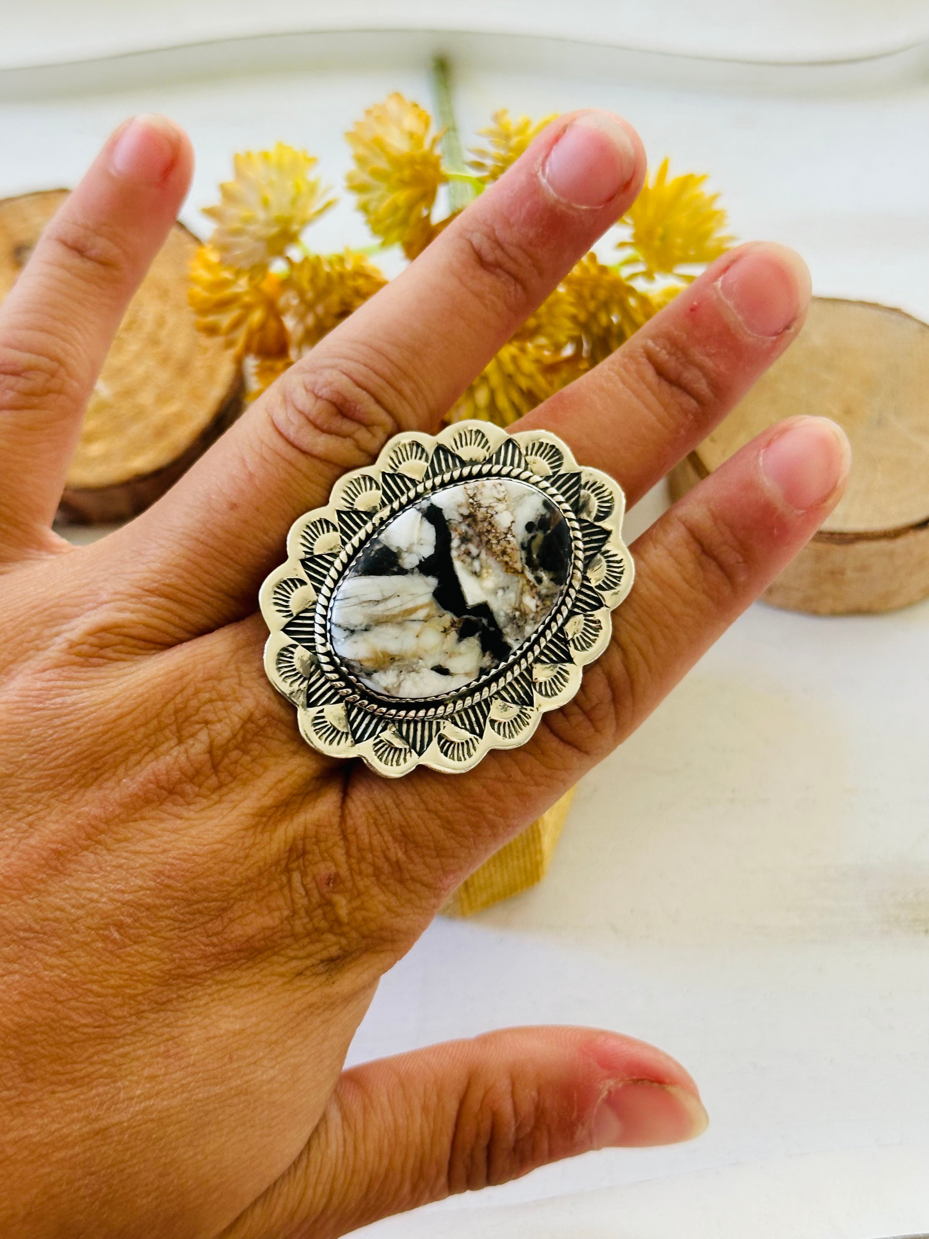 Beautiful ring. Southwest Handmade White Buffalo & Sterling Silver Adjustable Ring. It measures 1 3/4 inches long and 1 3/4 inches wide. Signed by the artist and stamped sterling silver.