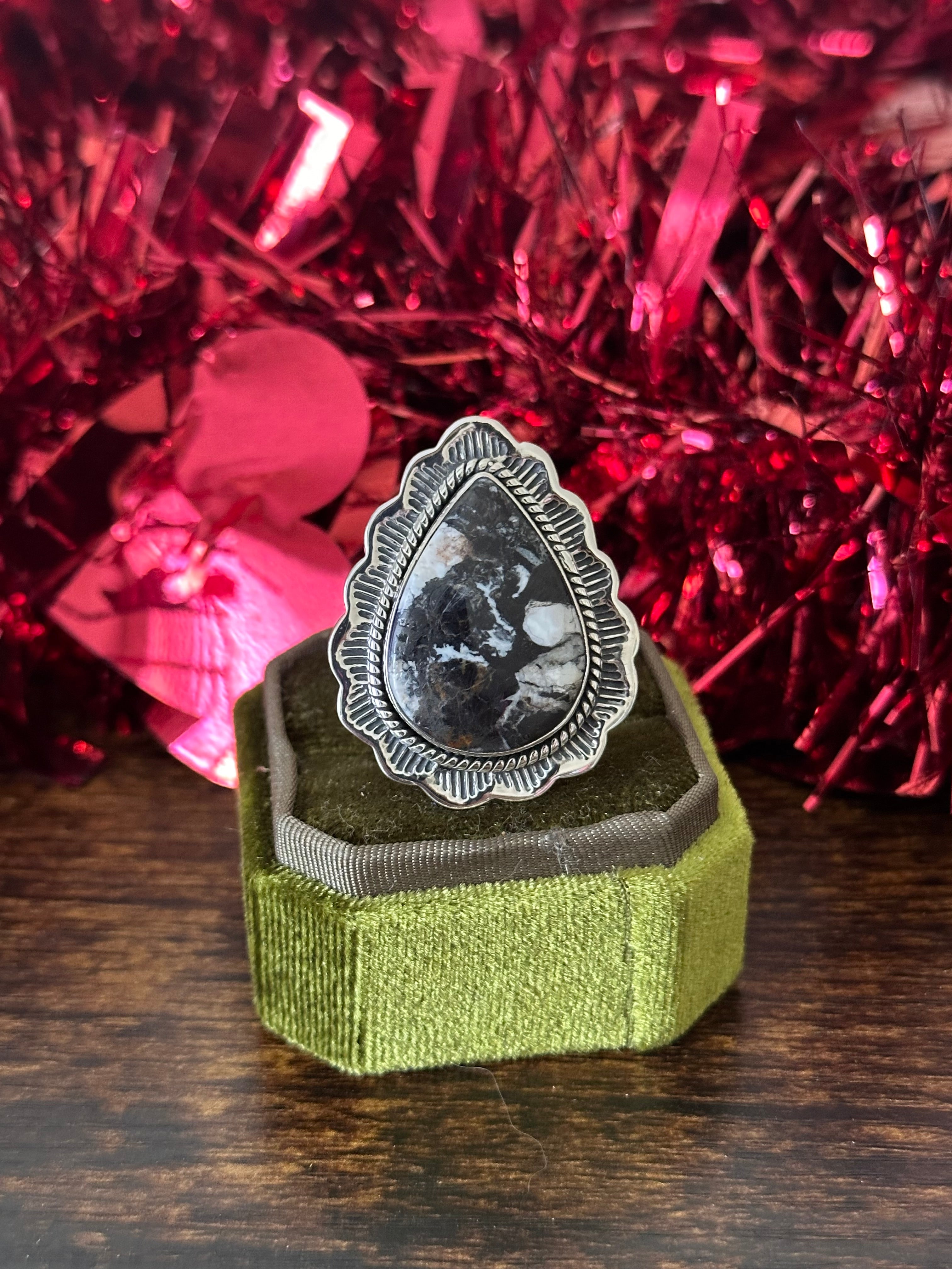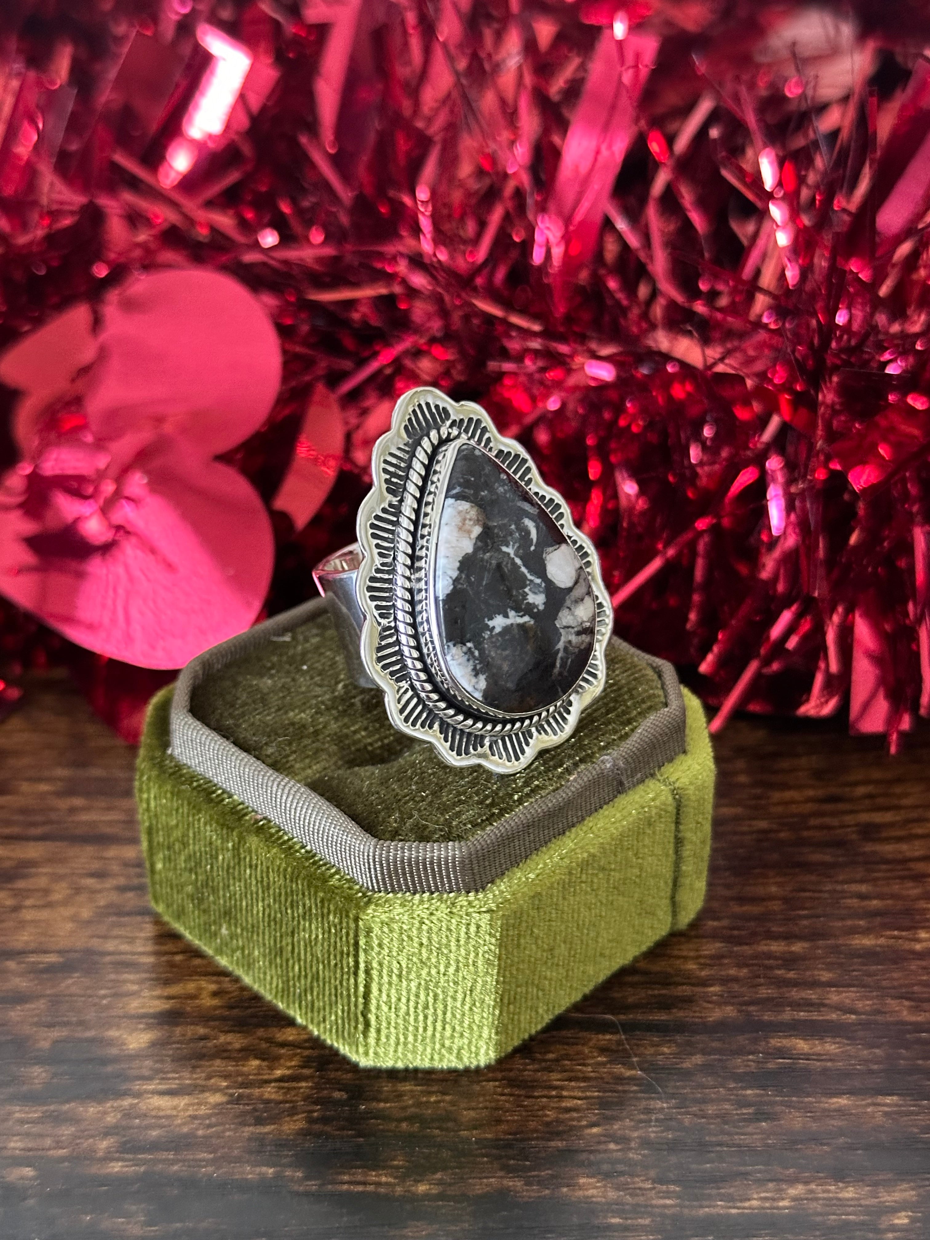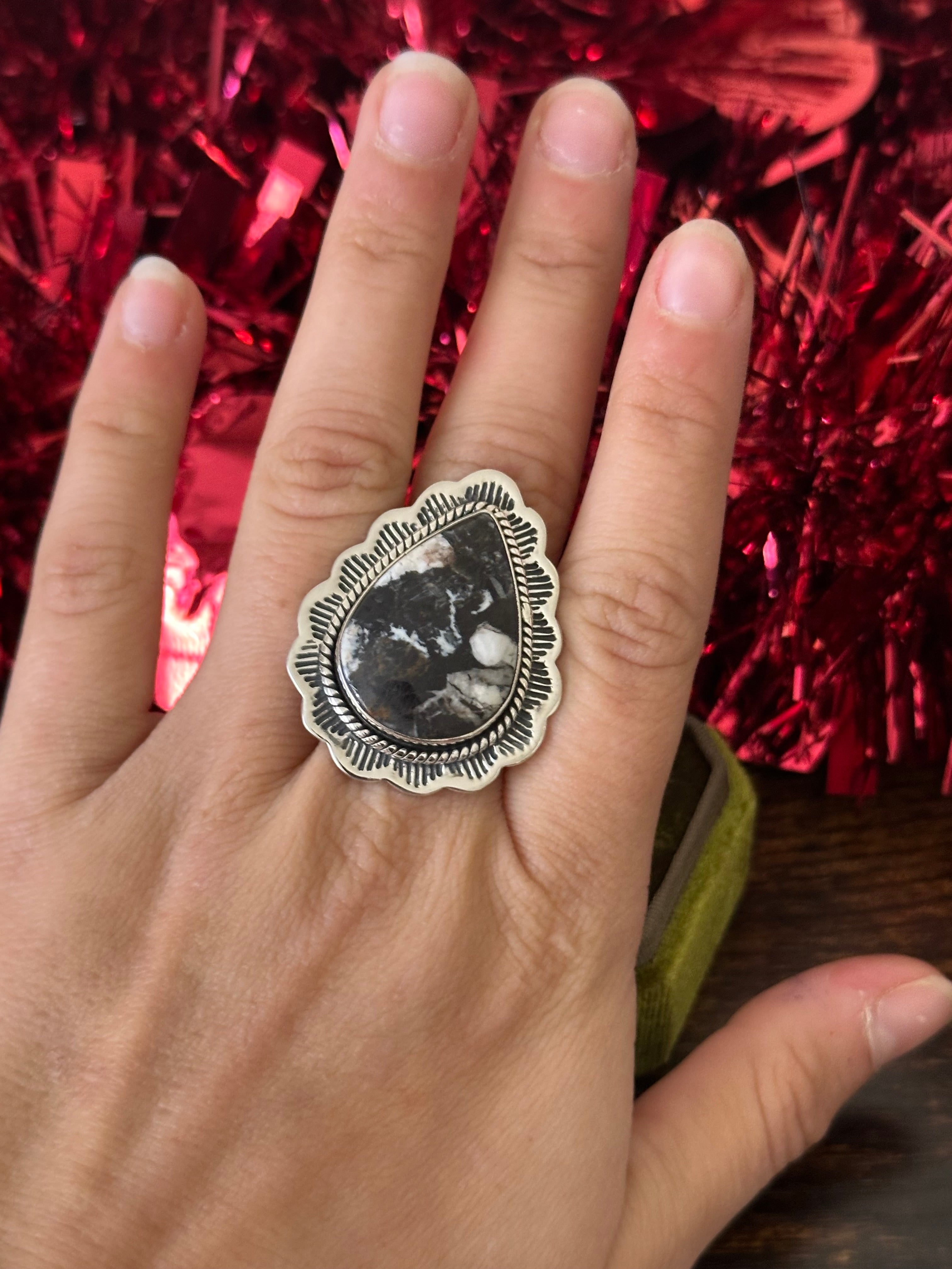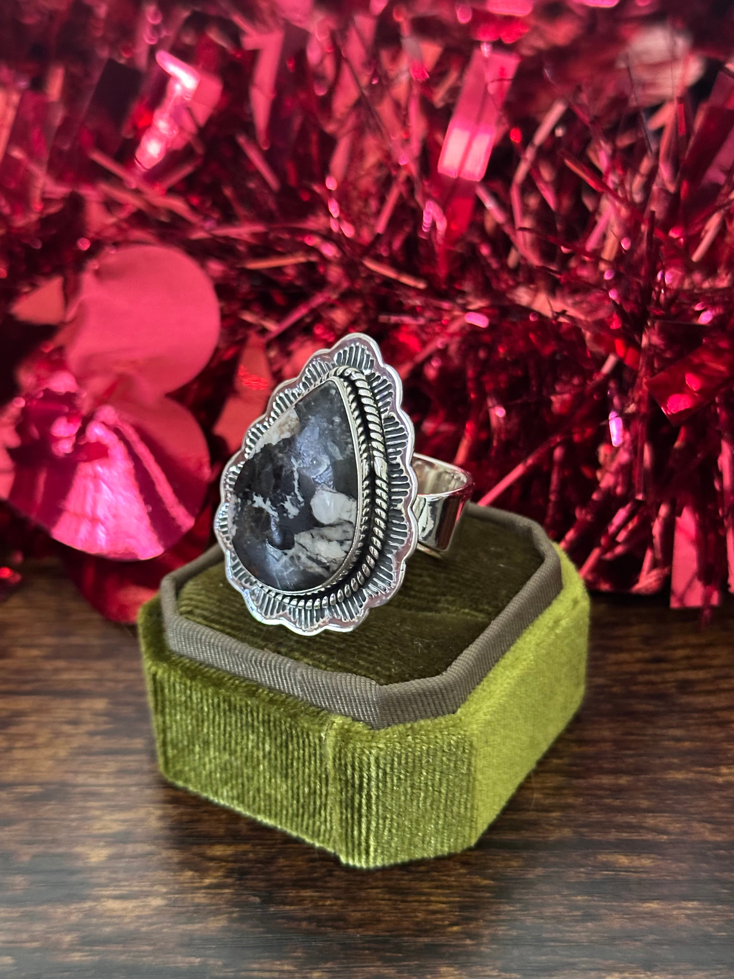 Beautiful ring. Southwest Handmade White Buffalo & Sterling Silver Adjustable Ring. It measures 1 1/2 inches long and 1 1/4 inches wide. Signed by the artist and stamped sterling silver.