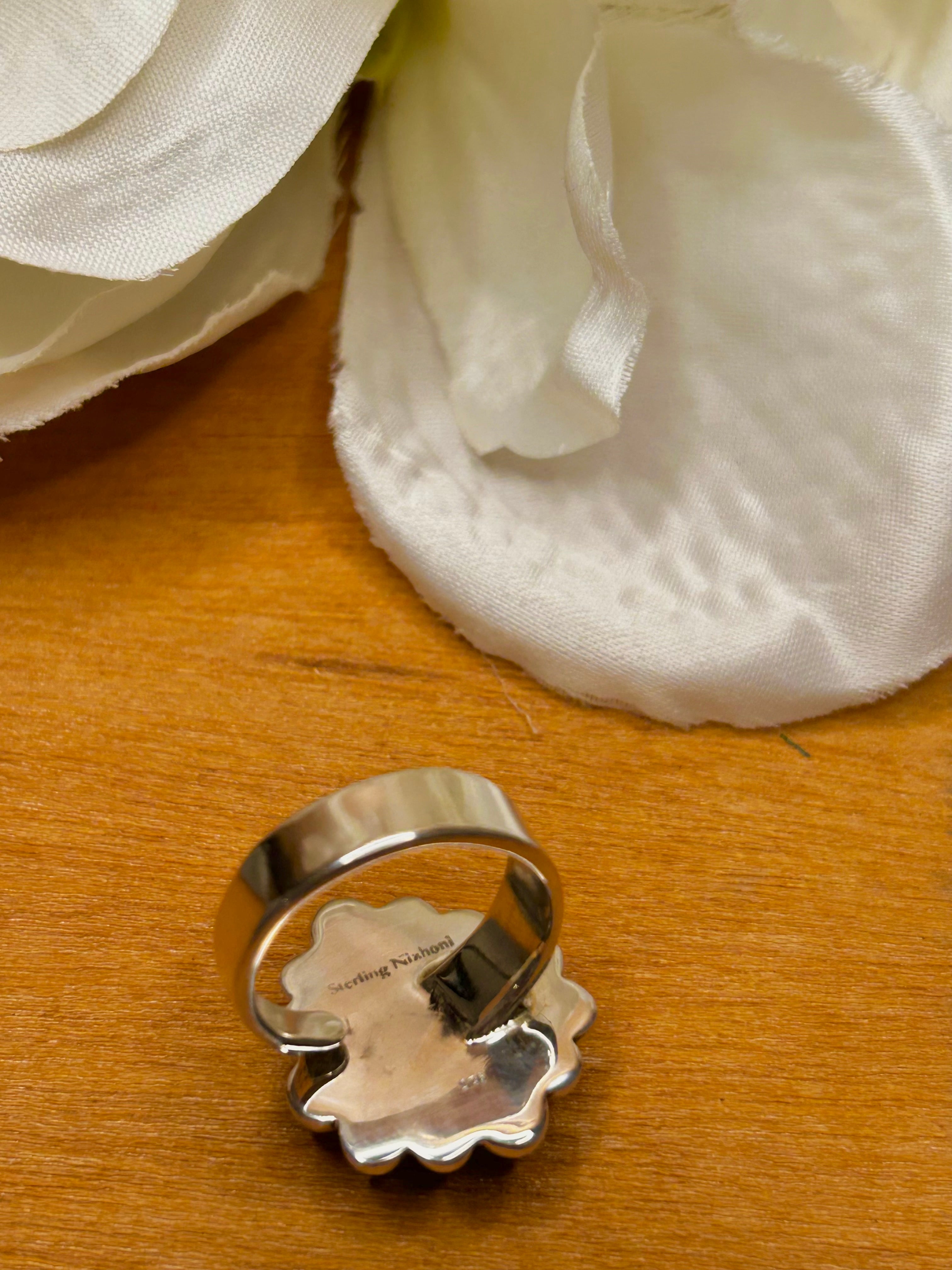 Southwest Made Kingman Turquoise & Sterling Sliver Cluster Adjustable Ring. It measures 1 inch long and 7/8 of an inch wide. Signed by the artist and stamped sterling silver.