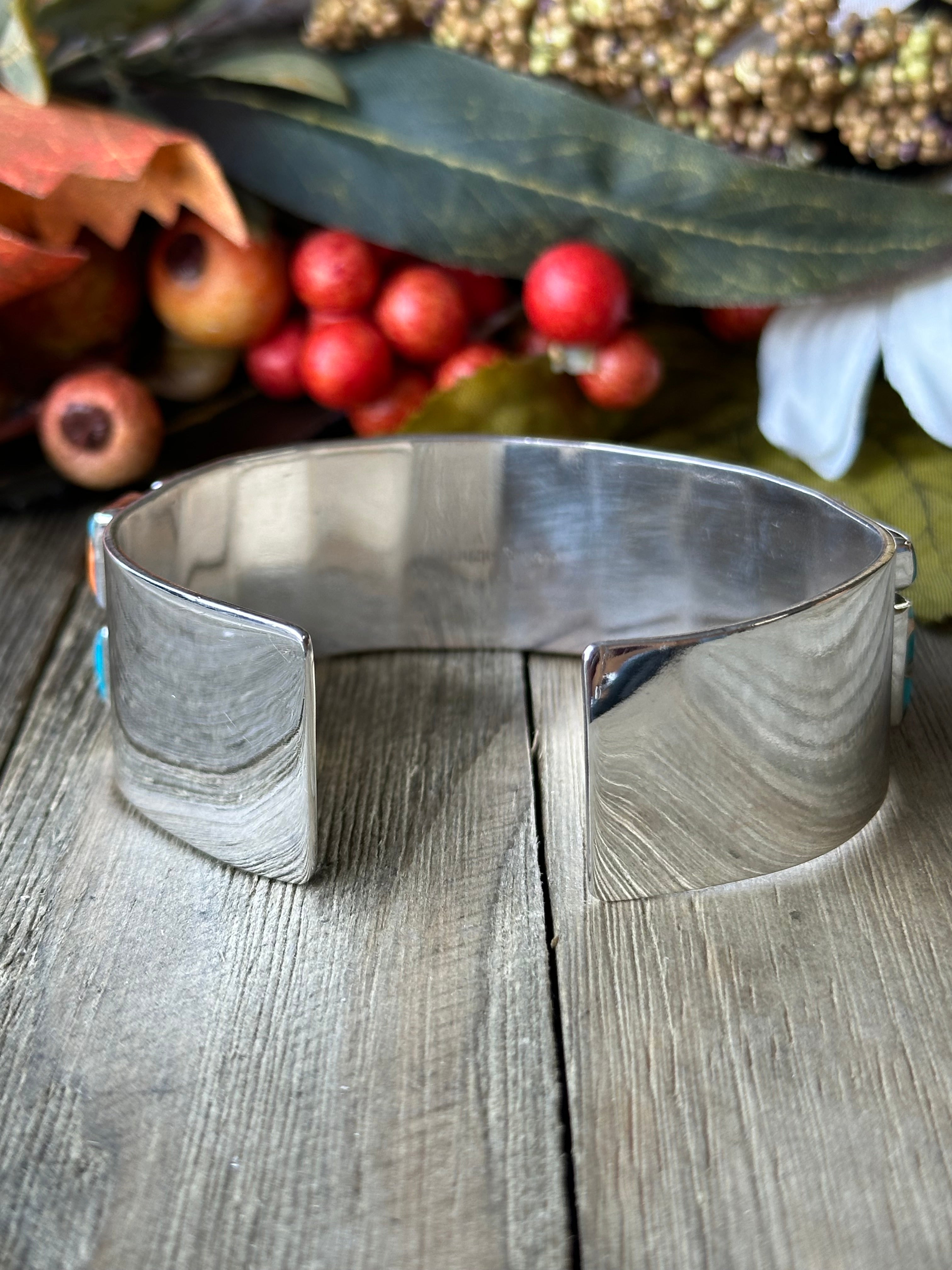 Southwest Made Mohave Turquoise & Sterling Silver Cuff Bracelet. It measures 7/8 of an inch wide with an inside circumference of 6 1/2 inches and a gap of 7/8 of an inch. Signed by artist and stamped sterling silver. Stones will differ due to natural stones.