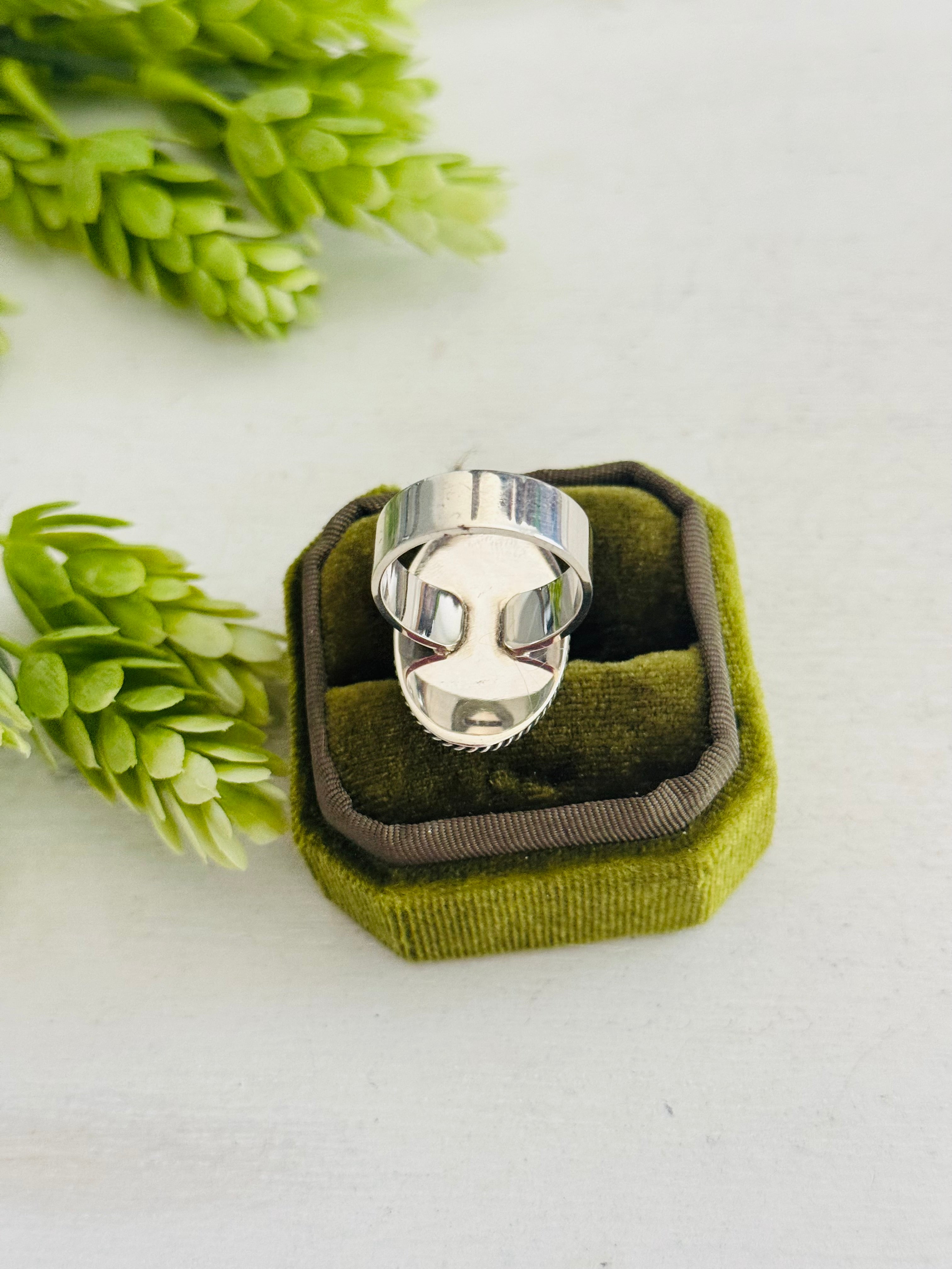 Southwest Made Royston Turquoise & Sterling Sliver Ring Size 9.5. It measures 1 1/4 inches long and just under 3/4 of an inch wide.