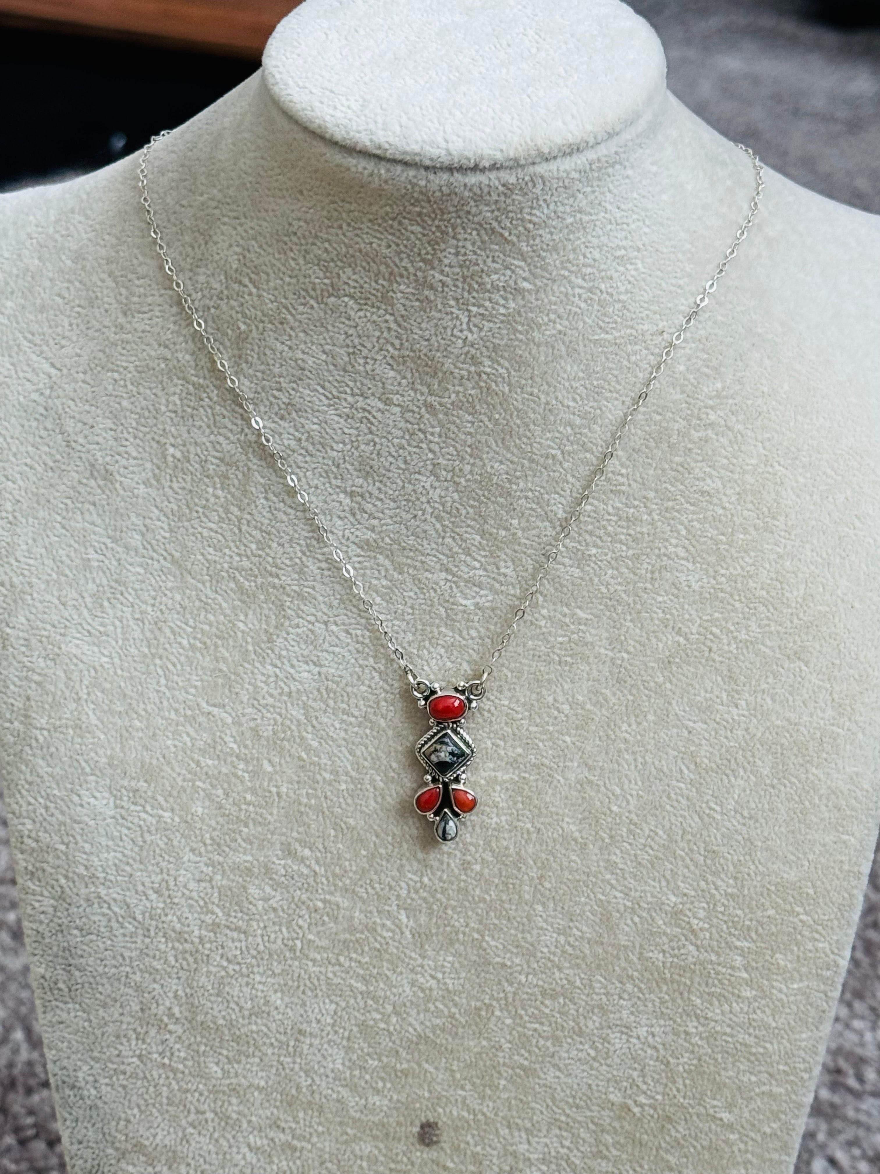 Beautiful necklace set. Southwest Made Multi Stone & Sterling Silver Necklace. It measures 19 inches long with hang while the chain by itself measures 17 inches long. Signed by the artist and stamped sterling silver.
