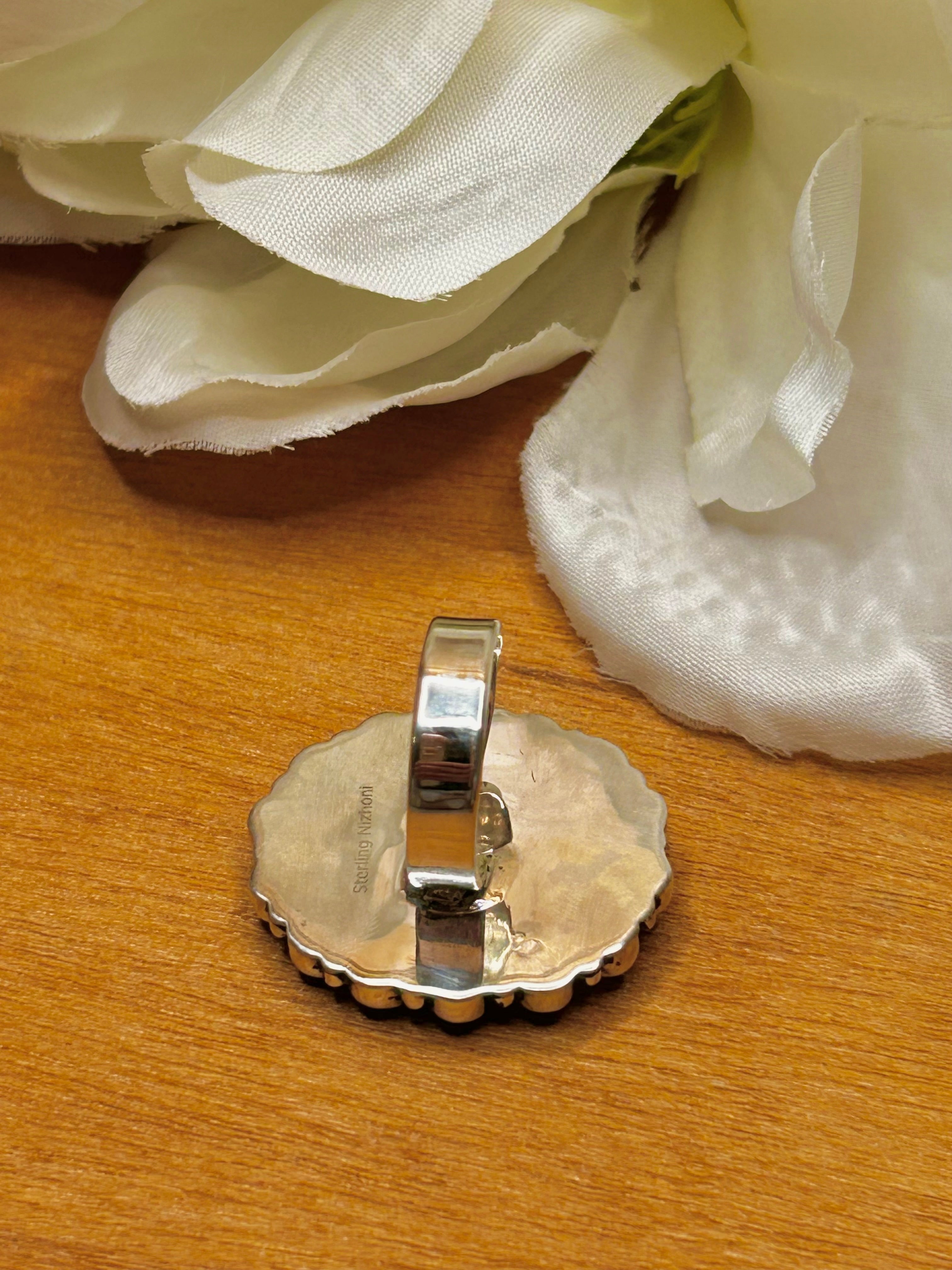Southwest Made Multi Stone & Sterling Sliver Cluster Adjustable Ring. It measures 1 1/4 inches long and 1 1/8 inches wide. Signed by the artist and stamped sterling silver.