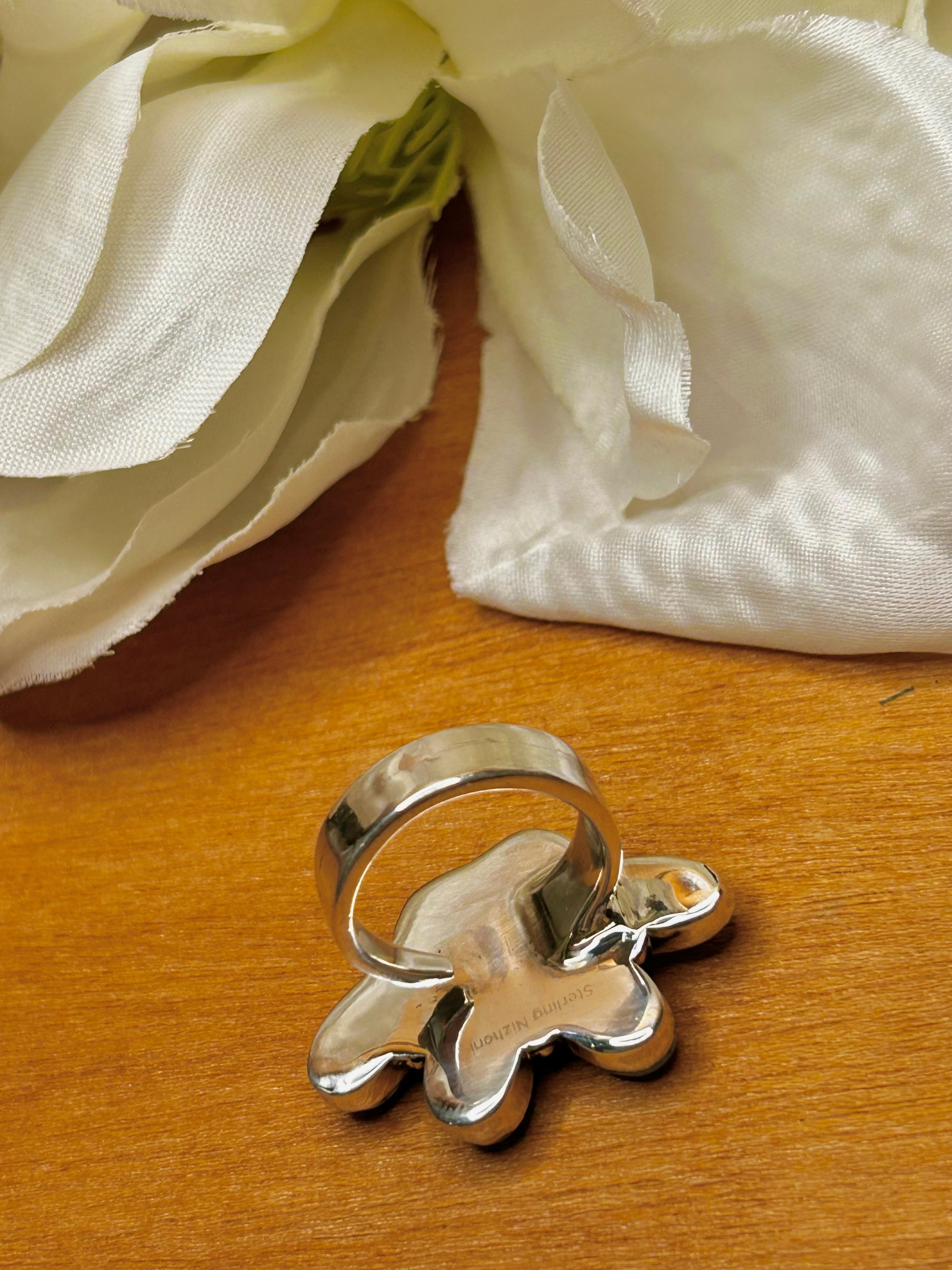 Southwest Made Multi Stone & Sterling Sliver Cluster Adjustable Ring. It measures 1 3/8 inches long and 1 inch wide. Signed by the artist and stamped sterling silver.